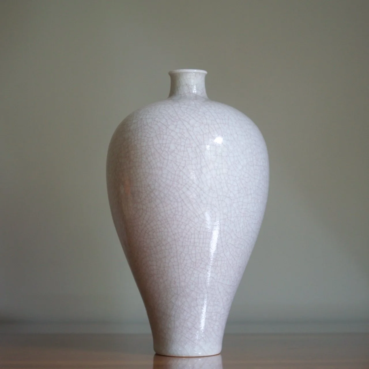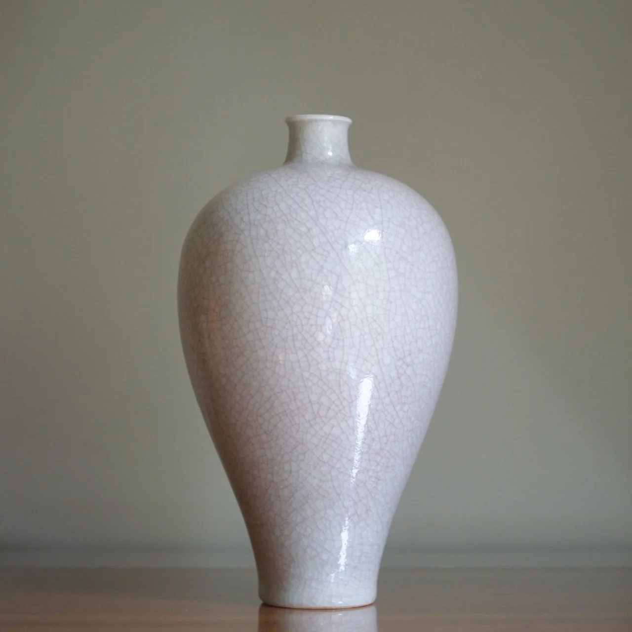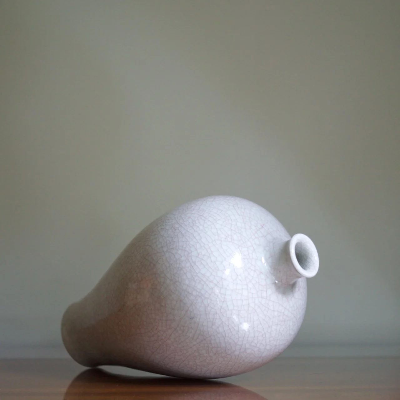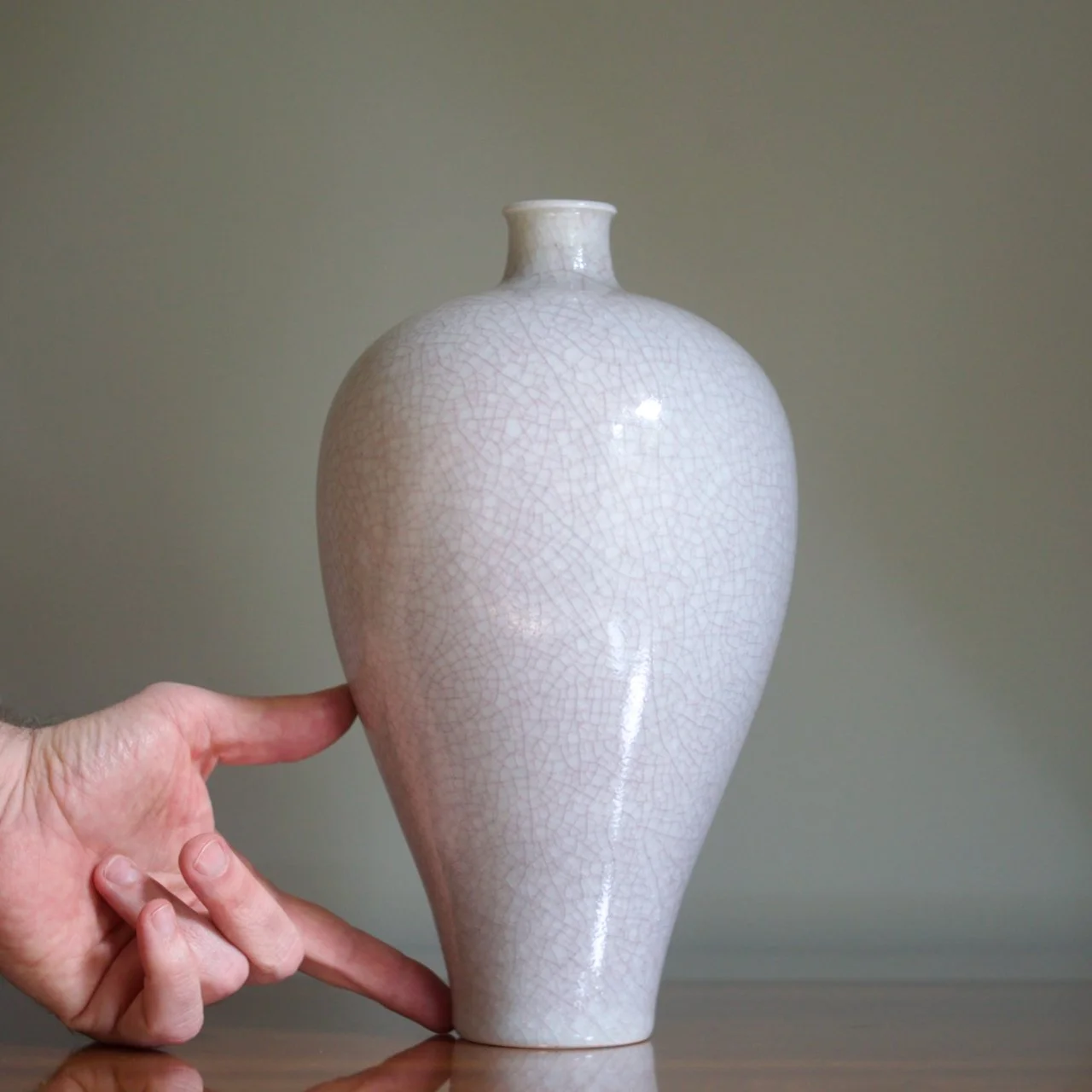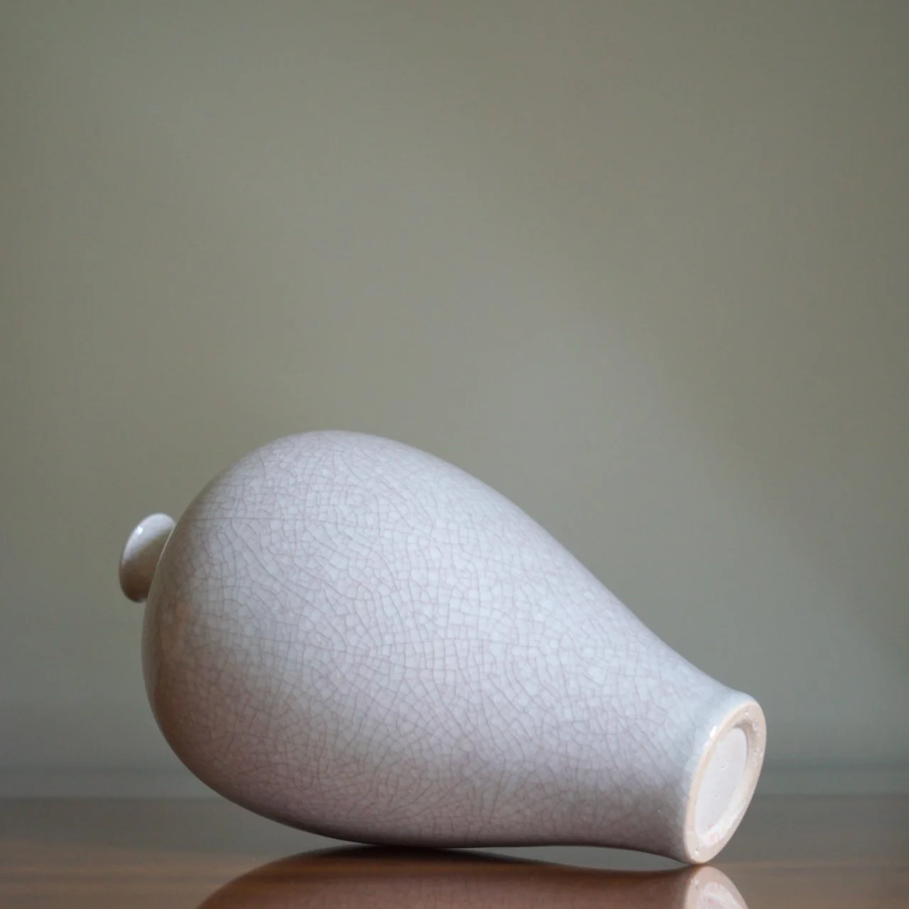 Watanabe used a a light clay body - not porcelain, but still rich in kaolin. While the celadon is white, it’s the delicate web of very fine mauve crazing that gives this vase multiple appearances. Depending on the light, the glaze can glow with pink, blue, or ivory. This tone of celadon likely resulted from the combination of clay body, glaze, kiln temperature, placement, and exposure - if any - to oxygen. The numerous combinations of elements, multiplied by various atmospheres, allow for limitless results. Then, yet still, only a limited number meet Watanabe’s standards.