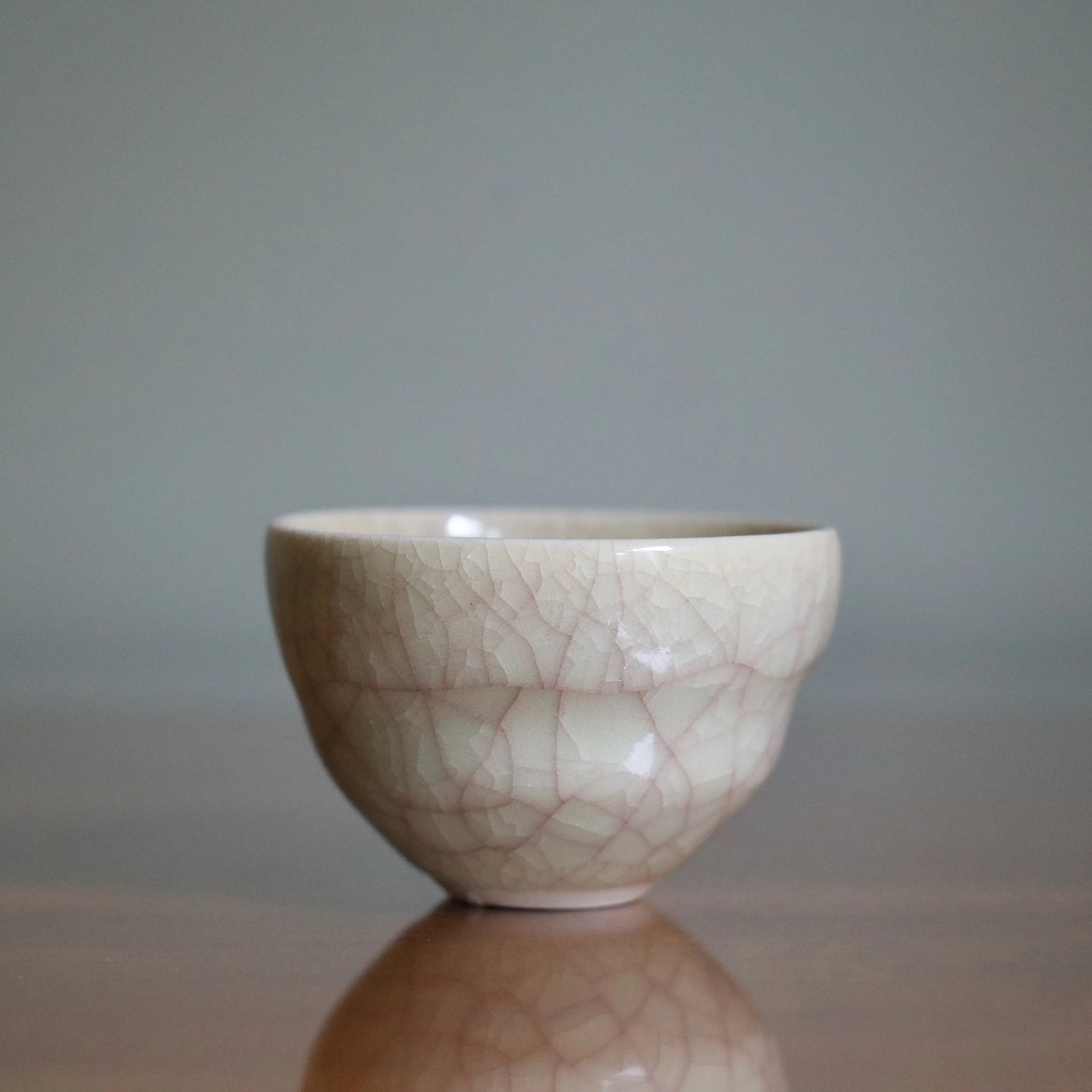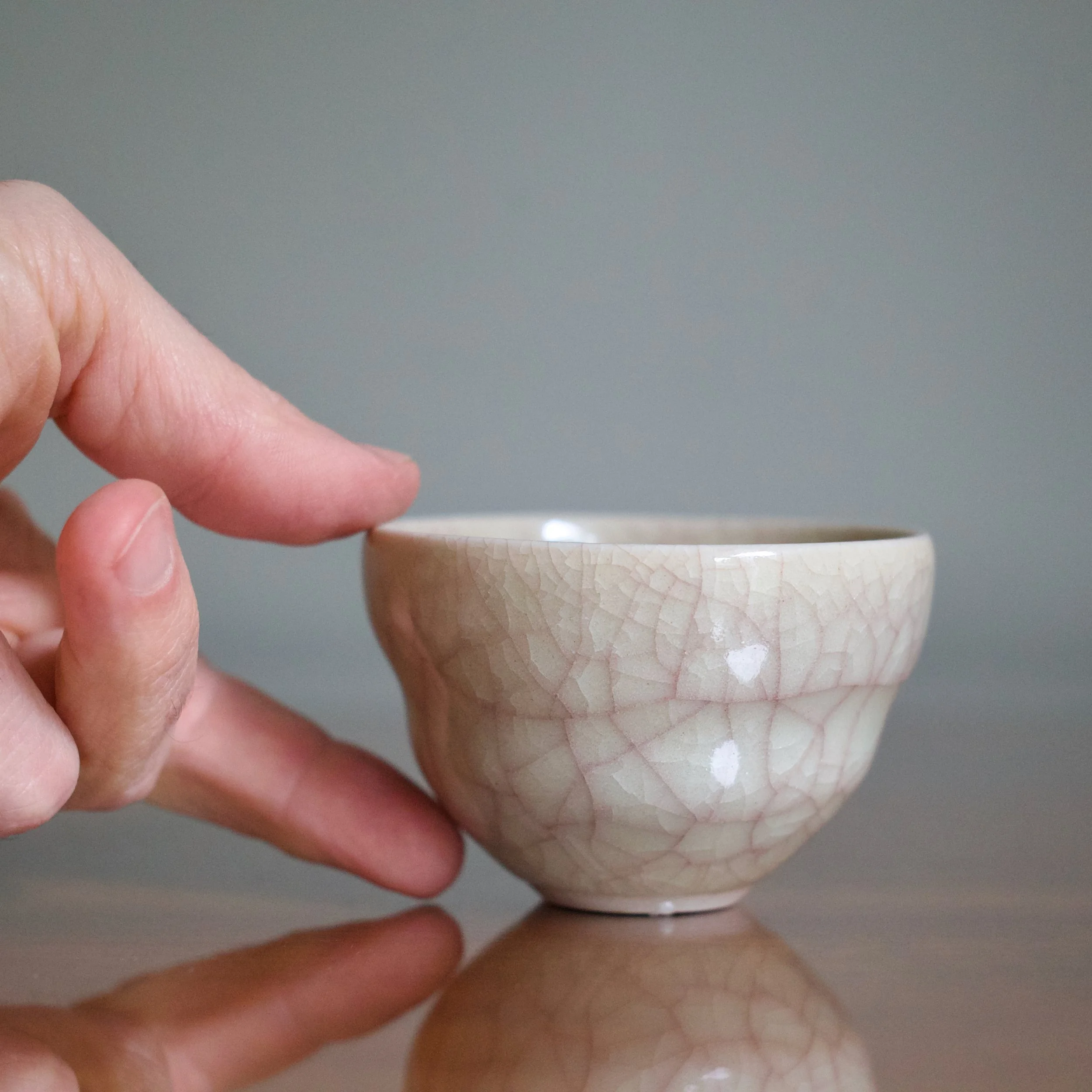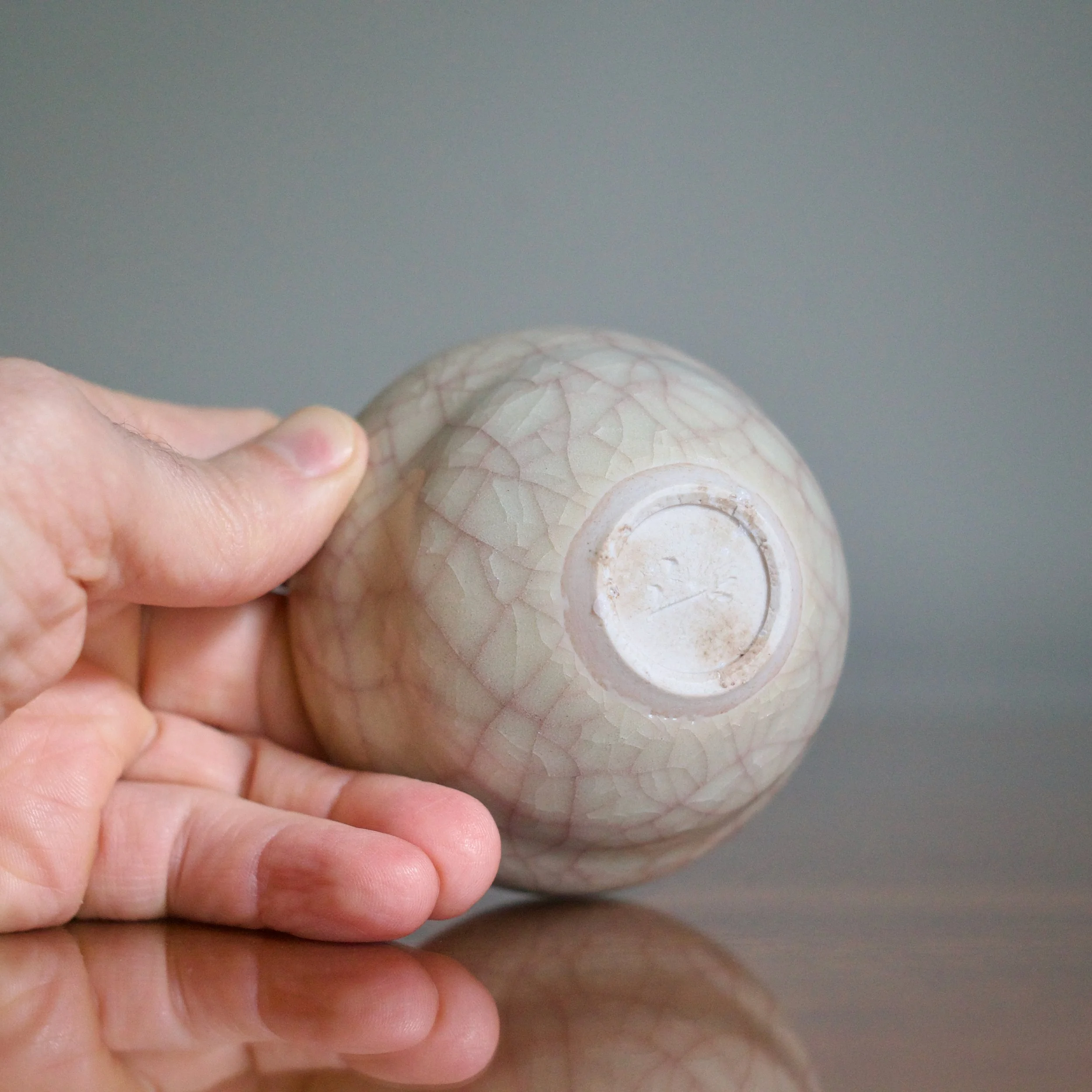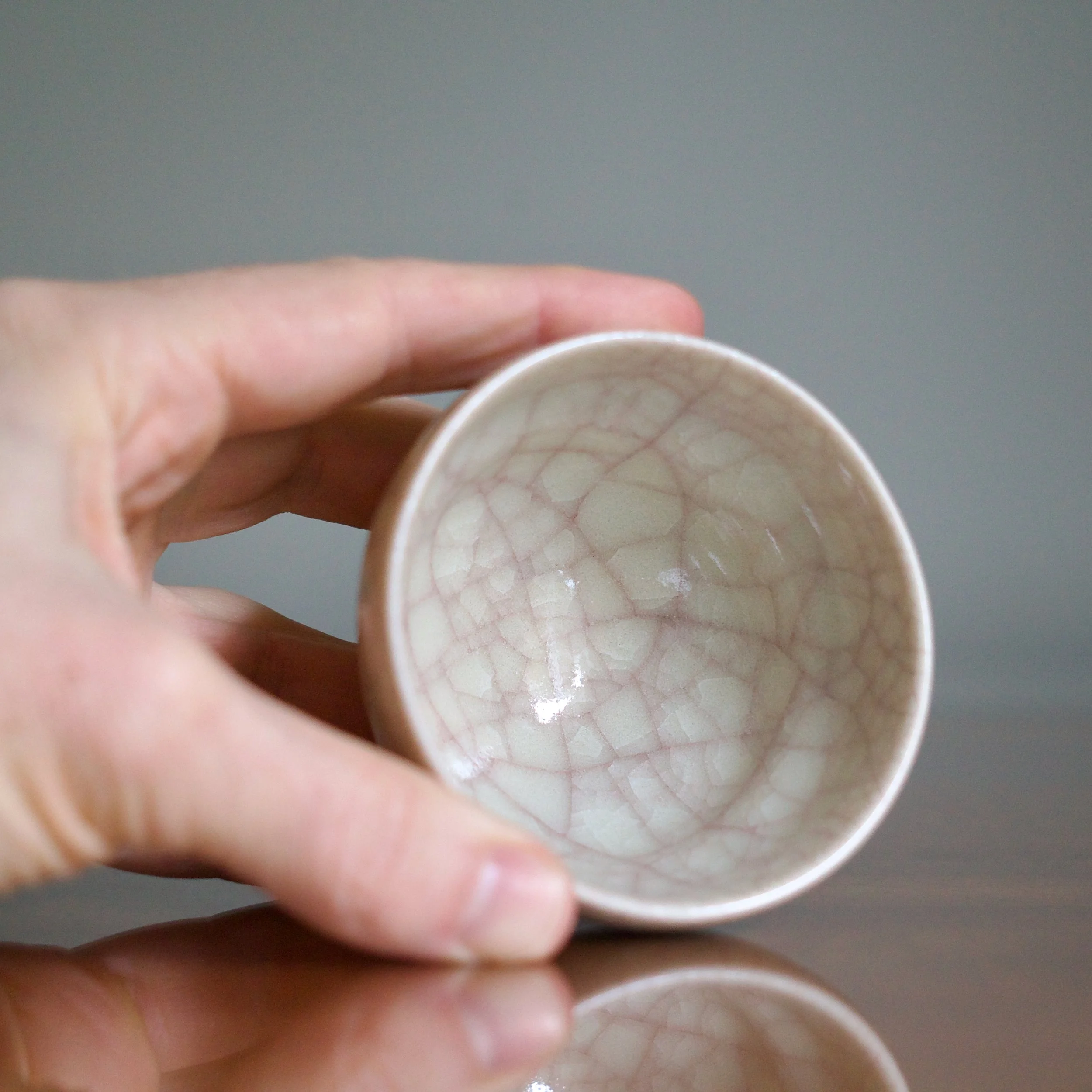 However, around 1000°C, Watanabe allows a controlled amount of oxygen into the kiln resulting in the signature beautiful warm tones of beishokuji. And perhaps this combination of reduction firing with small amounts of oxygen is responsible for the colour of this cup’s crazing. Covered with a fine web of purple-pink kannyu, Watanabe’s delicate contrast of ivory and pink is a fine example of beishokuji celadon.