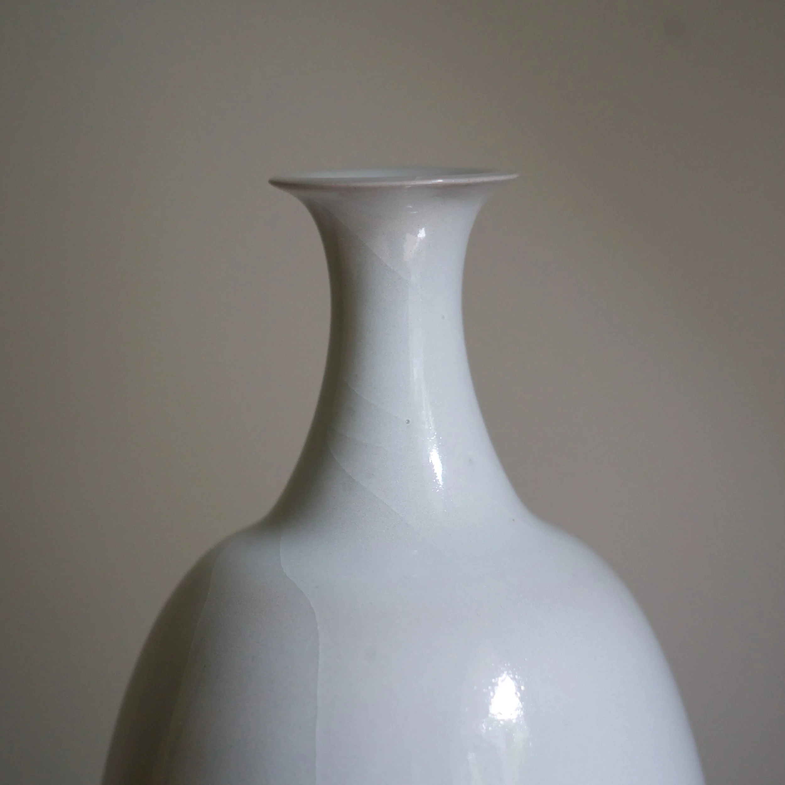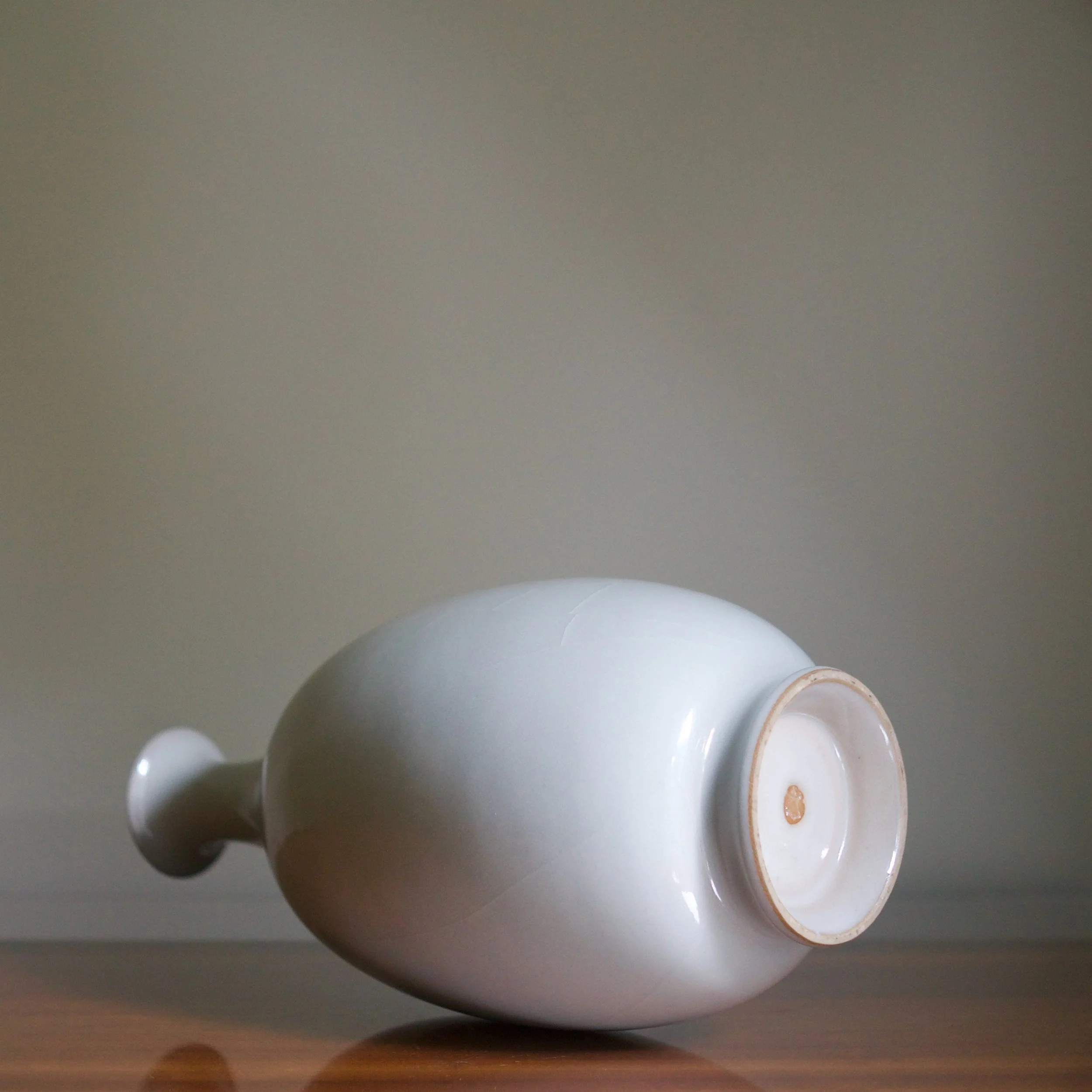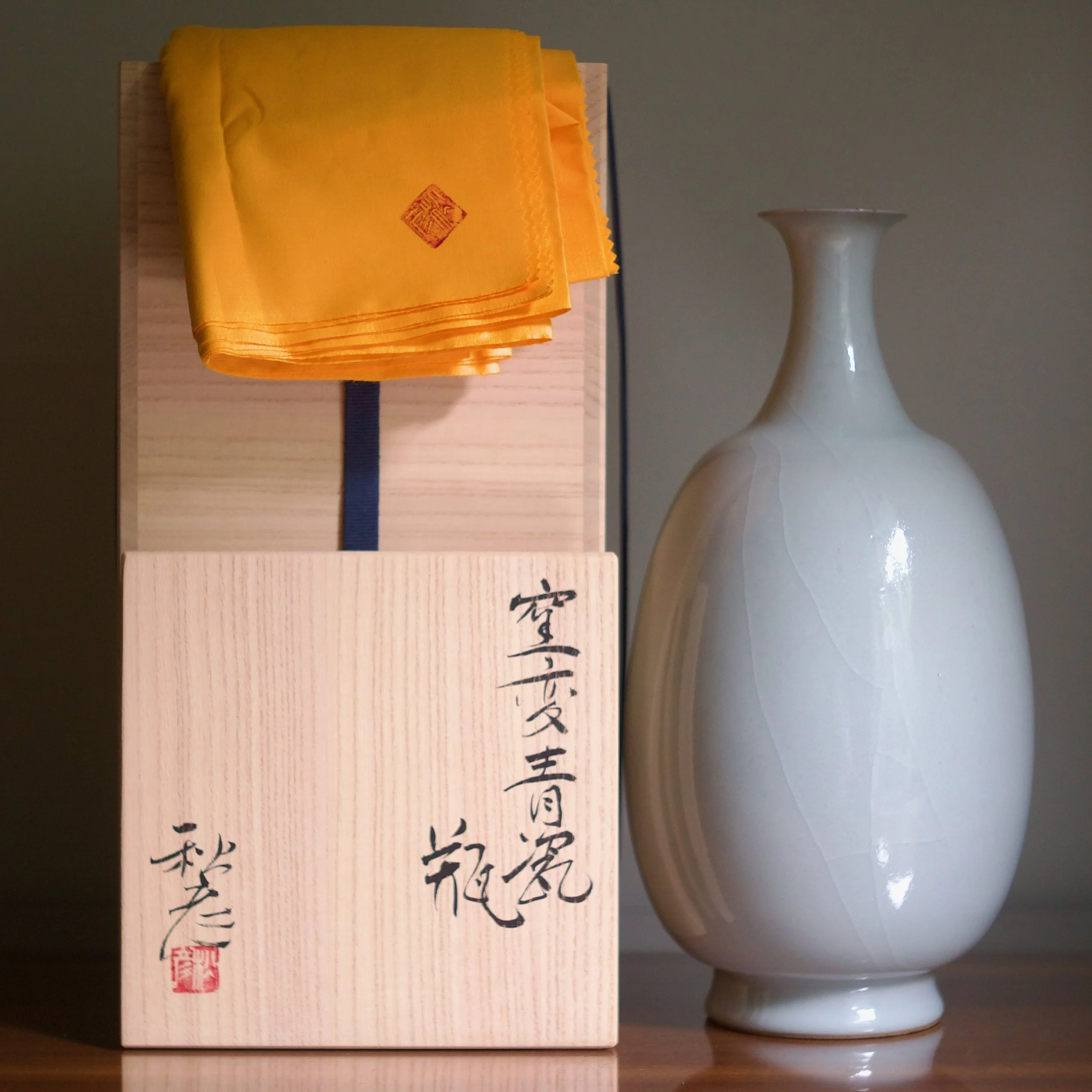 There is a very soft blush in the celadon where the neck meets the body, which is the yohen or kiln effects from its atmospheric firing. Even though Watanabe places his pieces in protective saggars there are nonetheless slight artifacts caused by the wood fuel he chooses to use. And these subtle differences are important to Watanabe.