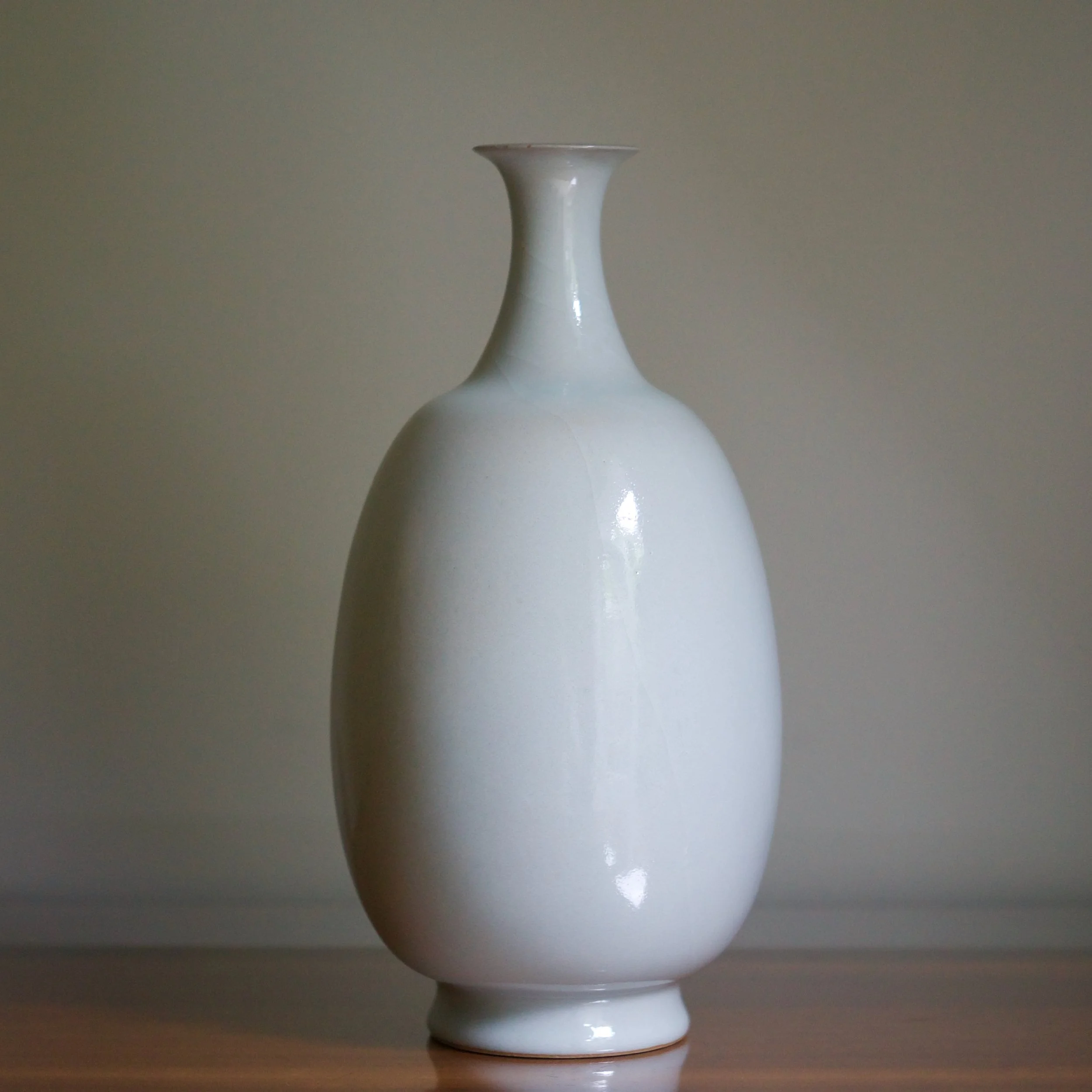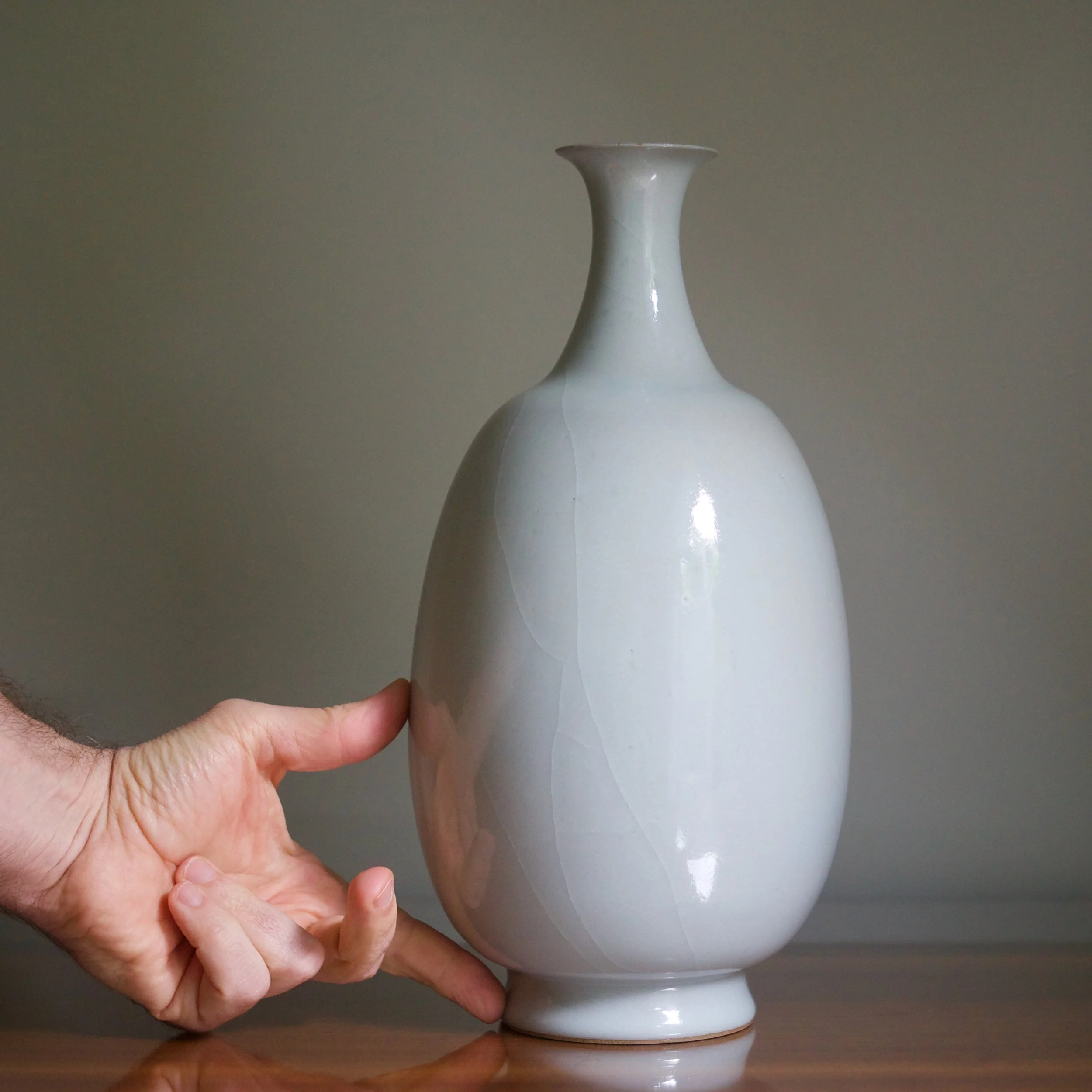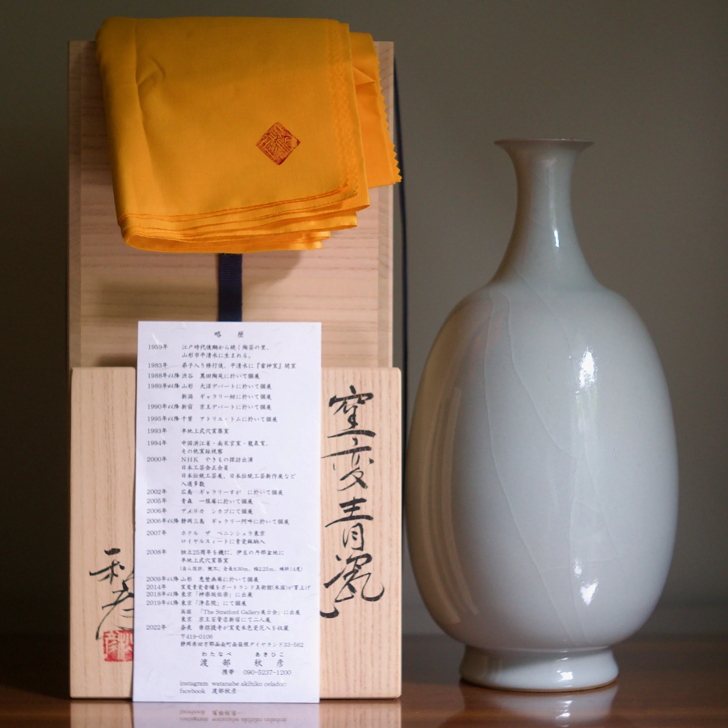 Currently based in Shizuoka, Watanabe Akihiko made this large celadon bottle vase almost 20 years ago at his previous studio in Yamagata prefecture. Wood-fired in his kiln “Raijin” - or “Thunder God” - it emerged an unusual grey-blue which, Watanabe says, he’s never achieved since. He was very pleased with the elegant proportions - inspired by classic Tang dynasty pear-shaped forms - and decided to keep it for himself.
