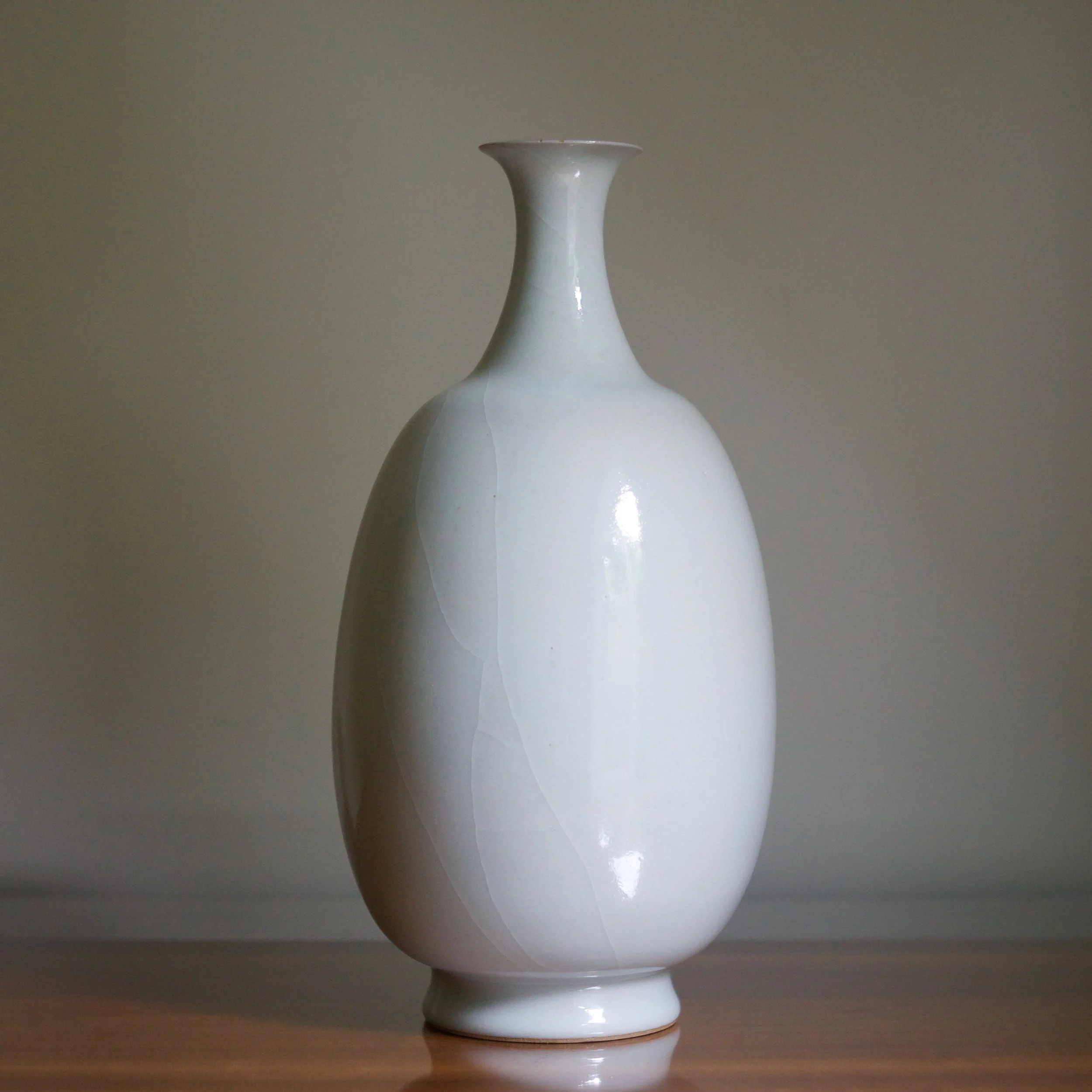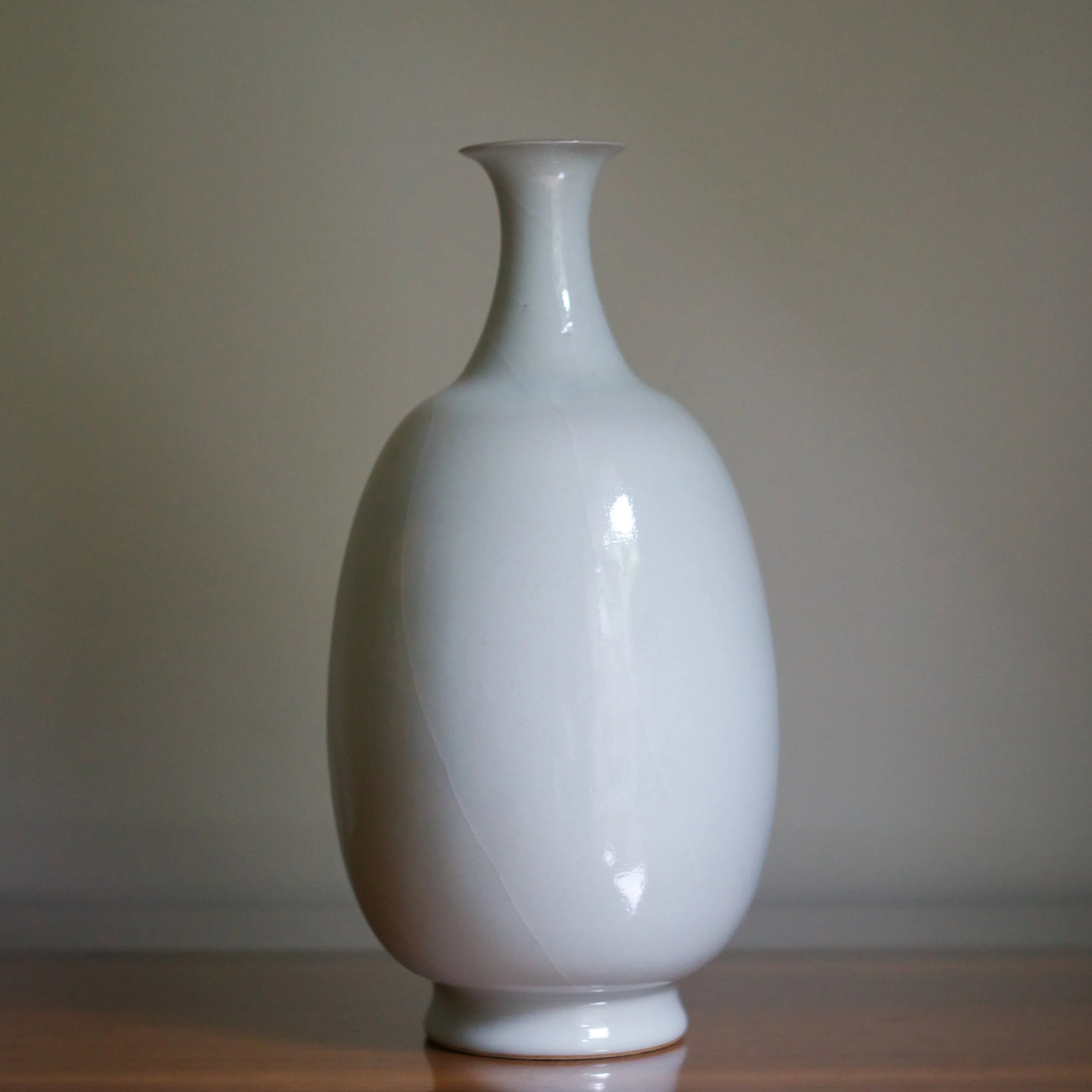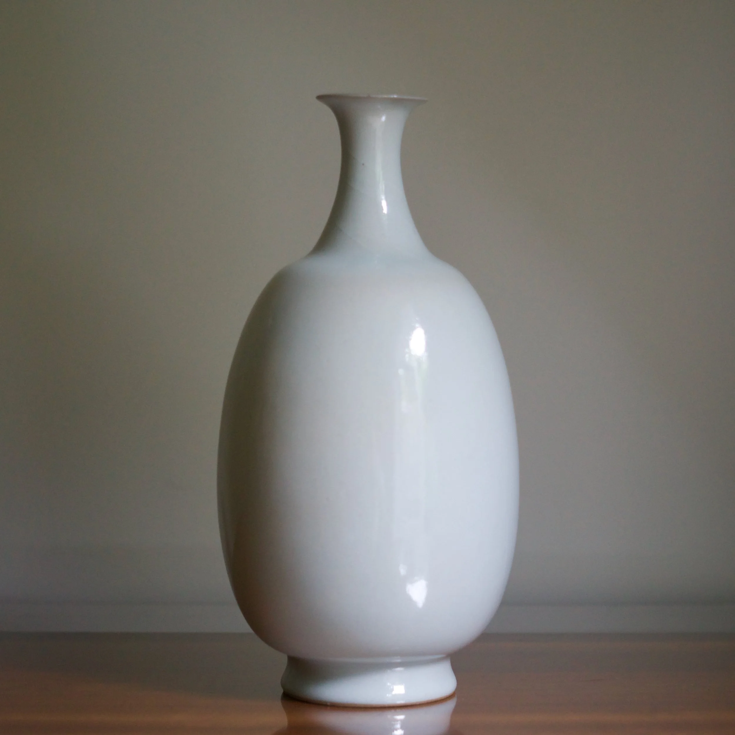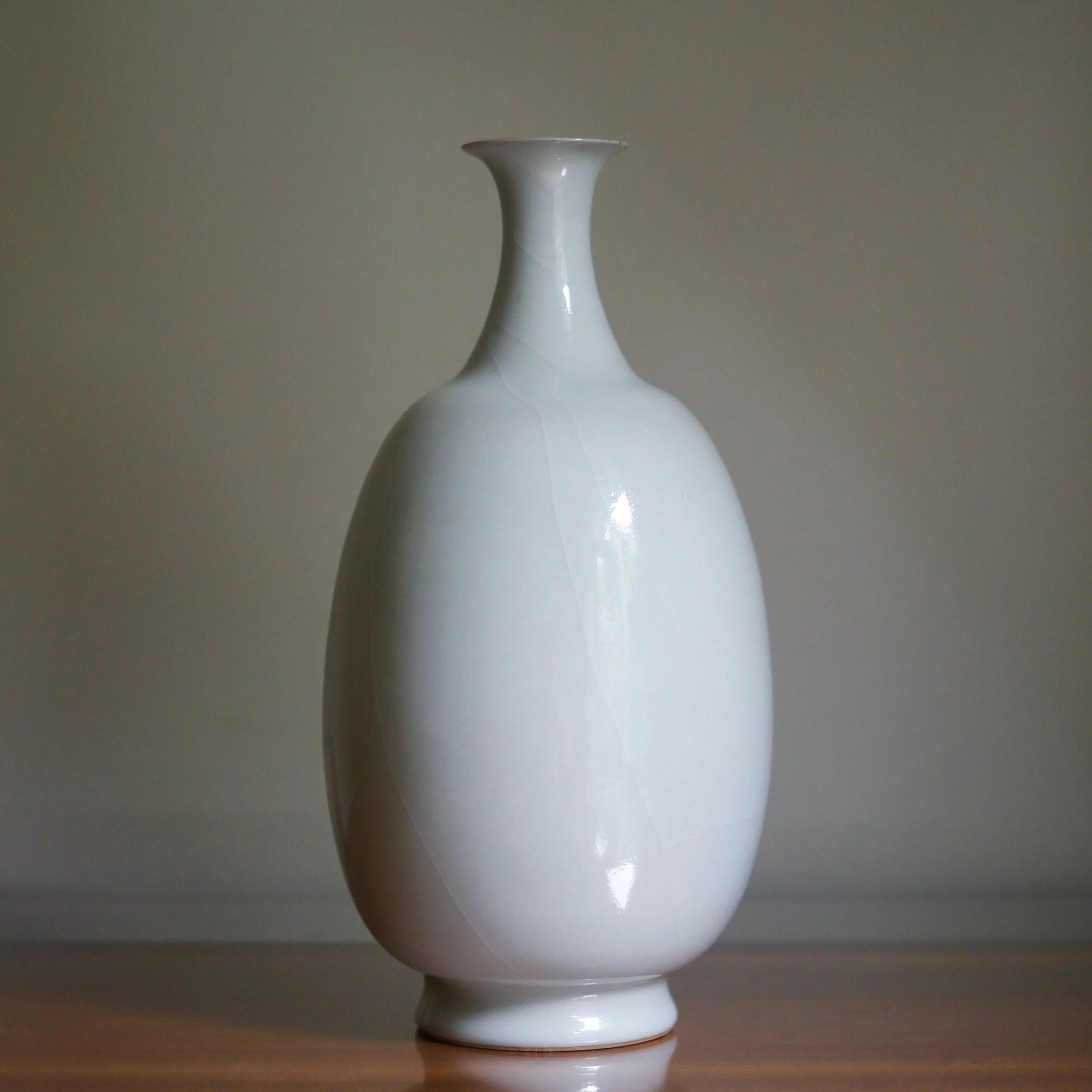 Currently based in Shizuoka, Watanabe Akihiko made this large celadon bottle vase almost 20 years ago at his previous studio in Yamagata prefecture. Wood-fired in his kiln “Raijin” - or “Thunder God” - it emerged an unusual grey-blue which, Watanabe says, he’s never achieved since. He was very pleased with the elegant proportions - inspired by classic Tang dynasty pear-shaped forms - and decided to keep it for himself.