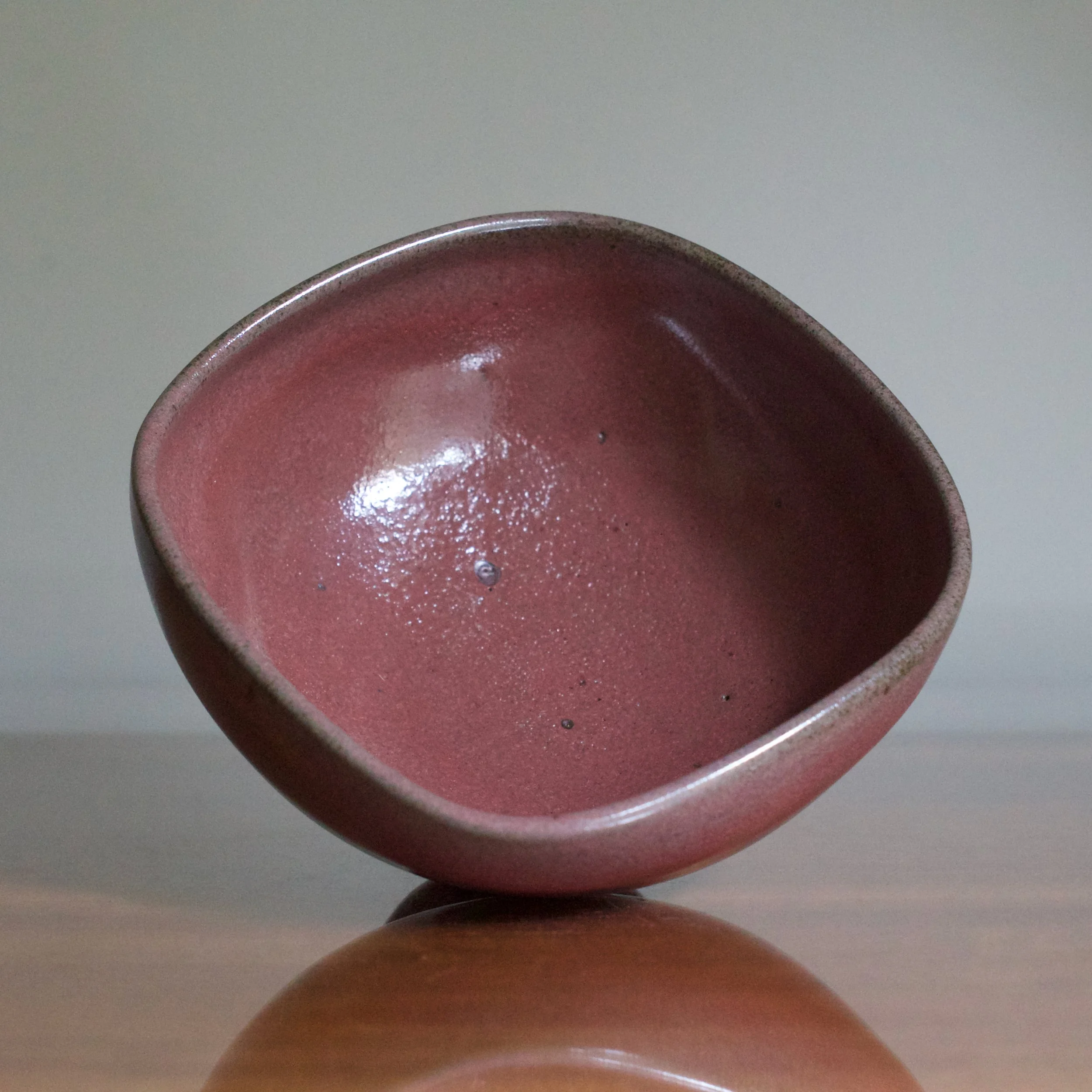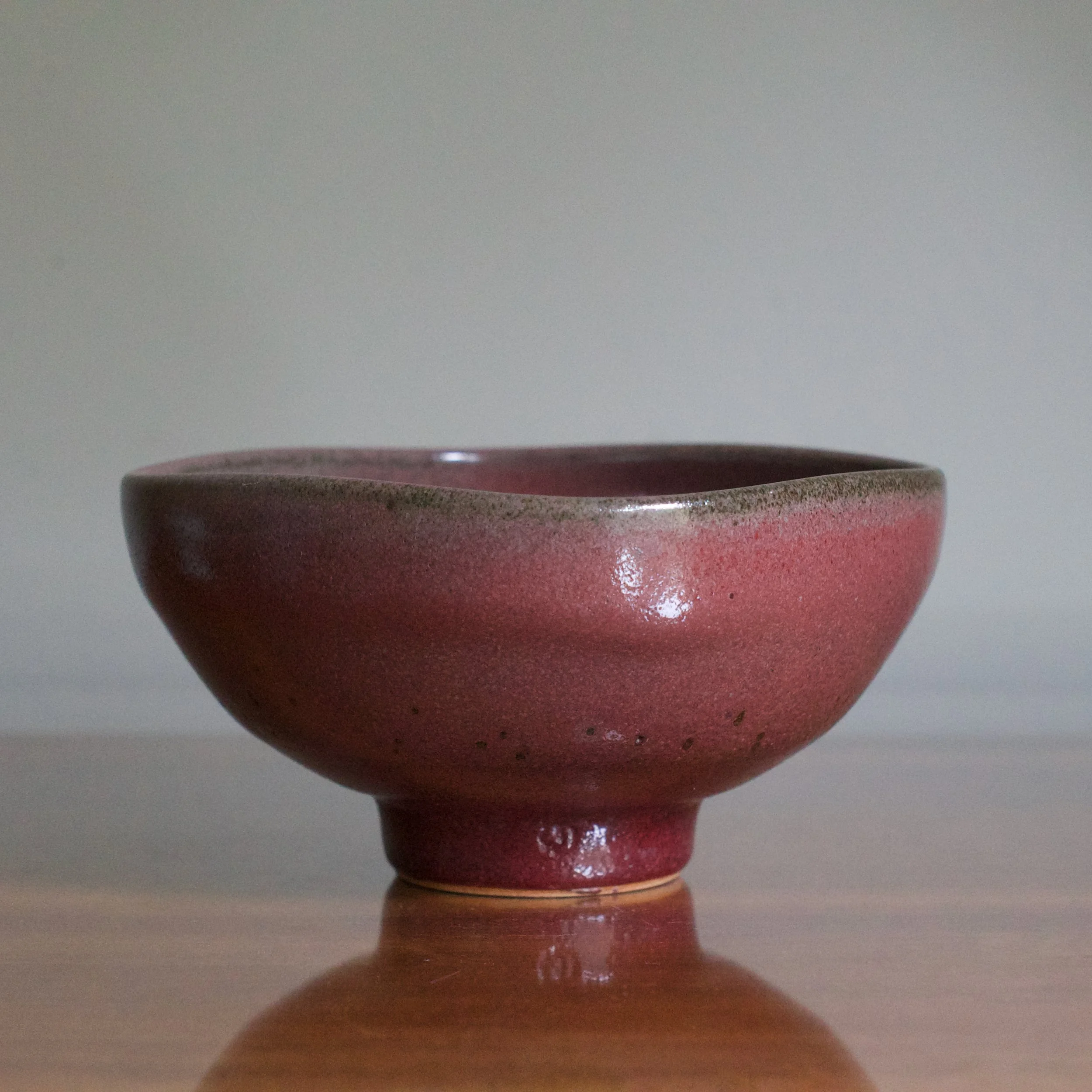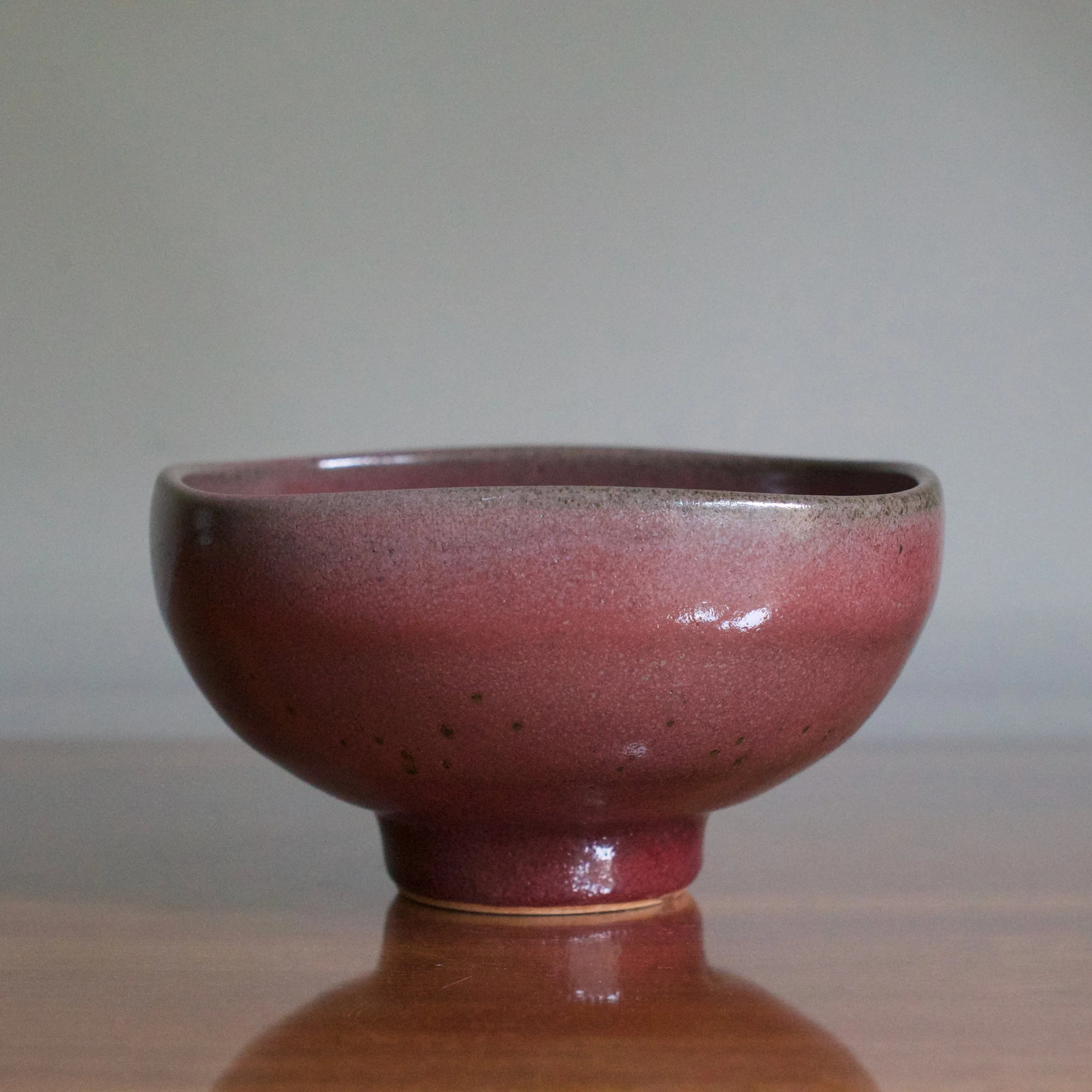The sway Song Chinese and Goryeo Korean celadons held over her own work is obvious in this tea bowl. She glazed this bowl with a copper-based glaze and then fired it in oxidation. The squared corners and slightly curving lip add an elegant dimension and offer various places on the rim from which to sip tea.