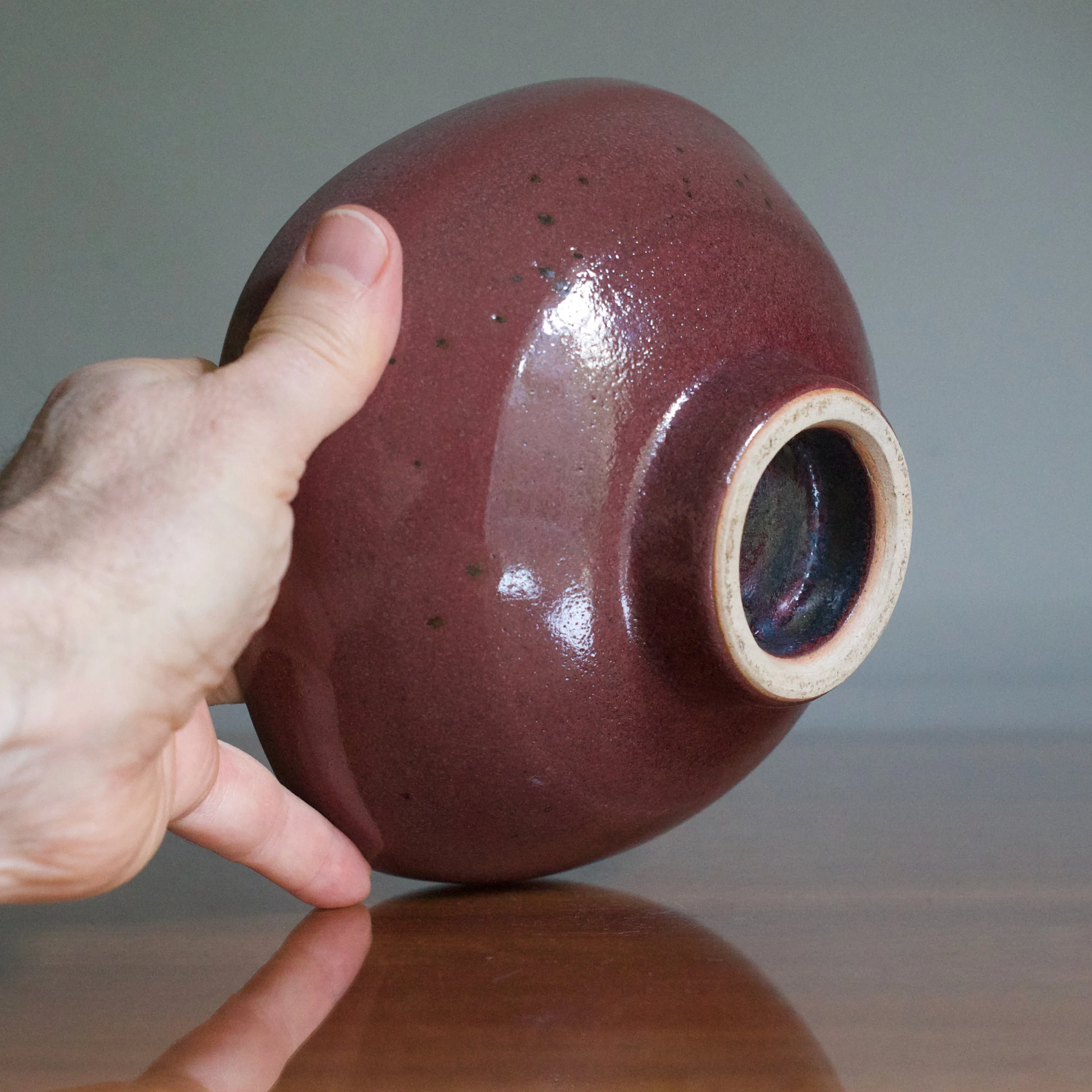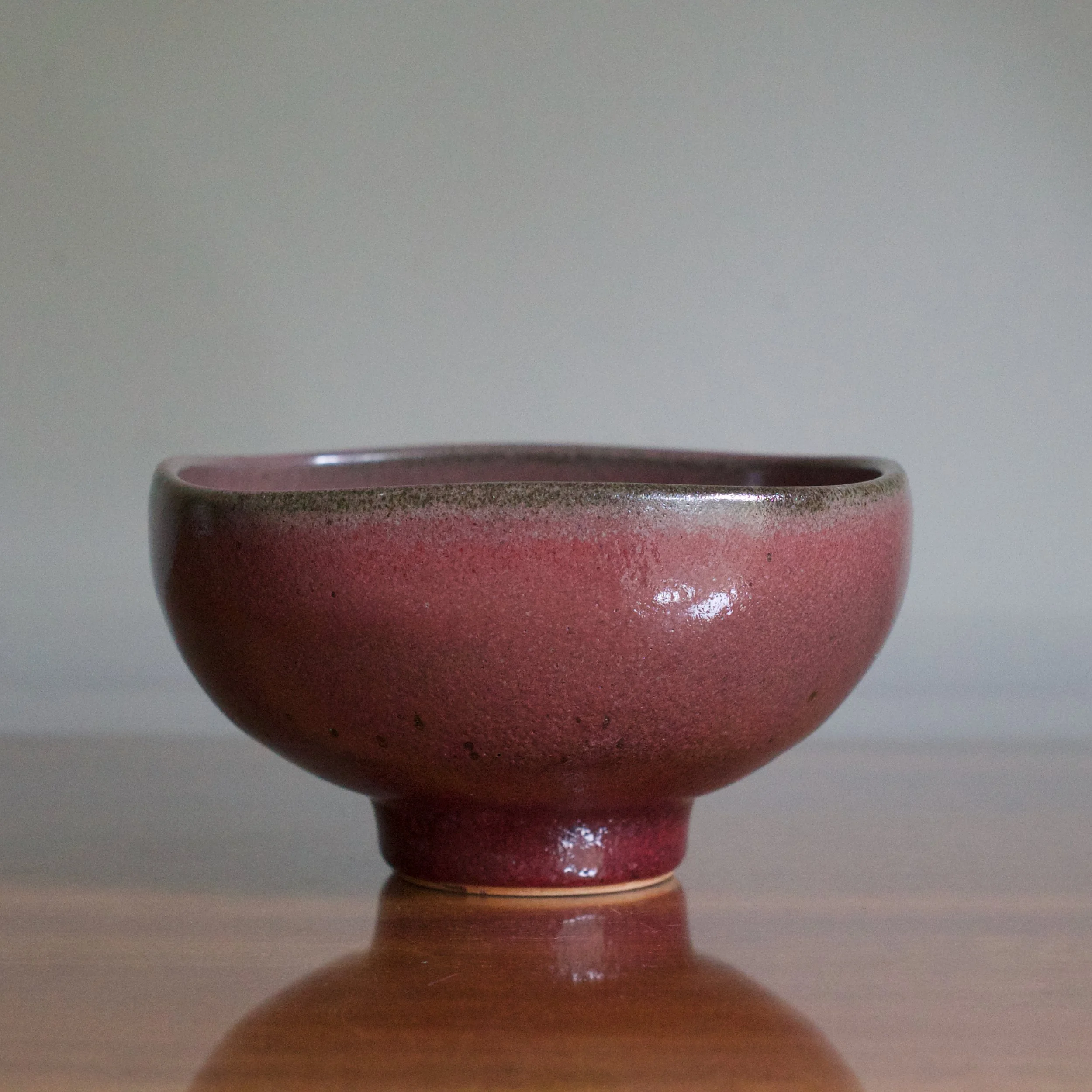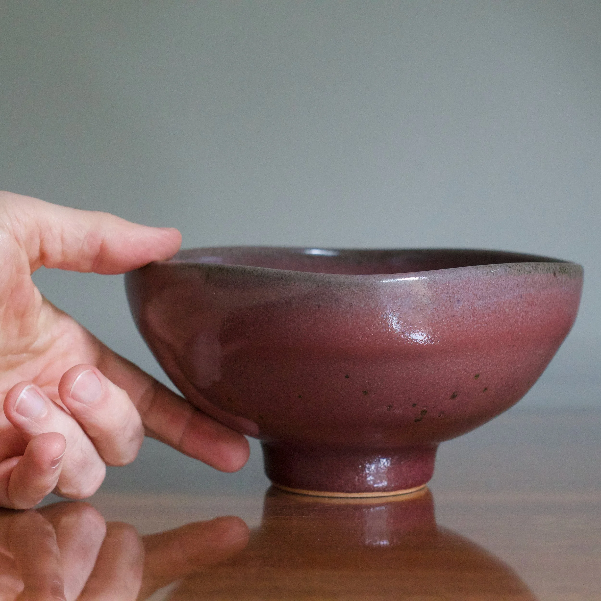 The sway Song Chinese and Goryeo Korean celadons held over her own work is obvious in this tea bowl. She glazed this bowl with a copper-based glaze and then fired it in oxidation. The squared corners and slightly curving lip add an elegant dimension and offer various places on the rim from which to sip tea.