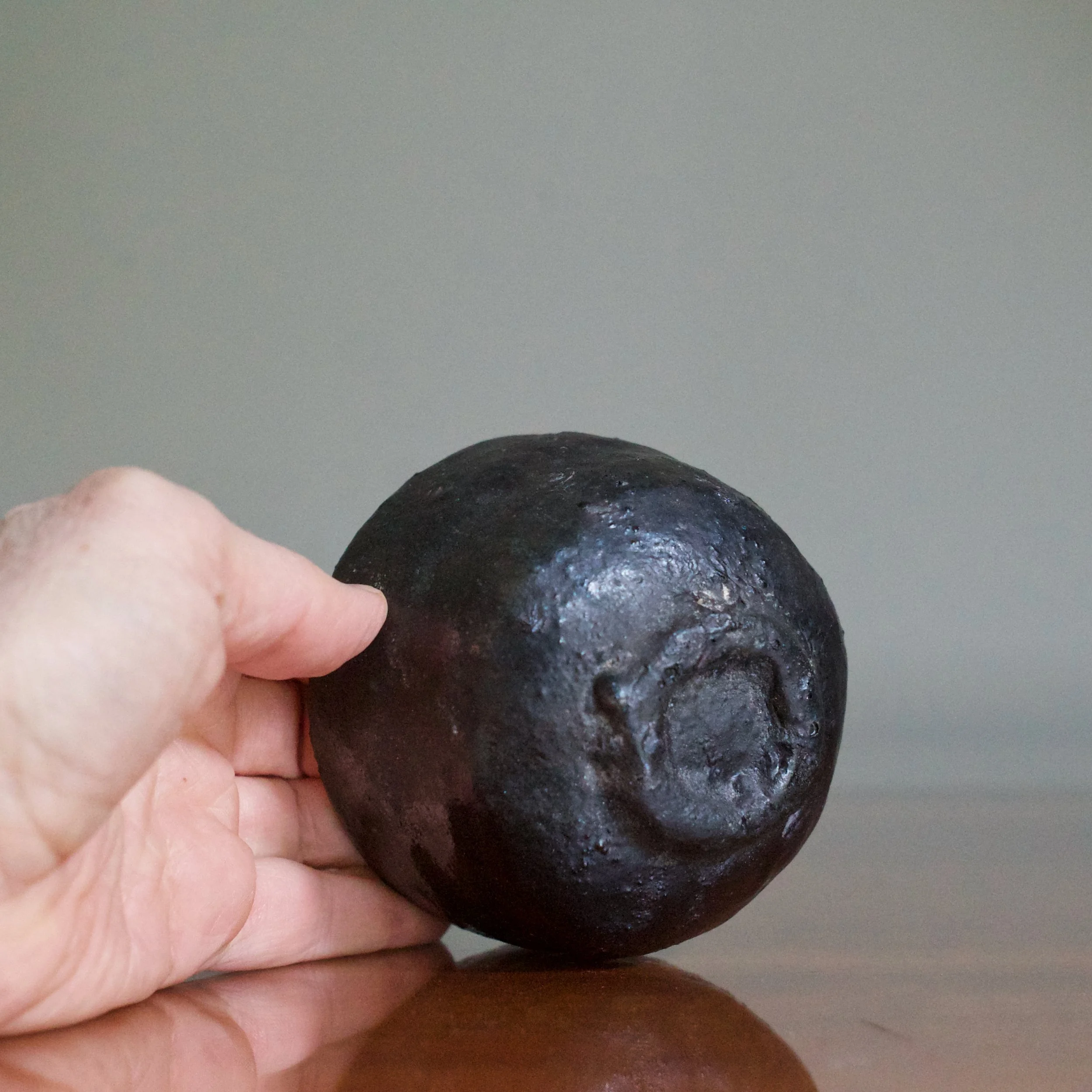 The blacks Claire Landais-Sauvage had previously achieved were always glossy. But with “Little raven” she was able to discover a serene satin finish. Making her glaze from iron stones she gathered from a former forge site, Landais-Sauvage glazed this hand-formed tea bowl and then fired it in her small Japanese charcoal kiln “Coeur de Braises.”