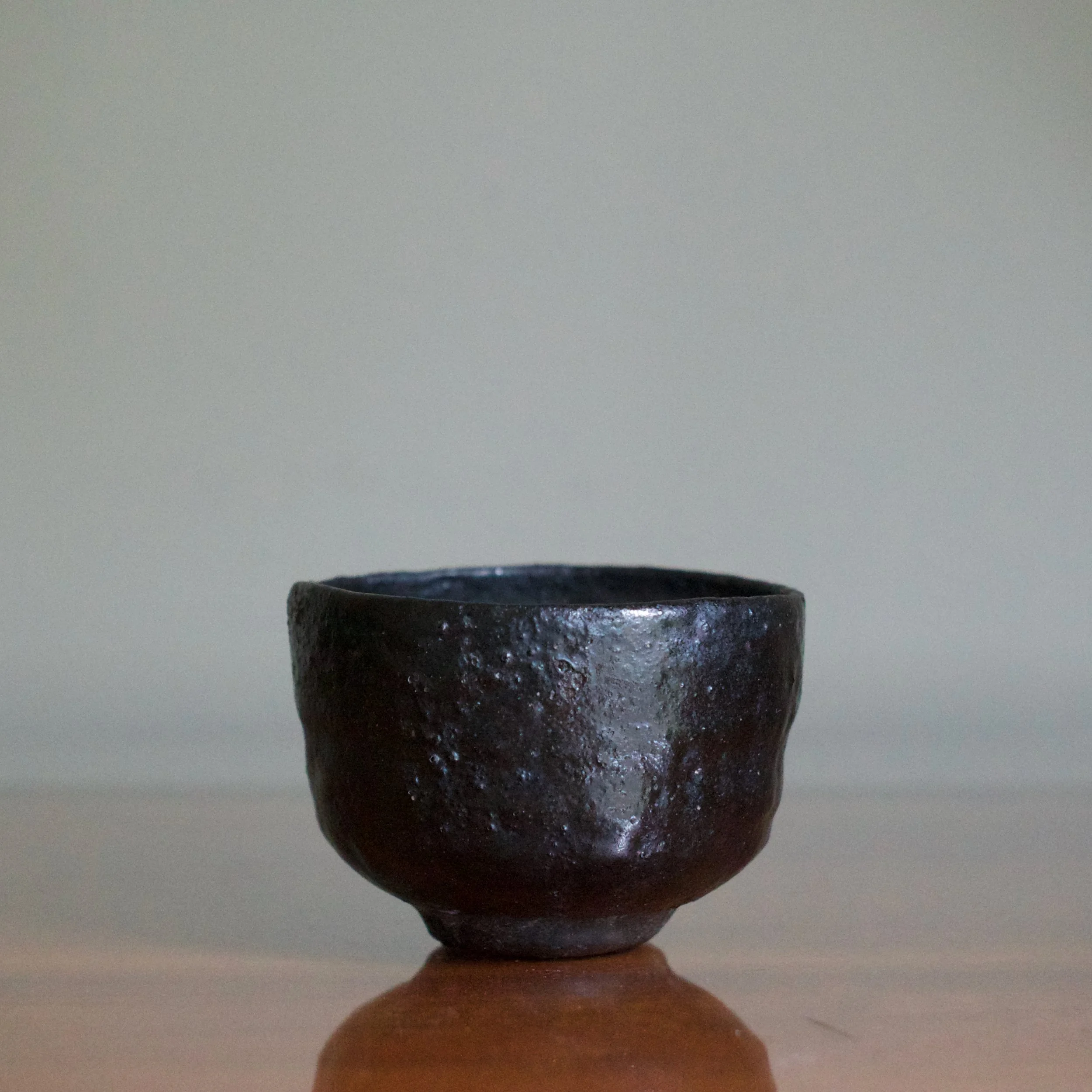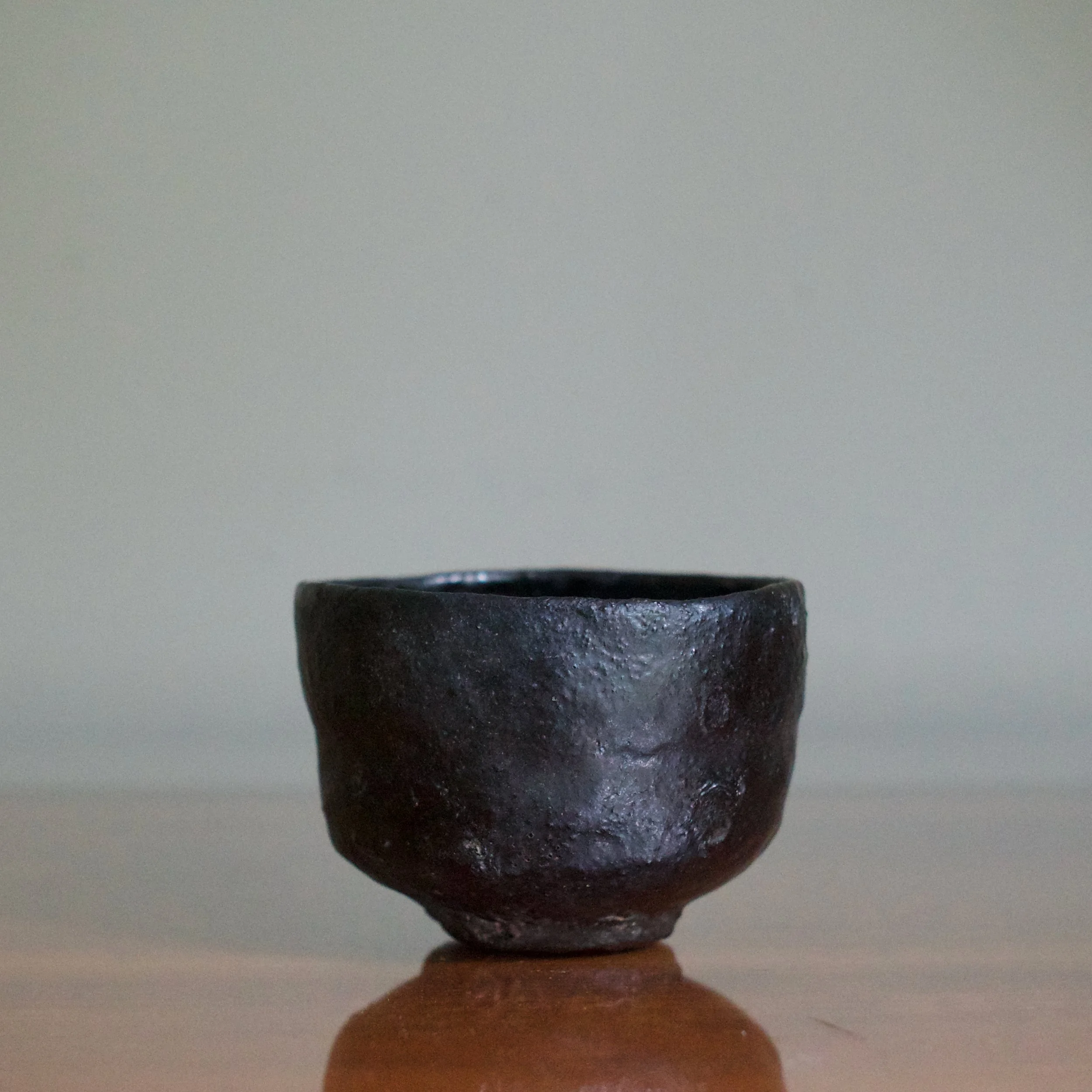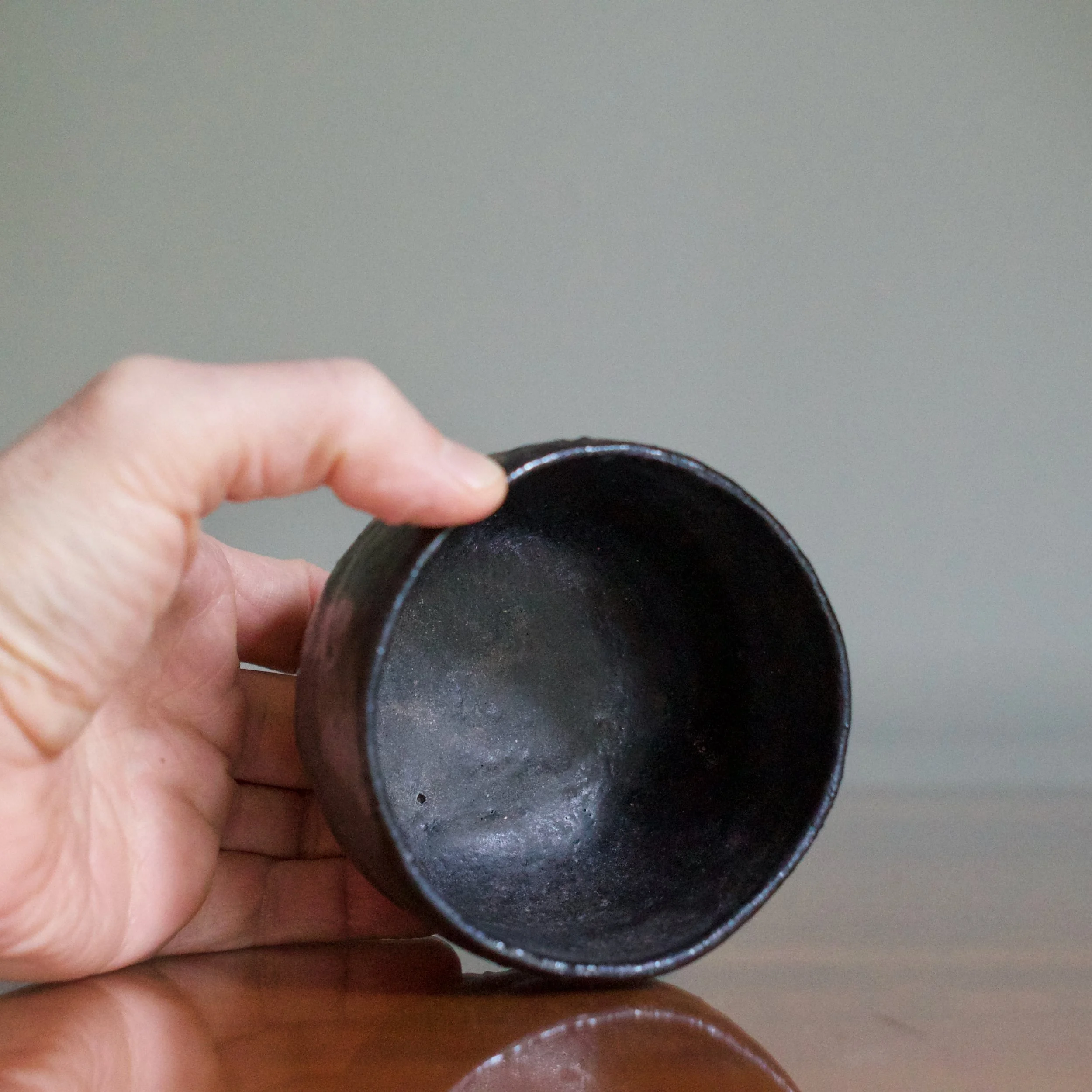 Using the hikidashi technique of removing the chawan from the kiln while glowing hot, she quickly submerged the bowl in ashes she’d gathered from her stove. The material reacted with the hot clay to make an instant glaze. The tea bowl’s surface emerged with a beautiful range of blacks, varying from satin to matte. It is like a raven’s dull-black beak and shiny black feathers.