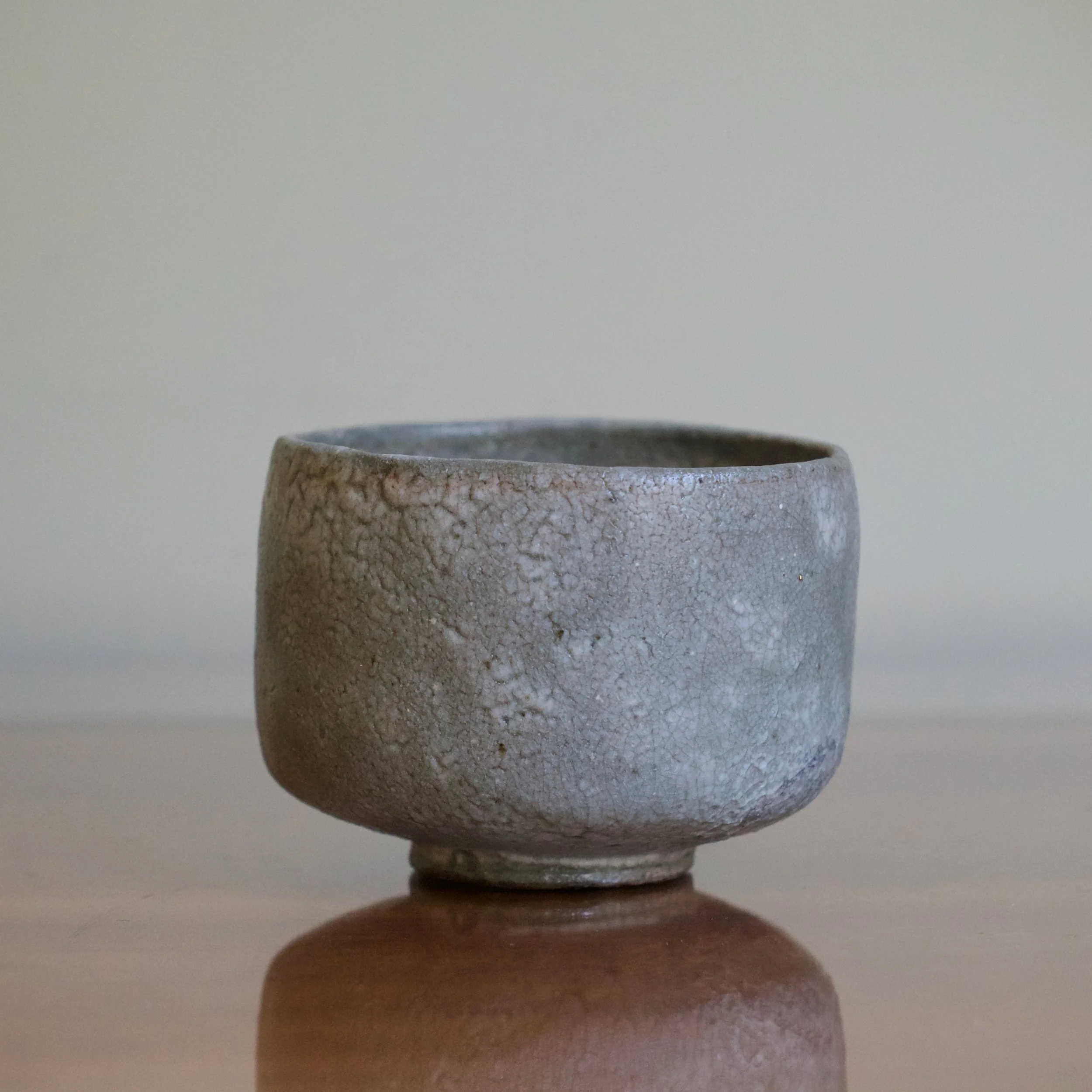Once formed, Landais-Sauvage coated the chawan with a glaze made with ash, ground oyster shells, and a flux. It was then wood-fired in her Cranes kiln to a temperature of around 1000 °C. After cooling, the tea bowl’s surface revealed a landscape of soft cloudy greys and warm blush tones.