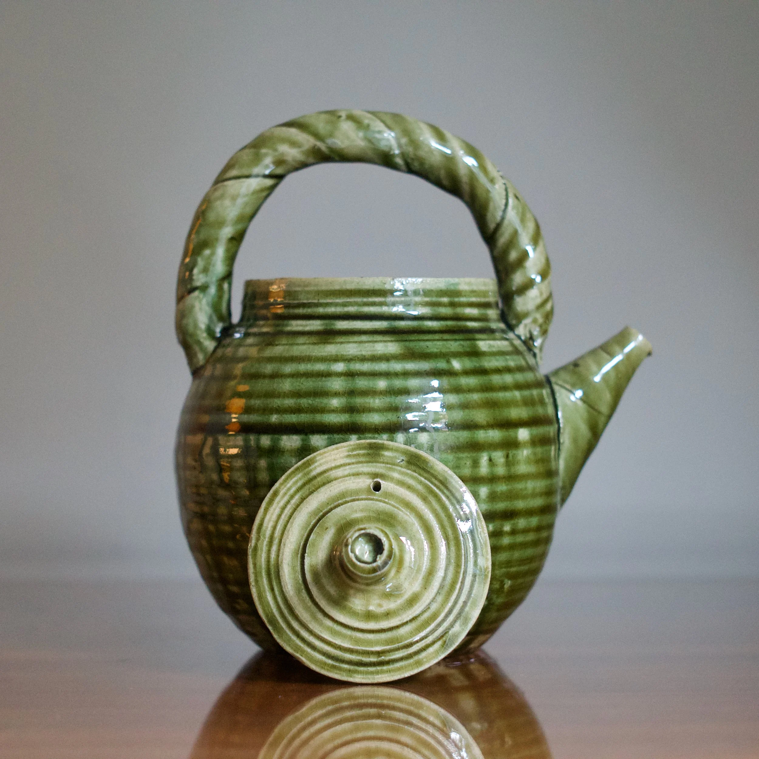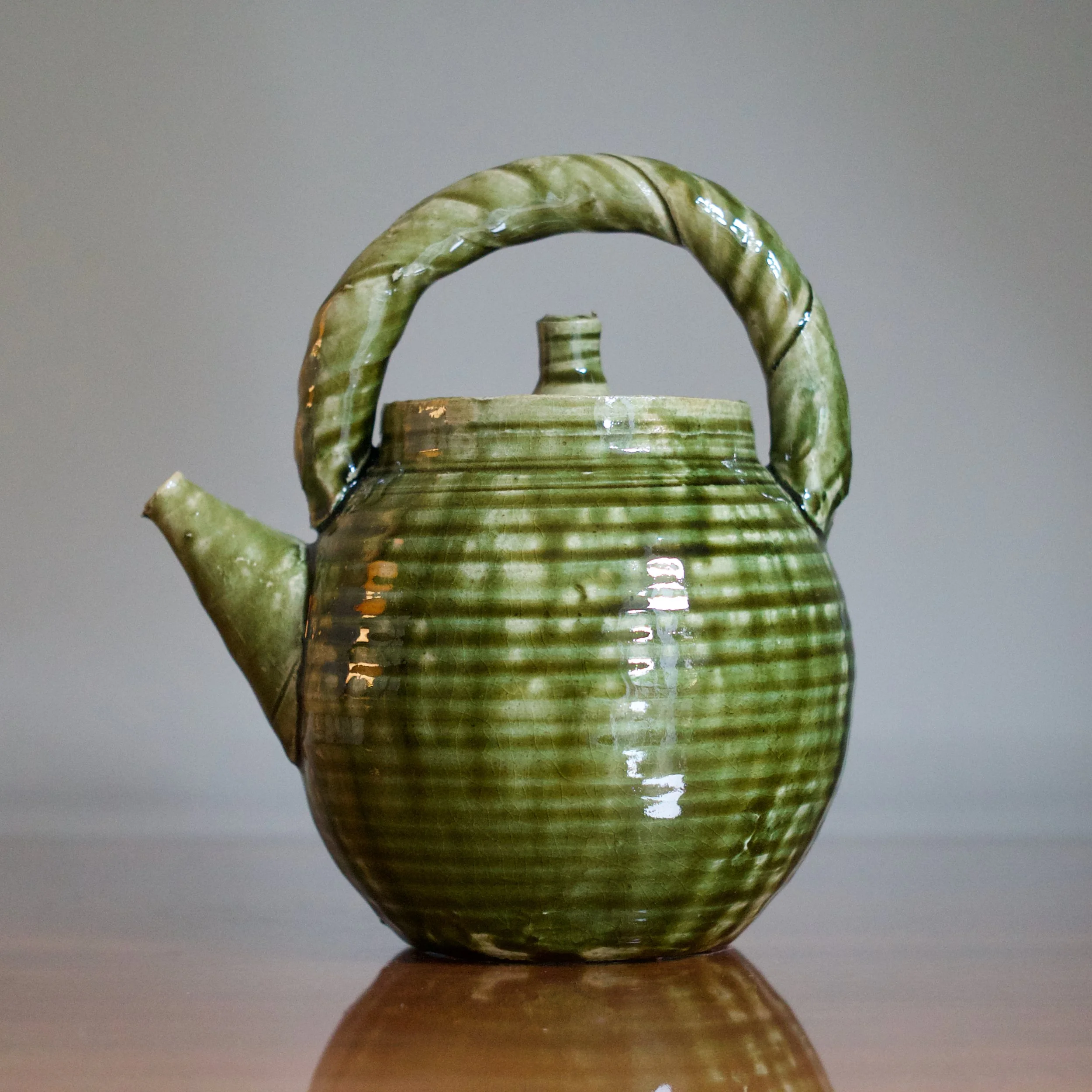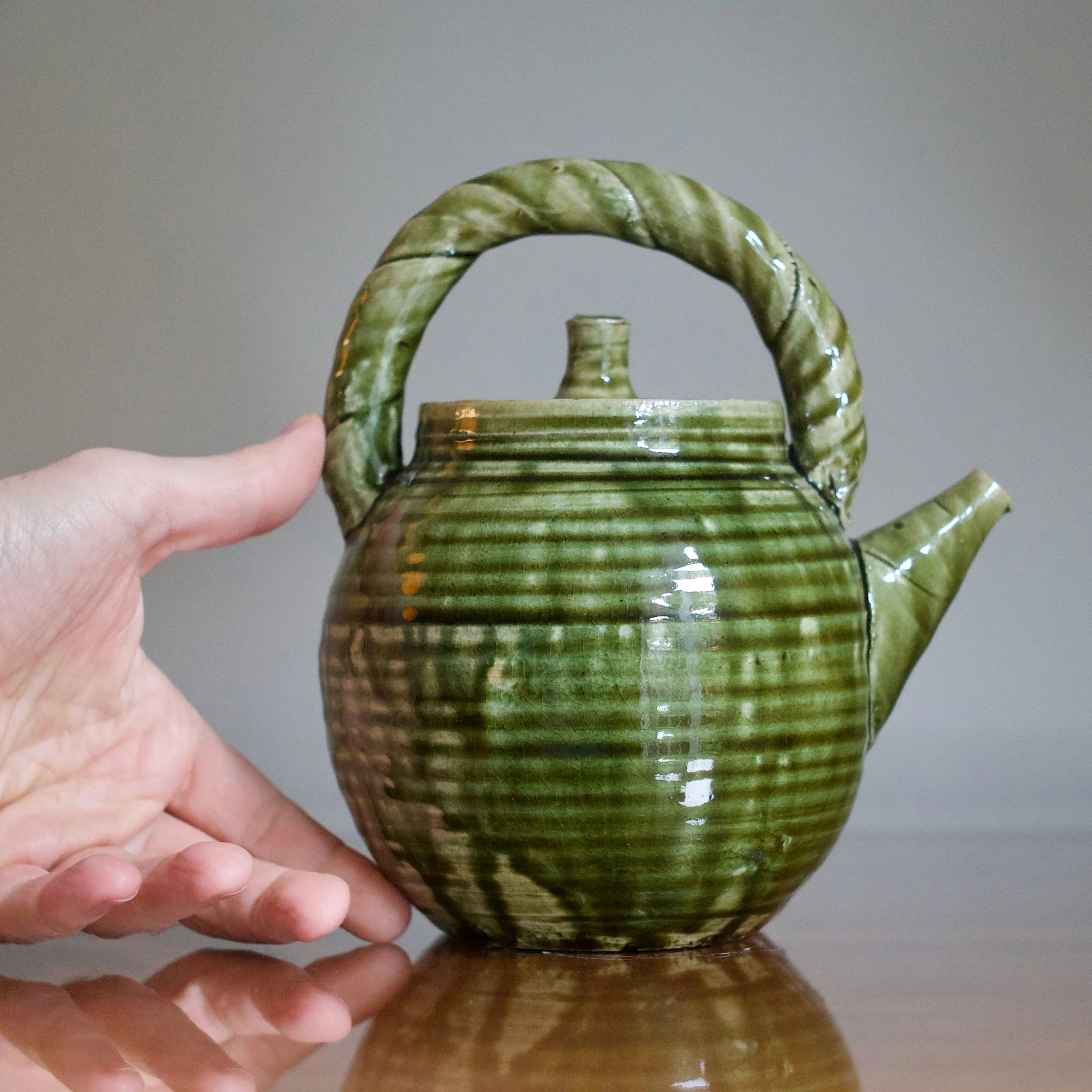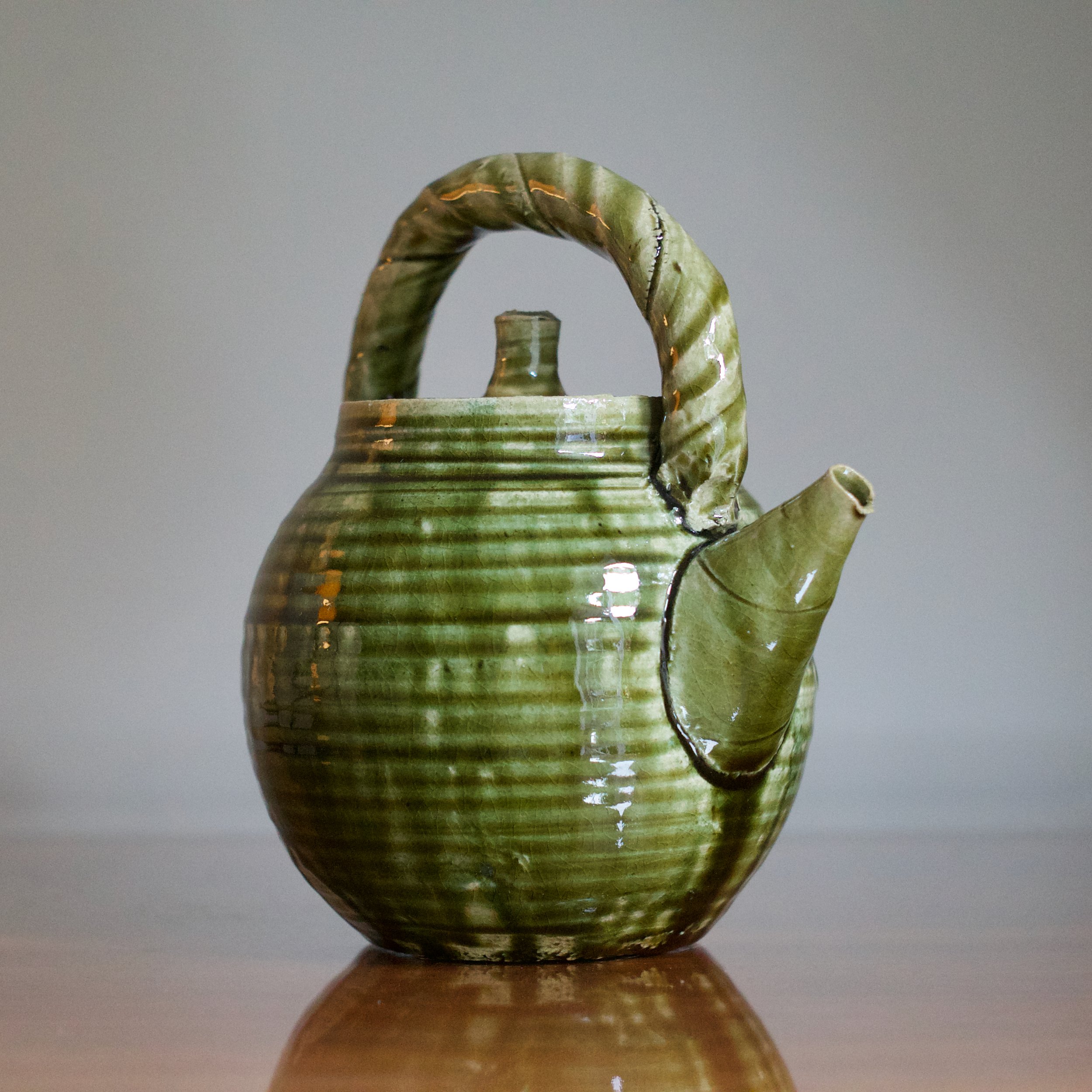 While Suzuki is perhaps best known for his classic Yashichida and Narumi Oribes - featuring iron-oxide underglaze illustrations - it’s his sō-Oribe, or Monochrome Oribe, that allows him to demonstrate his sculptural talents. This teapot’s throw-lines and rolled ridges allow the lively copper glaze to rest and collect. With his flowing, glossy variety of greens, the “freshness” of Suzuki’s Oribe is on full display.