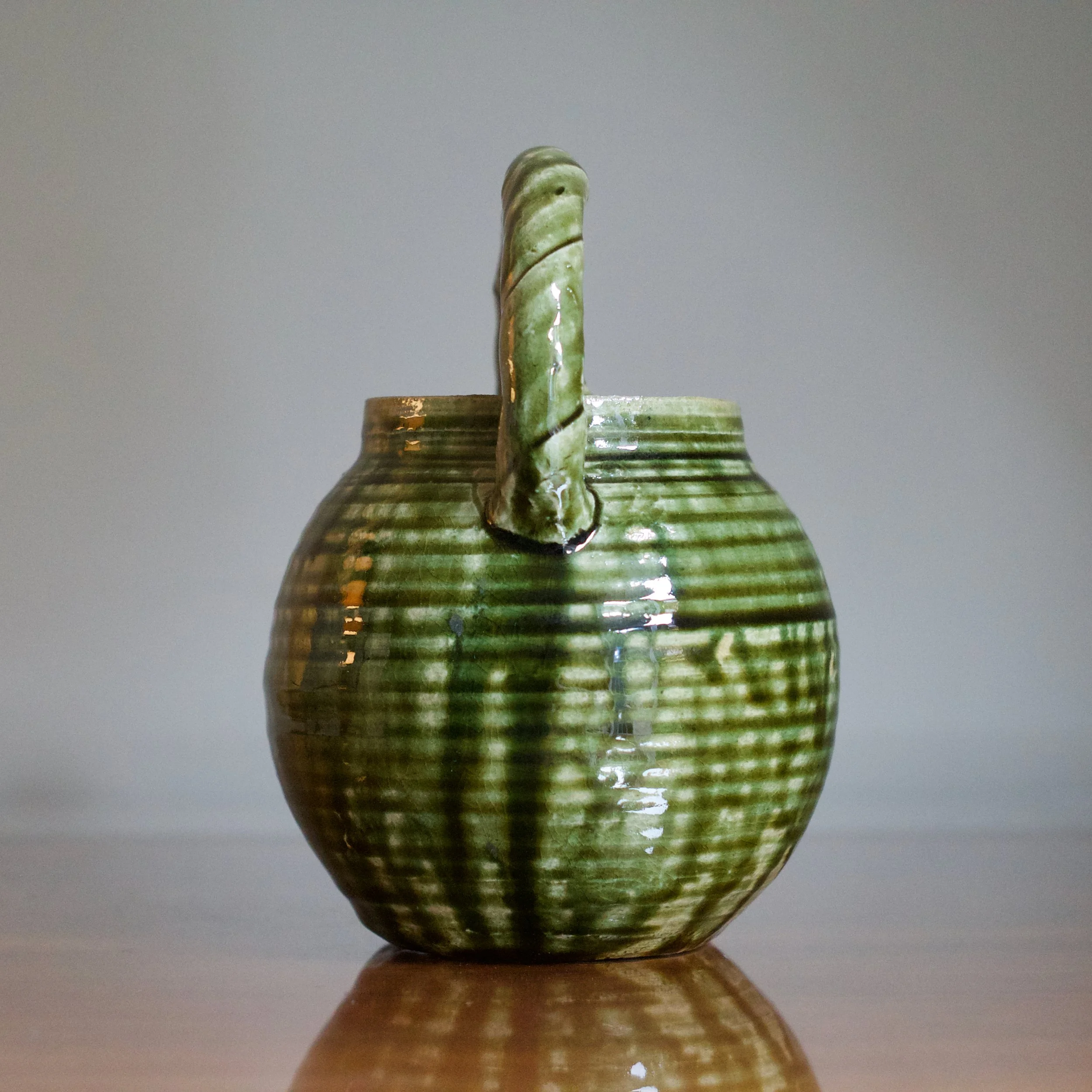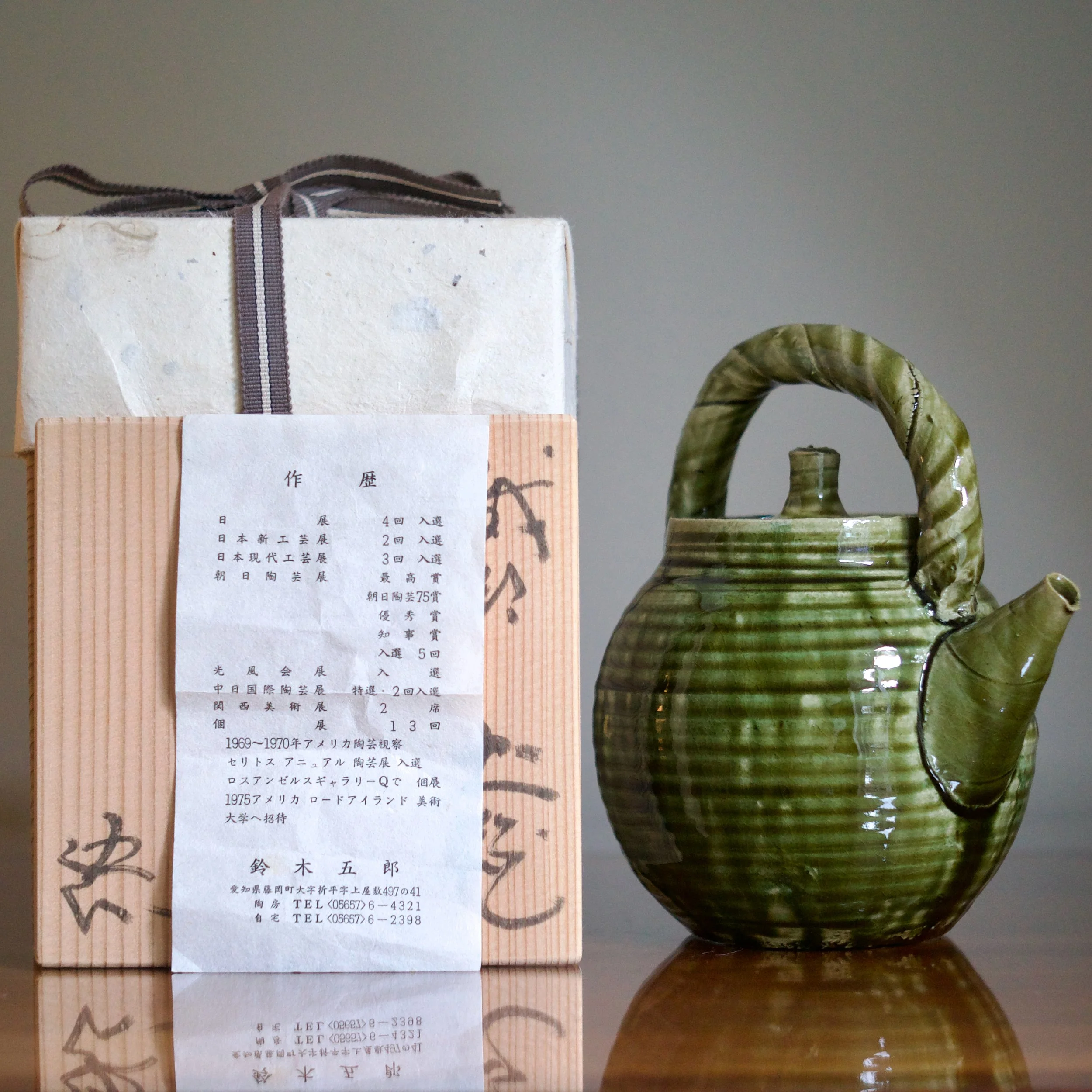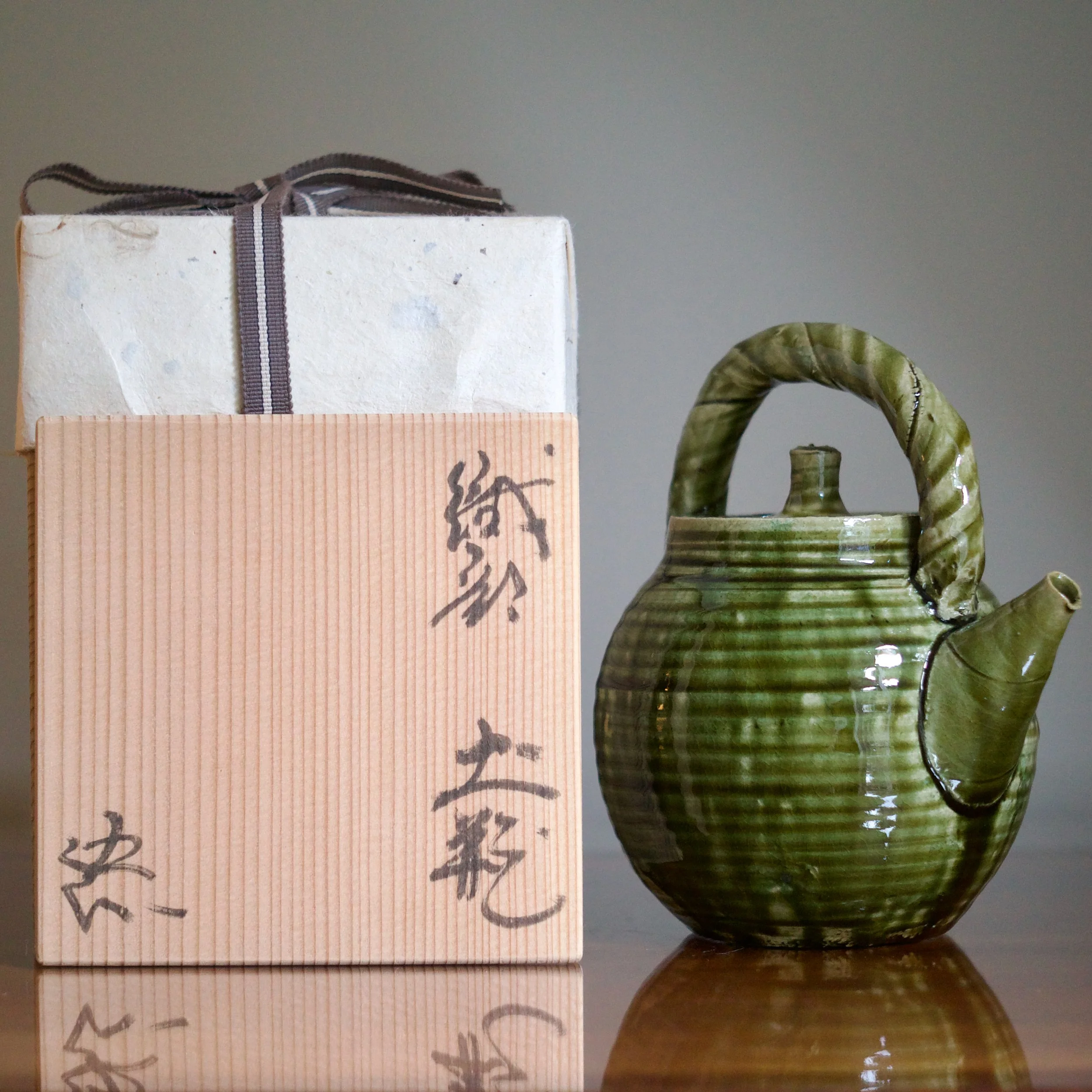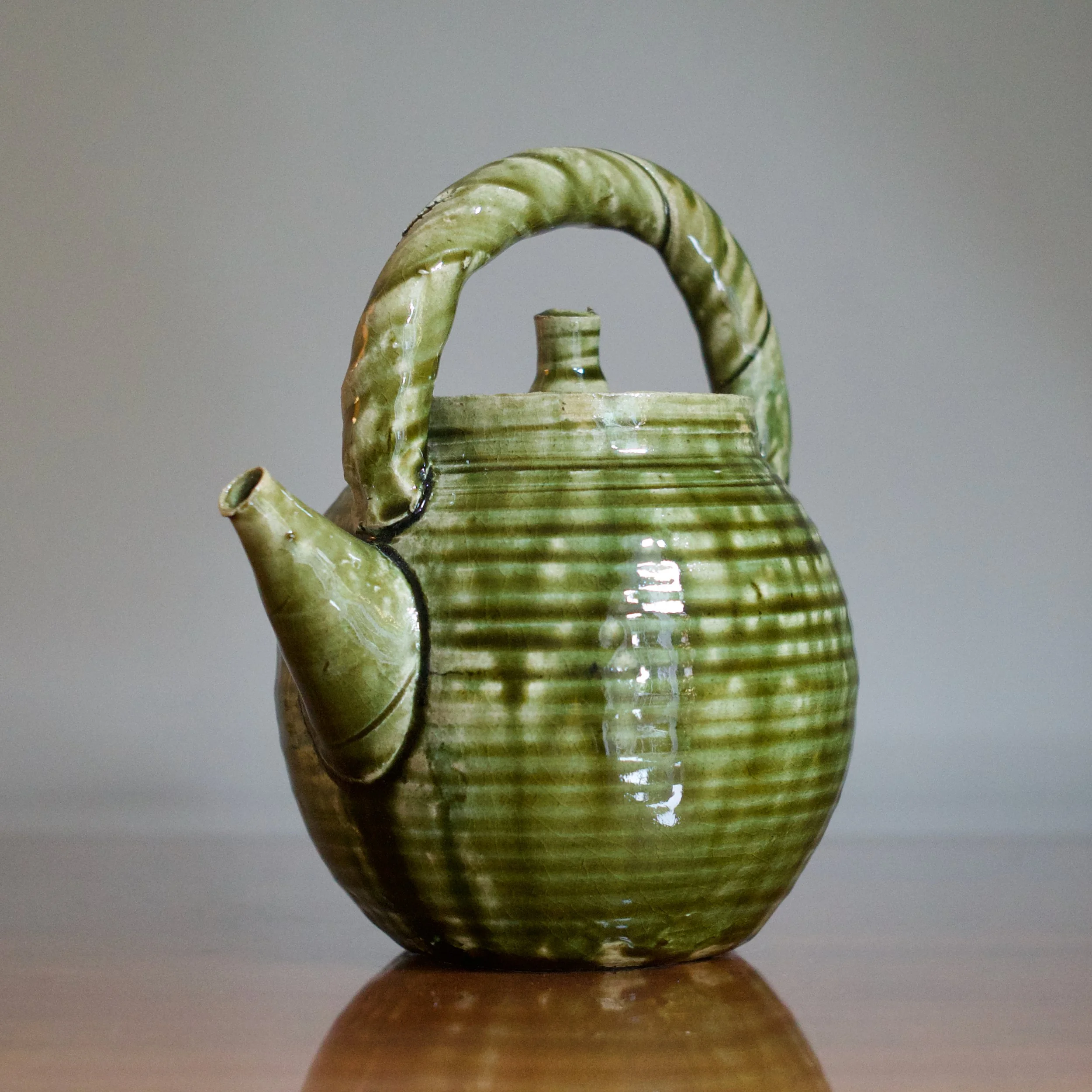 While Suzuki is perhaps best known for his classic Yashichida and Narumi Oribes - featuring iron-oxide underglaze illustrations - it’s his sō-Oribe, or Monochrome Oribe, that allows him to demonstrate his sculptural talents. This teapot’s throw-lines and rolled ridges allow the lively copper glaze to rest and collect. With his flowing, glossy variety of greens, the “freshness” of Suzuki’s Oribe is on full display.