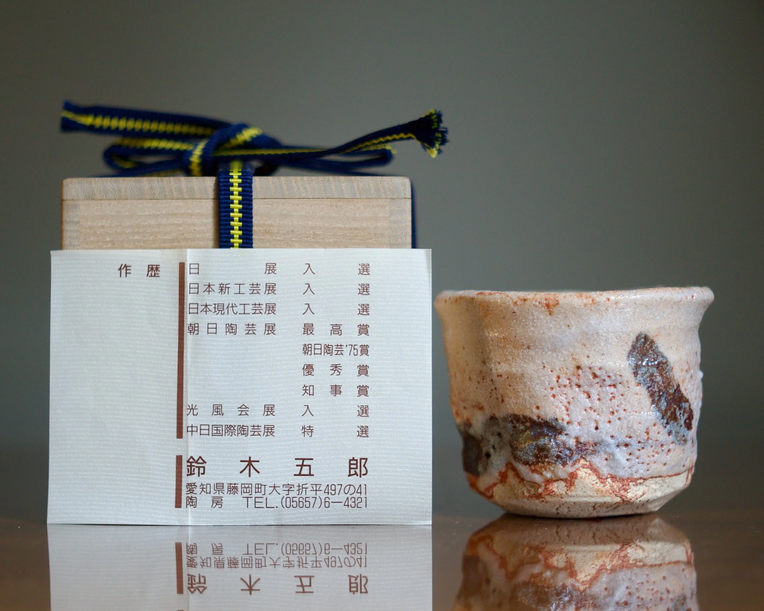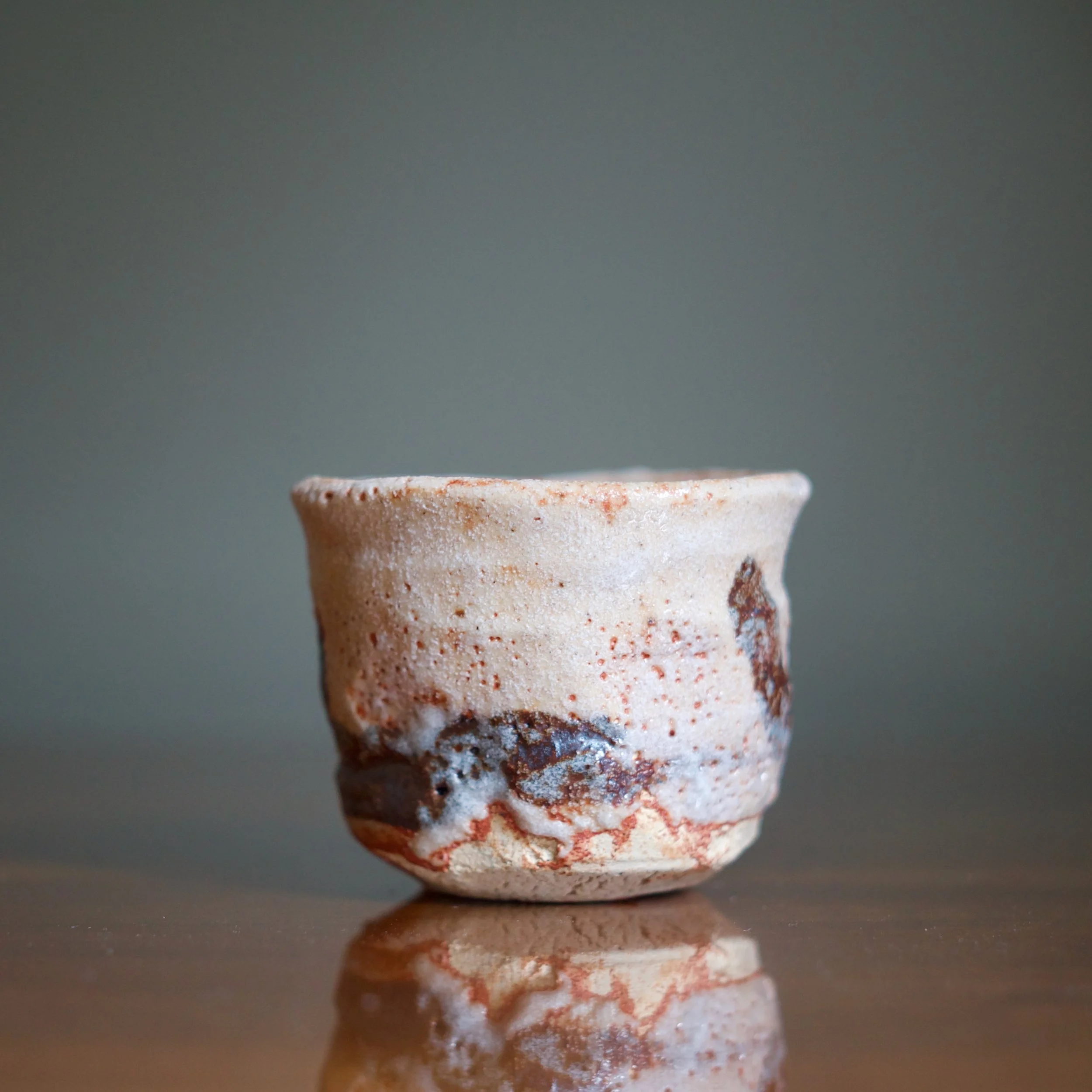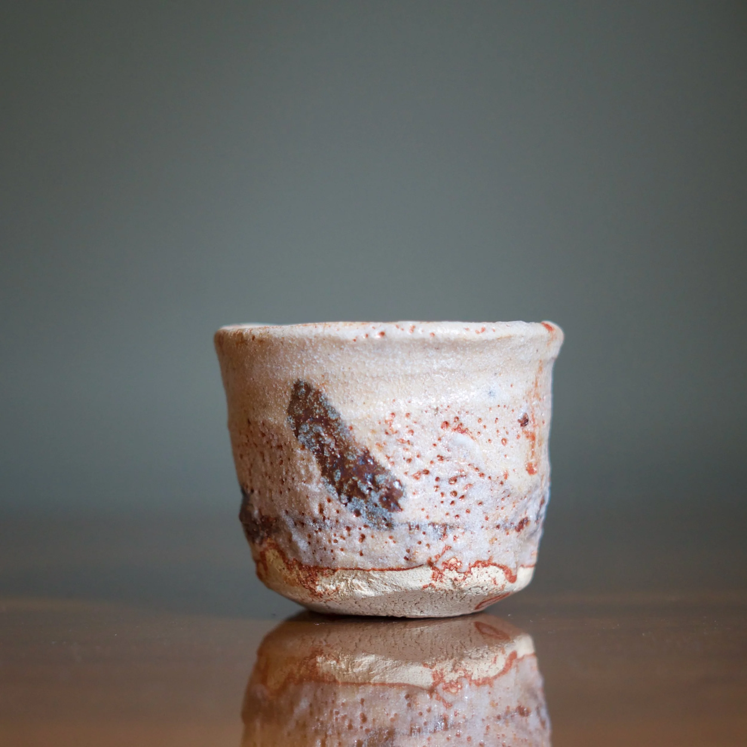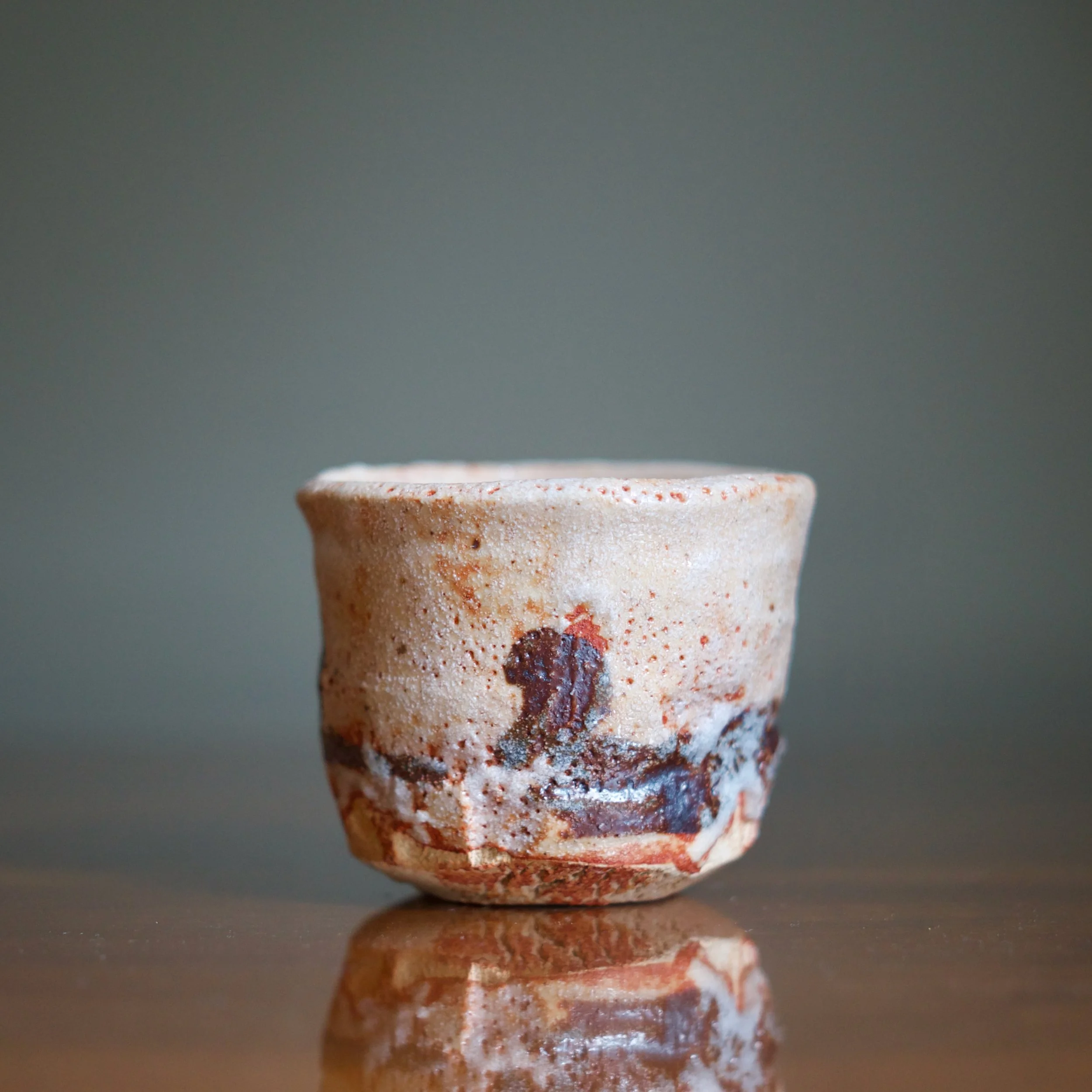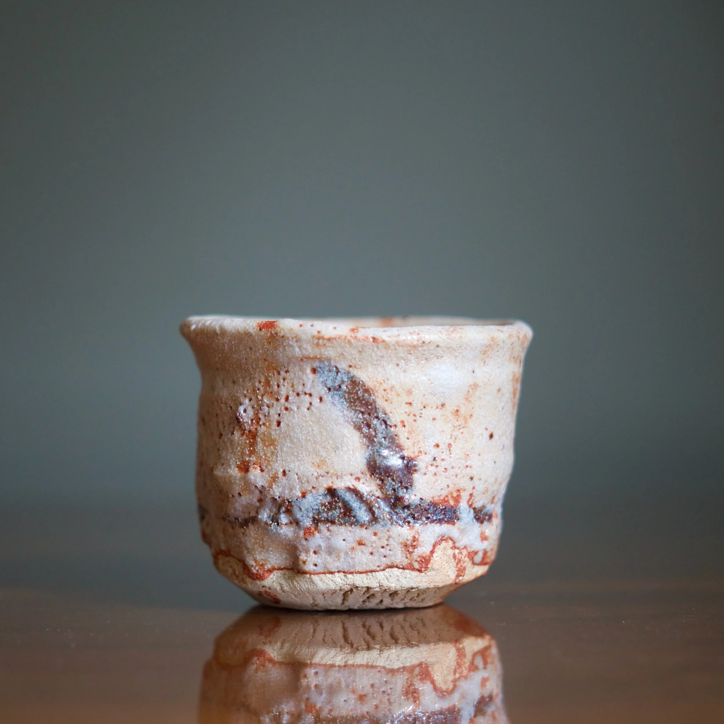 Suzuki’s cup shows off the distinctive “soft” mogusa clay used for most Mino wares. His shino glazes vary from grey and white to a soft pink with peach tones.