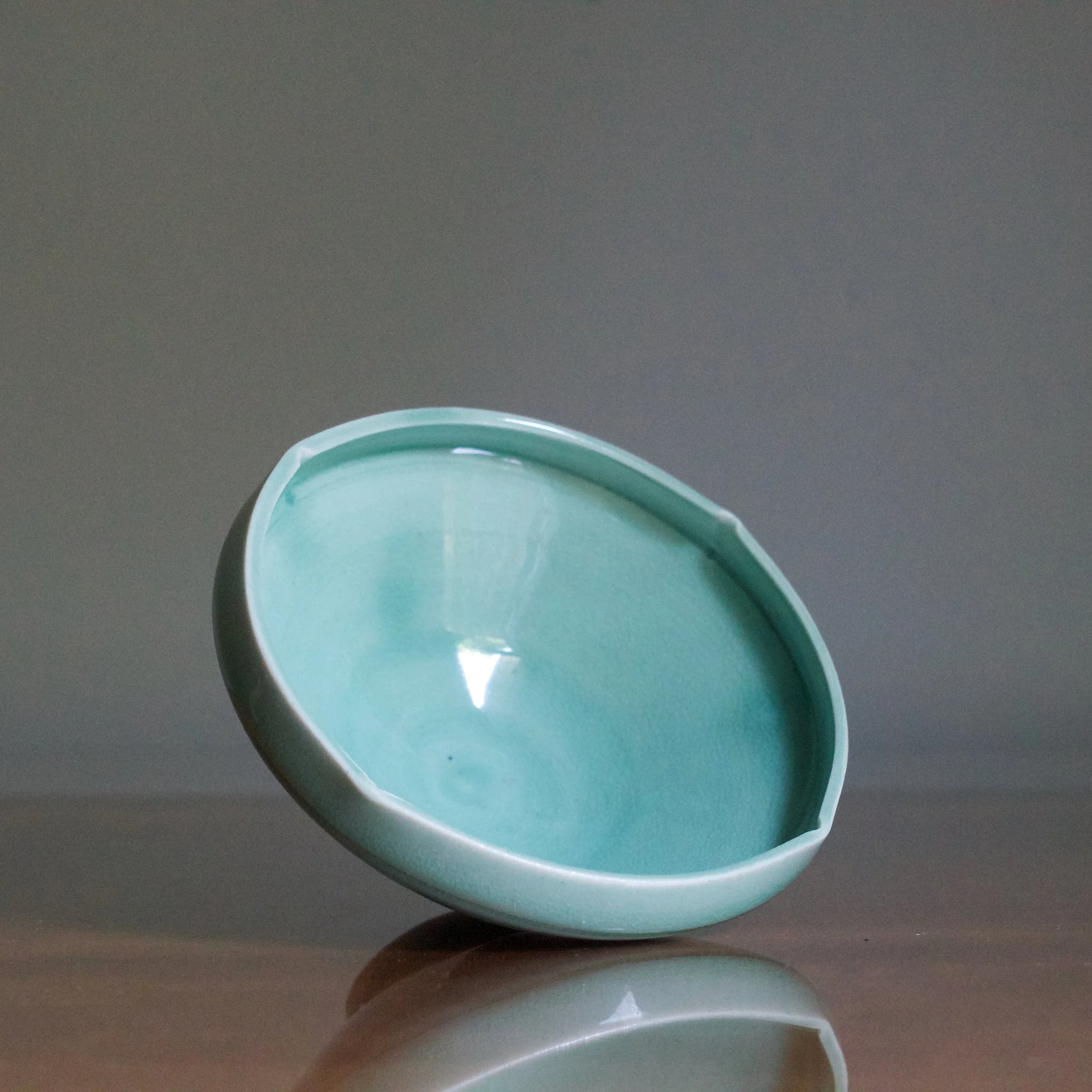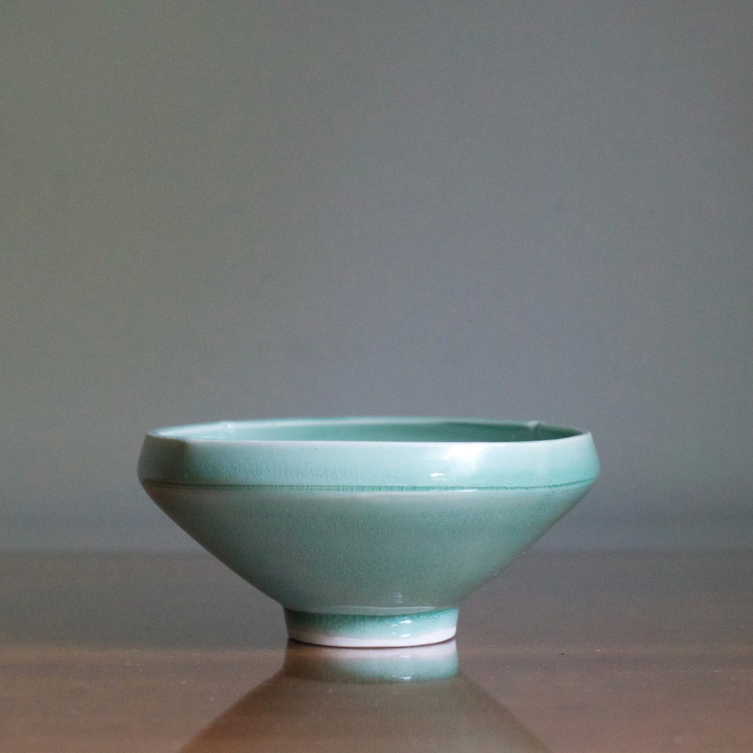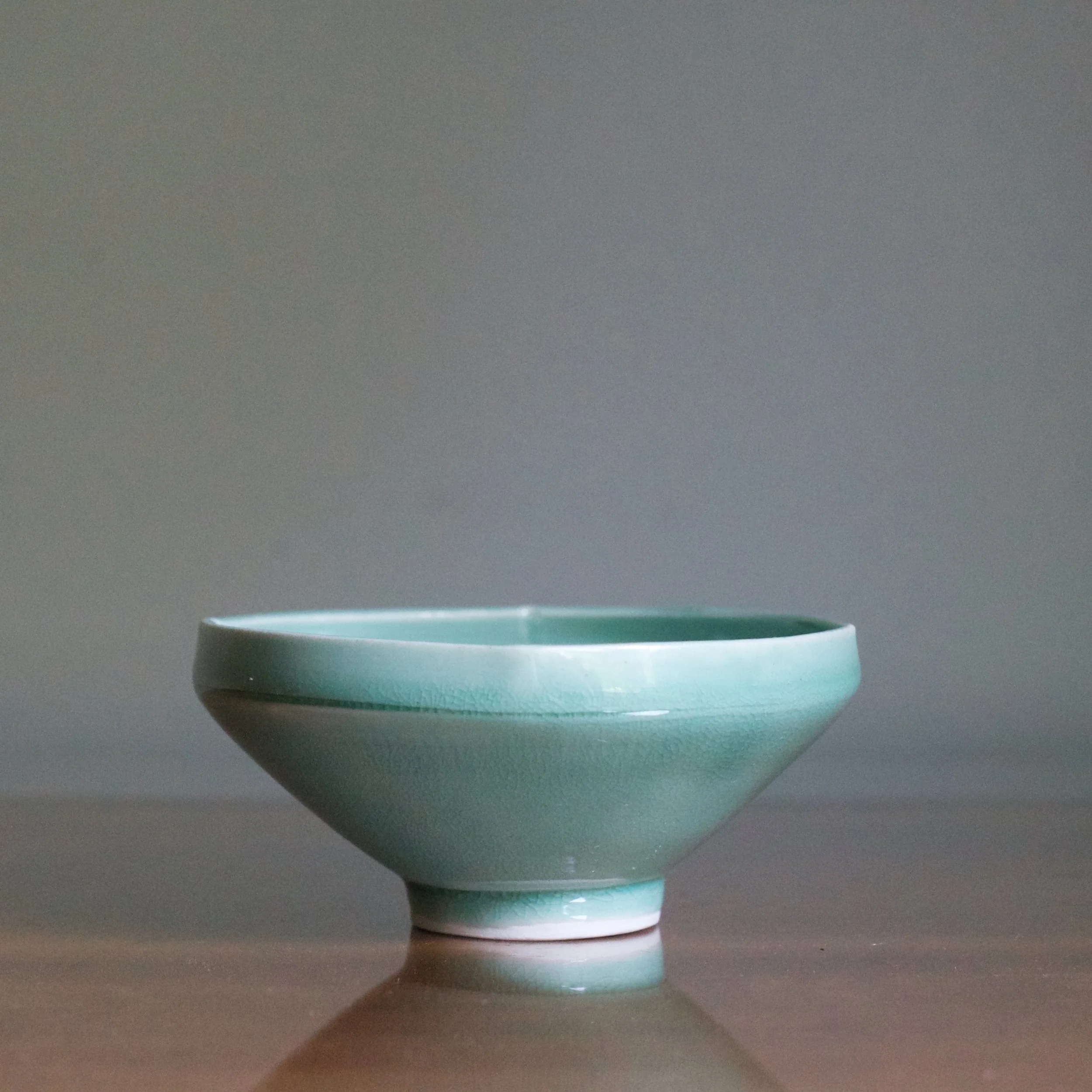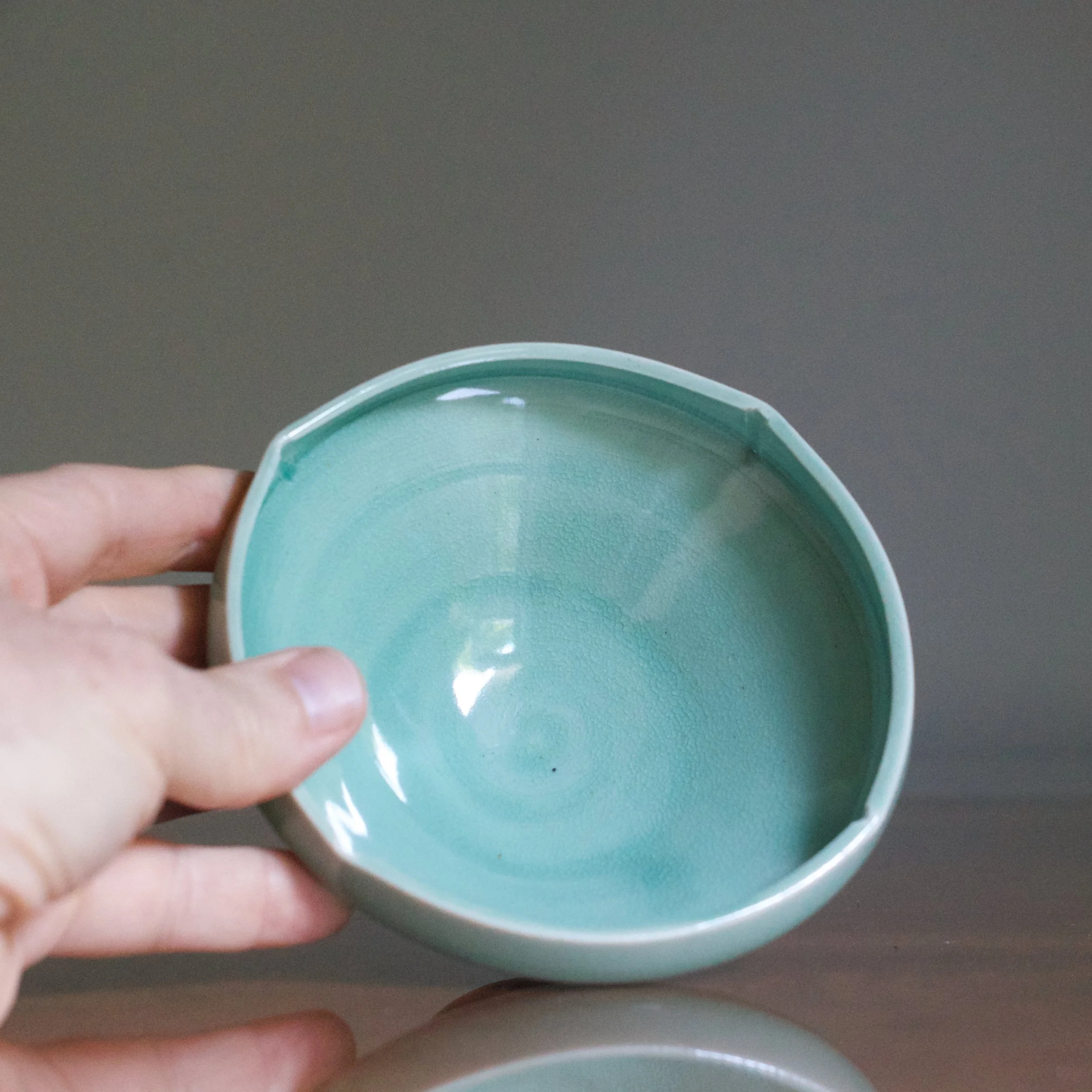 This delicately made bowl is a fine example of Hiro Urakami’s later work with porcelain glazed in soft colours. He threw the bowl with a high foot and slight taper starting at the shoulder. He squared the rim with four “corners” which adds not only visual interest, but also areas for the celadon to break, as well as perhaps spots from which to sip tea. The show “Written in Clay: from the John David Lawrence Collection” at the Vancouver Art Gallery features a stack of Urakami porcelain bowls in a variety of delicate glazes.