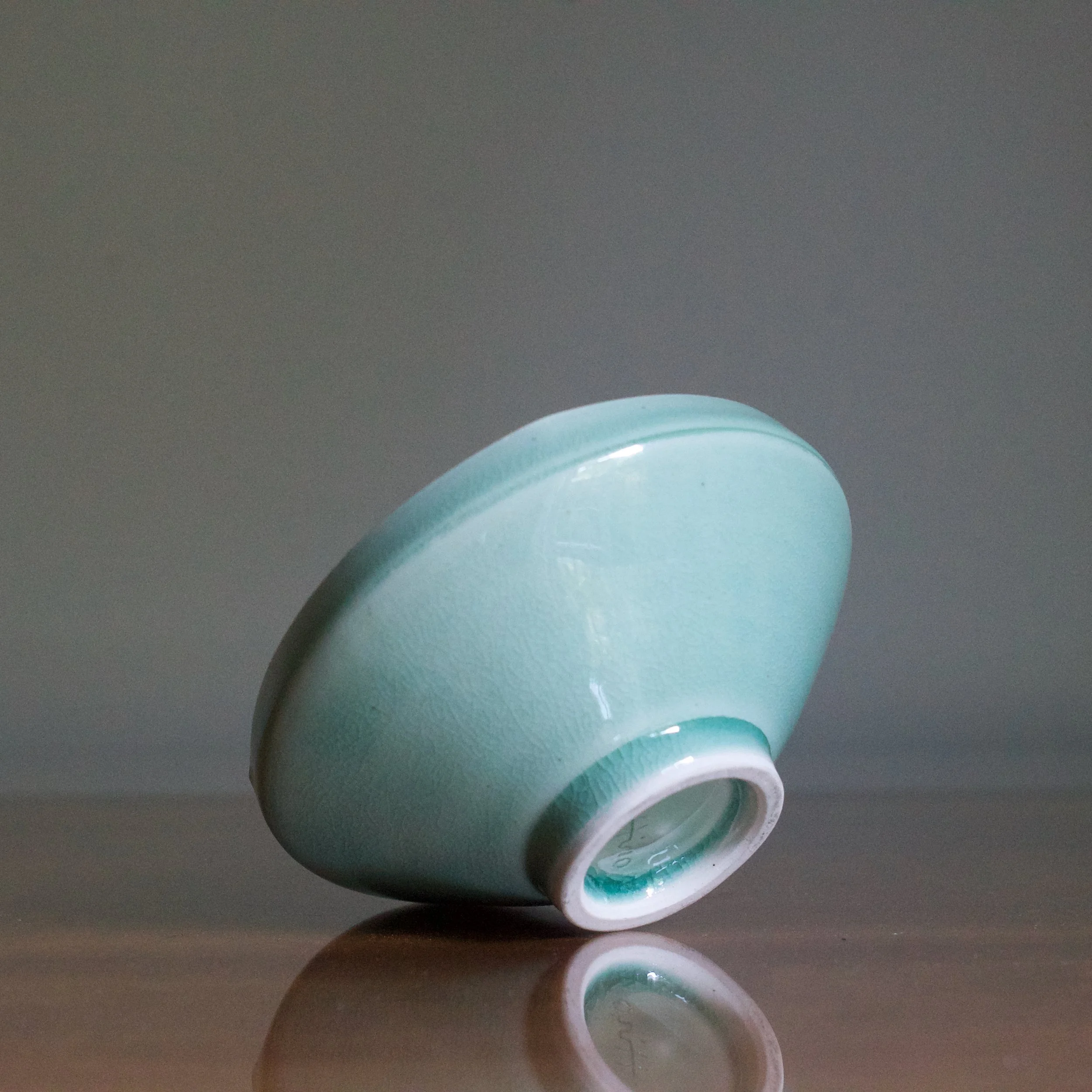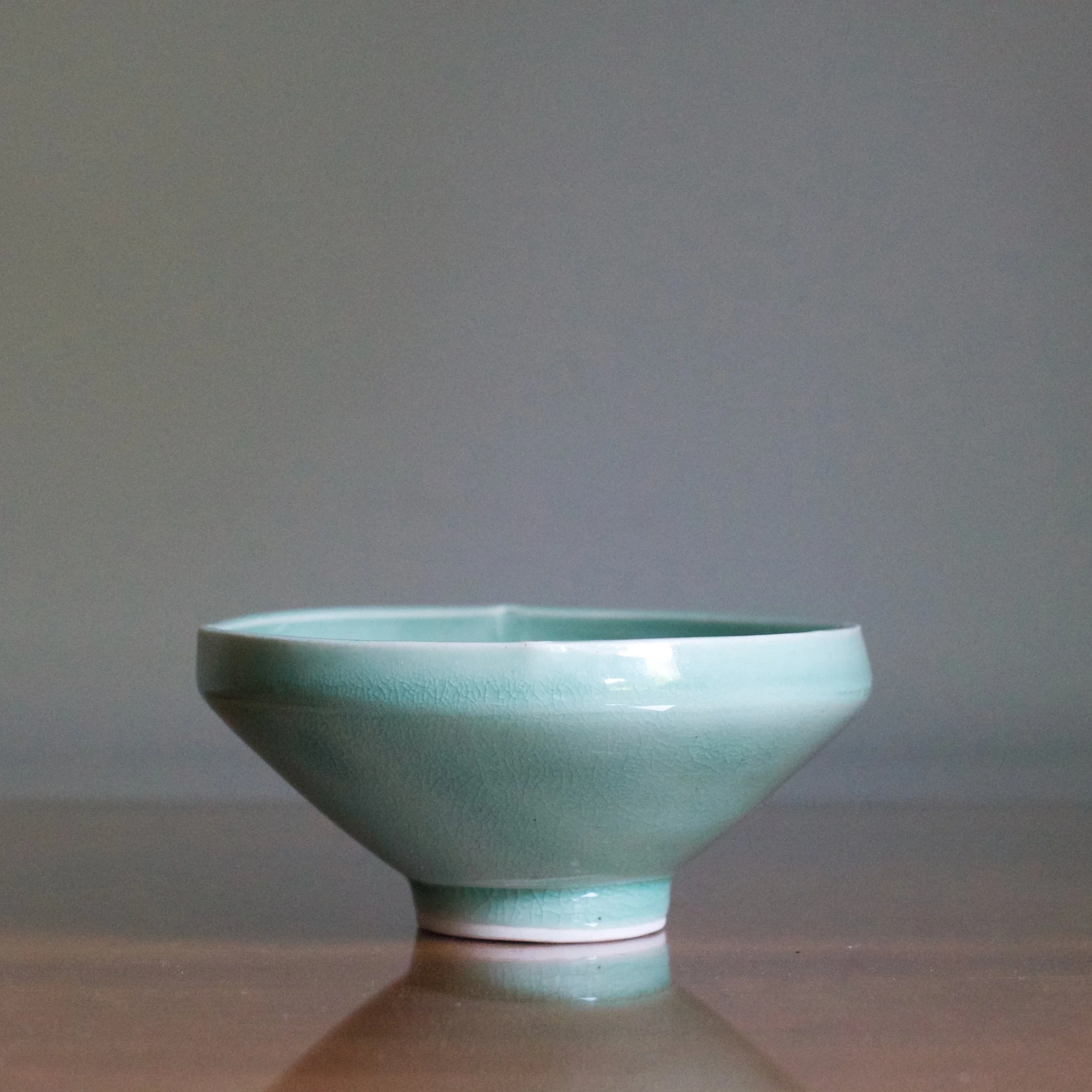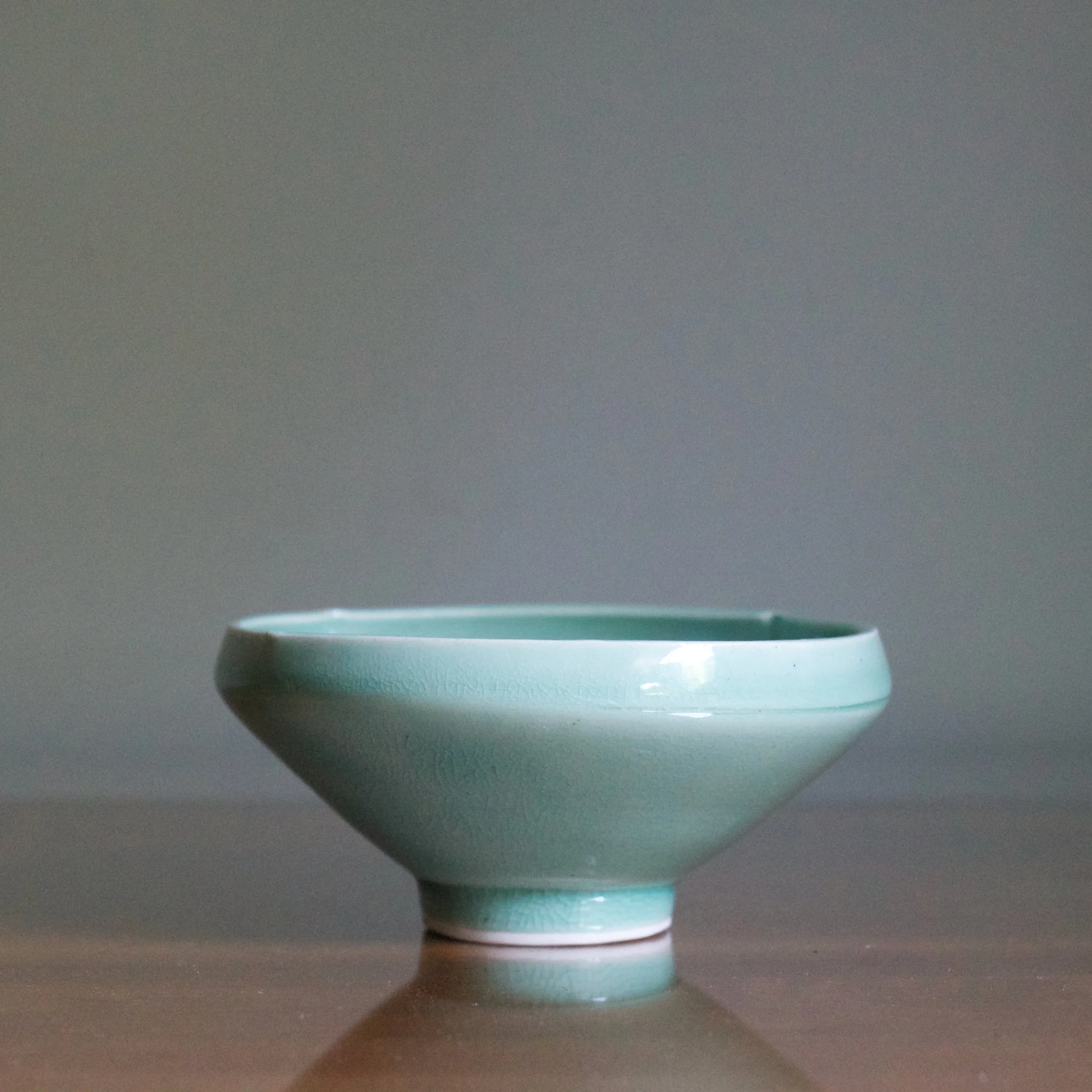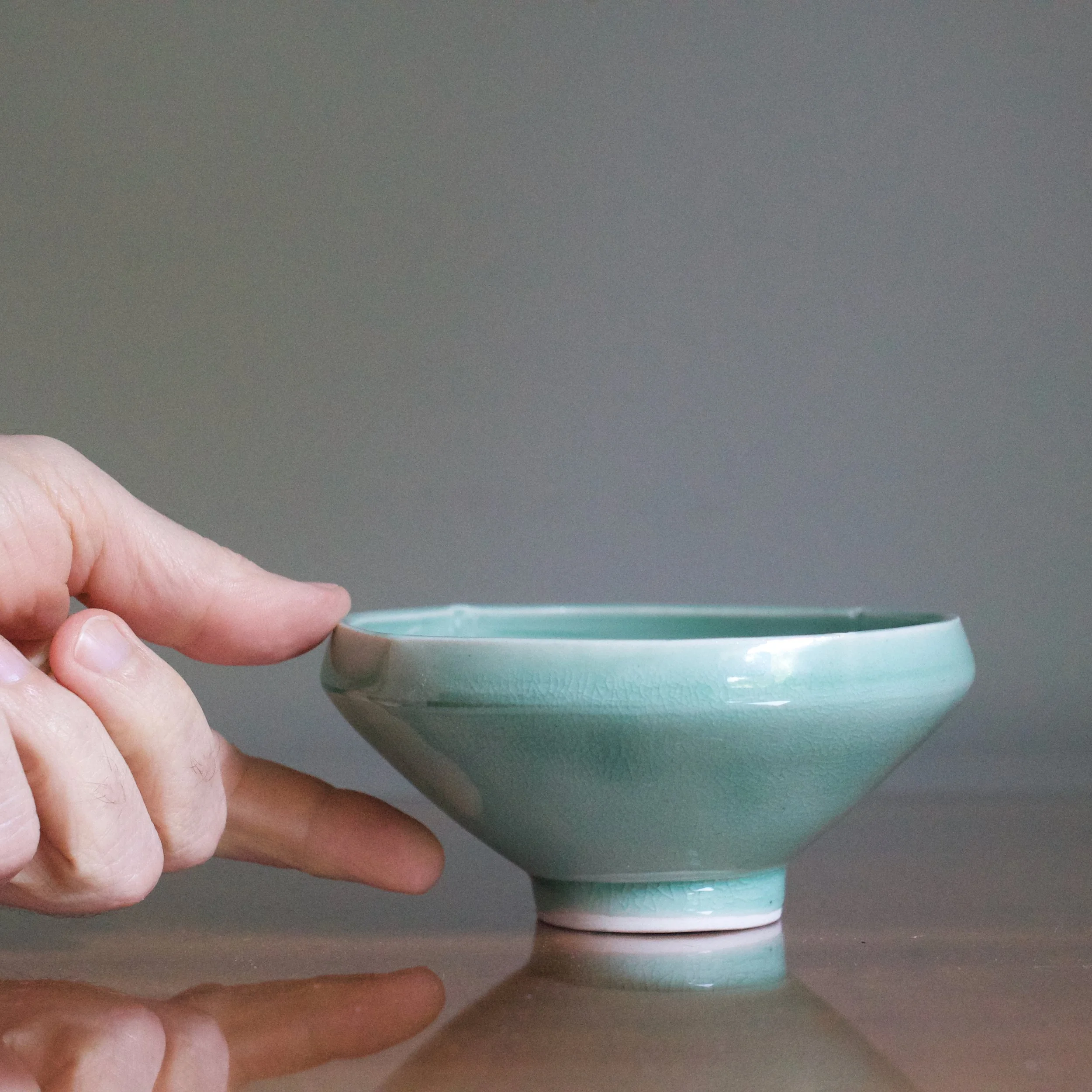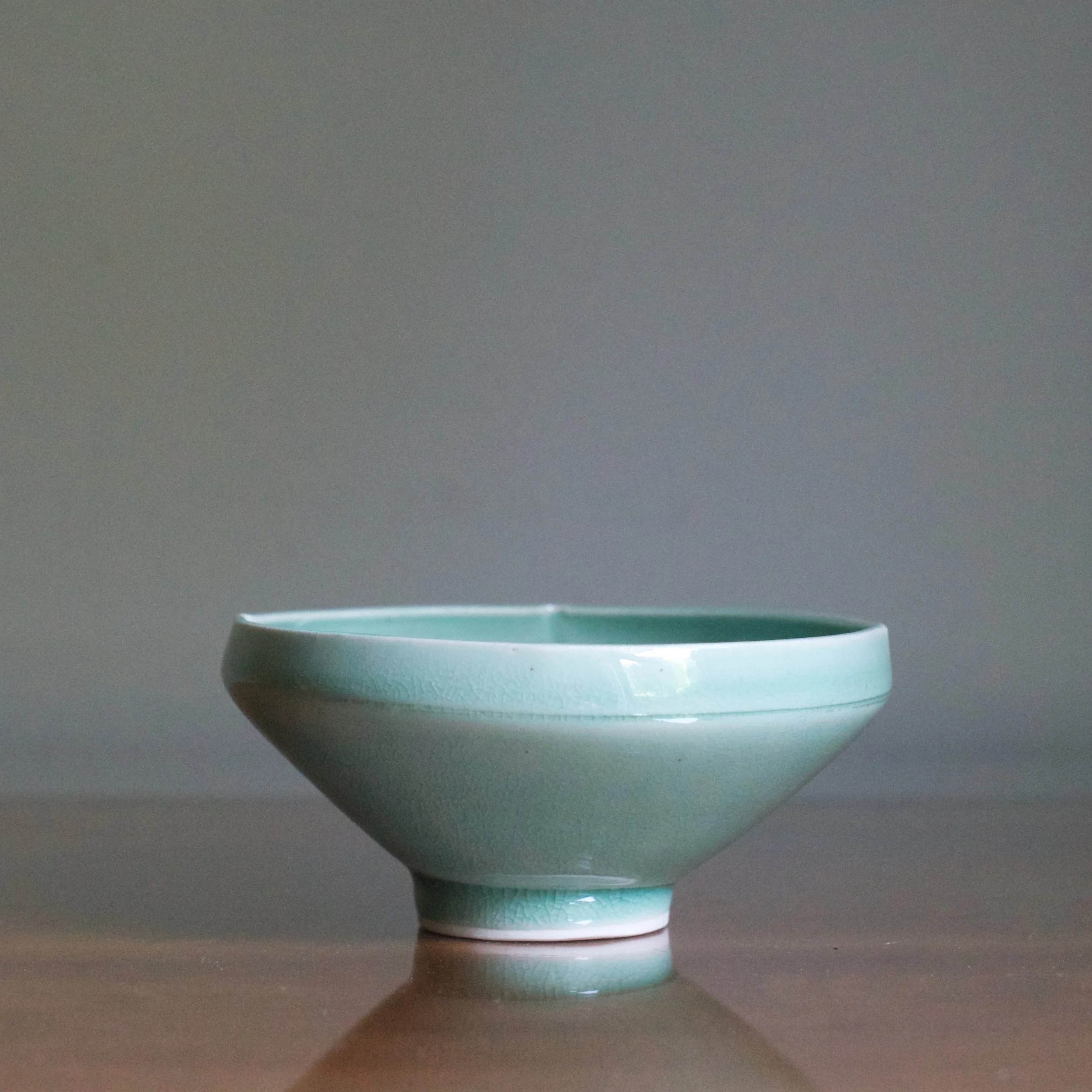 This delicately made bowl is a fine example of Hiro Urakami’s later work with porcelain glazed in soft colours. He threw the bowl with a high foot and slight taper starting at the shoulder. He squared the rim with four “corners” which adds not only visual interest, but also areas for the celadon to break, as well as perhaps spots from which to sip tea. The show “Written in Clay: from the John David Lawrence Collection” at the Vancouver Art Gallery features a stack of Urakami porcelain bowls in a variety of delicate glazes.