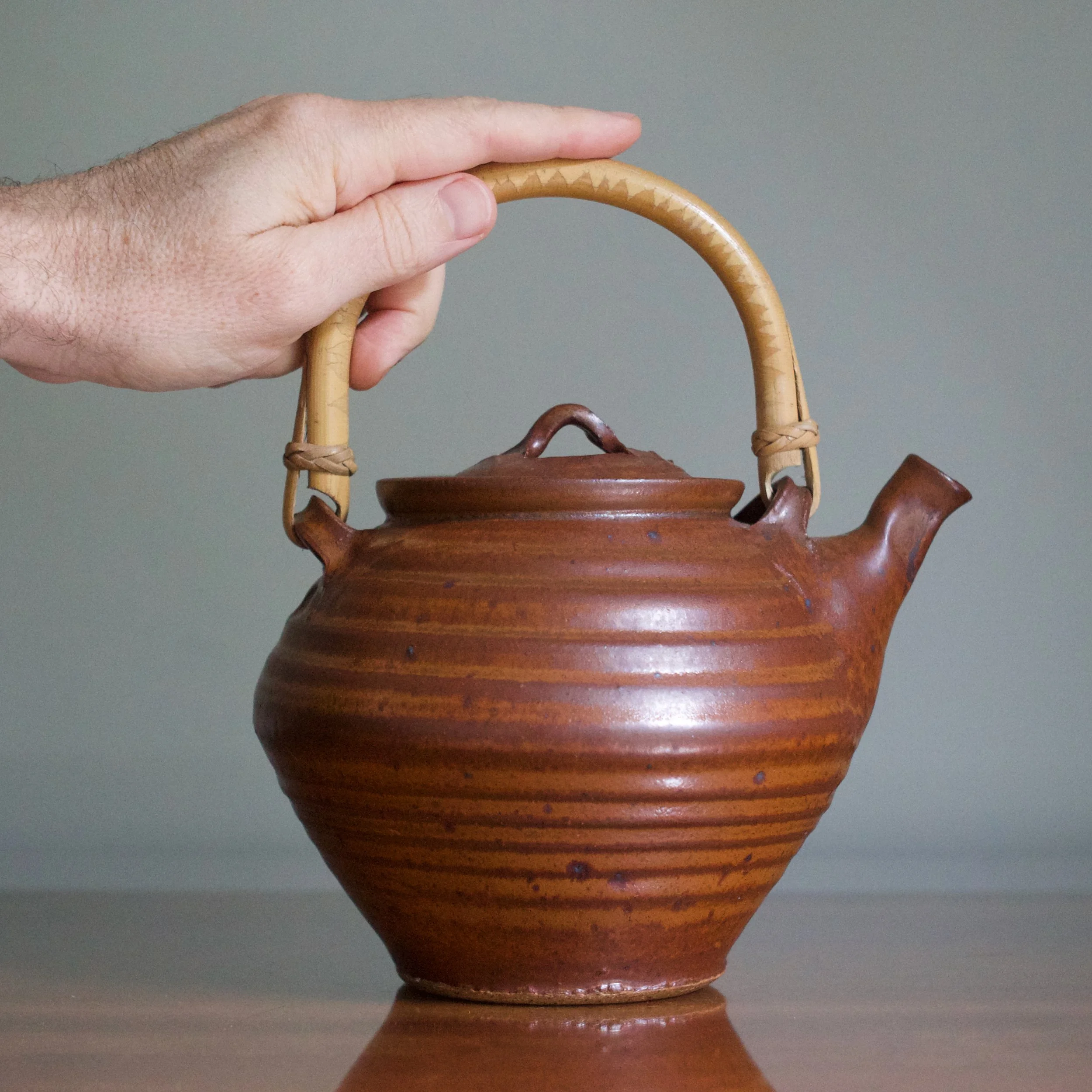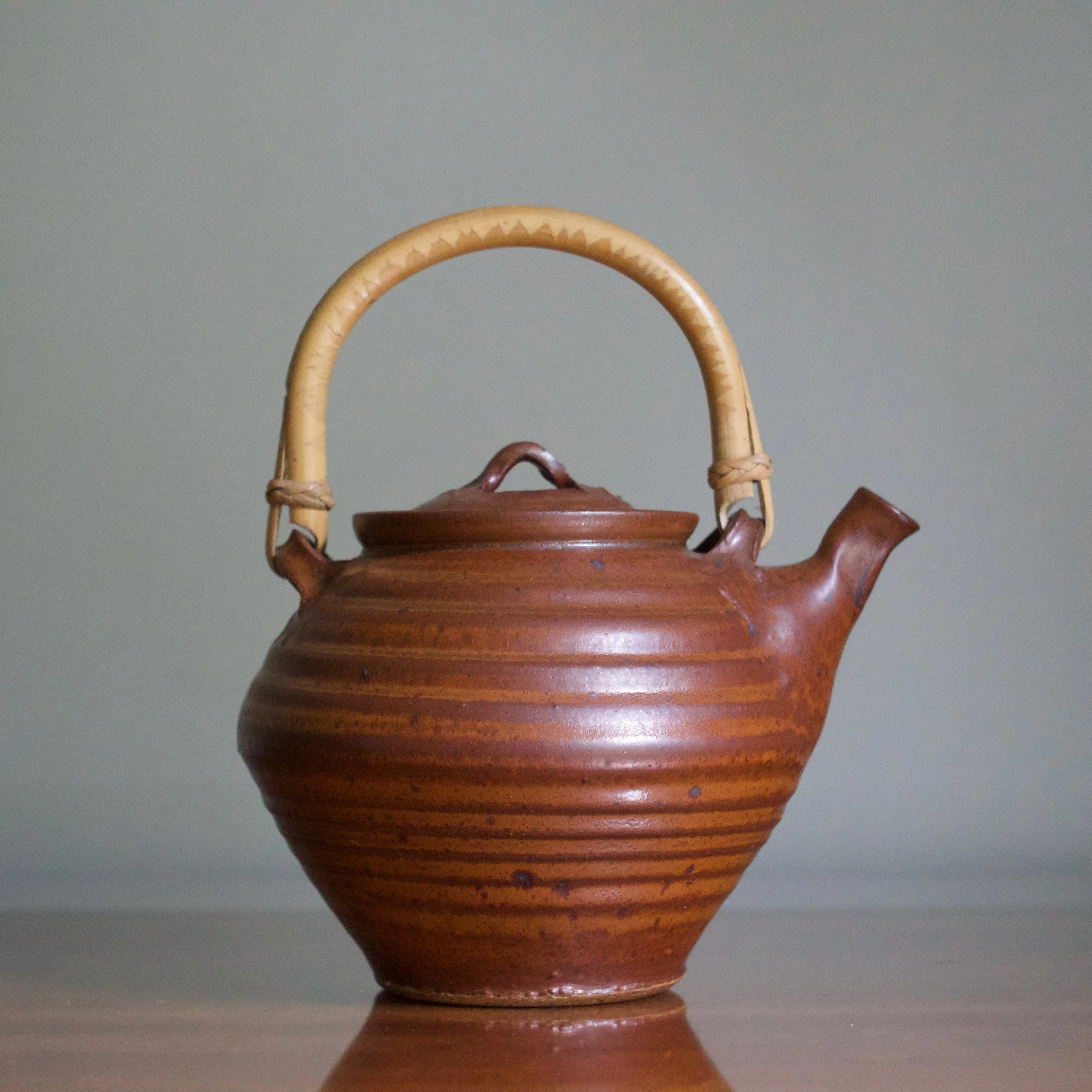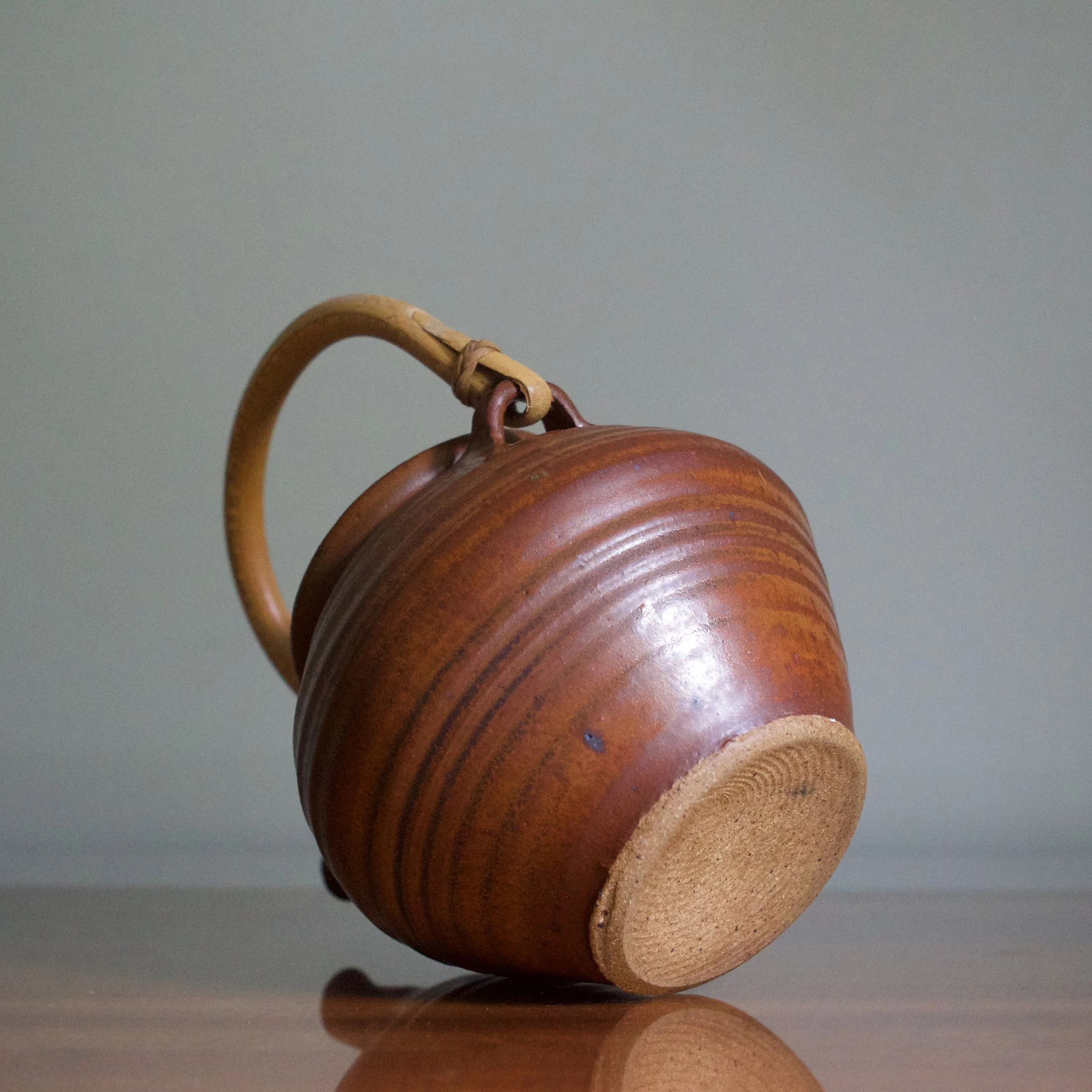 The teapot has a couple of very small glaze chips along a hairline crack, both of which have been restored by the Kintsugi artist Naoko Fukumaru. Naoko has stabilized the crack and added a couple of touches of Kintsugi to the chips, which blend beautifully into the warm tenmoku glaze. These restorations specifically allow for the teapot to still enjoy use. The original cane handle shows some wear along the top, but is in otherwise very fine shape considering this teapot is 50 years old. The sugar bowl is in perfect condition.