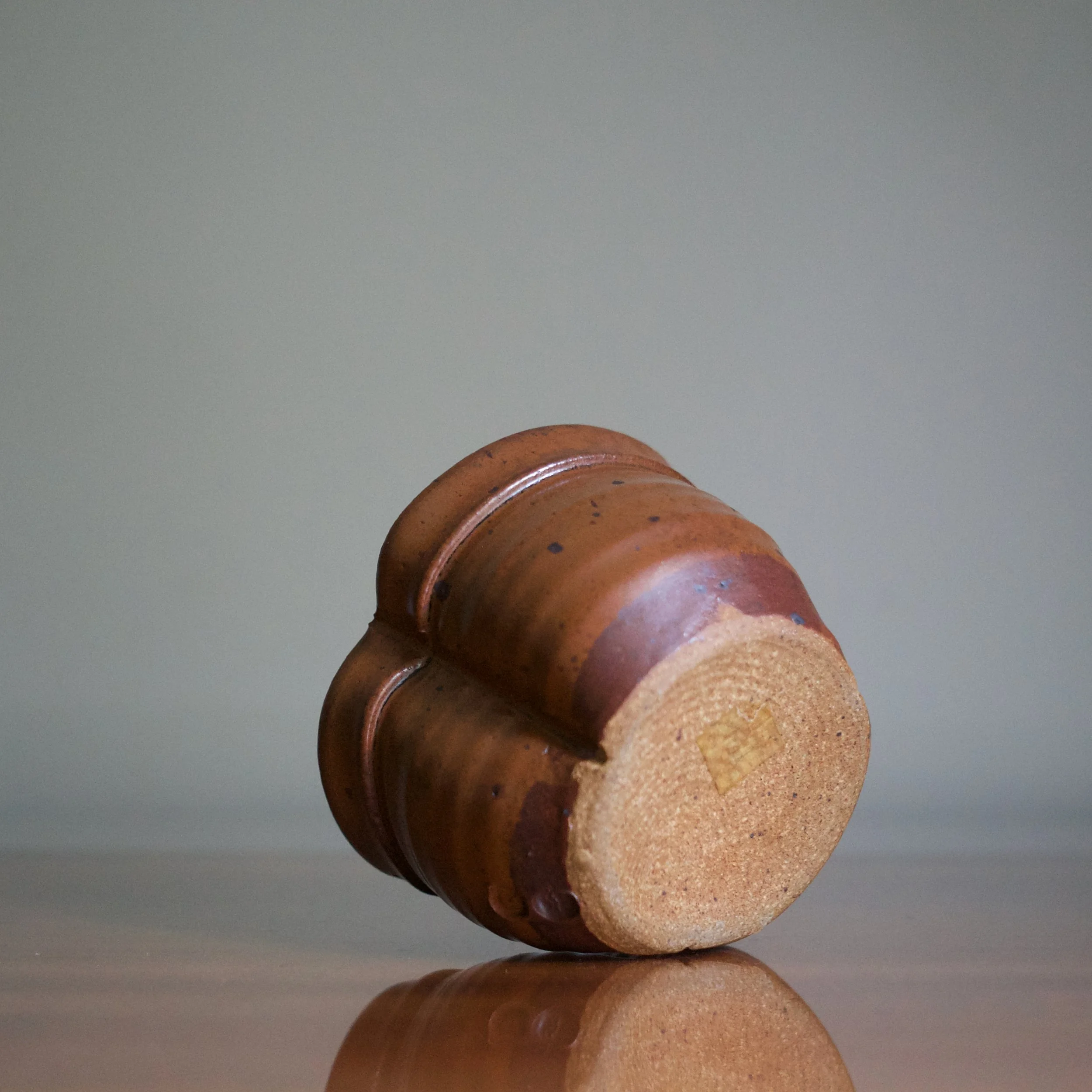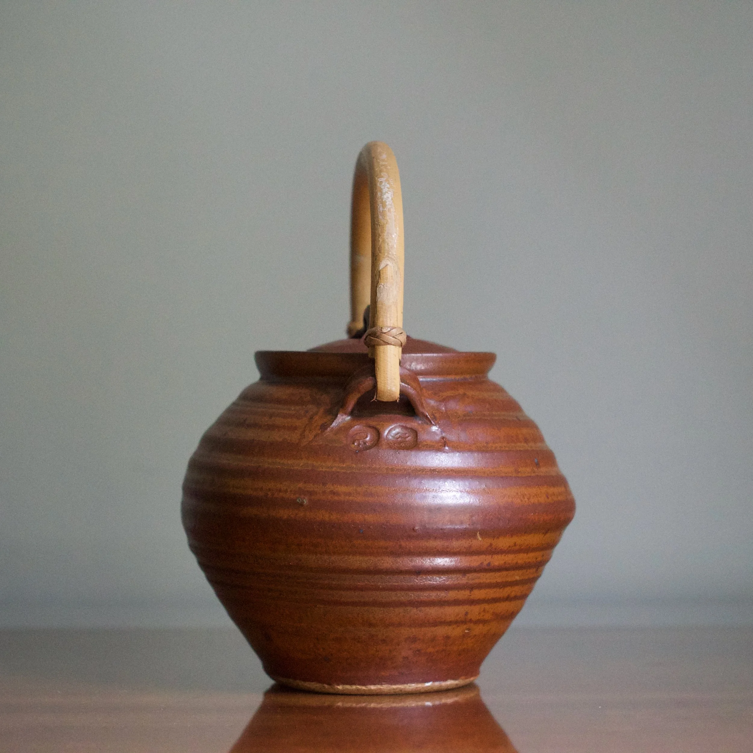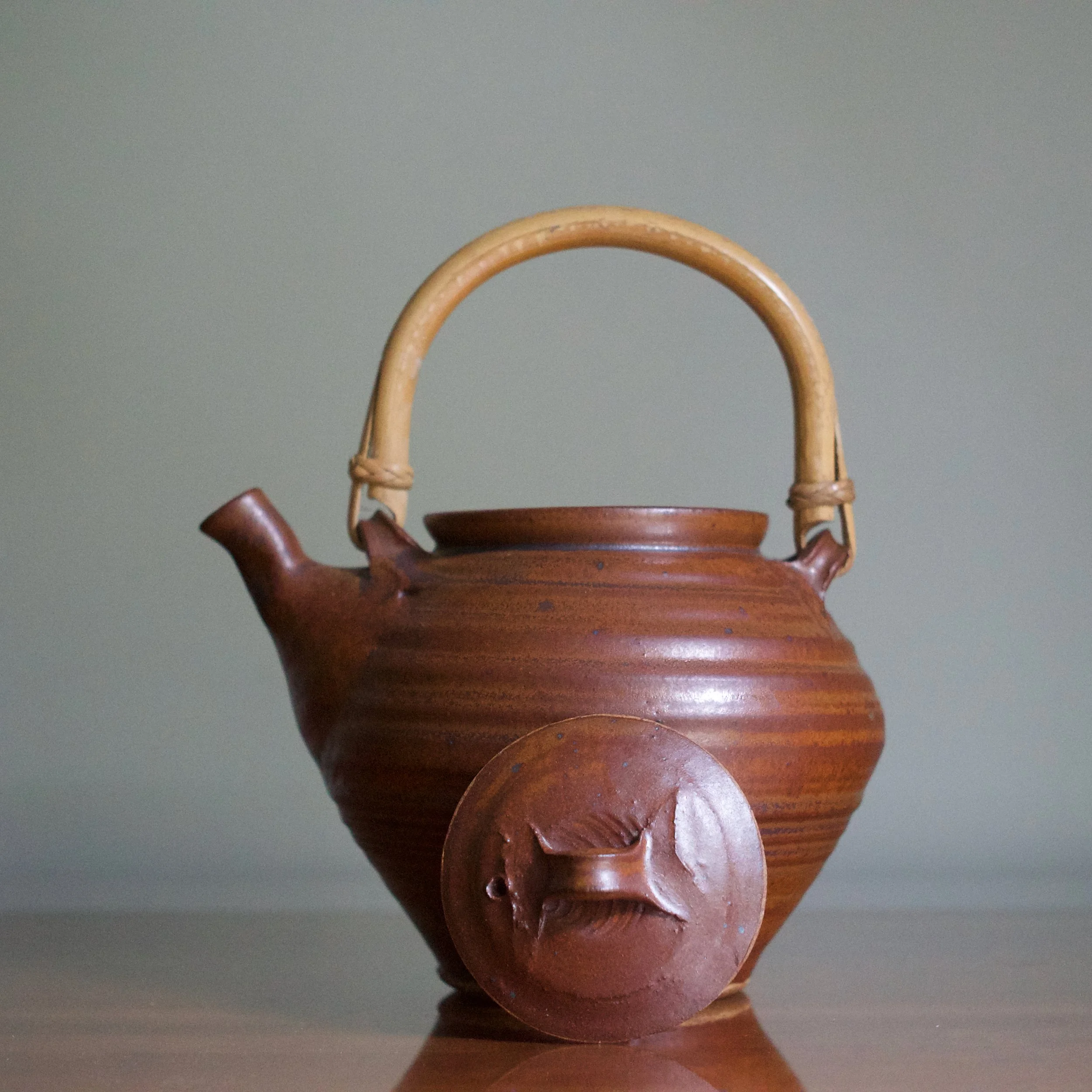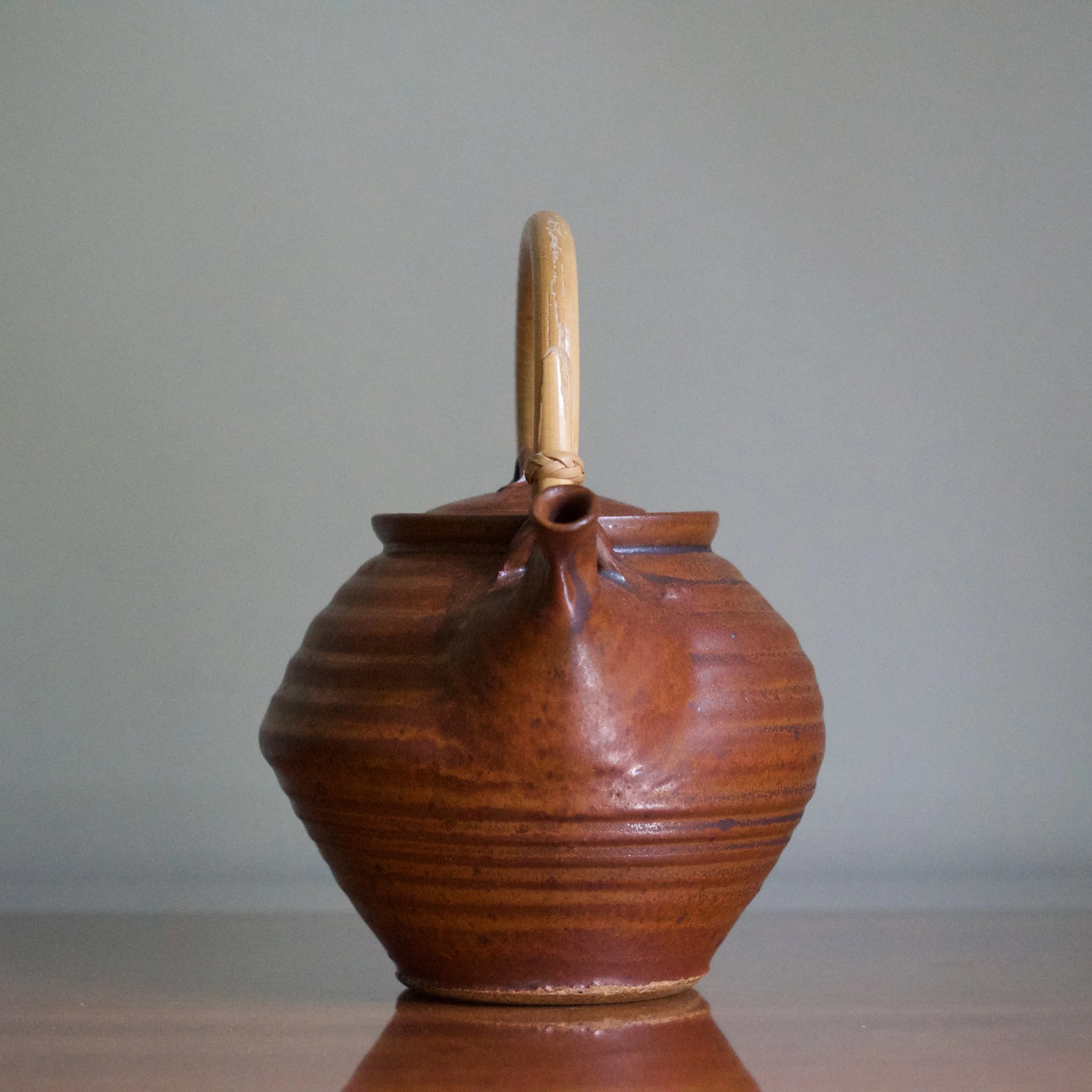 The teapot has a couple of very small glaze chips along a hairline crack, both of which have been restored by the Kintsugi artist Naoko Fukumaru. Naoko has stabilized the crack and added a couple of touches of Kintsugi to the chips, which blend beautifully into the warm tenmoku glaze. These restorations specifically allow for the teapot to still enjoy use. The original cane handle shows some wear along the top, but is in otherwise very fine shape considering this teapot is 50 years old. The sugar bowl is in perfect condition.