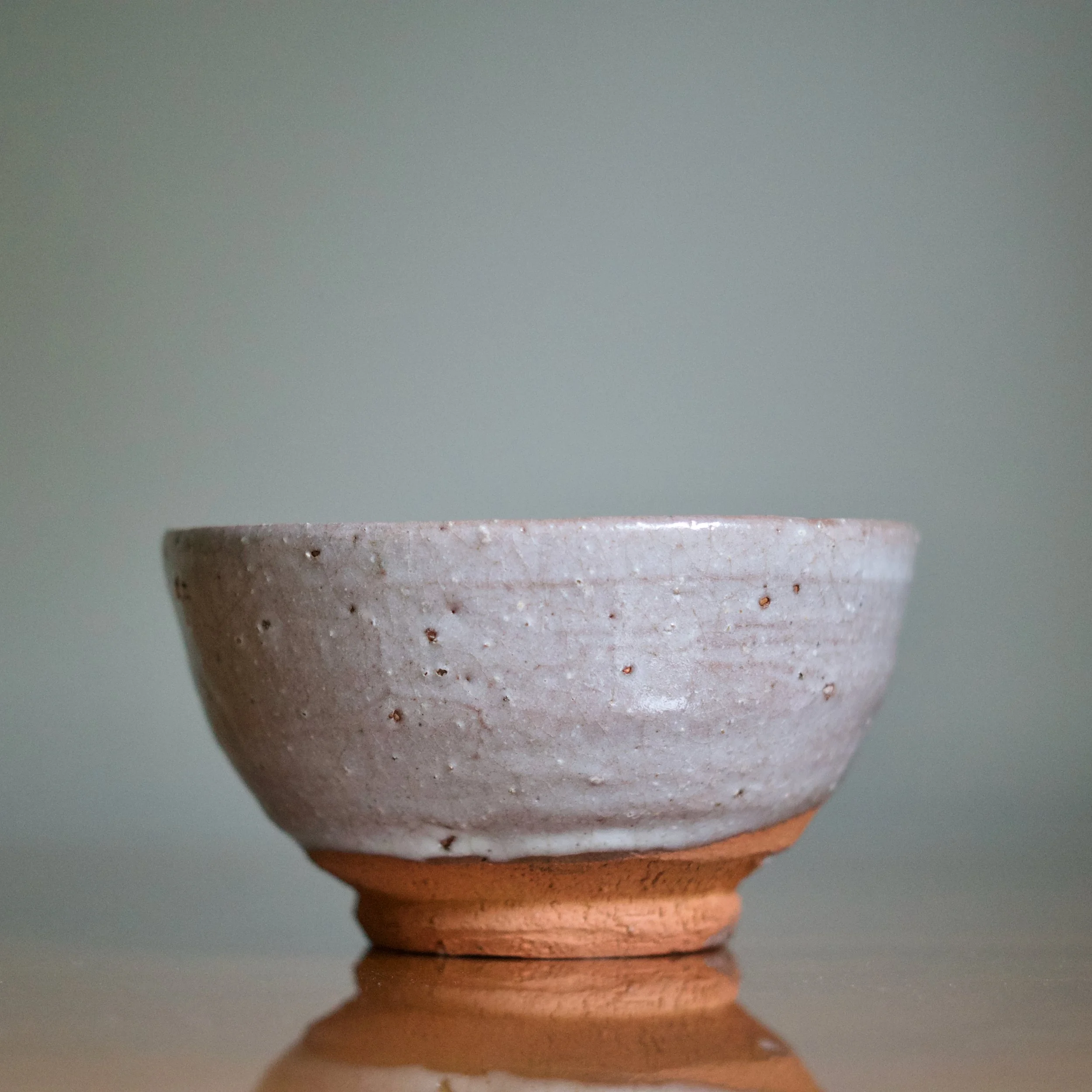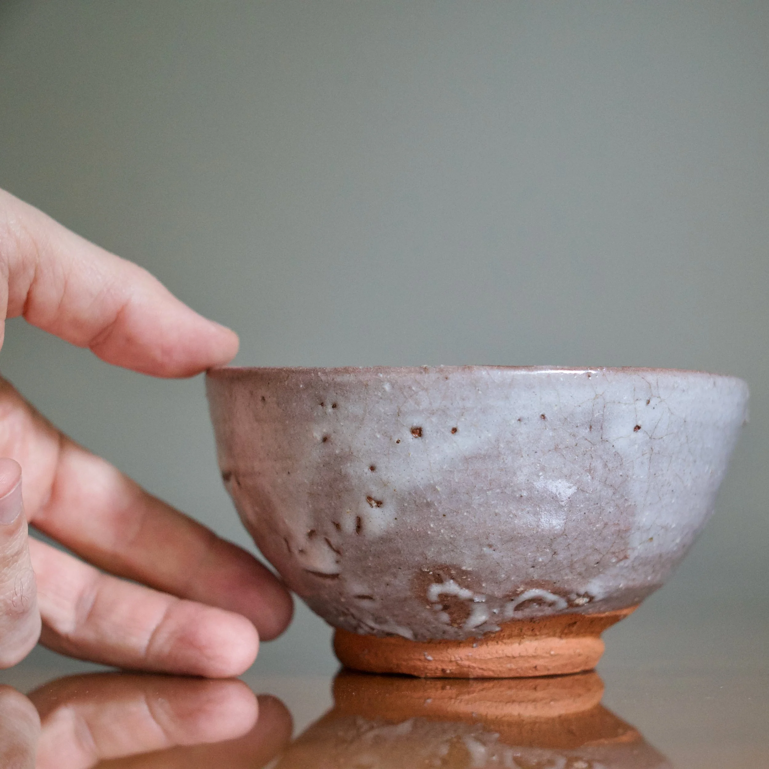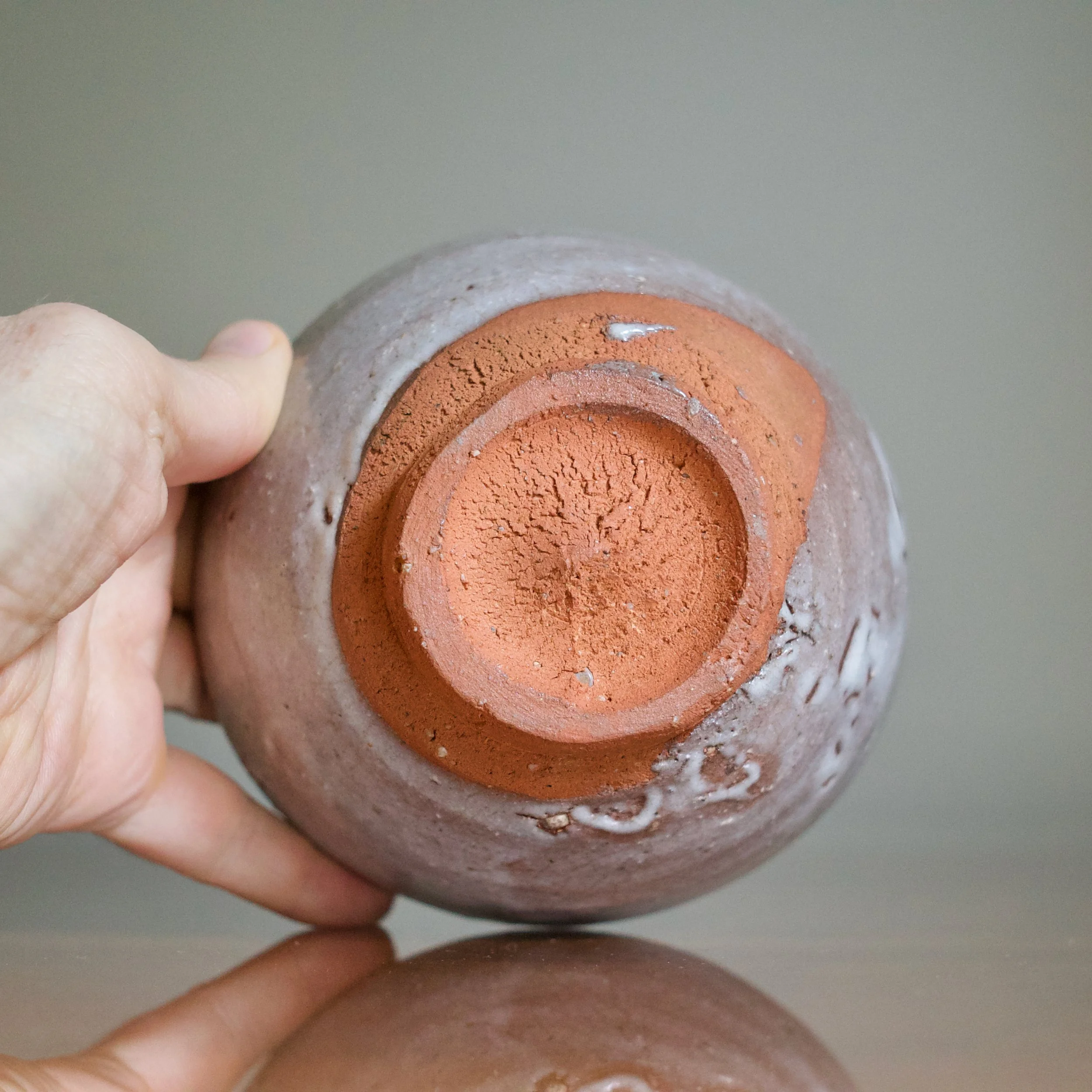 Like most Karatsu wares, with Yui’s tea bowl clay is king: an unglazed foot and generous area above reveal a warm and soft orange-brown clay. Vibrant and naked, it pops against the lavender-grey ash glaze. And the foot features the crepe de chine fabric texture known to Karatsu, achieved by trimming the bottom in the opposite direction it was turned.