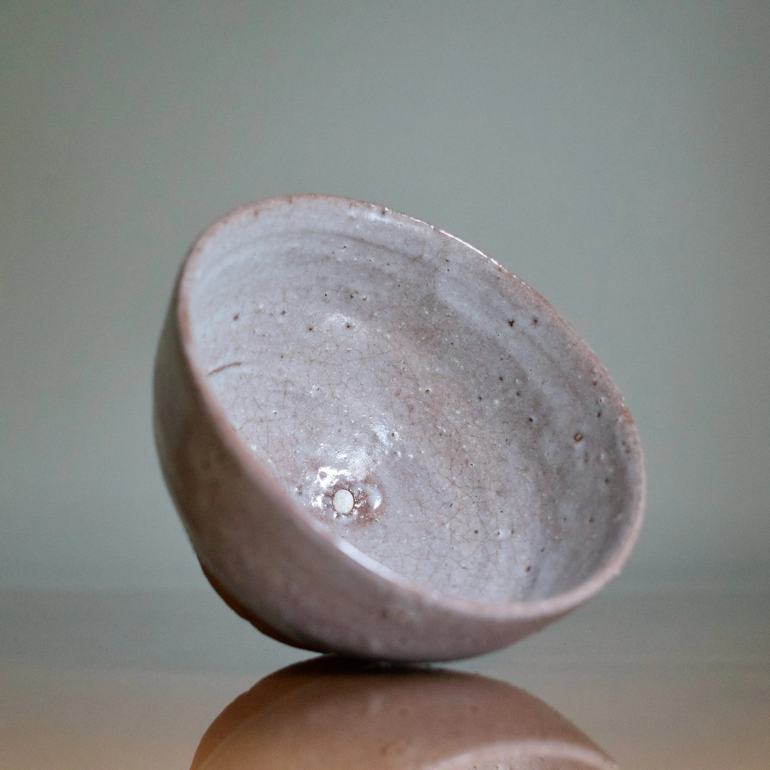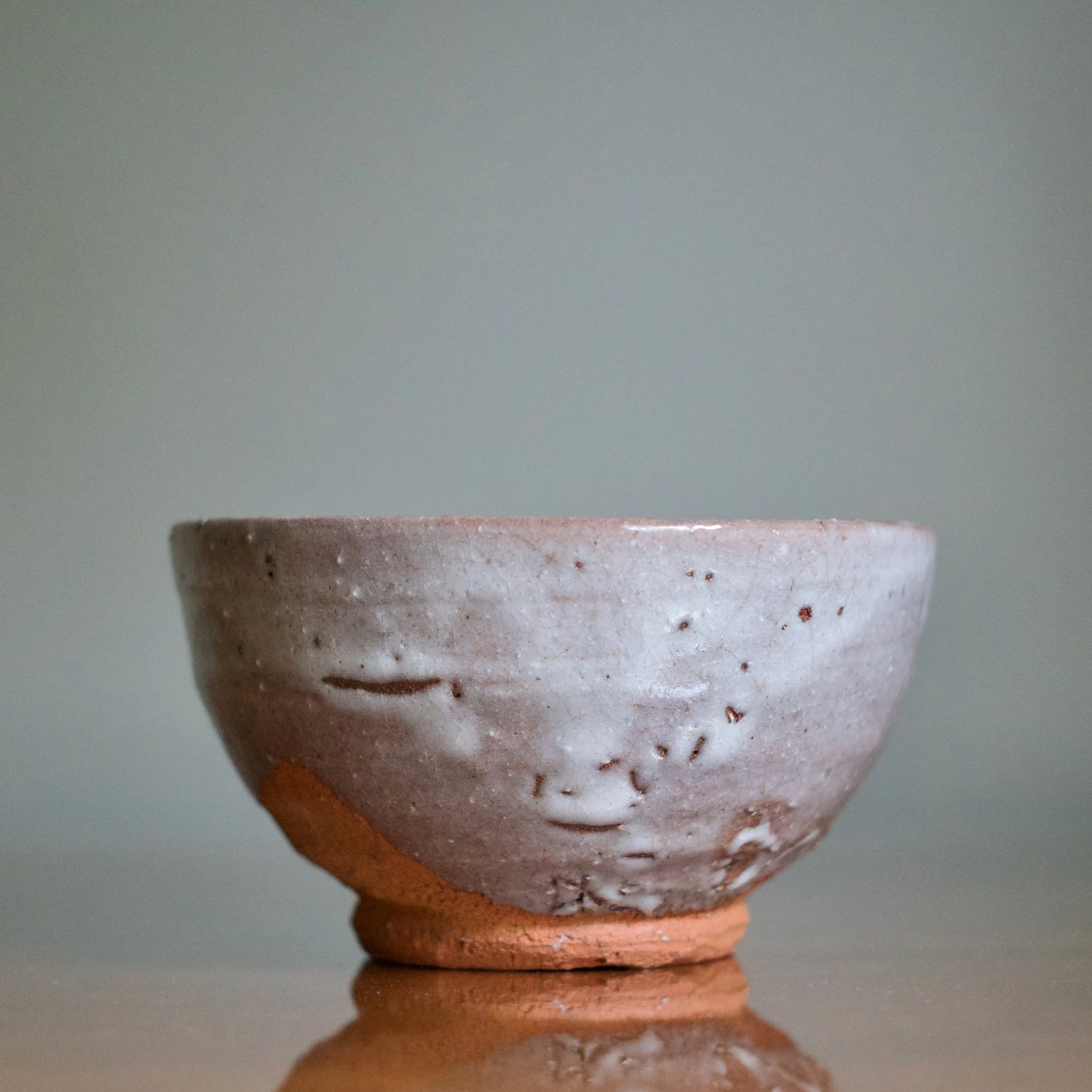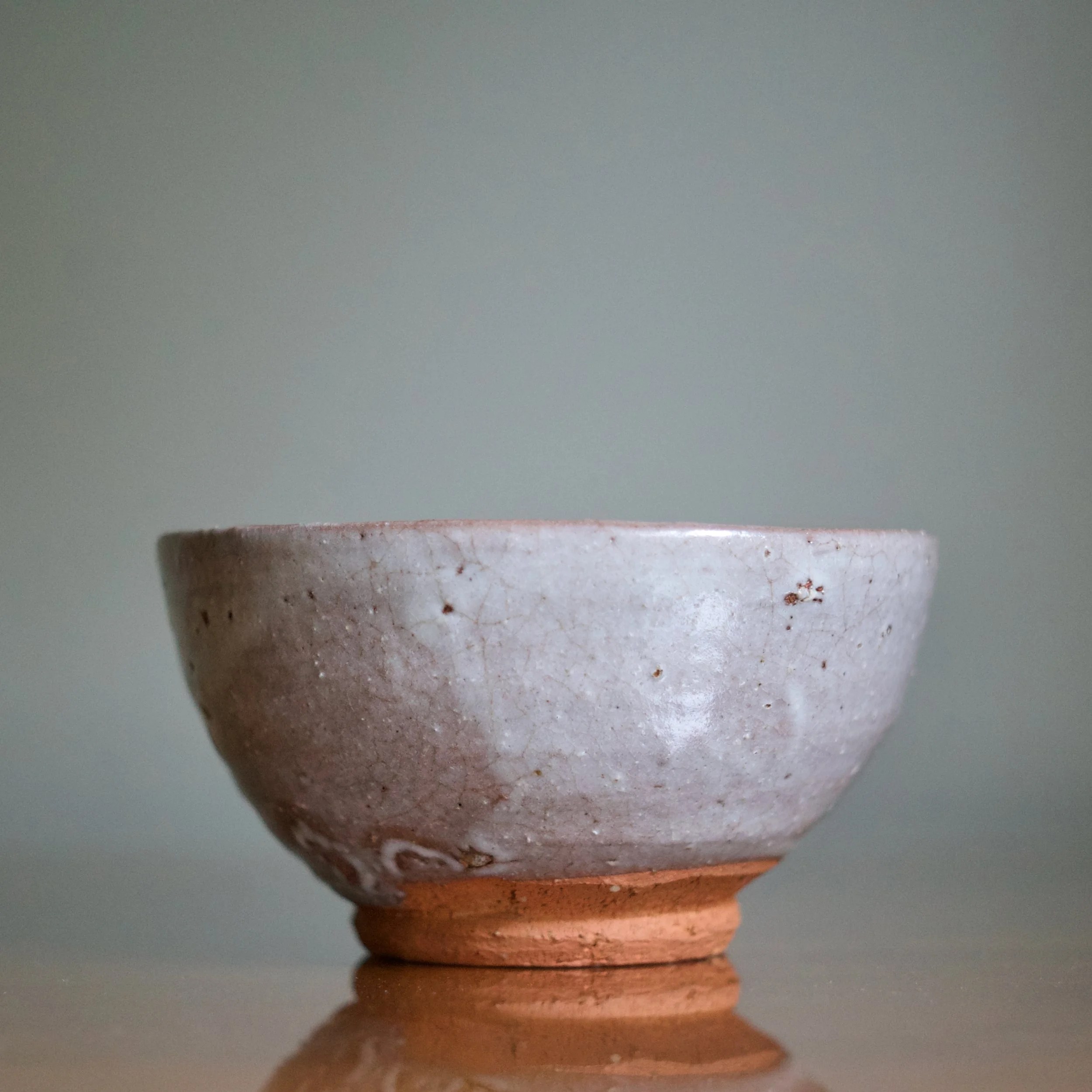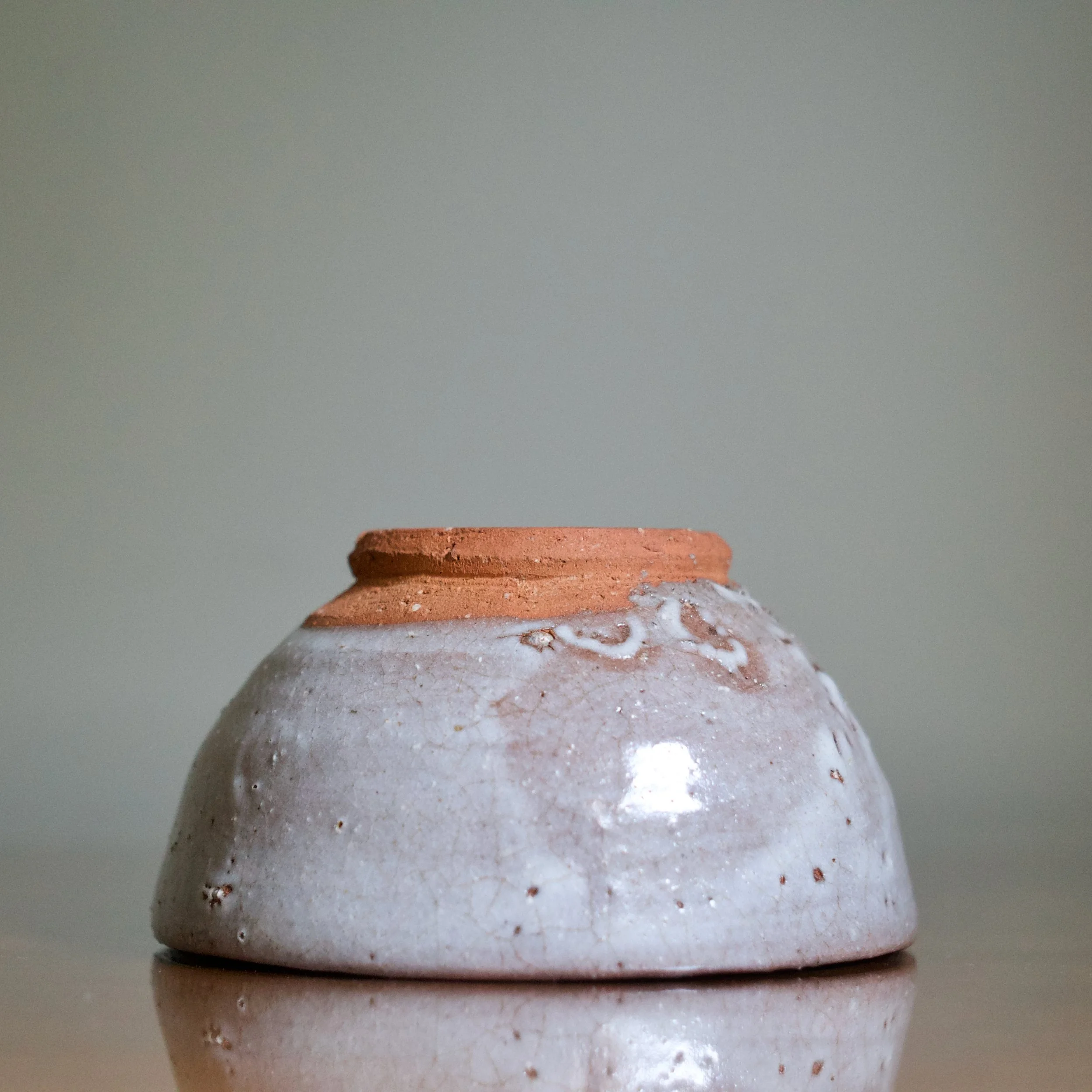Like most Karatsu wares, with Yui’s tea bowl clay is king: an unglazed foot and generous area above reveal a warm and soft orange-brown clay. Vibrant and naked, it pops against the lavender-grey ash glaze. And the foot features the crepe de chine fabric texture known to Karatsu, achieved by trimming the bottom in the opposite direction it was turned.