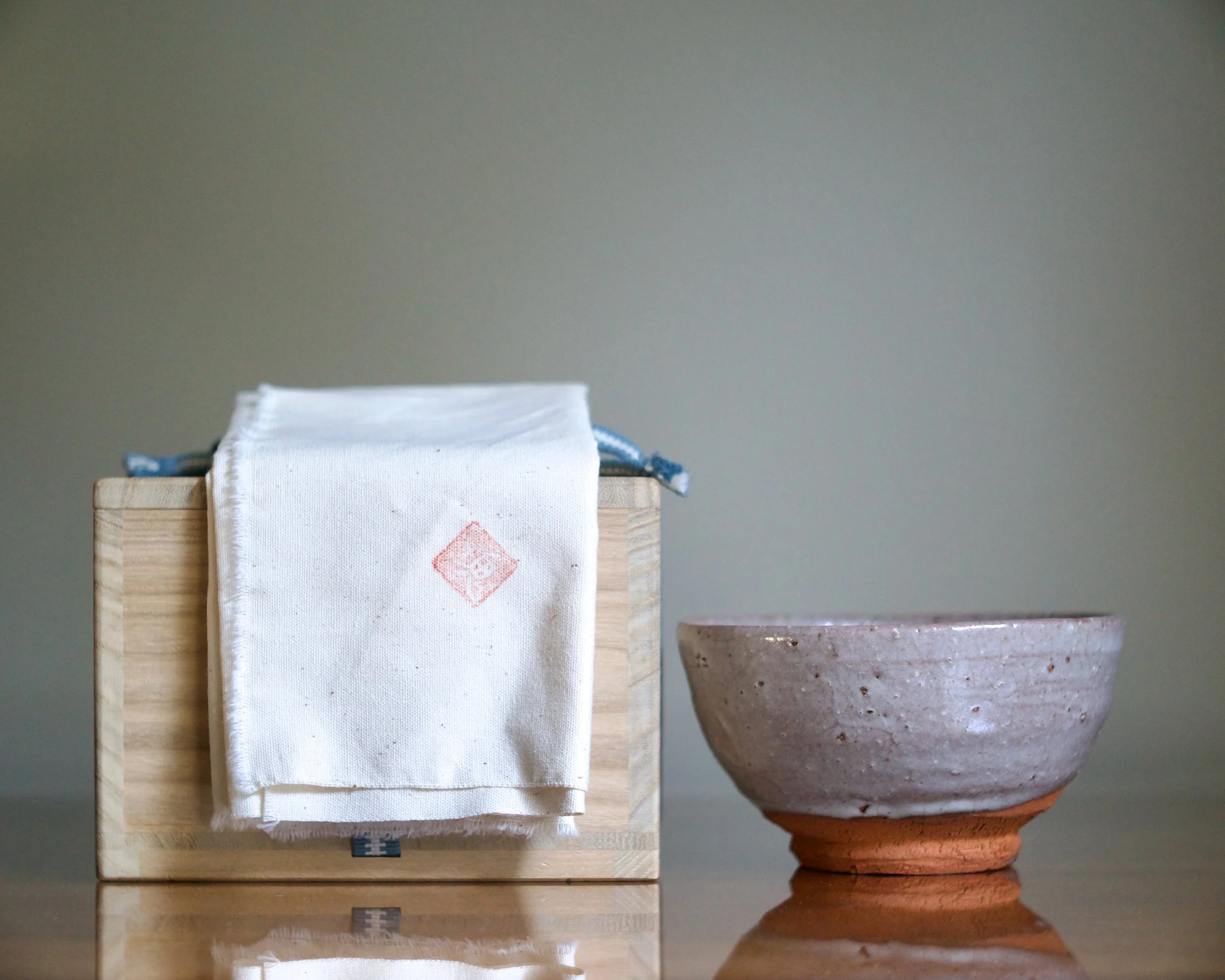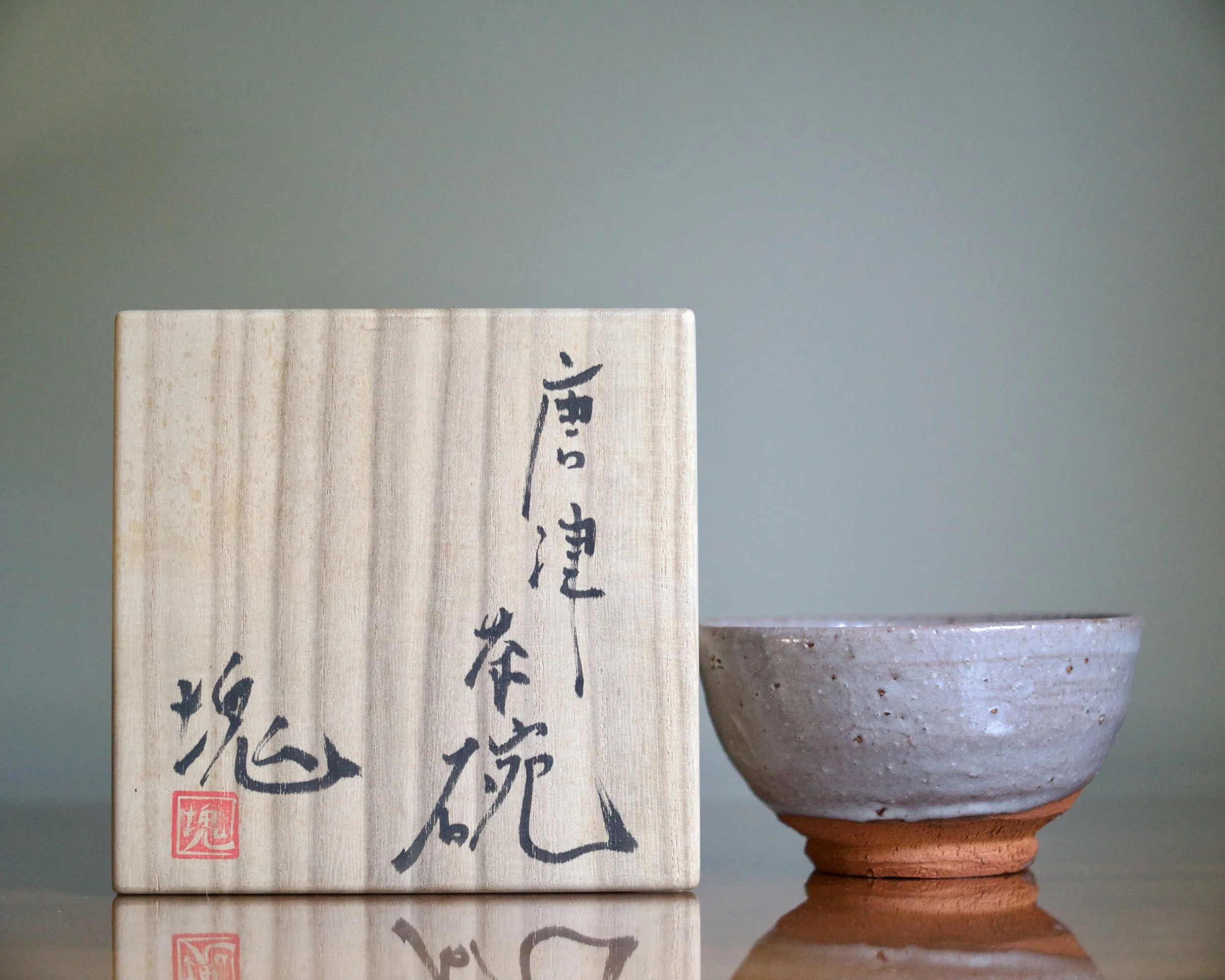 This Karatsu bowl is another example of Yui’s “Korean” ceramics. Its “wan-nari” wooden bowl shape is common to the Kyushu region where Karatsu ware evolved after Korean potters moved there in the 16th century. Karatsu is known for a ruggedness that embodies chadō’s zen aesthetic of imperfection.