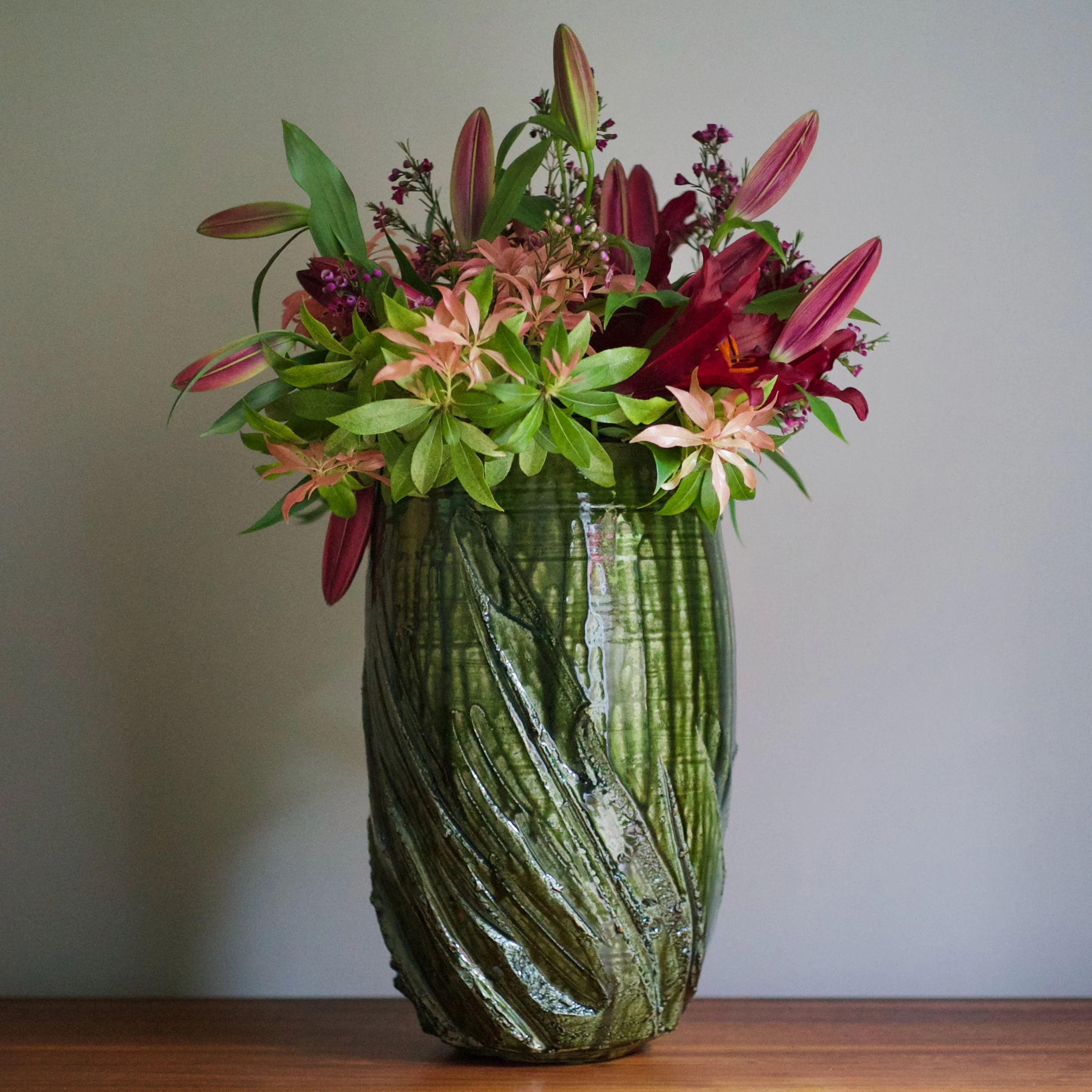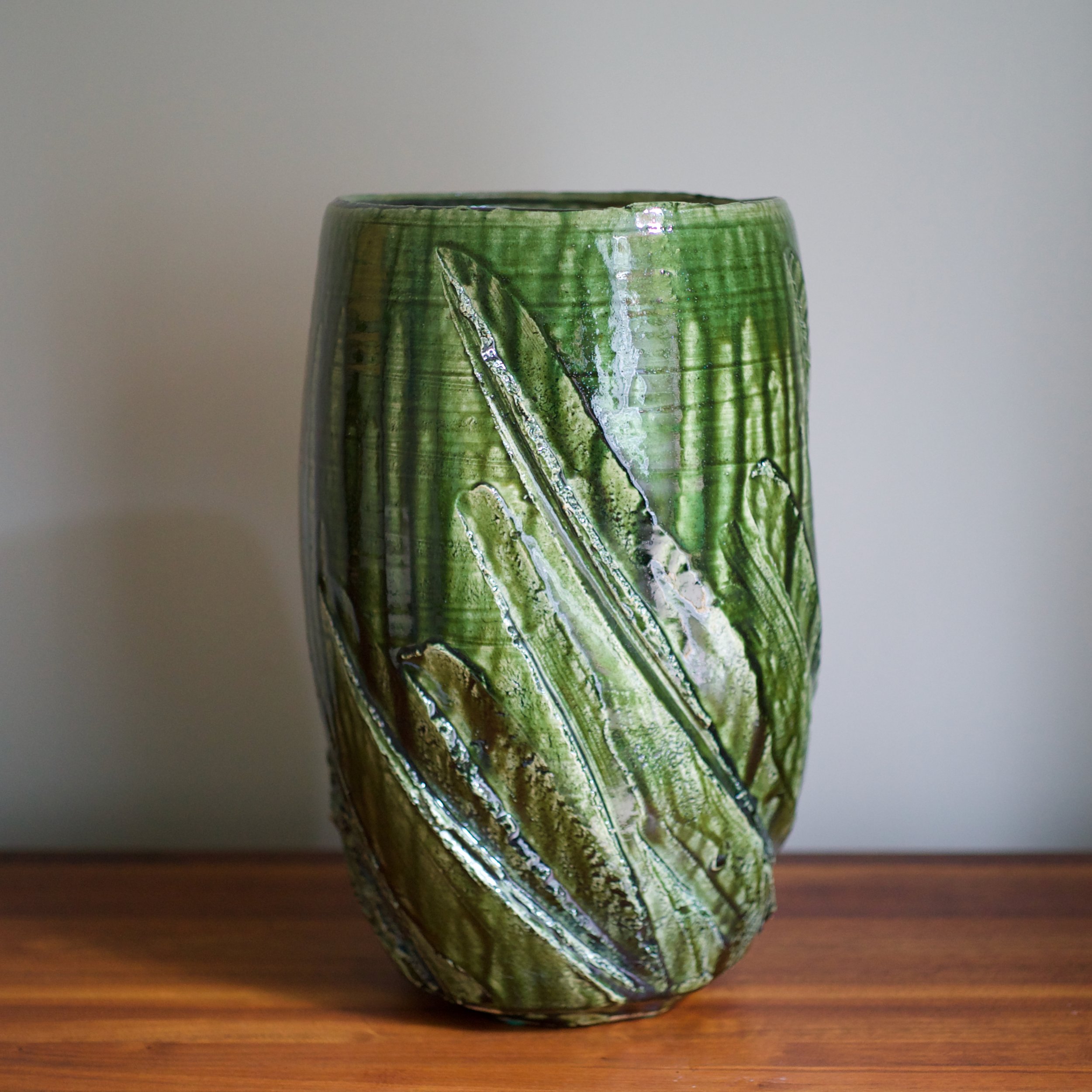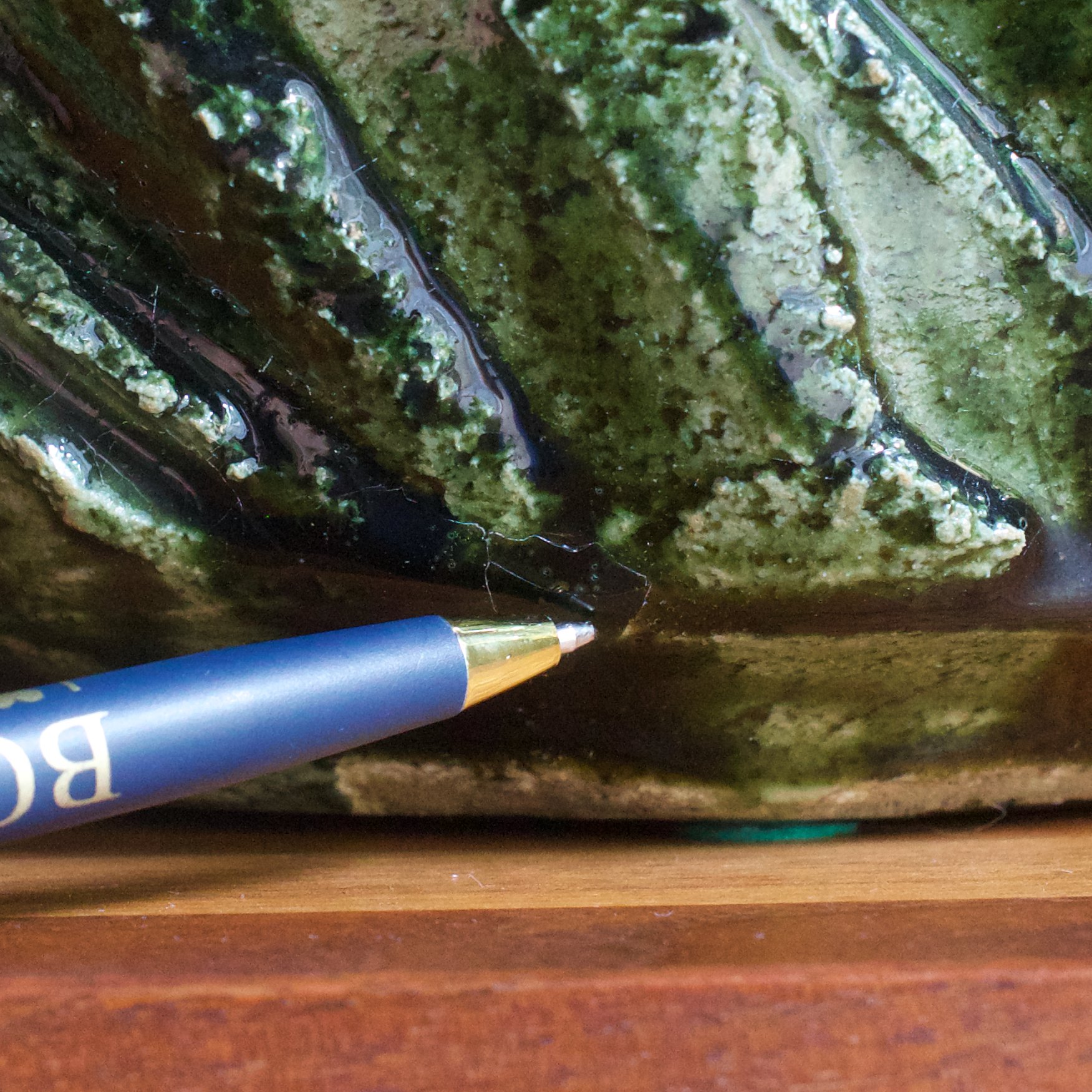The torn texture of the clay lets the green copper glaze play. Or maybe it’s the glaze that highlights the clay. Either way, Hayashi mastered this synergy, so distinctive to Oribe, at a young age. He made this vase before he was 30 years old, so he was understandably a rising star of Mino ware before his death at 41 years old.