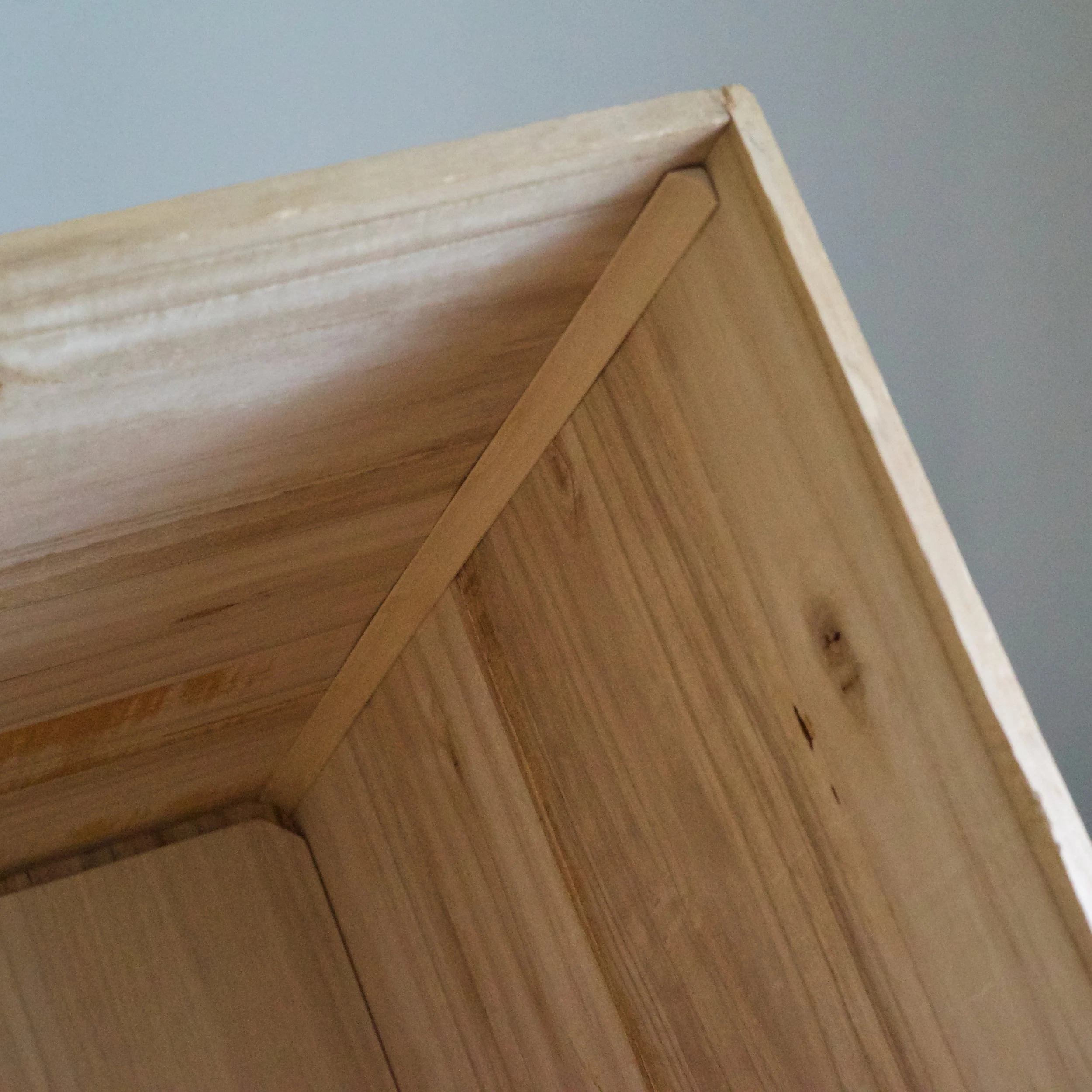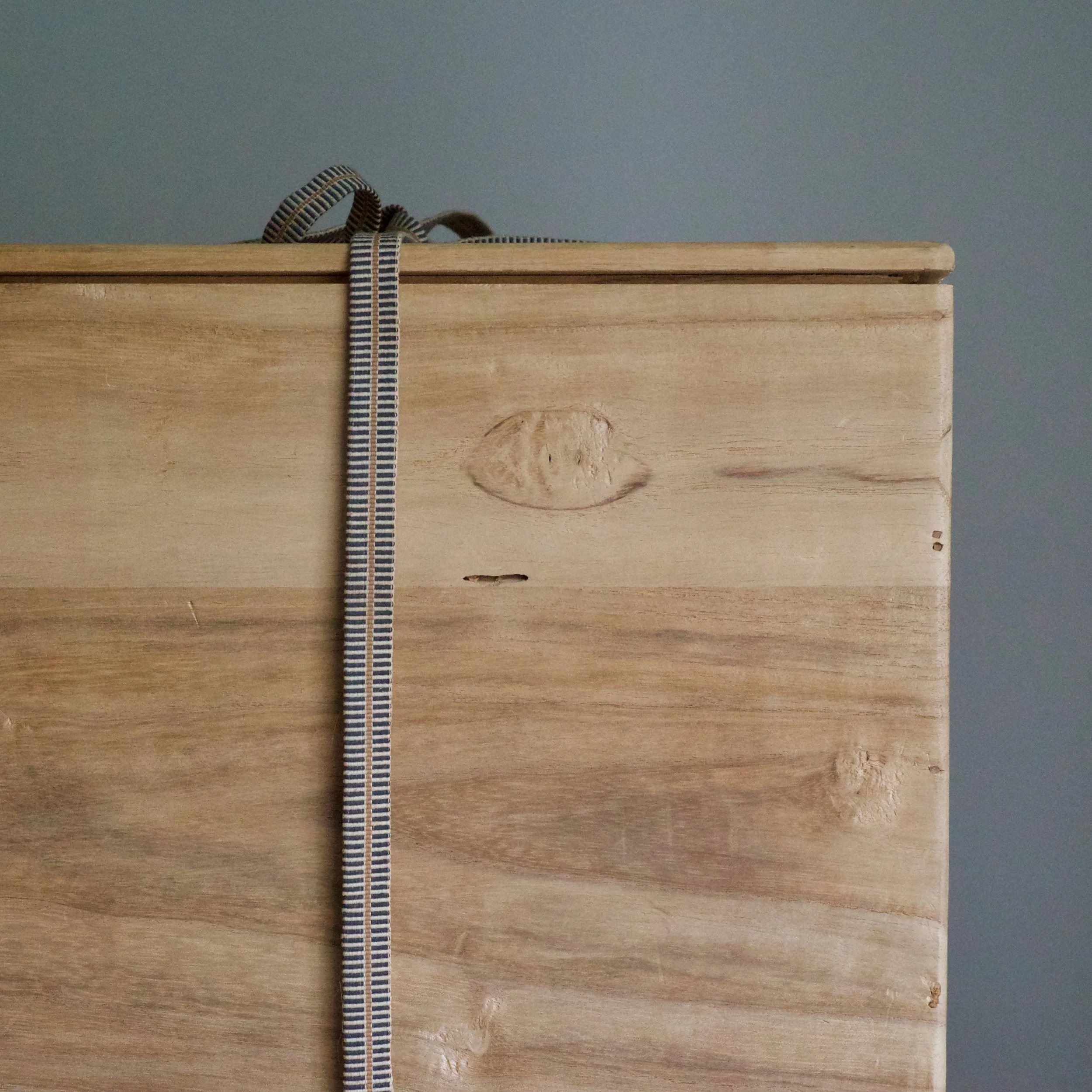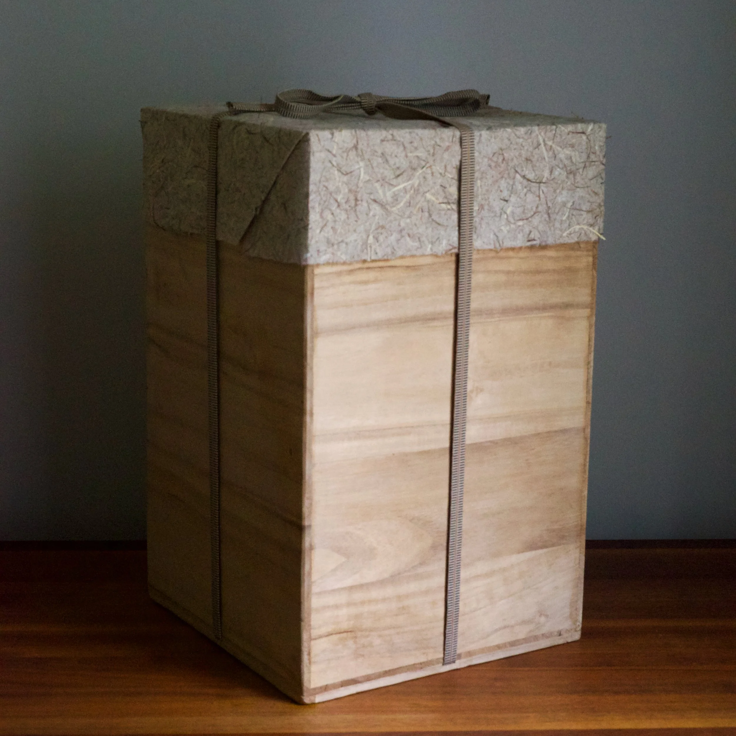 Regarding the vase's condition, there is a fine crack in the glaze's crazing and a 1/4” glaze loss in one spot at the base. This box’s wood - perhaps cedar - is heavily grained, knotted, and fragile. The lid warped at some point, and some of the joins were repaired with glue. The sides loosened in its latest shipment so I have re-glued those sides and reinforced the inside corners. Over time the box's bottom cracked, so I added a layer of wood to help distribute the base’s weight. At close to 55 years old, this box has character.