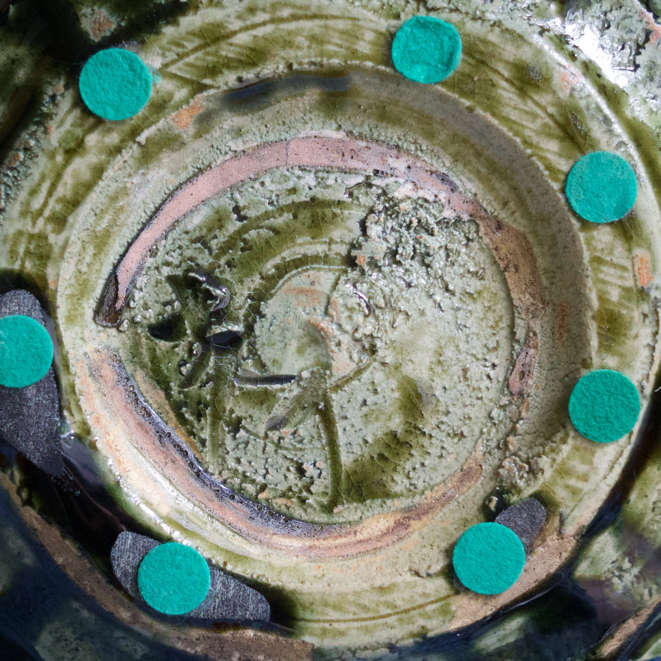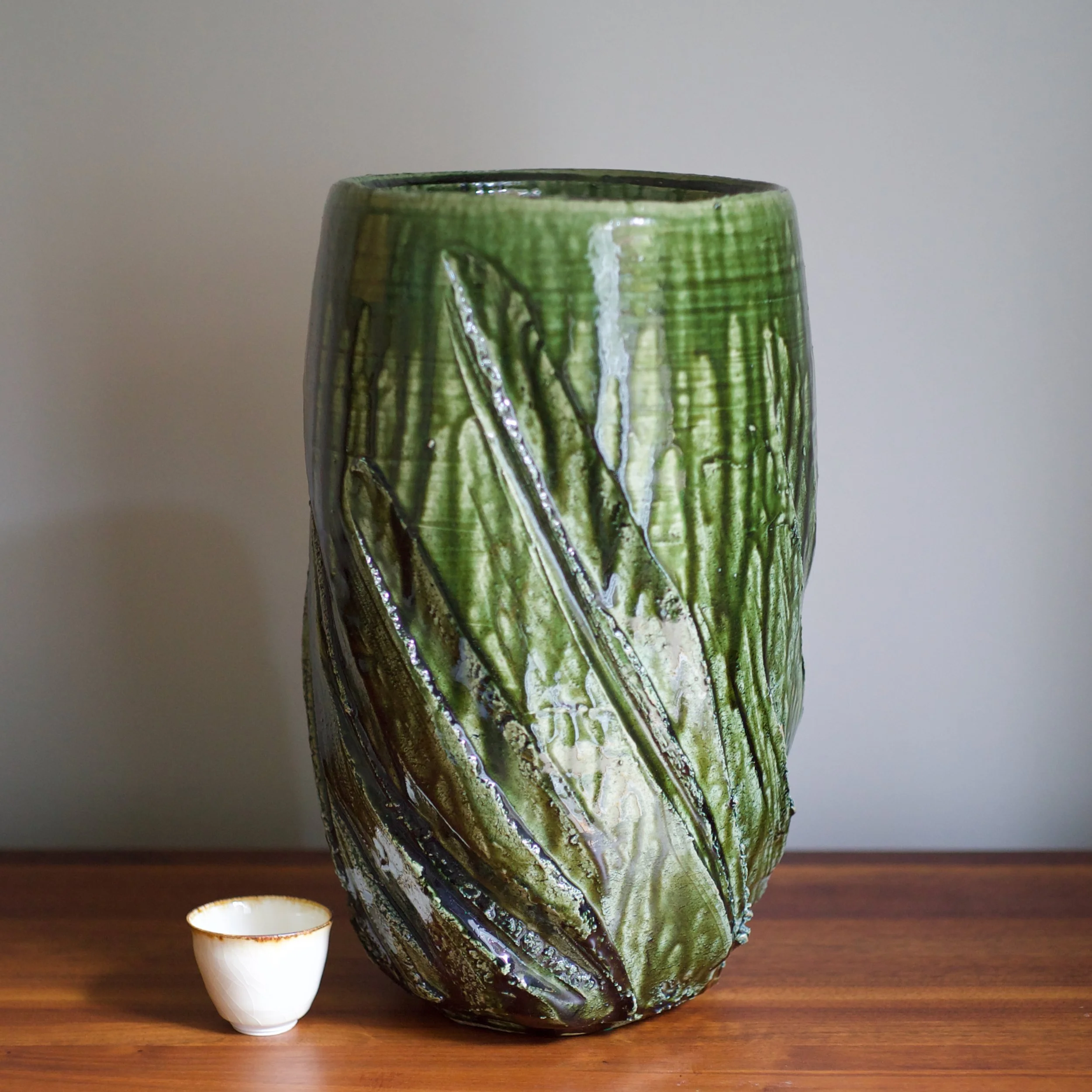 While Hayashi Kotaro's Shino pots are spectacular - no wonder since he studied with Kato Kozo who made some of the finest modern Shino wares - it’s in his Oribe where his talent seemed to truly shine. Running in washes down this impressively large vessels, the rich greens are interrupted by Hayashi’s spiralling combed incised marks.