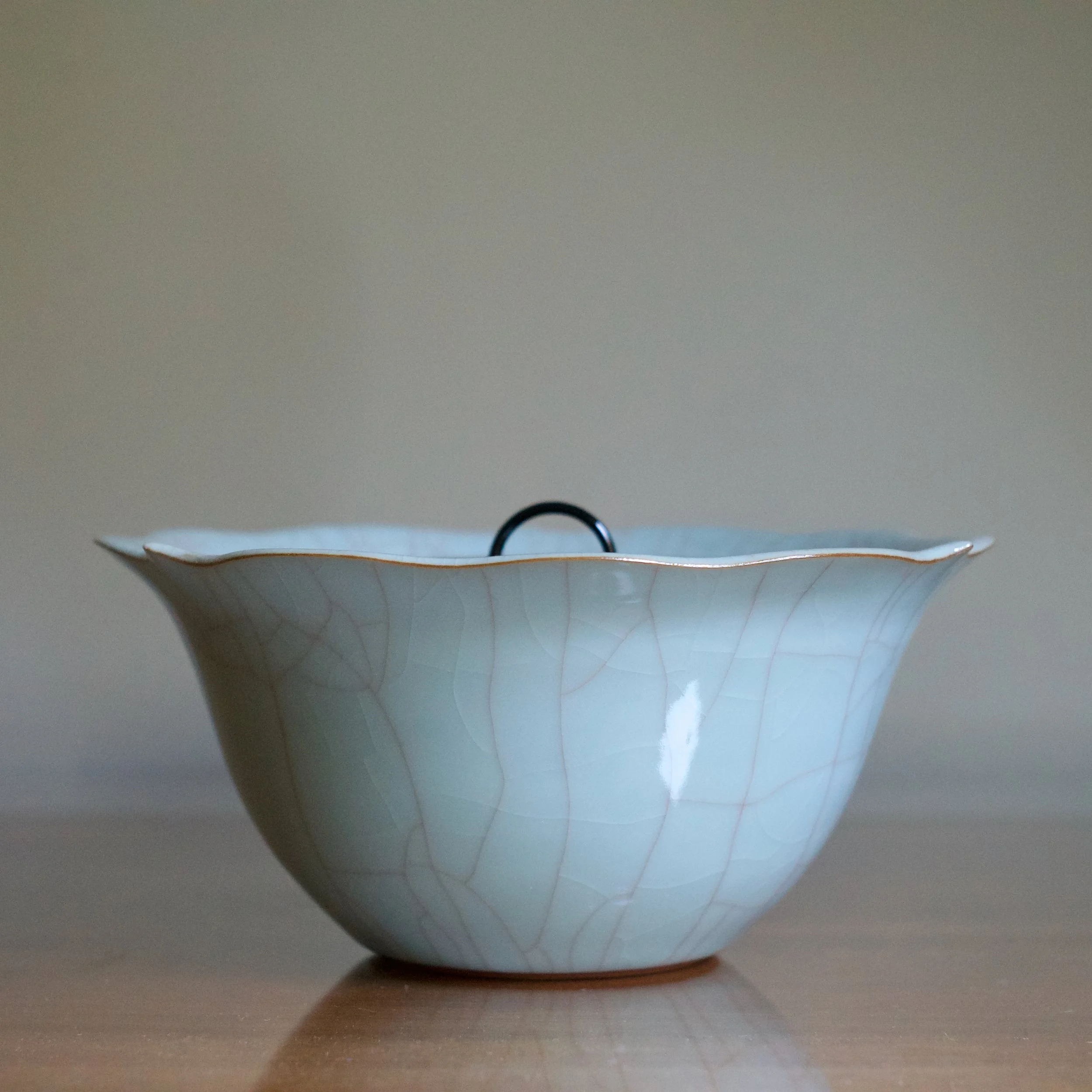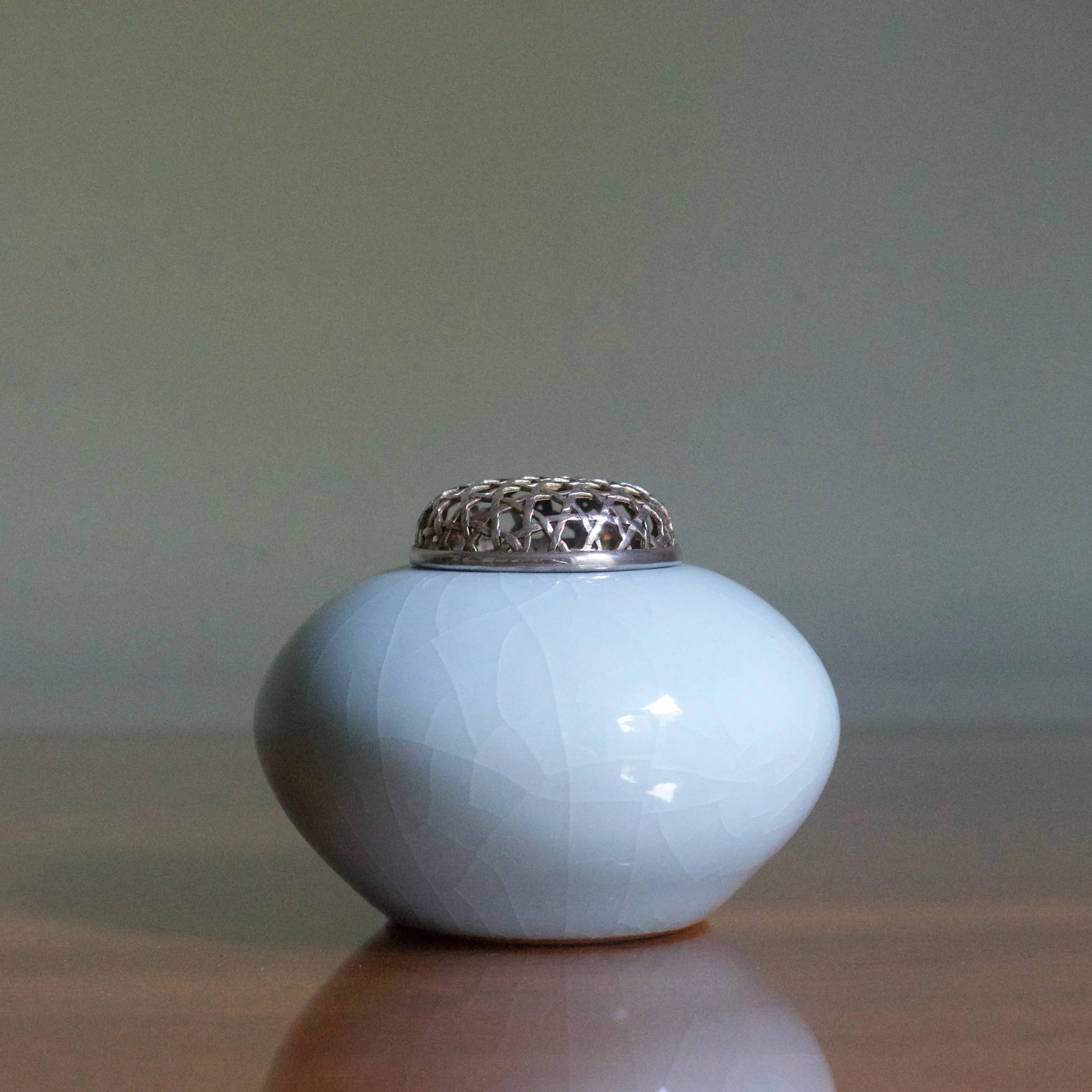 Masayuki URAGUCHI Born 1964. Works in Ishioka, Ibaraki, Japan. BLACK CRYSTAL CELADON BOWL CELADON MIZUSASHI CELADON FLOWER VASE CELADON CHAWAN CELADON INCENSE BURNER CELADON GUINOMI 2 CELADON GUINOMI 1