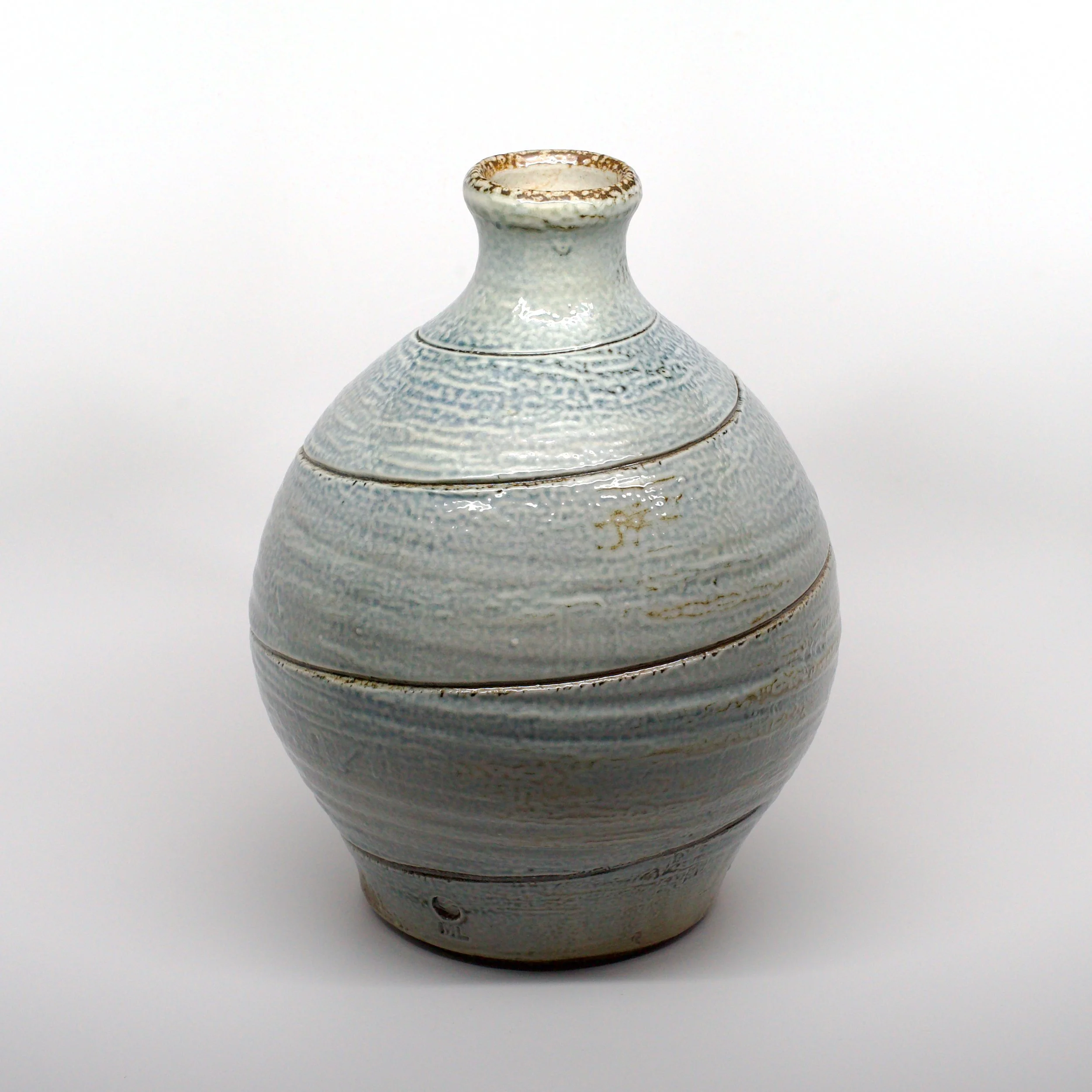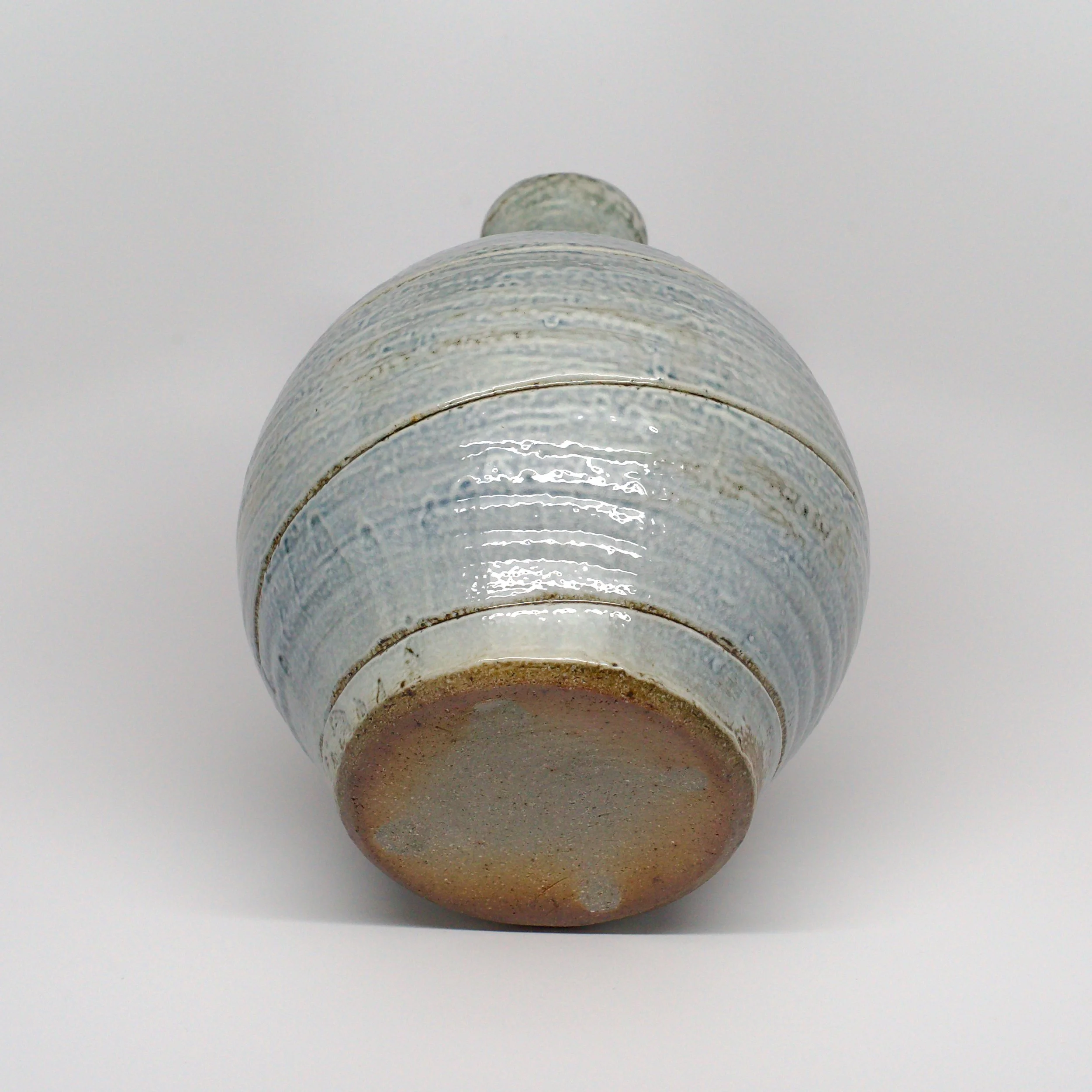 The soft blue over the round, ovoid reminds me a water drop. The heavy bottom flattens like water’s surface tension transferring to the plane below. This dynamic pull downwards is countered by the incised upward spiral enveloping the vase body.