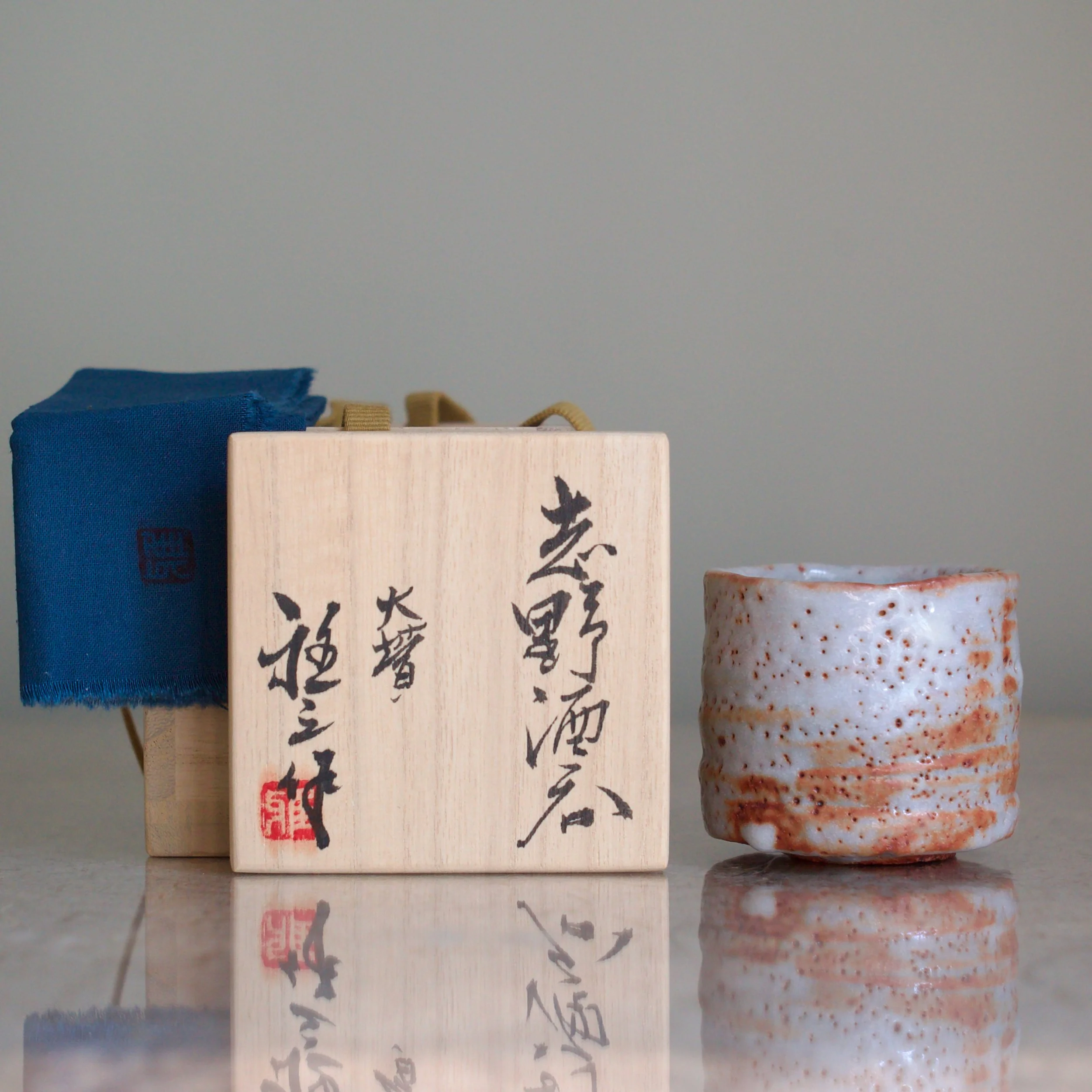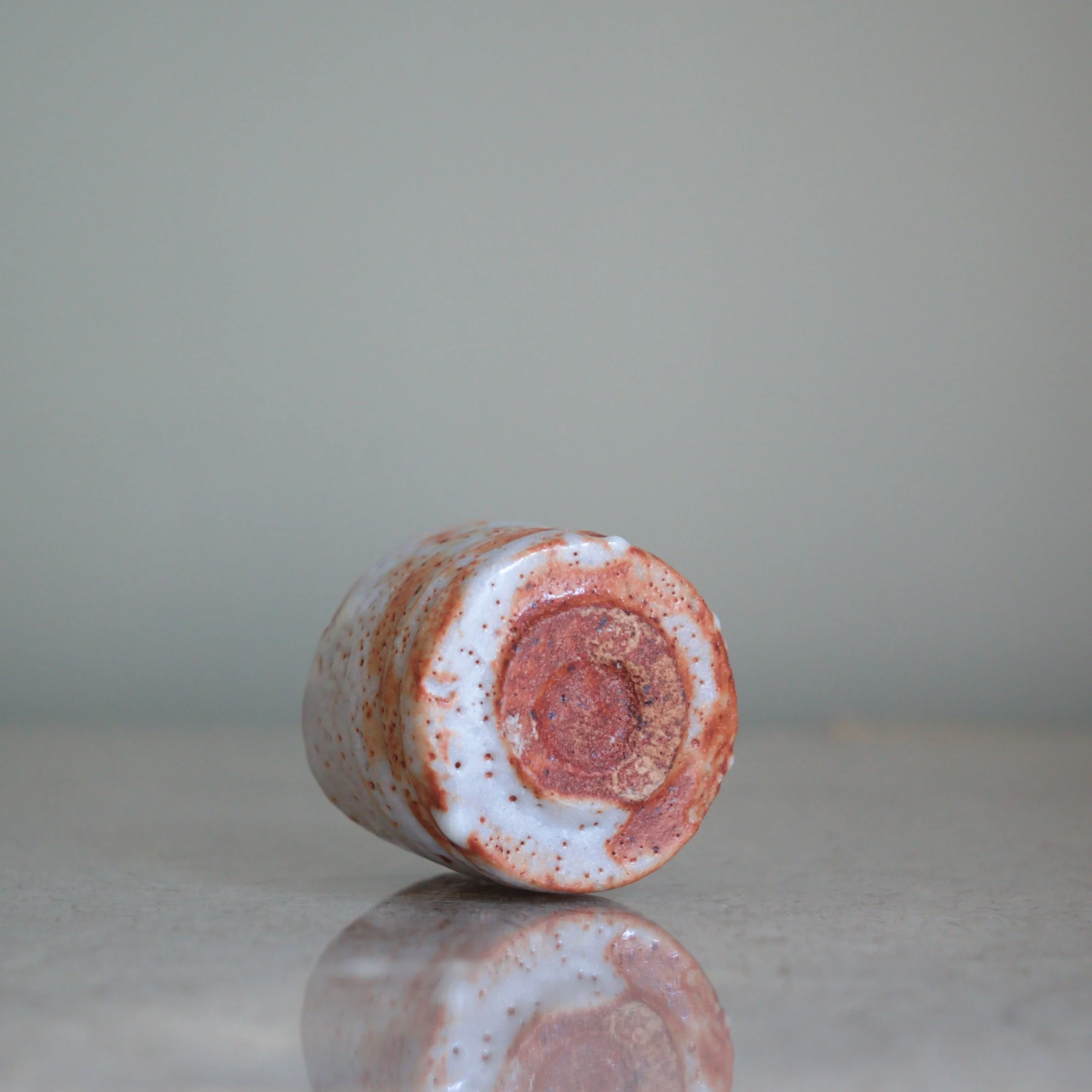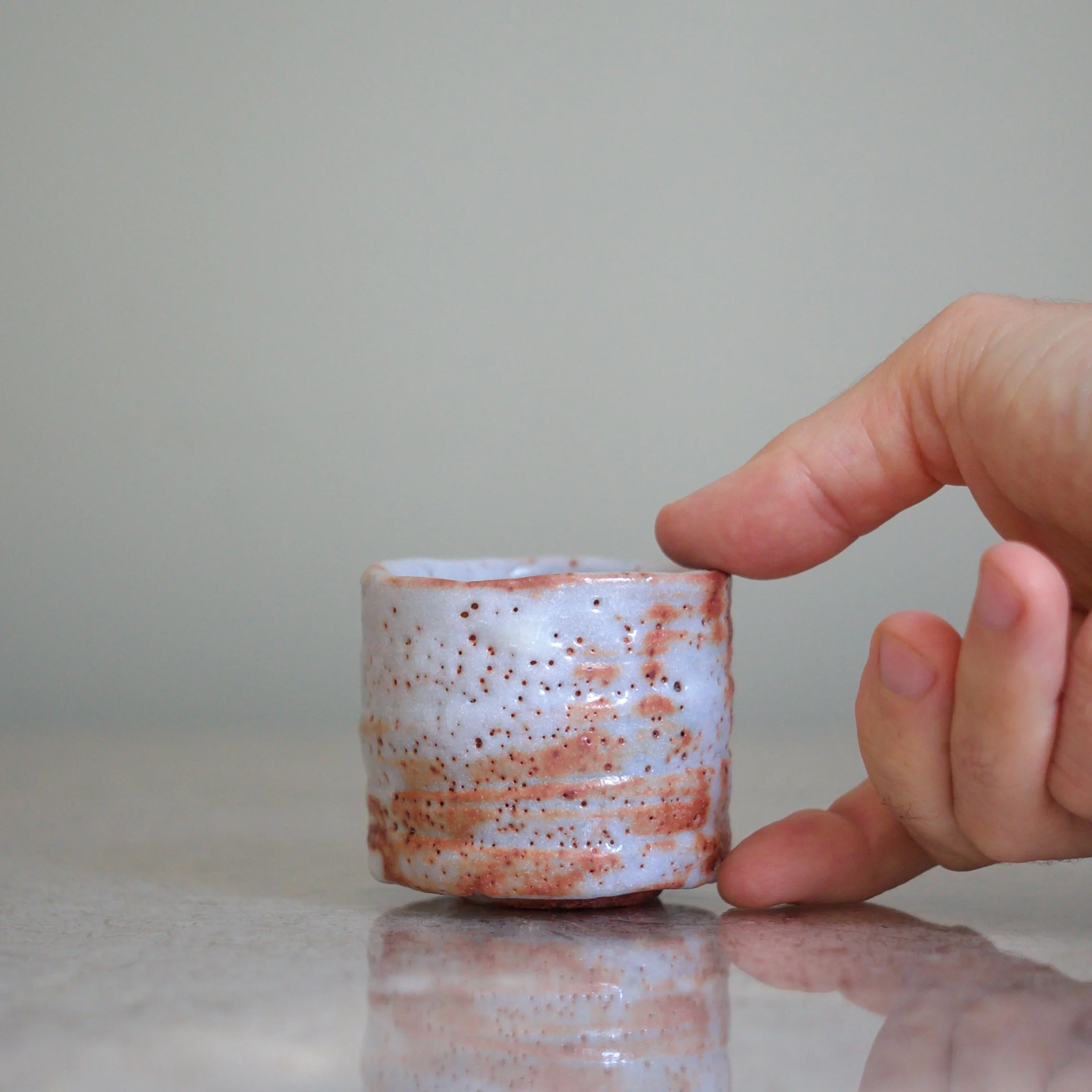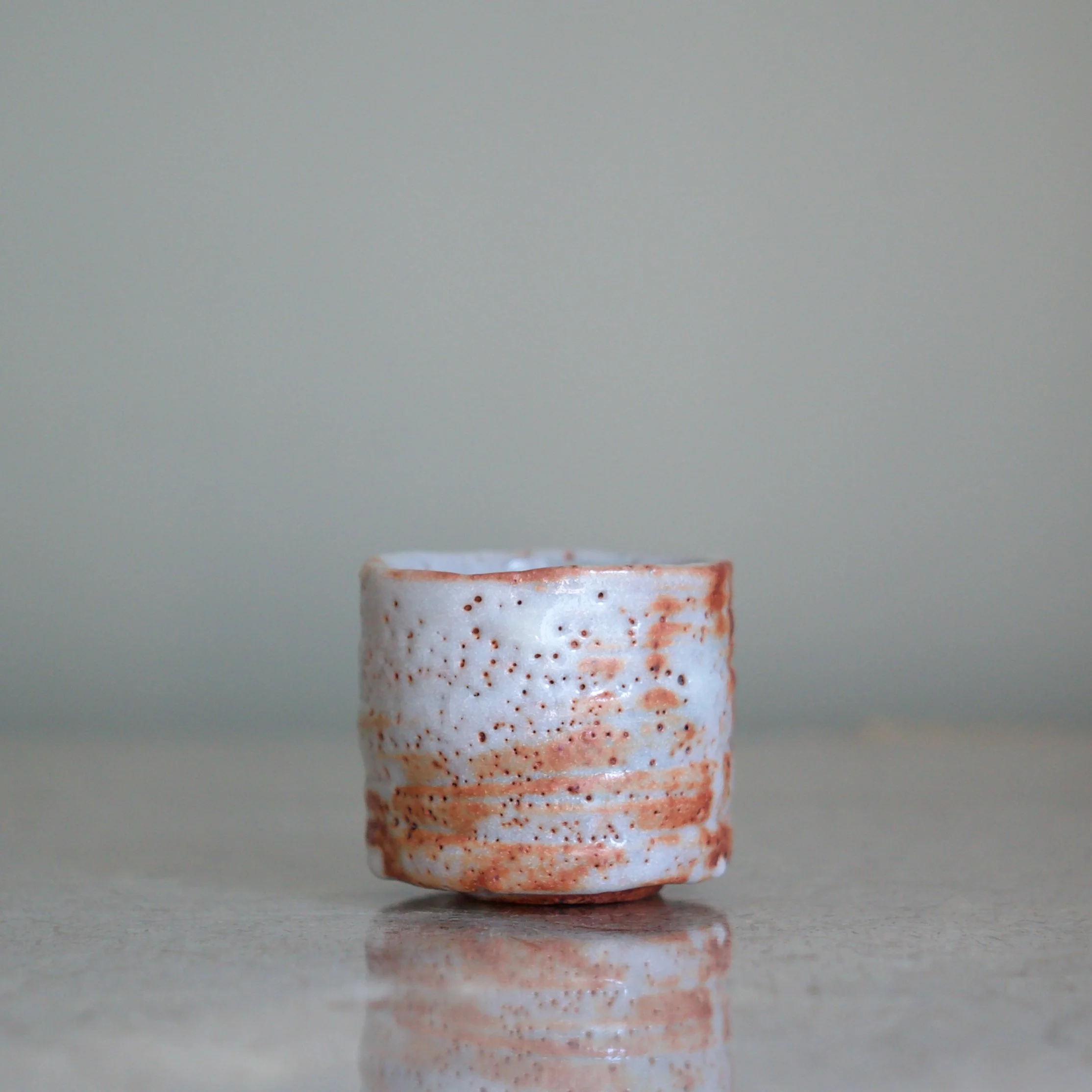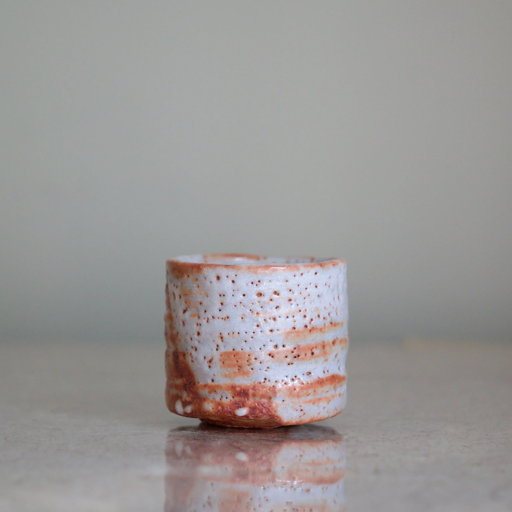 Higuchi threw this cylinder shaped cup and refers to it as a shuhan (酒呑) which translates roughly to a cup for alcohol or for sipping alcohol. As opposed to a guinomi which is specifically for drinking sake, a shuhan can be used for not just sake but also whiskey, tequila, or bourbon.