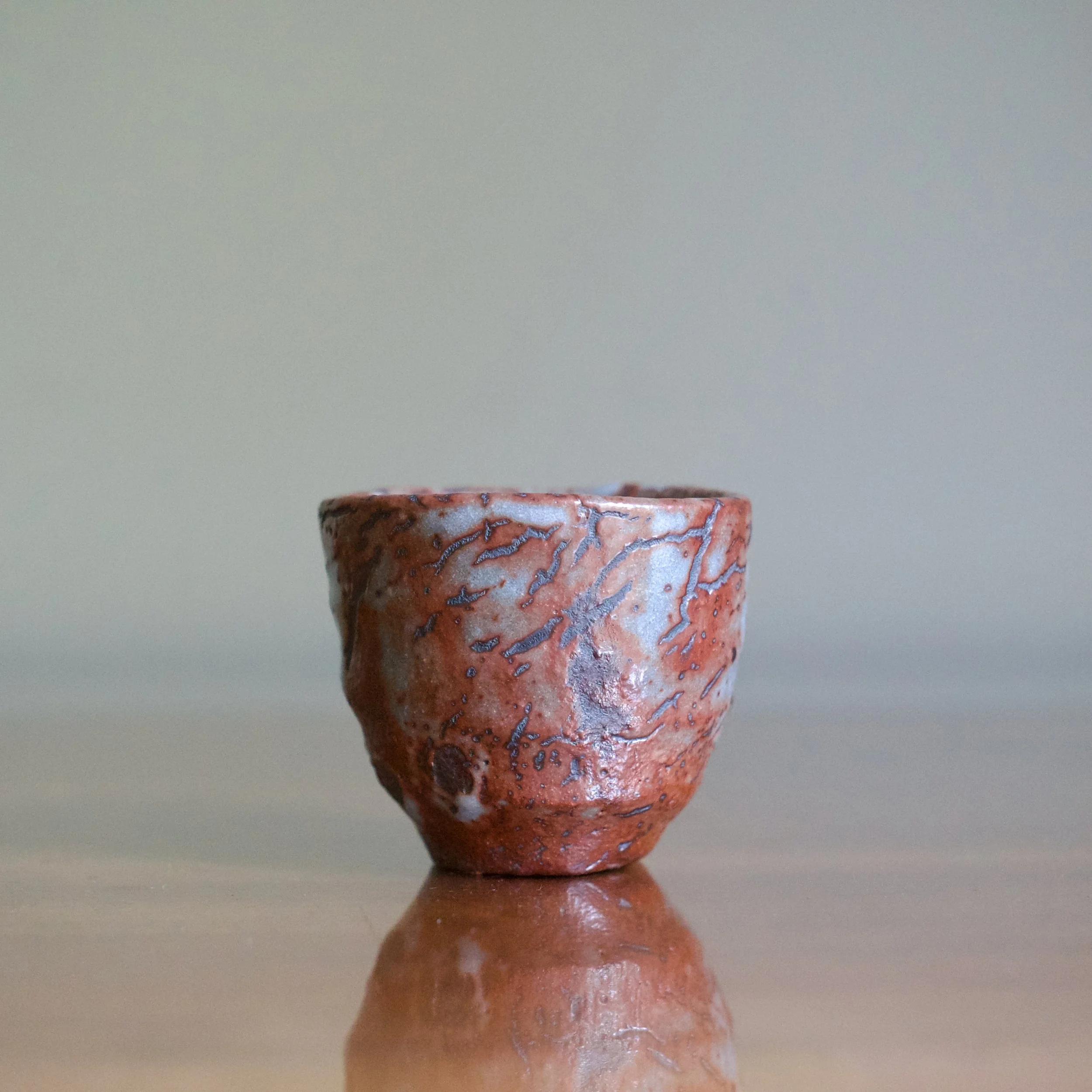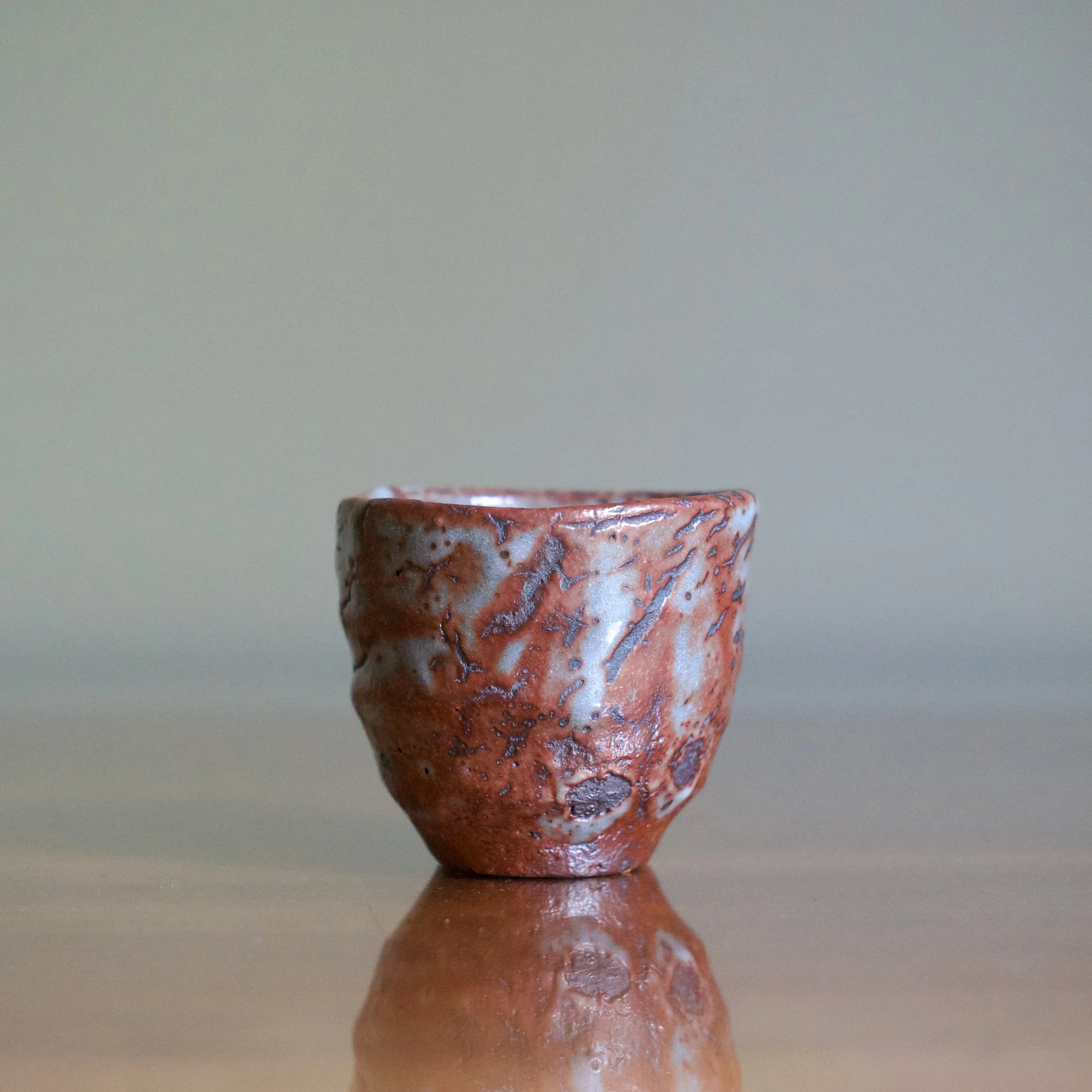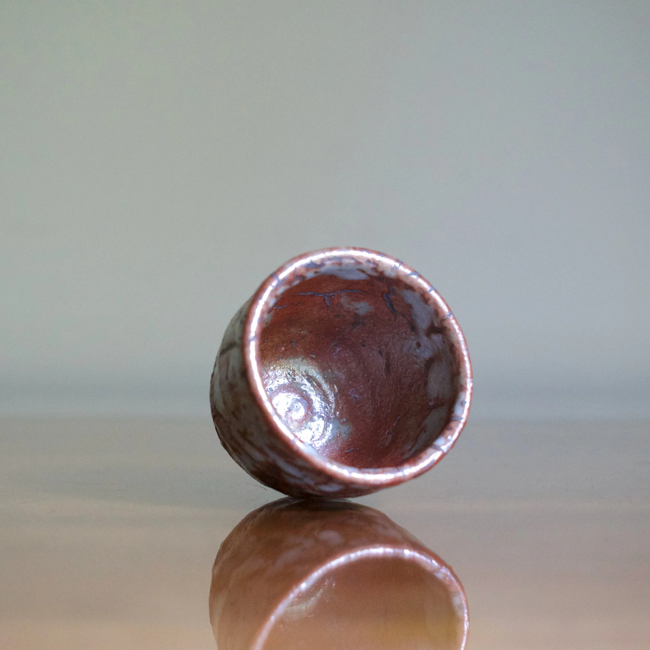 Higuchi titled this piece simply “shino sake cup” but with the iron oxide underglaze it could also be considered a fine example of nezumi, or grey, shino. The variety of reds, purples, greys, and blacks is proof of the range of colours shinos can provide. There is also a lovely iridescence to the glaze surface, perhaps an artifact of the wood-firing. Higuchi’s practice focuses on recapturing the essence of Momoyama Mino wares: the timeless beauty of natural materials transformed by fire.