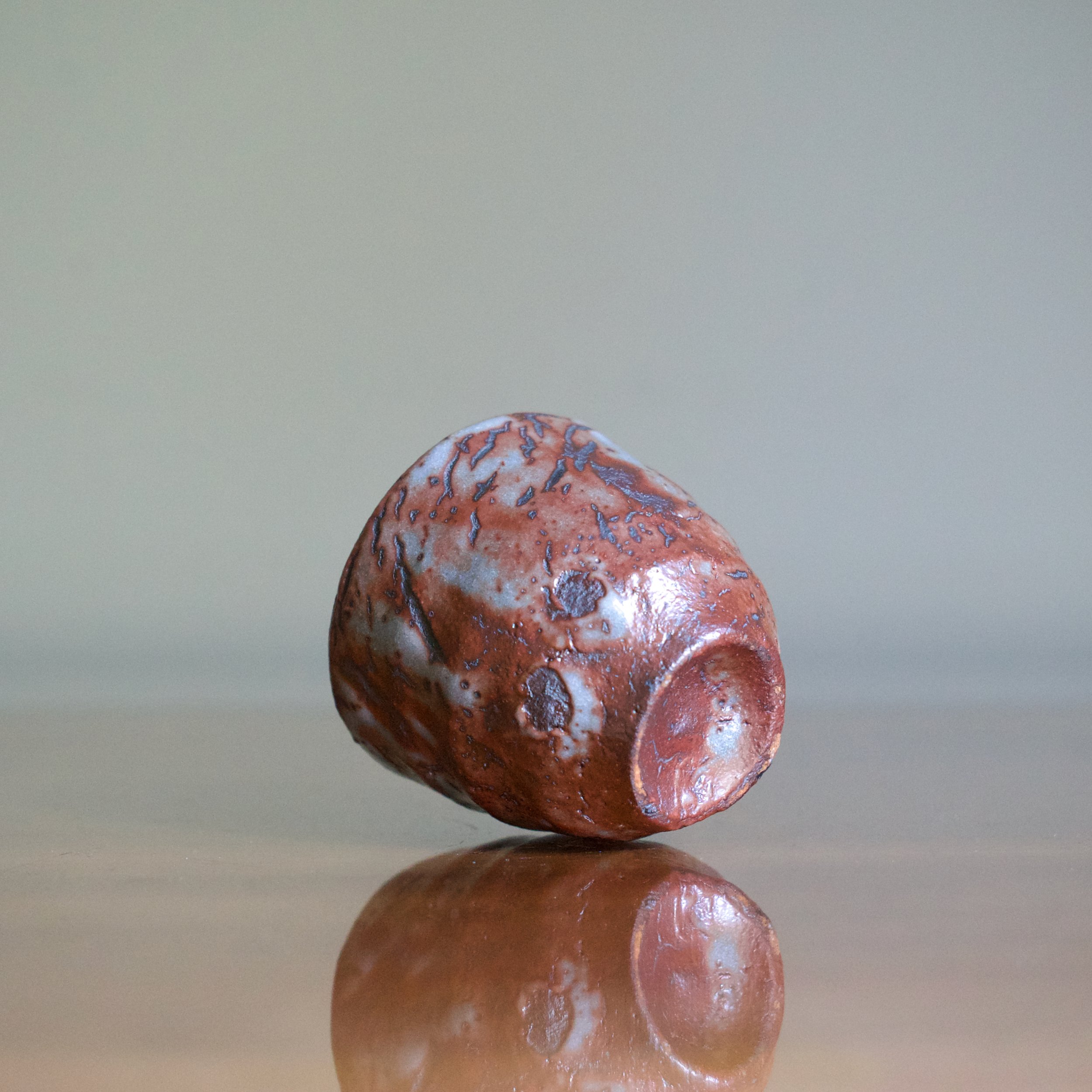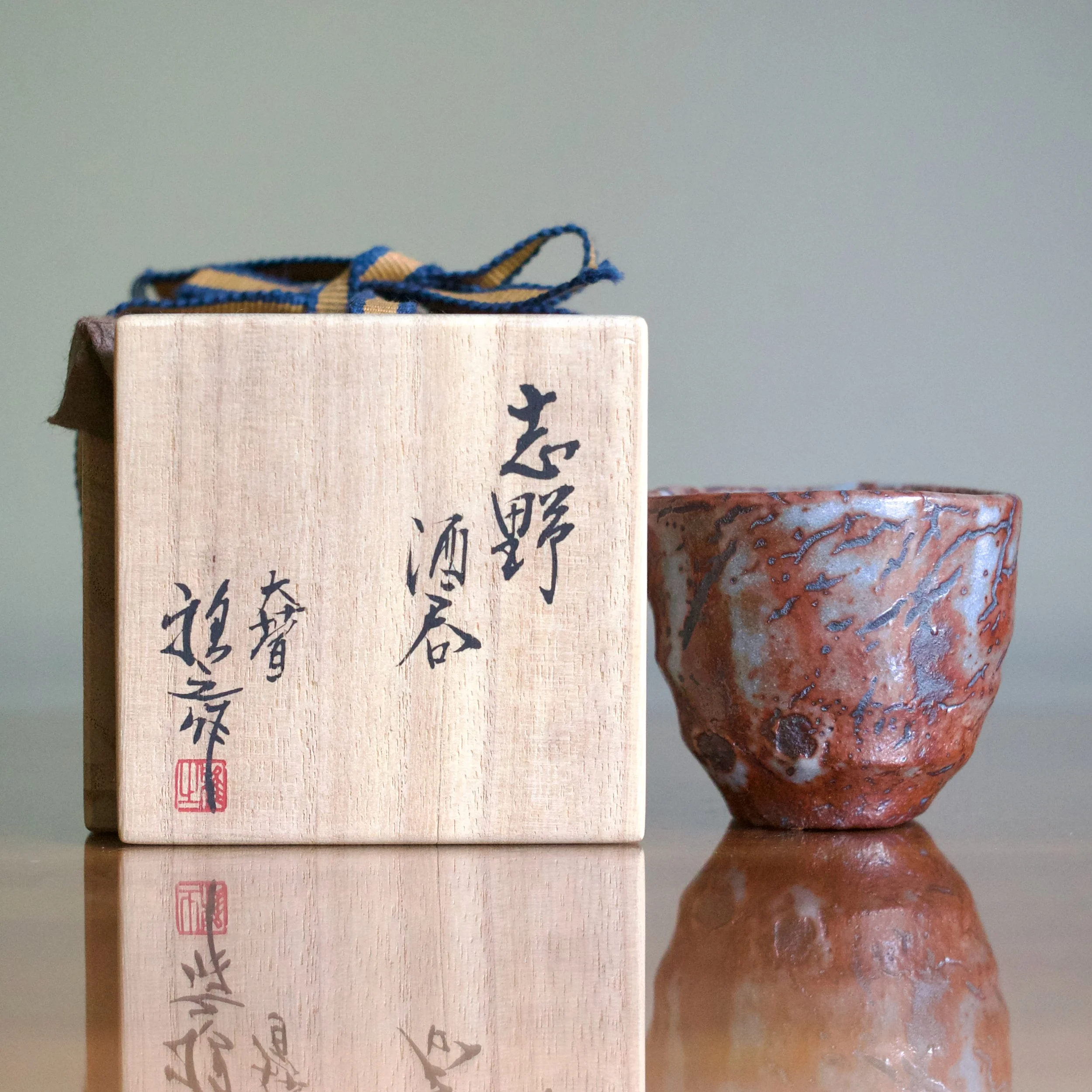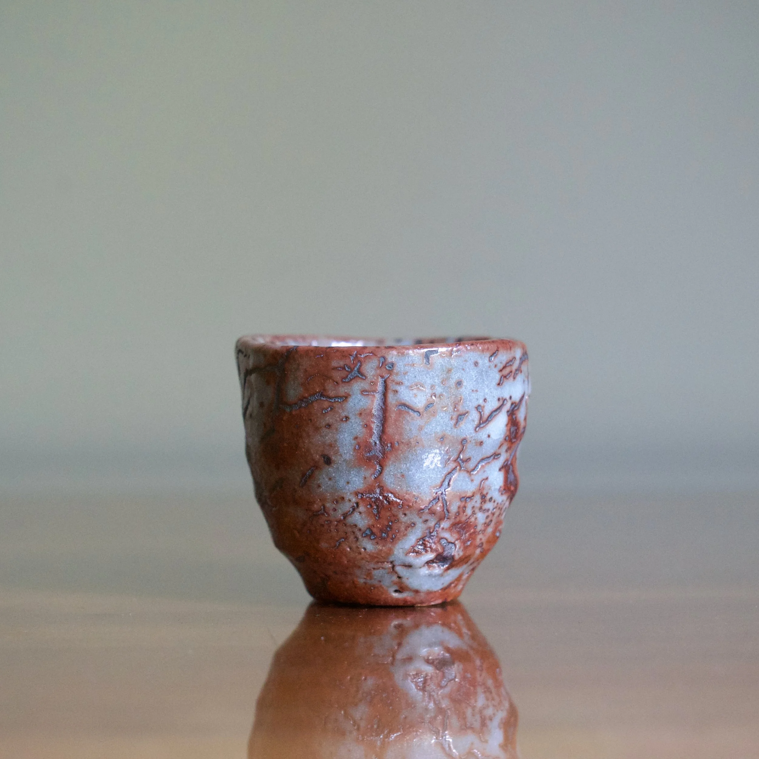 Higuchi titled this piece simply “shino sake cup” but with the iron oxide underglaze it could also be considered a fine example of nezumi, or grey, shino. The variety of reds, purples, greys, and blacks is proof of the range of colours shinos can provide. There is also a lovely iridescence to the glaze surface, perhaps an artifact of the wood-firing. Higuchi’s practice focuses on recapturing the essence of Momoyama Mino wares: the timeless beauty of natural materials transformed by fire.