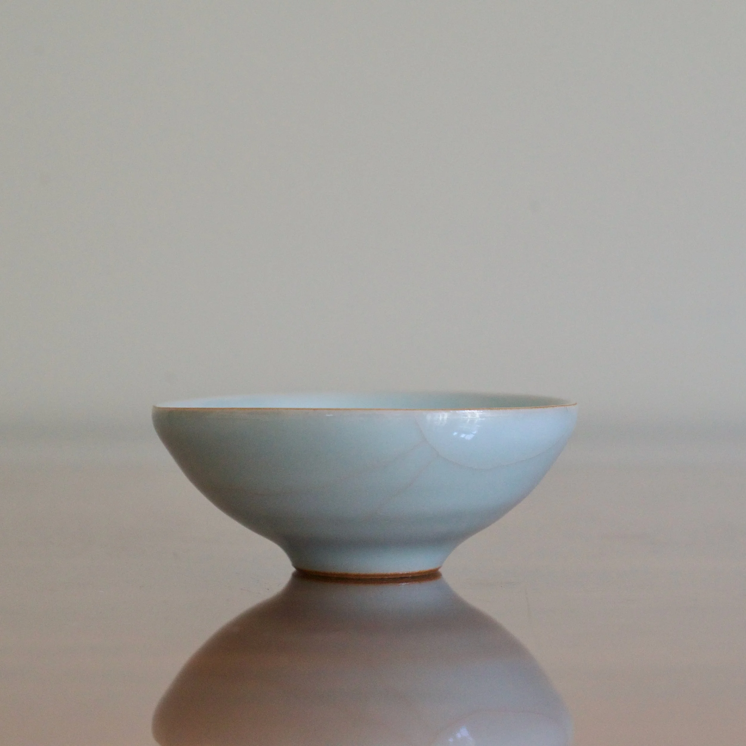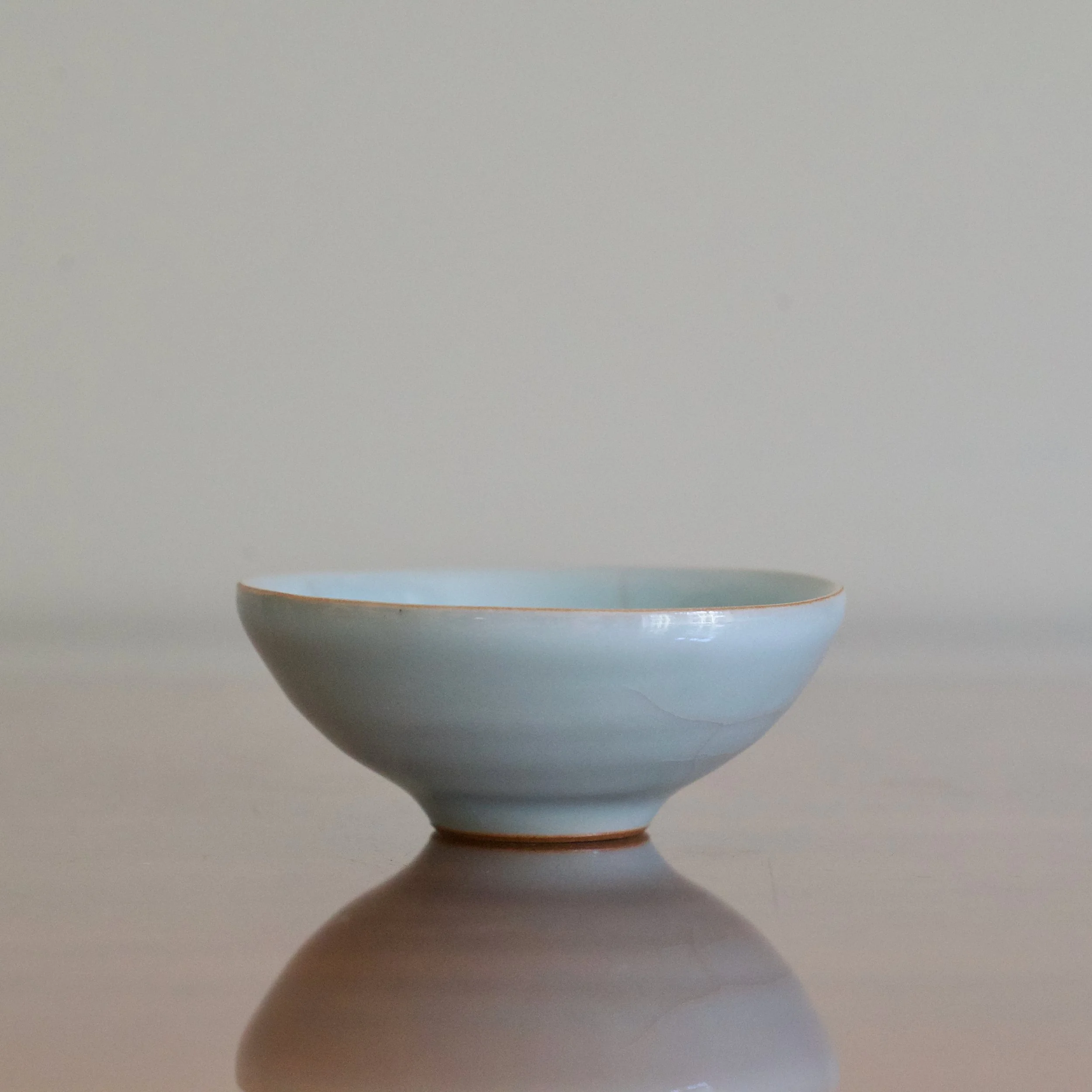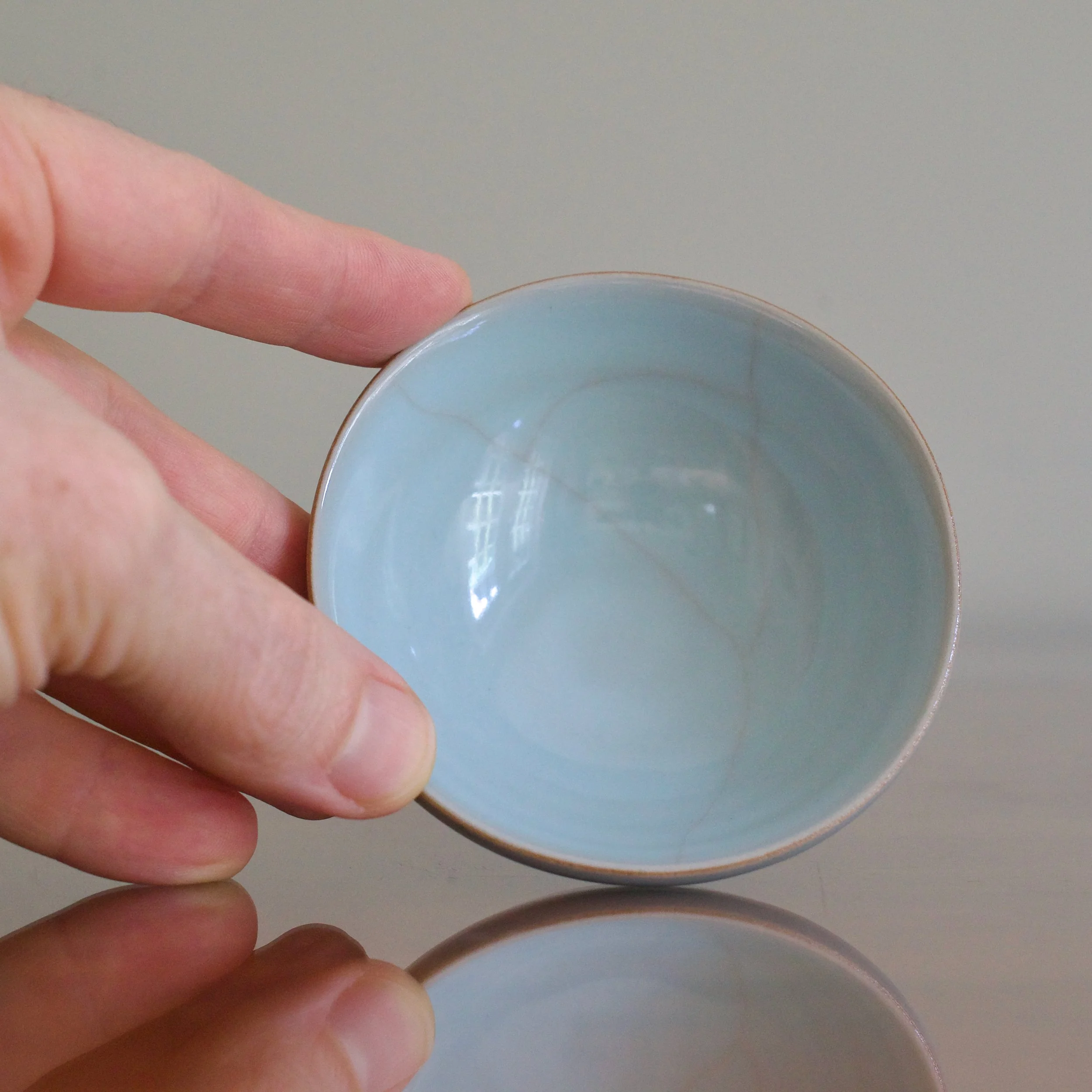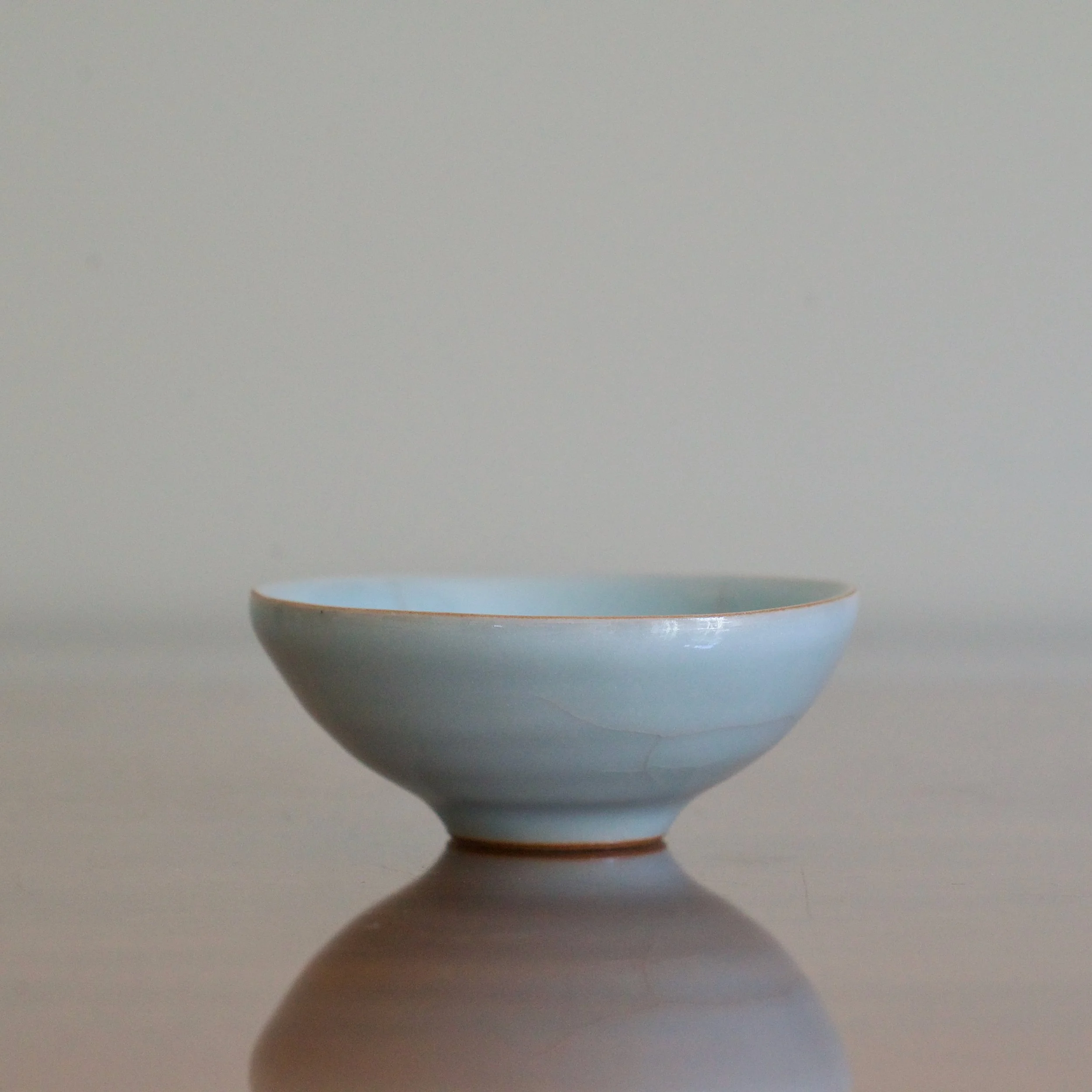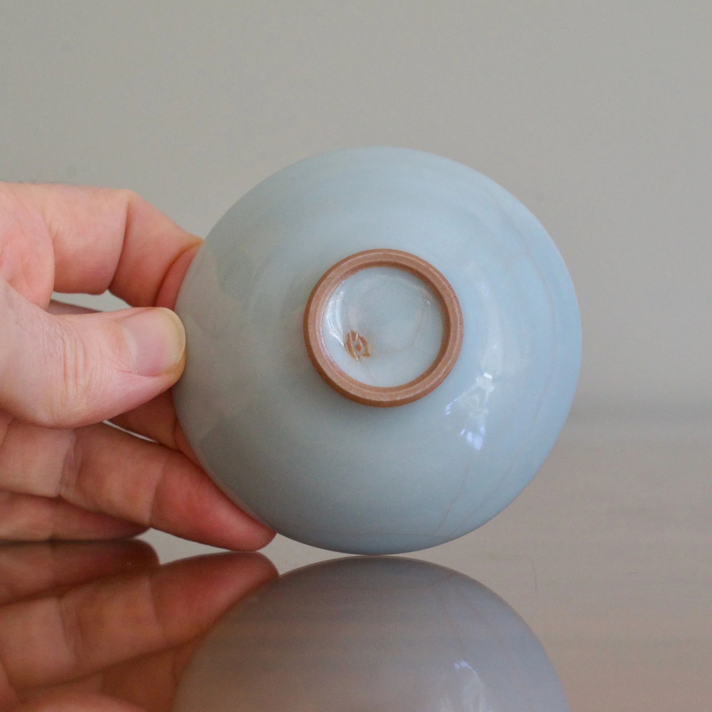 An early example of Masayuki Uraguchi’s celadon, this cup was made when he was just 30 years old, only a few years after his first solo shows. Uraguchi studied ceramics at the Tokyo University of Arts under the celadon giant Miura Koheiji. You can see with this sake cup the pure blues Uraguchi managed to achieve early on. As well, the warm-toned, iron-rich clay body can be seen on the unglazed foot.