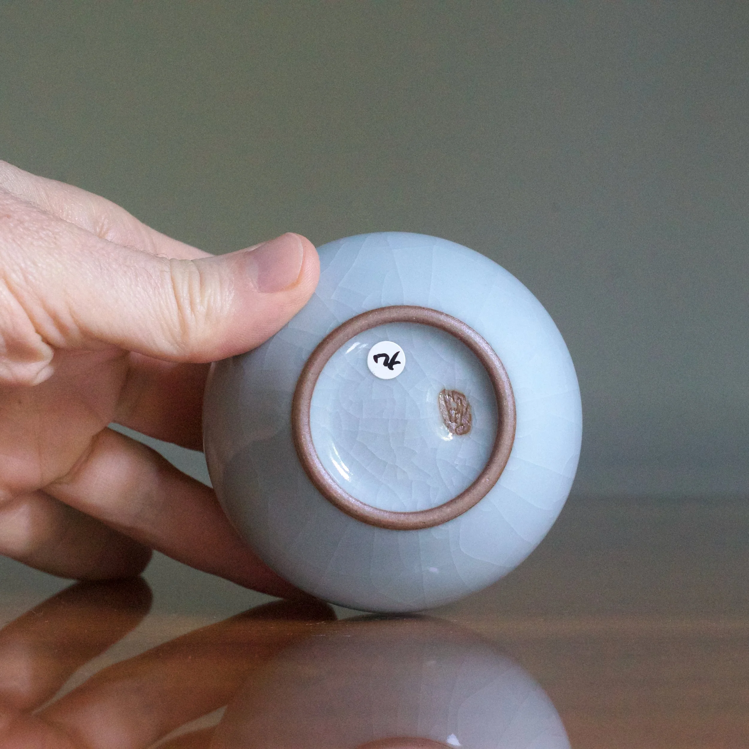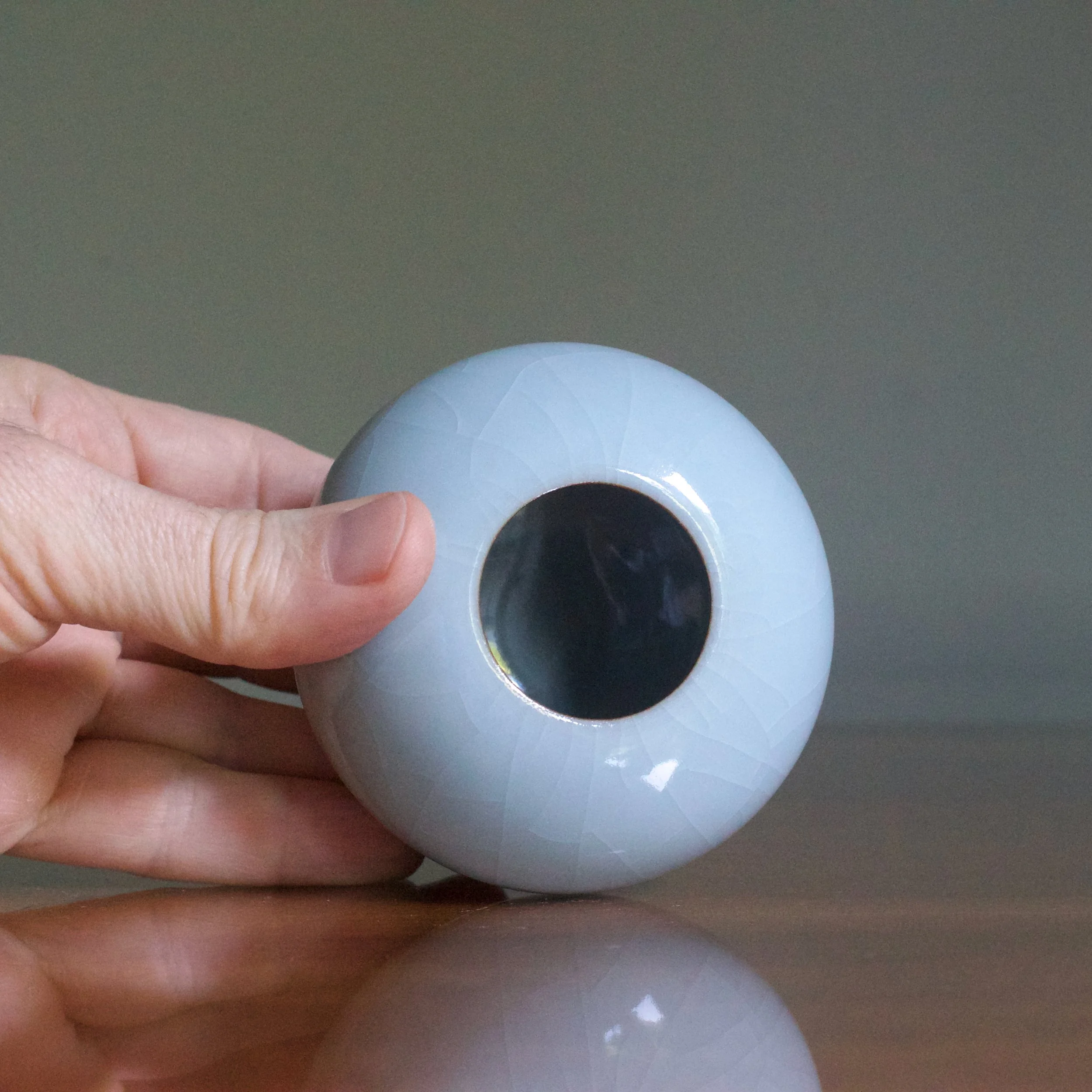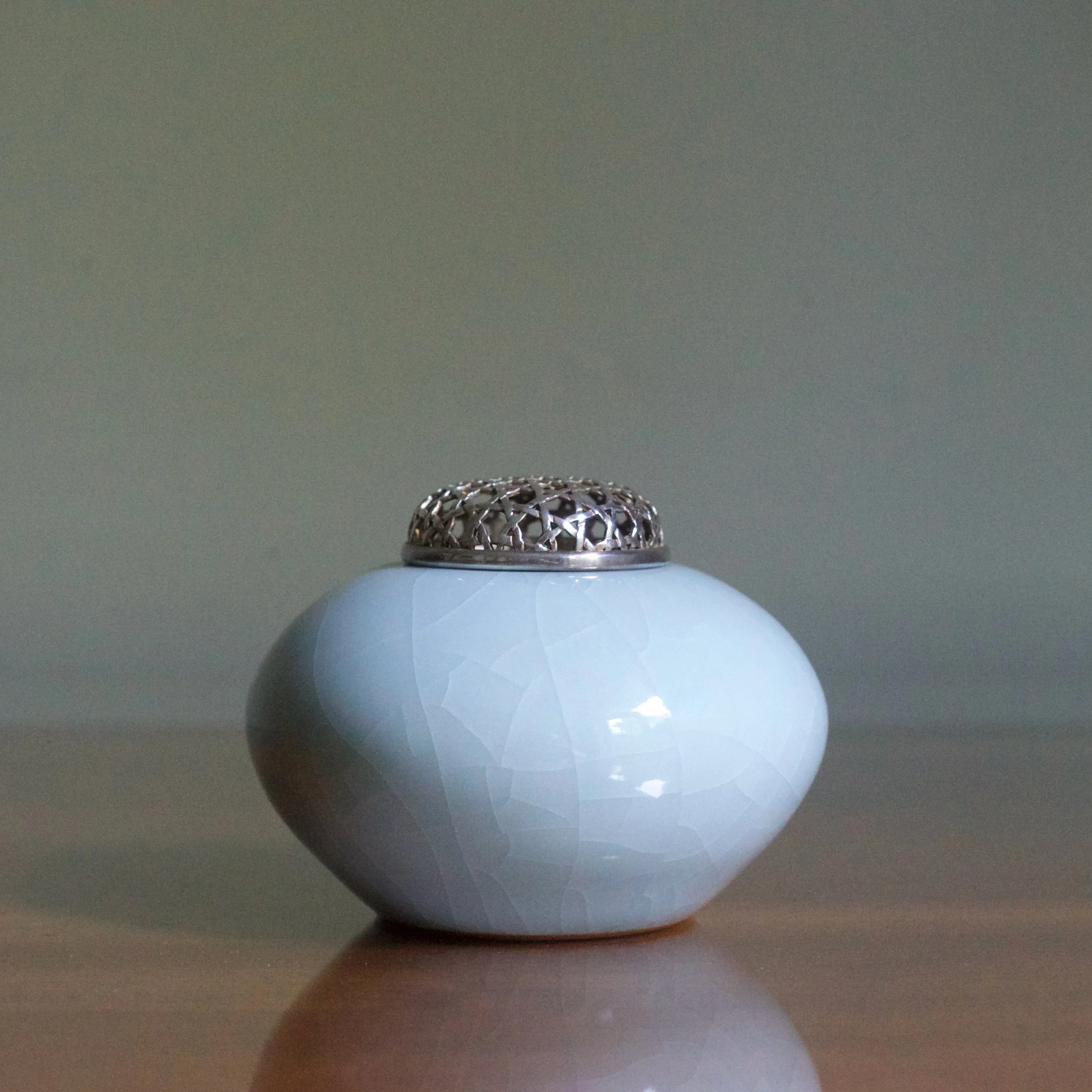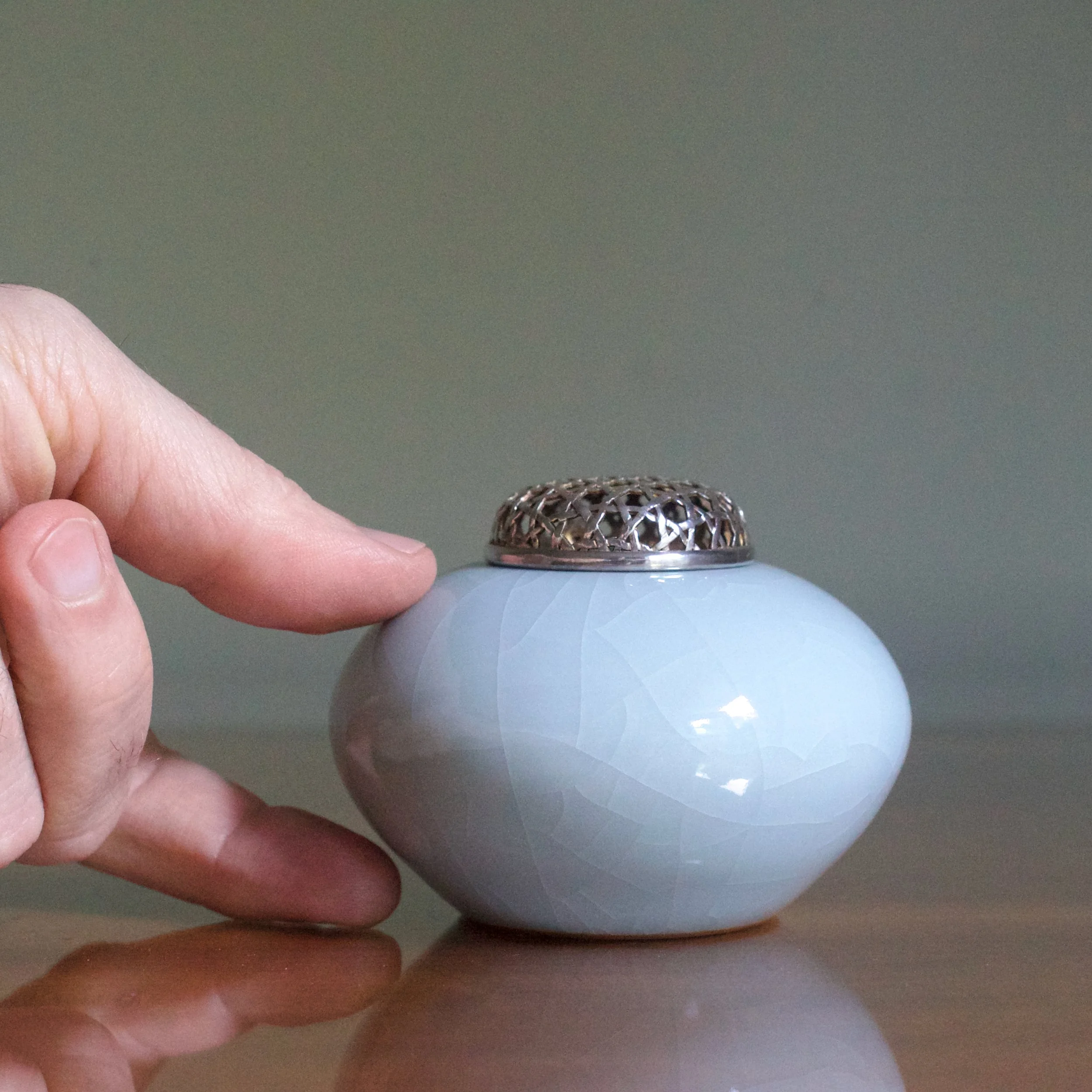 I’ve had a few Koro incense burners by the great celadon artist Masayuki Uraguchi in the past but the others were shaped like lanterns or lotus leaves. This is the first I’ve come across that is so simple. Perfectly round - no feet, no shoulder, no neck or lip - it sits directly on the table or in the palm of the hand. The celadon is a perfectly clear blue-green with delicate, almost invisible crazing.