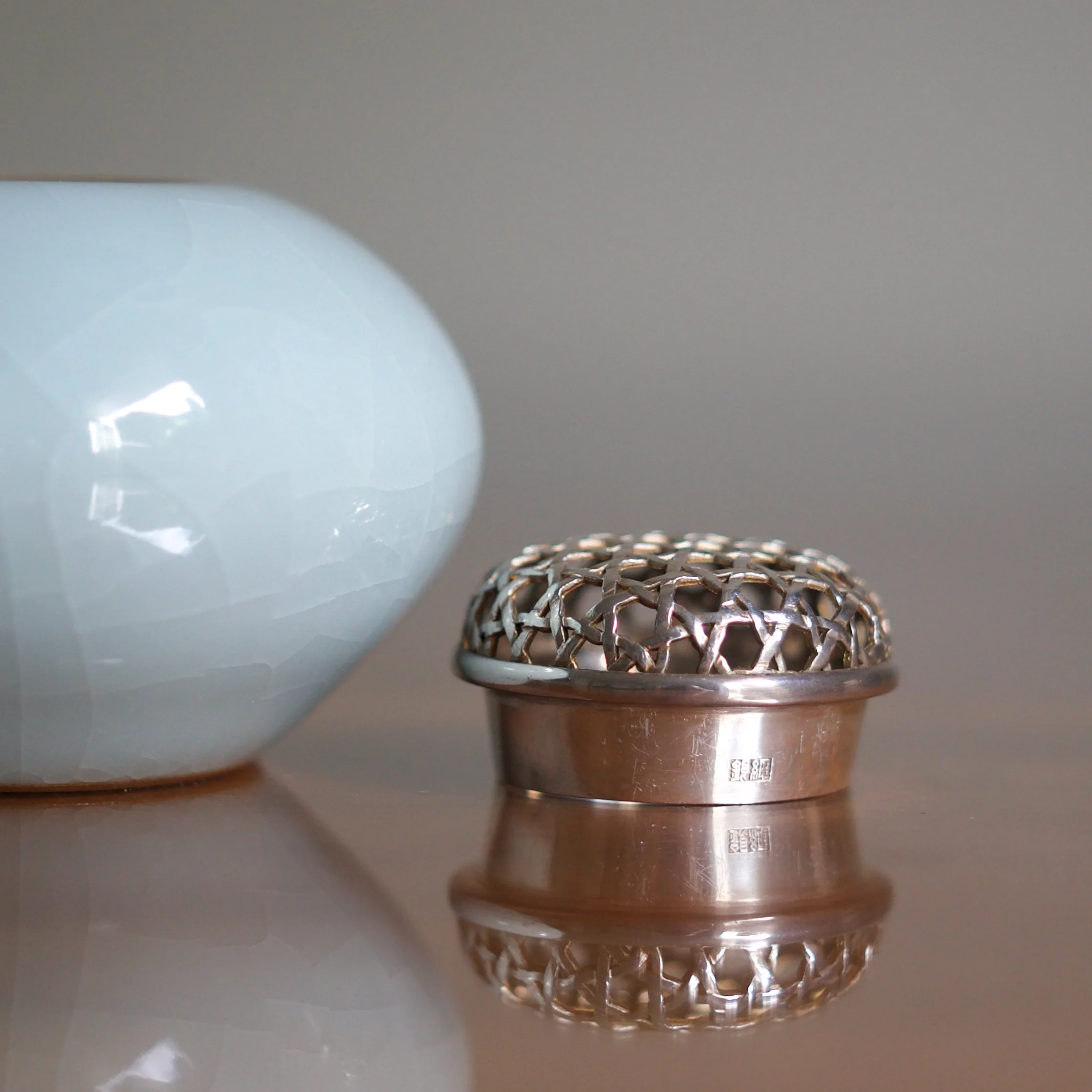 But it’s the form’s simplicity that shows off the intricately woven custom lid made of silver. At once both elegant and simple, the hexagonal pattern - known as mastume-ami - can be found in baskets, architecture, and design. The lid’s rim is marked “銀純” meaning “gin-jun” or pure silver.