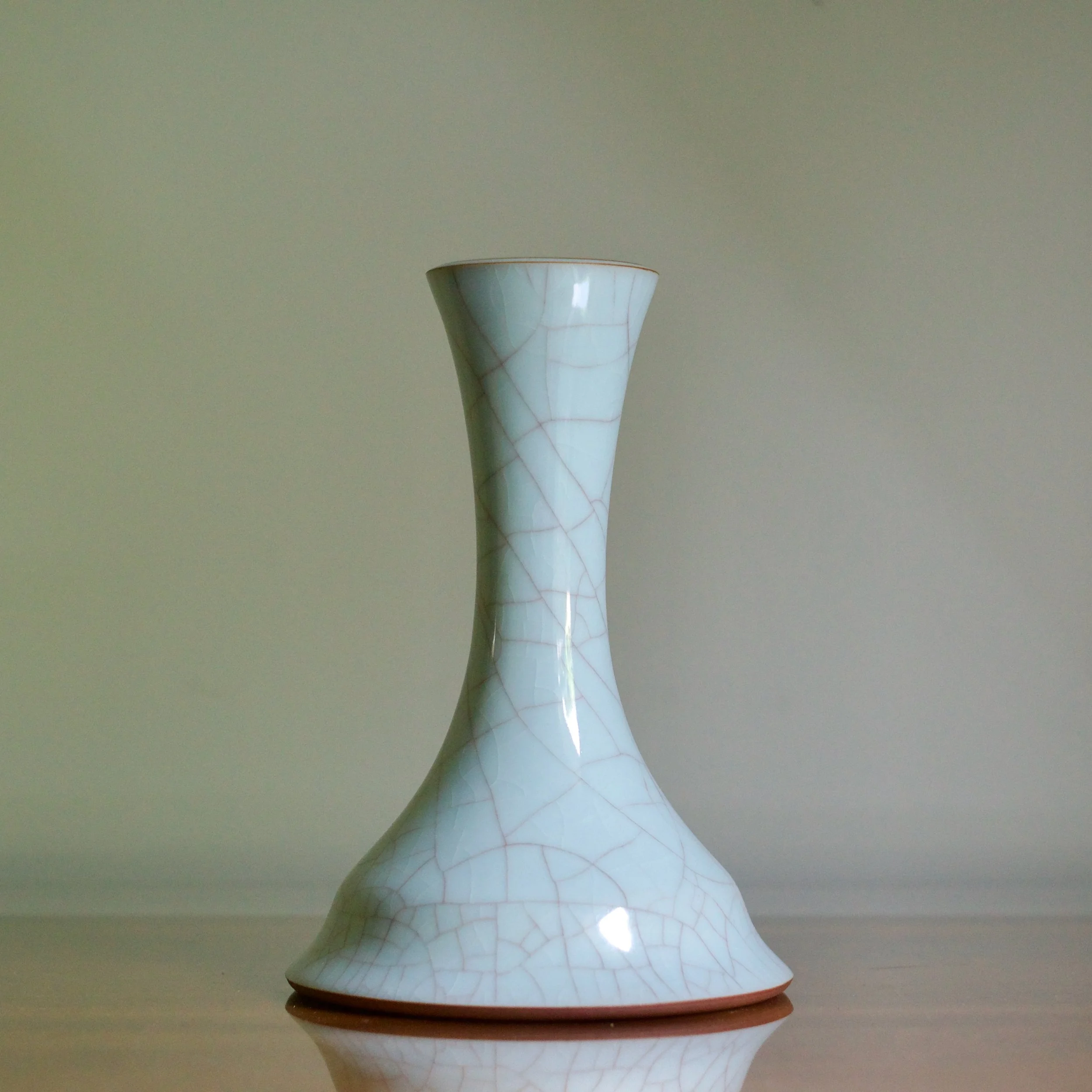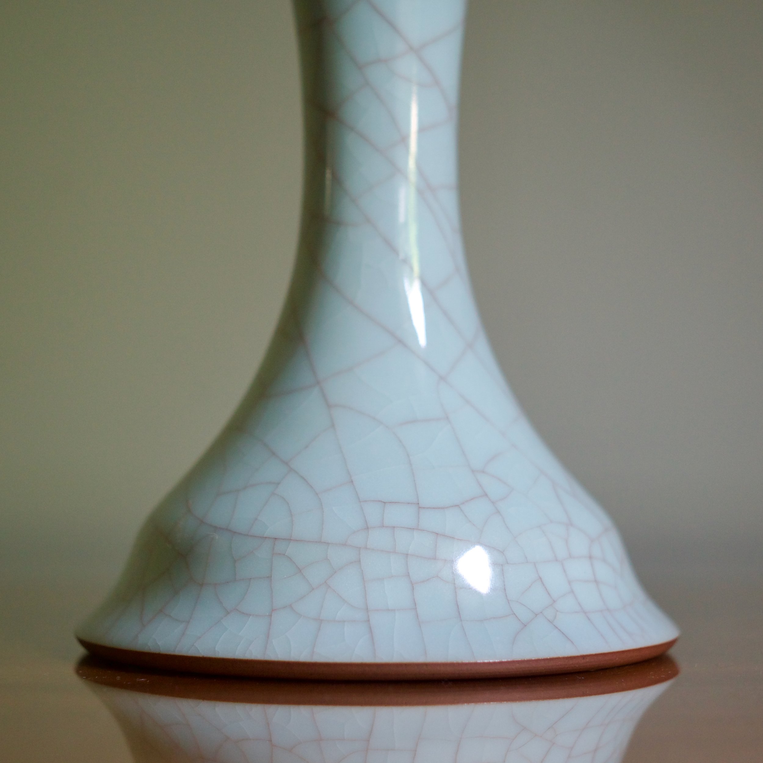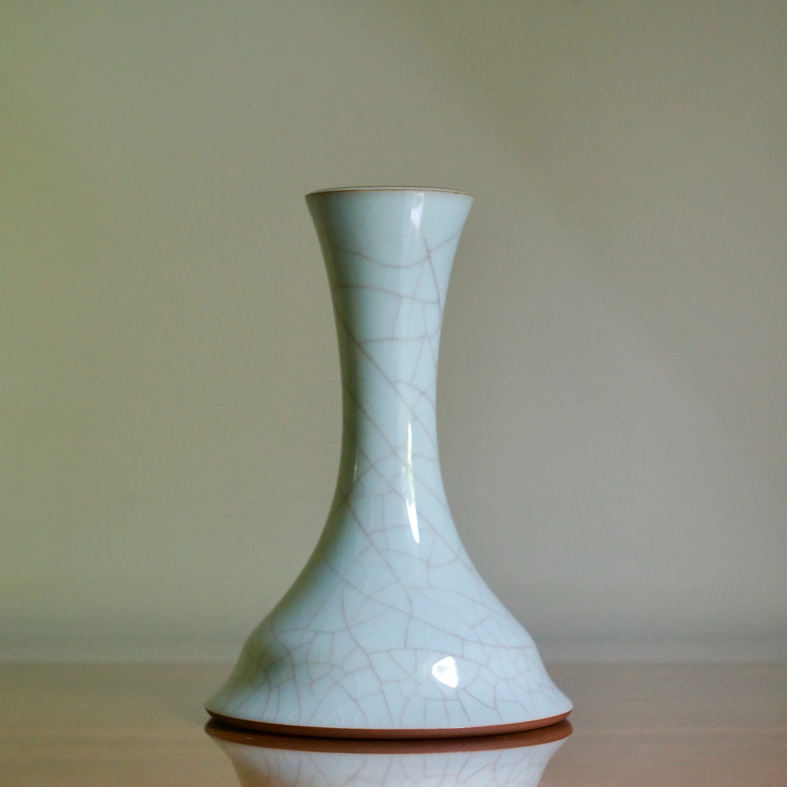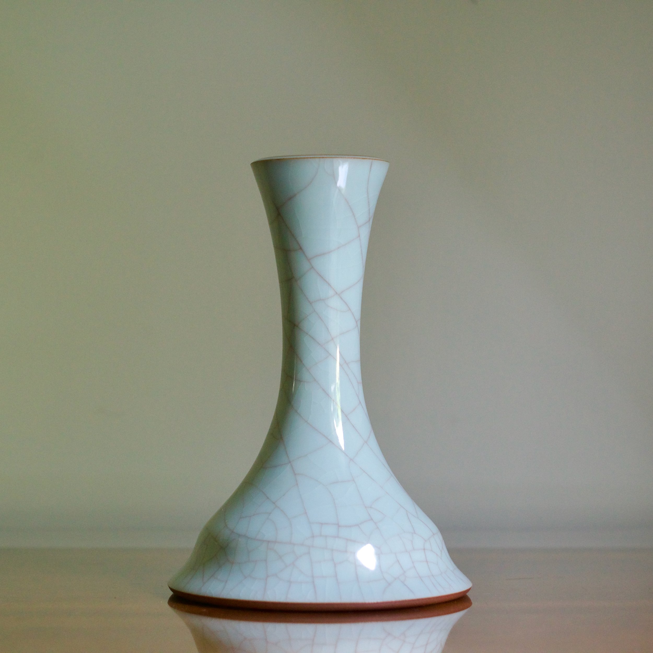 This vase by Masayuki Uraguchi features his classic seiji celadon with prominent mauve-toned crazing. However the shape is unusual. Starting with a wide and flat bottom, the neck emerges directly from the base, flaring out in a wide mouth. The form predicts some of Uraguchi’s more adventurous and experimental later shapes that take a common element and expand the scale - perhaps in this case a vase’s neck.