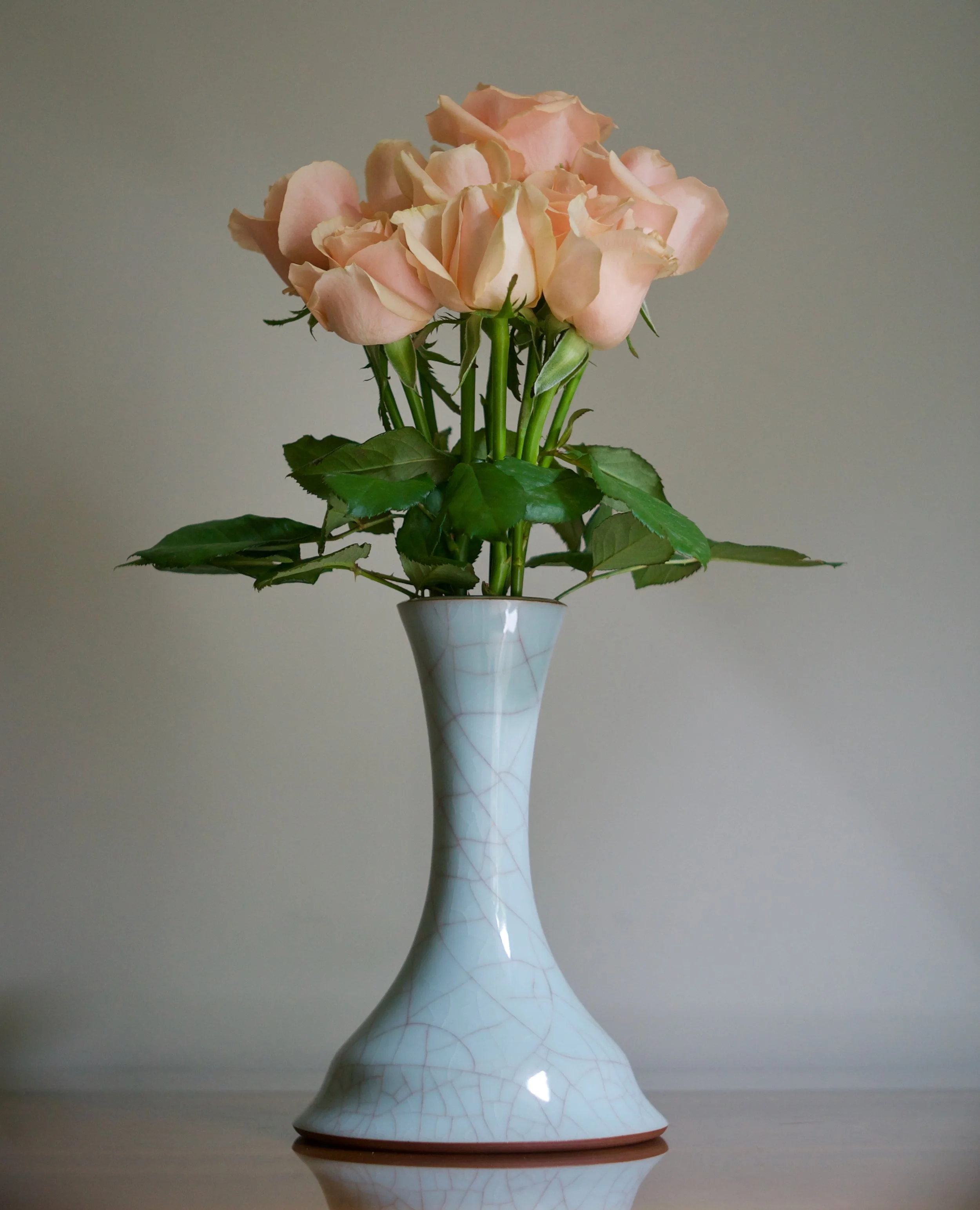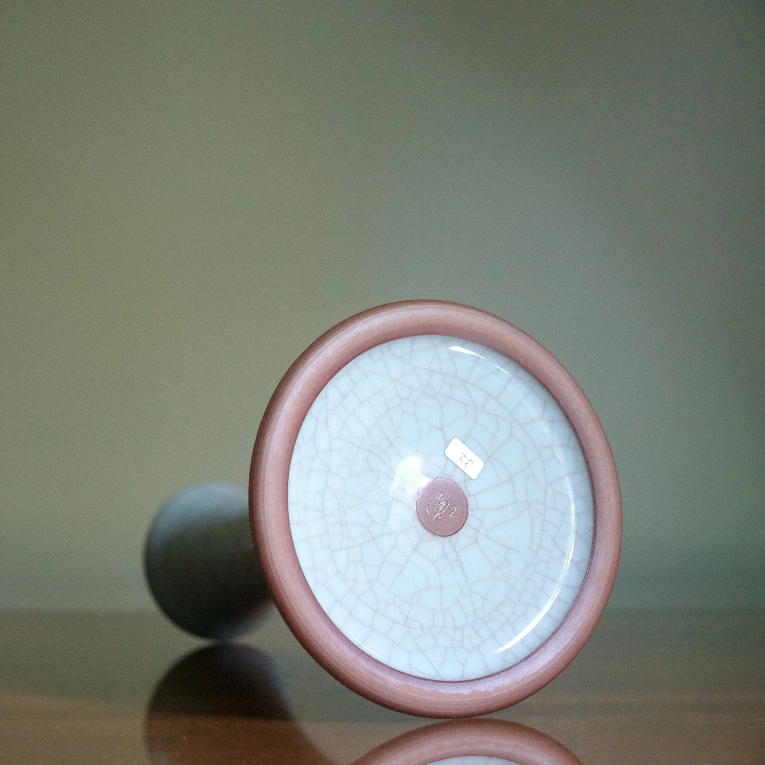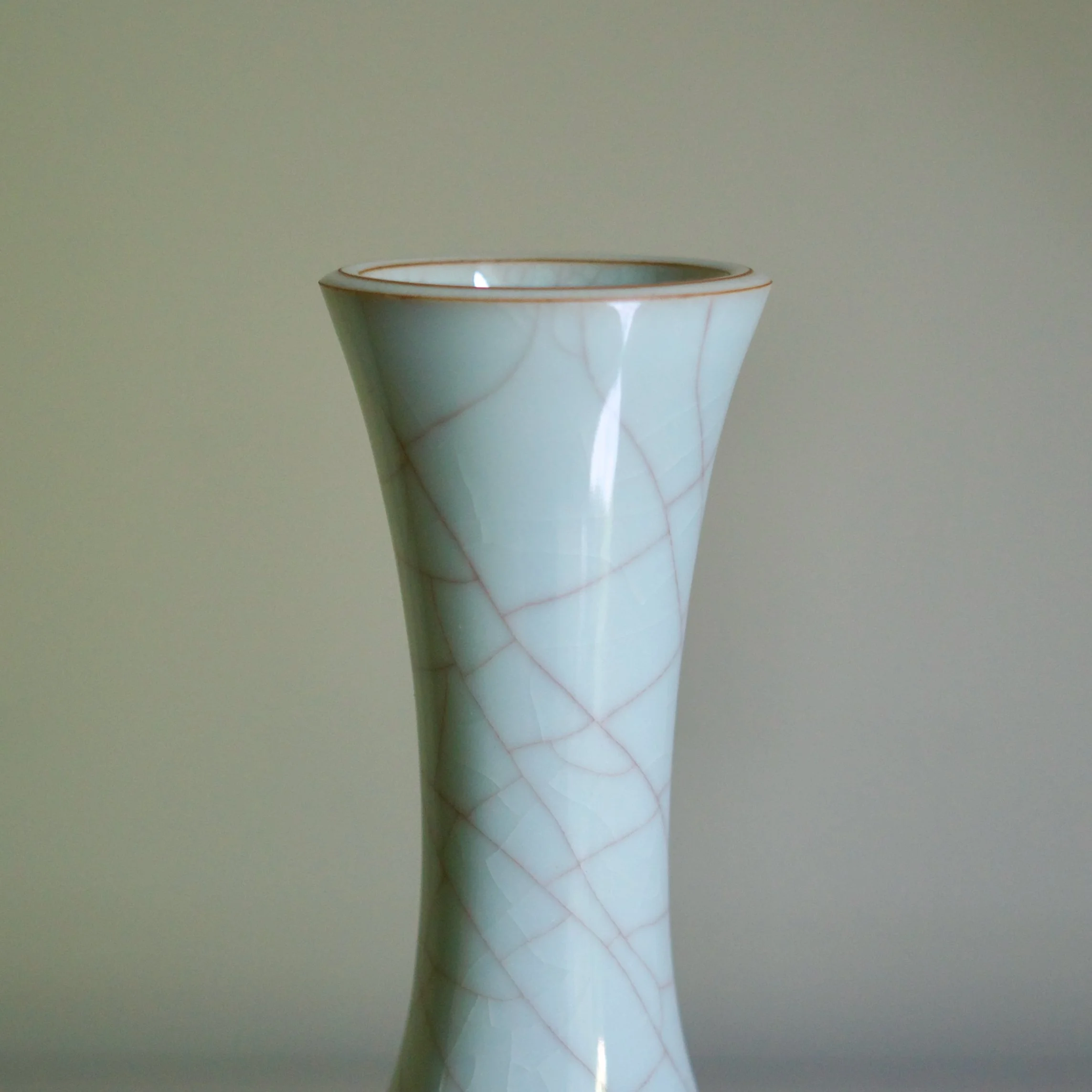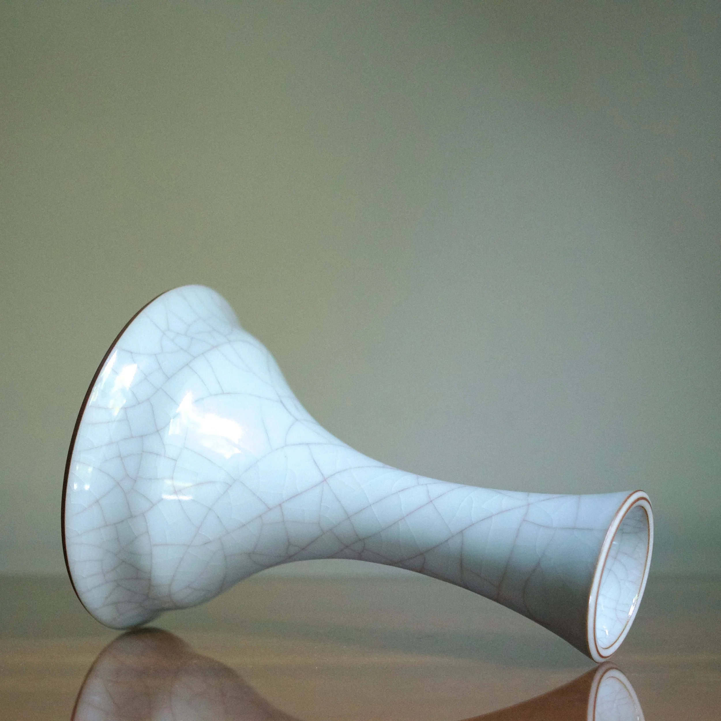 This vase by Masayuki Uraguchi features his classic seiji celadon with prominent mauve-toned crazing. However the shape is unusual. Starting with a wide and flat bottom, the neck emerges directly from the base, flaring out in a wide mouth. The form predicts some of Uraguchi’s more adventurous and experimental later shapes that take a common element and expand the scale - perhaps in this case a vase’s neck.