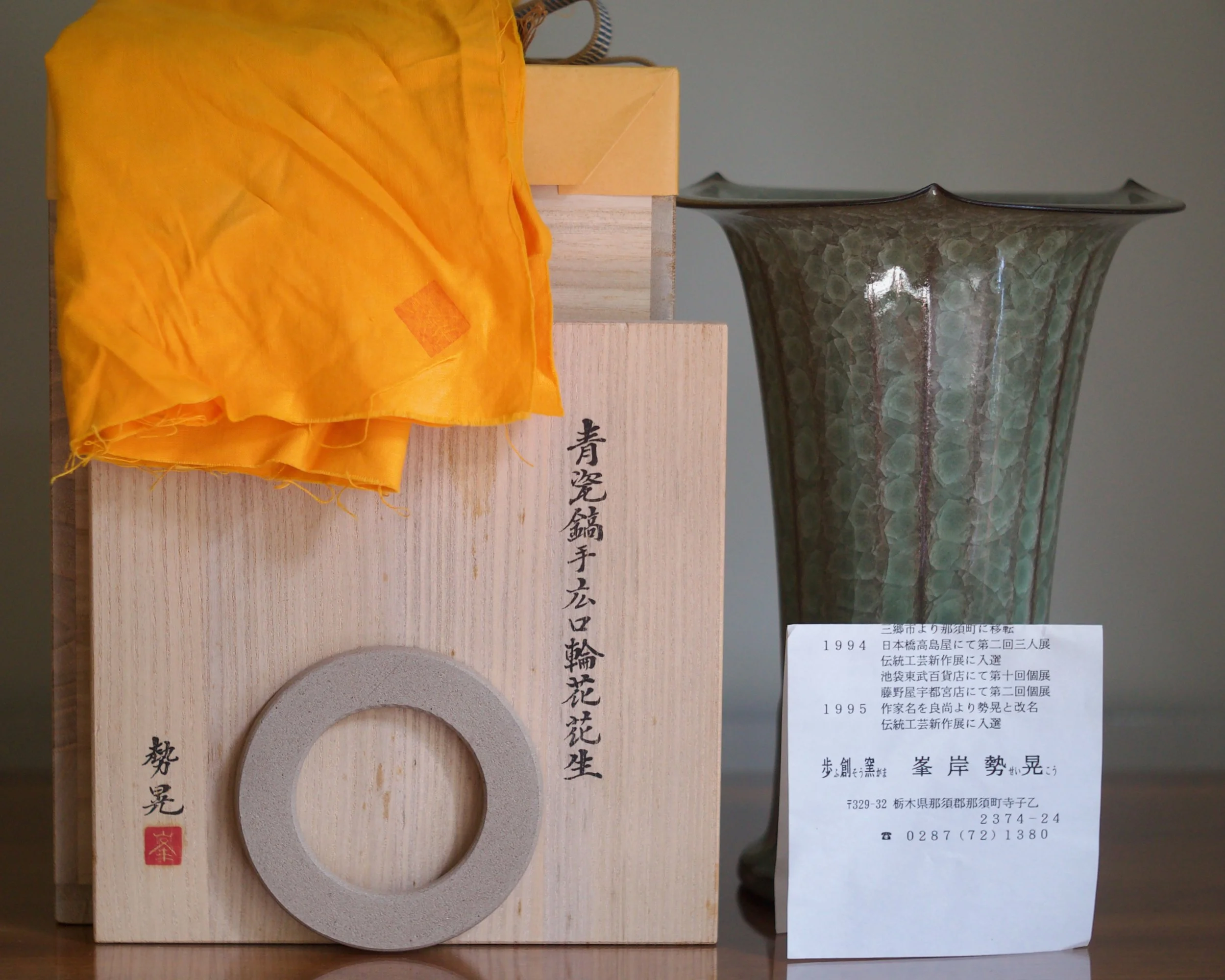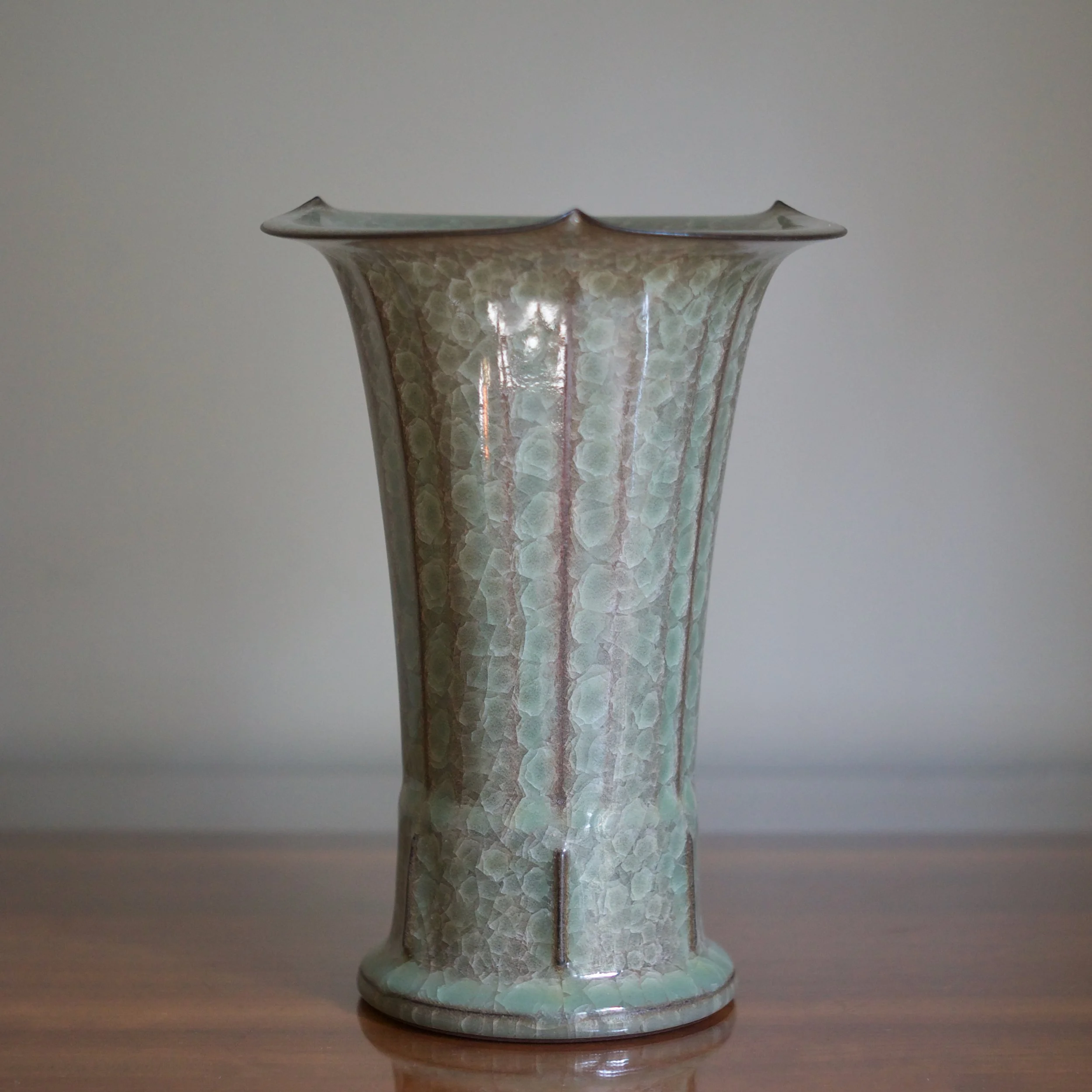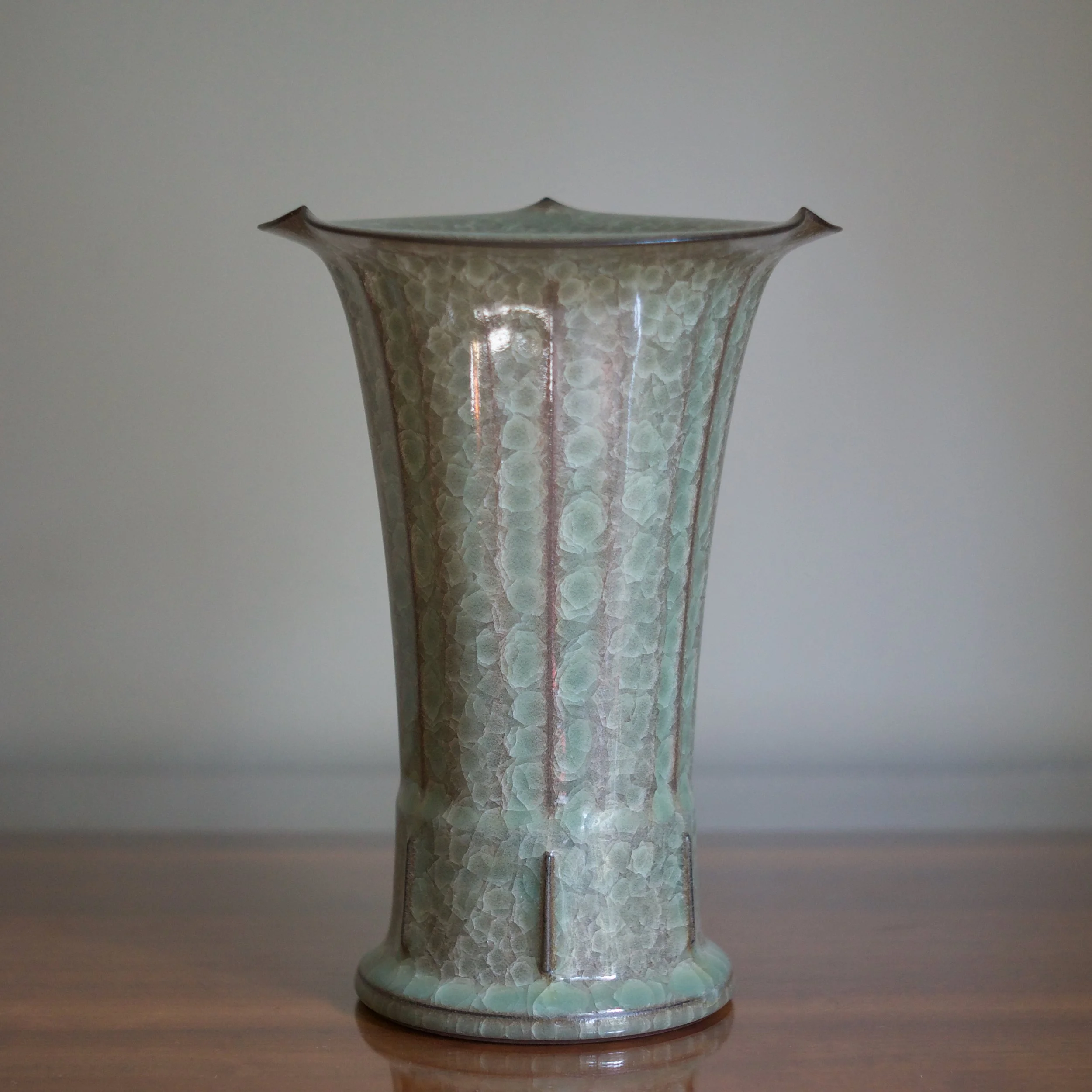 Known for his remarkable celadons, this piece is an example of Minegishi’s classic jade-like green. He fluted the body so that you can see the dark clay body at the top of each ridge. But in between, the glaze is thicker, and the celadon crystallizes in beautiful natural formations, a signature of Minegishi’s.