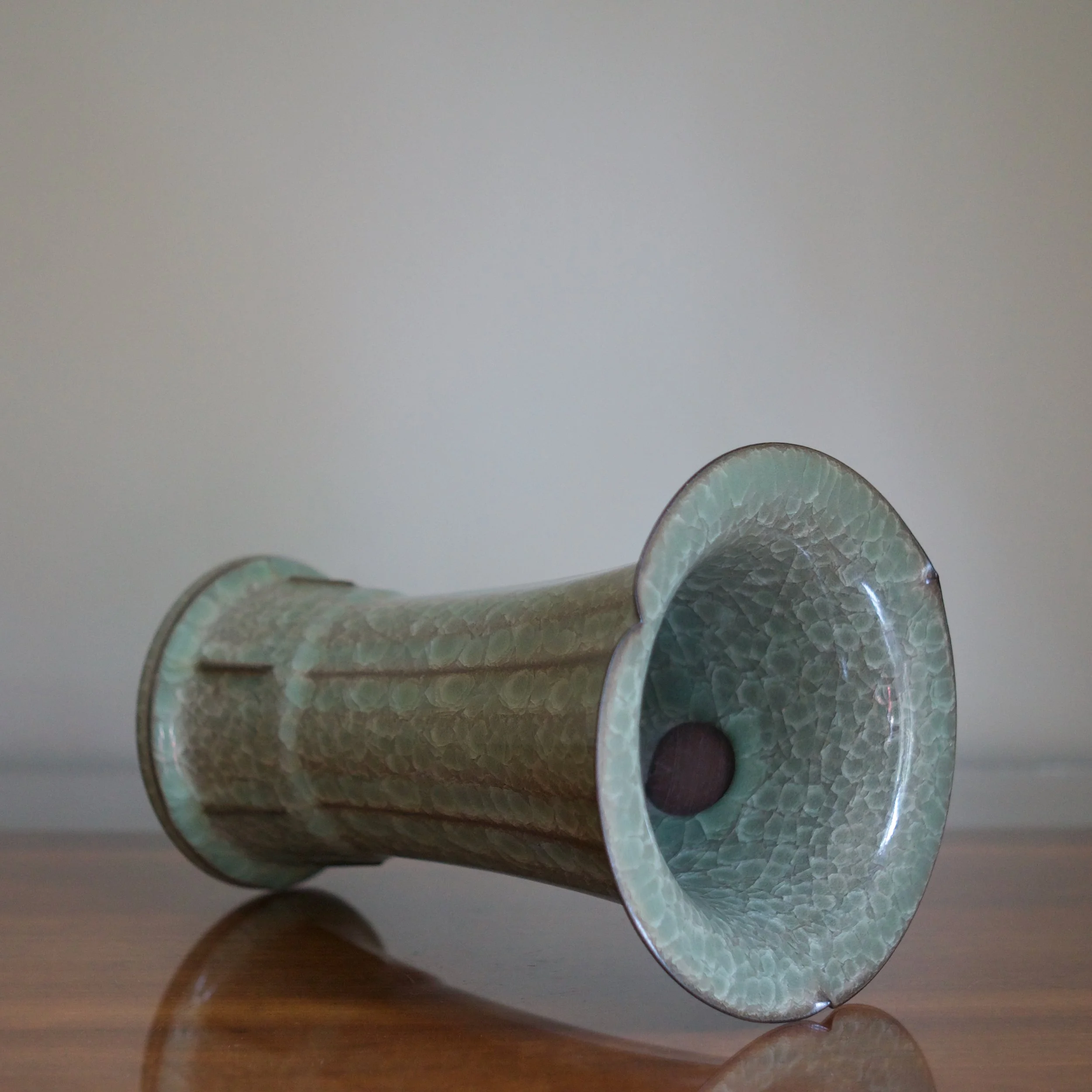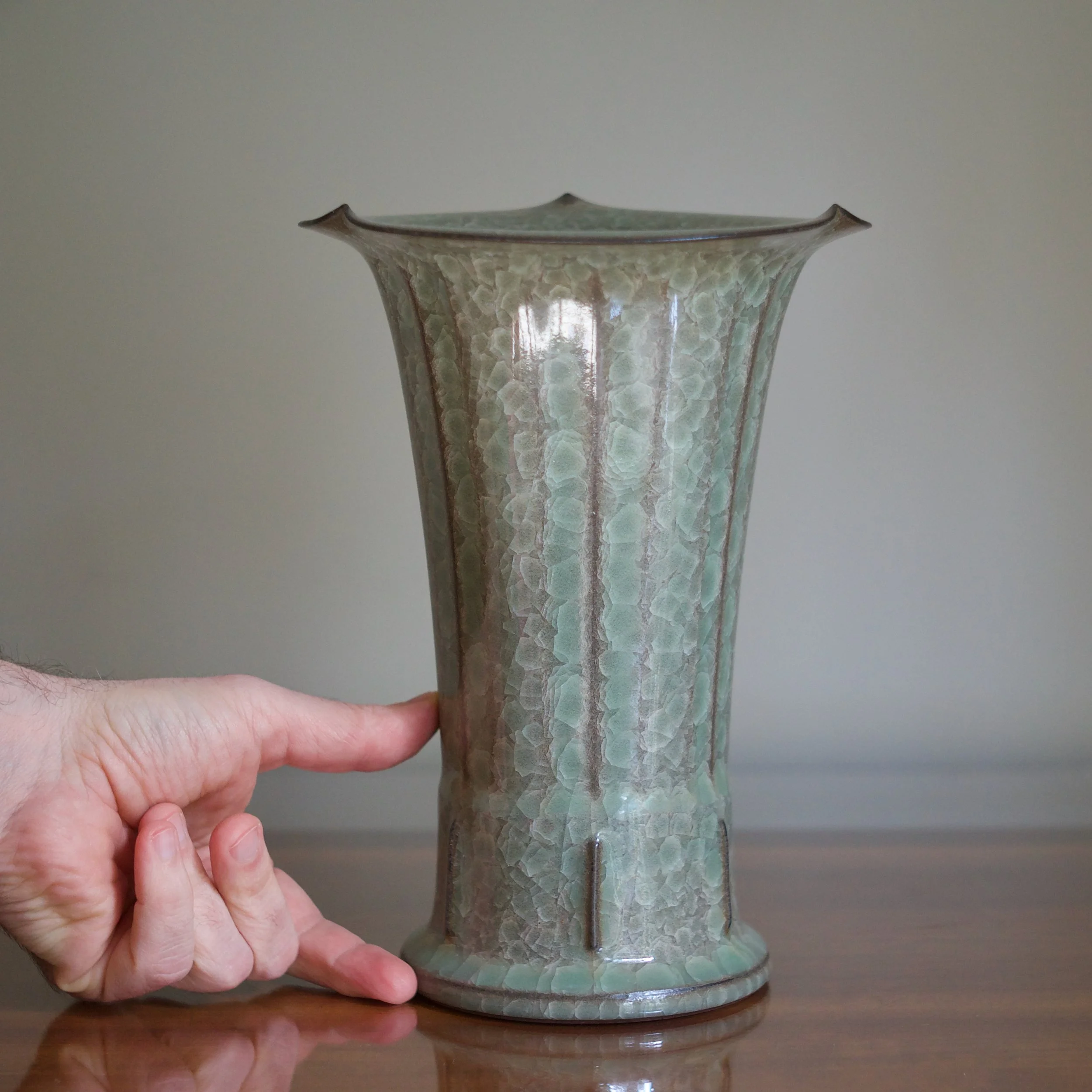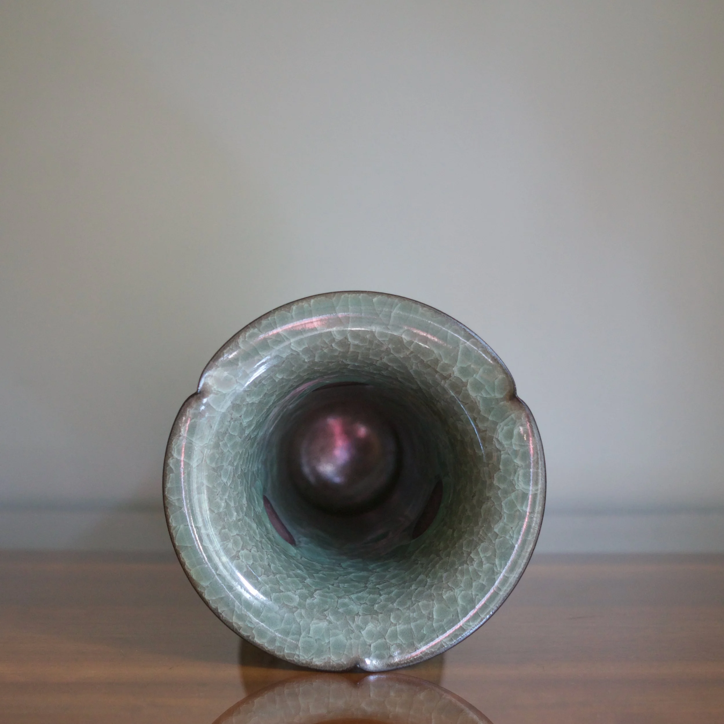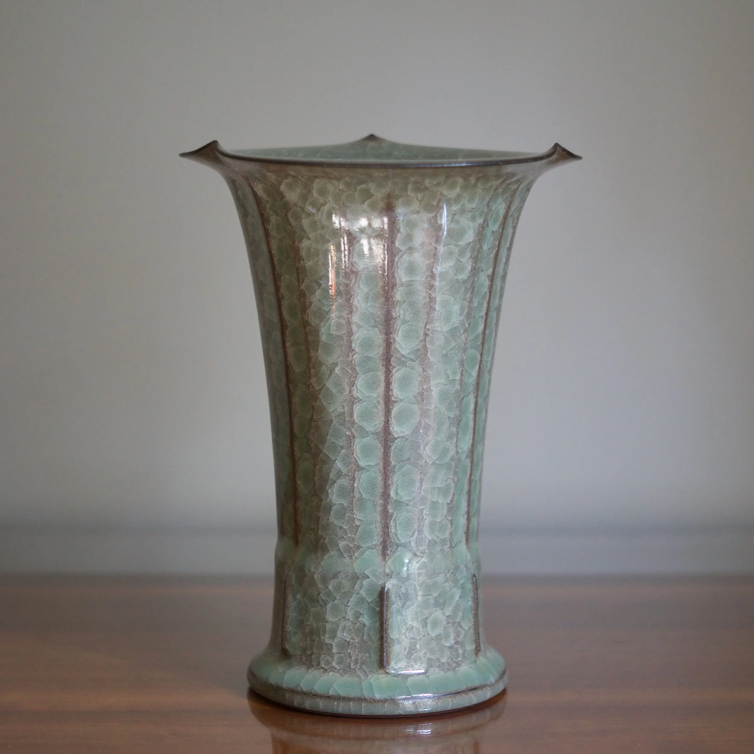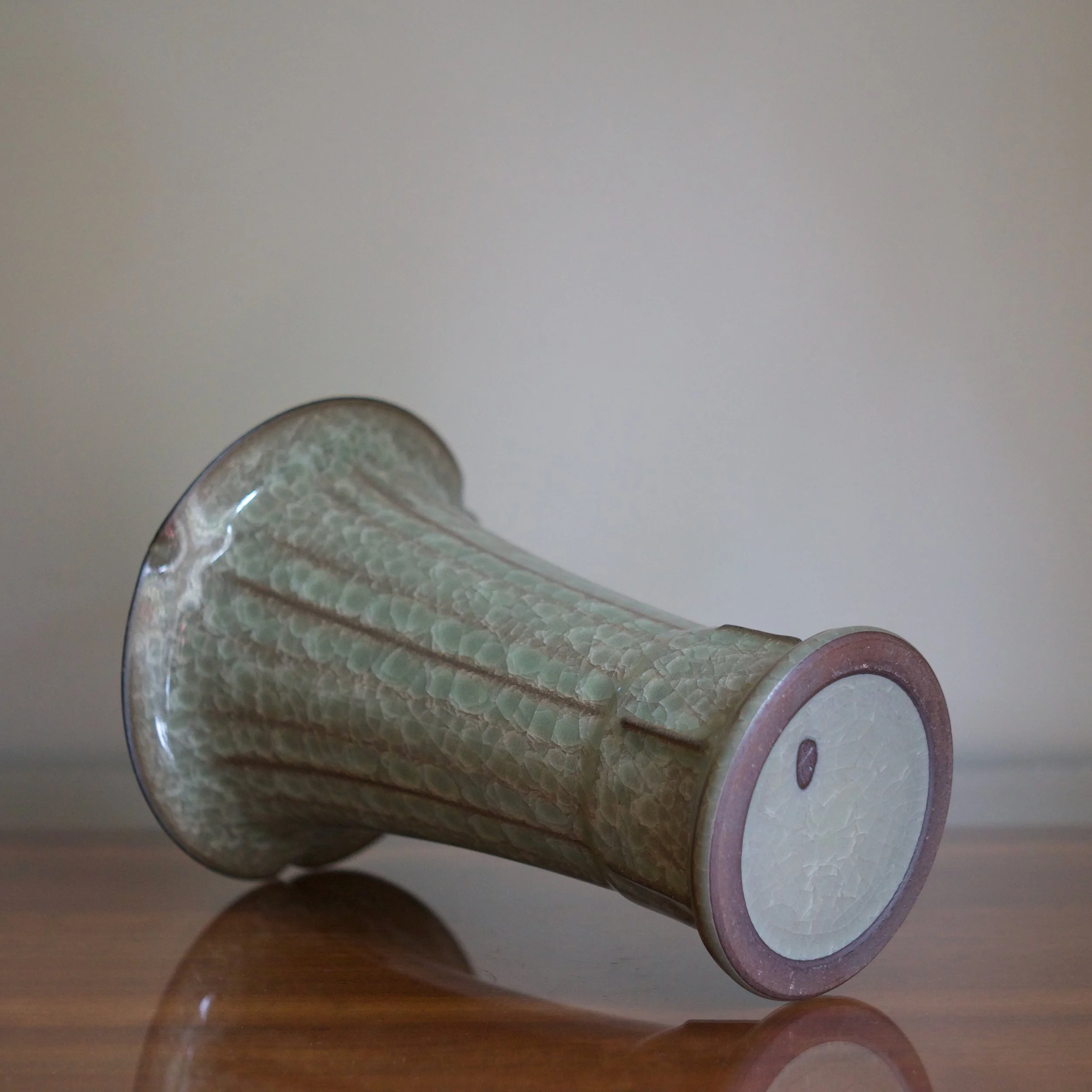 Seiko Minegishi took the shape of this vase from classic Song dynasty Guan wares, which themselves borrowed from archaic Chinese bronze vessels, or gu. The wide foot and pronounced ridges on the lower section give this vase a sense of stability. But the strict lines are relieved by the gentle flaring outwards to a mouth that opens like a flower.