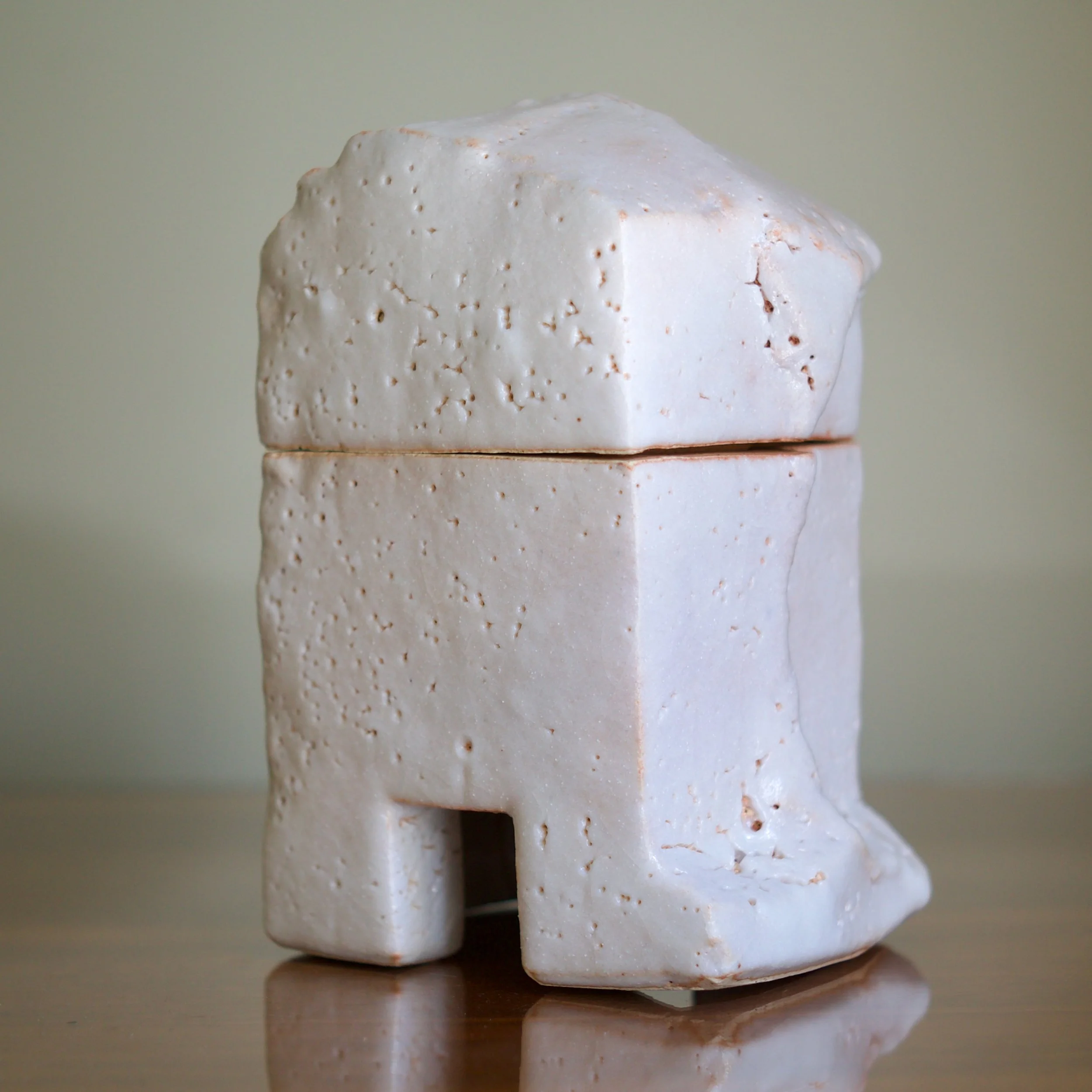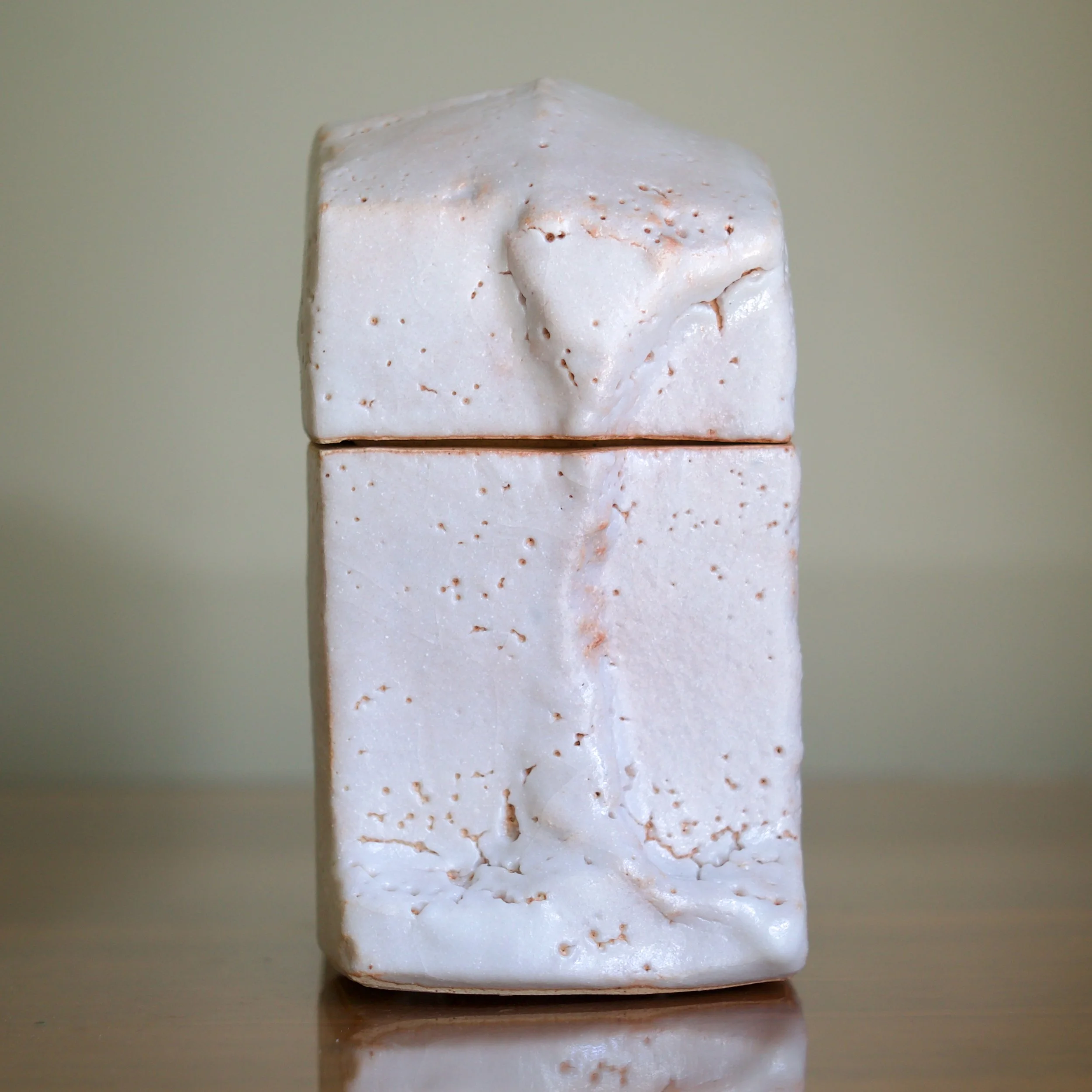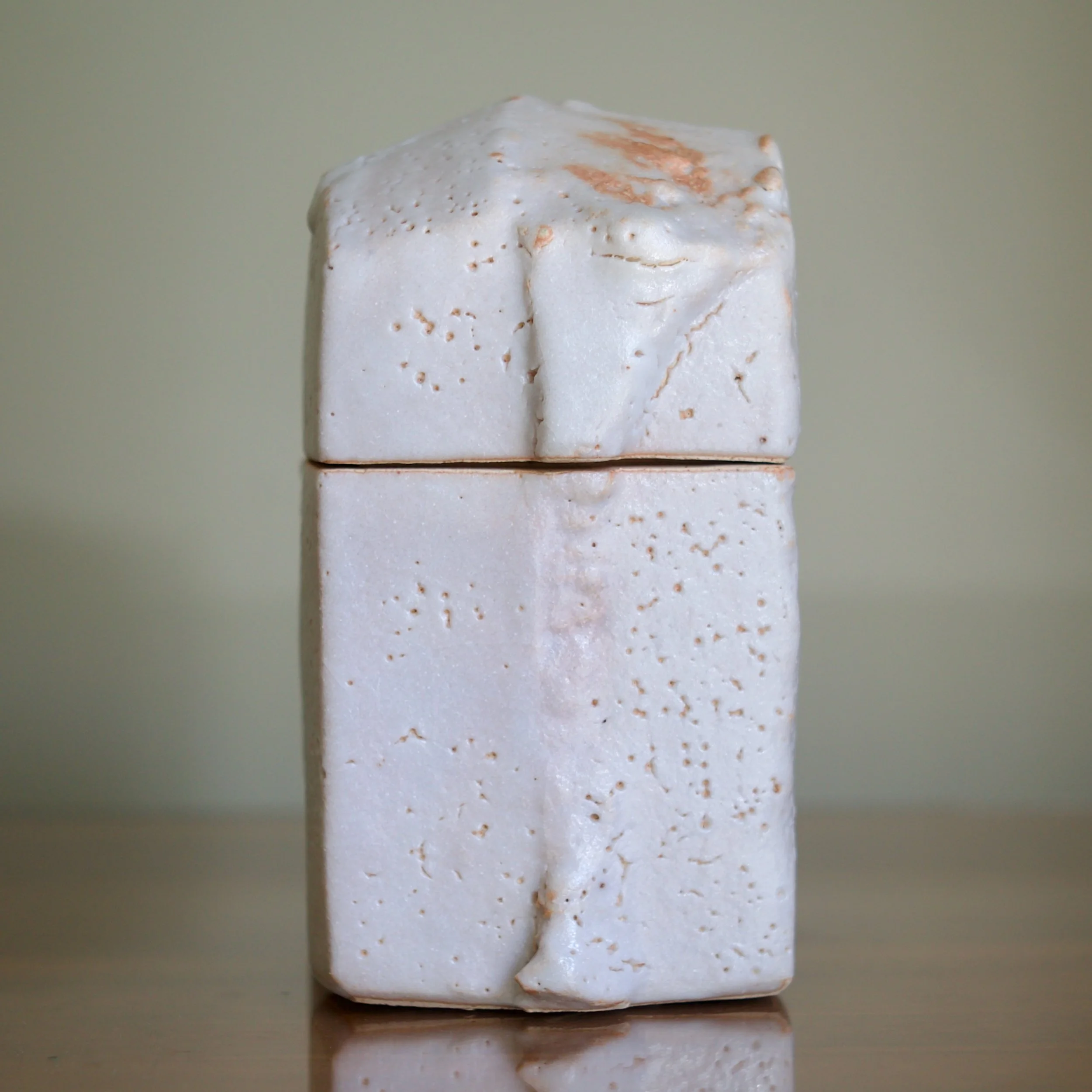Higashida has become known for taking traditional forms and wares and reinterpreting them through his contemporary practice. This large Shino box is a nod to archaic vessels such as the bronze containers of the Zhou Dynasty which adopt the shapes of animals. This box’s rounded top and footed legs updates the form: it is abstracted into a squared - almost cubist - shape, like a creature caught in the act of transition.