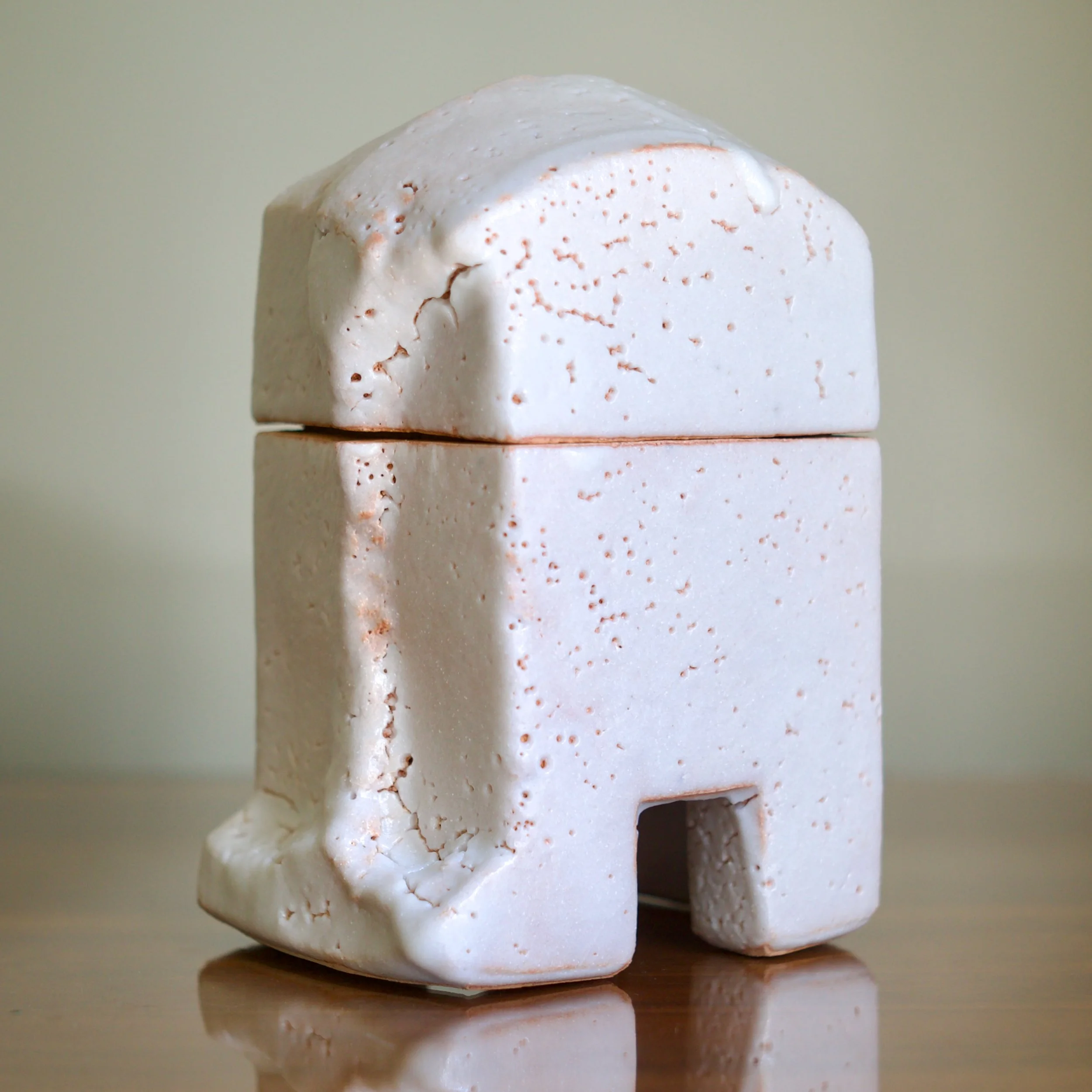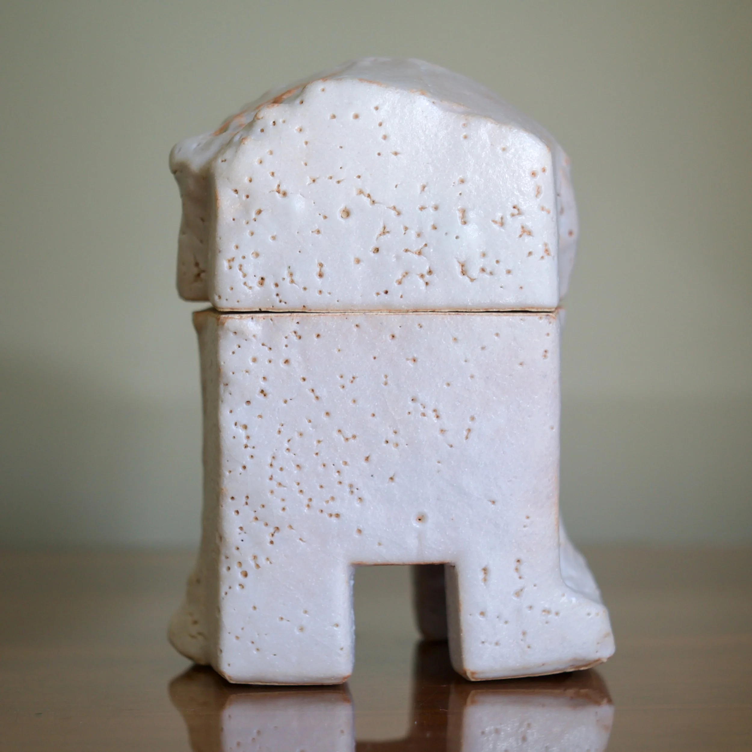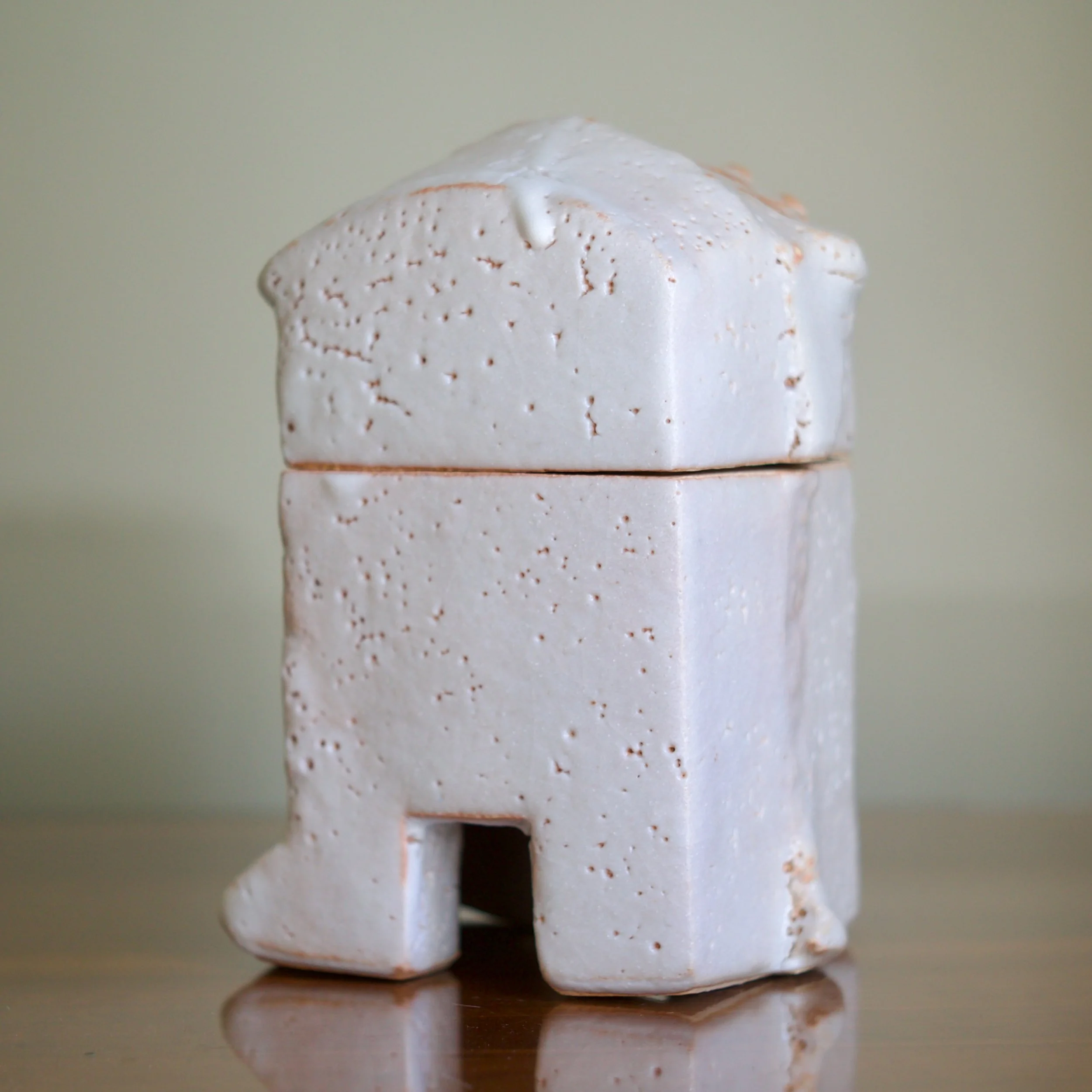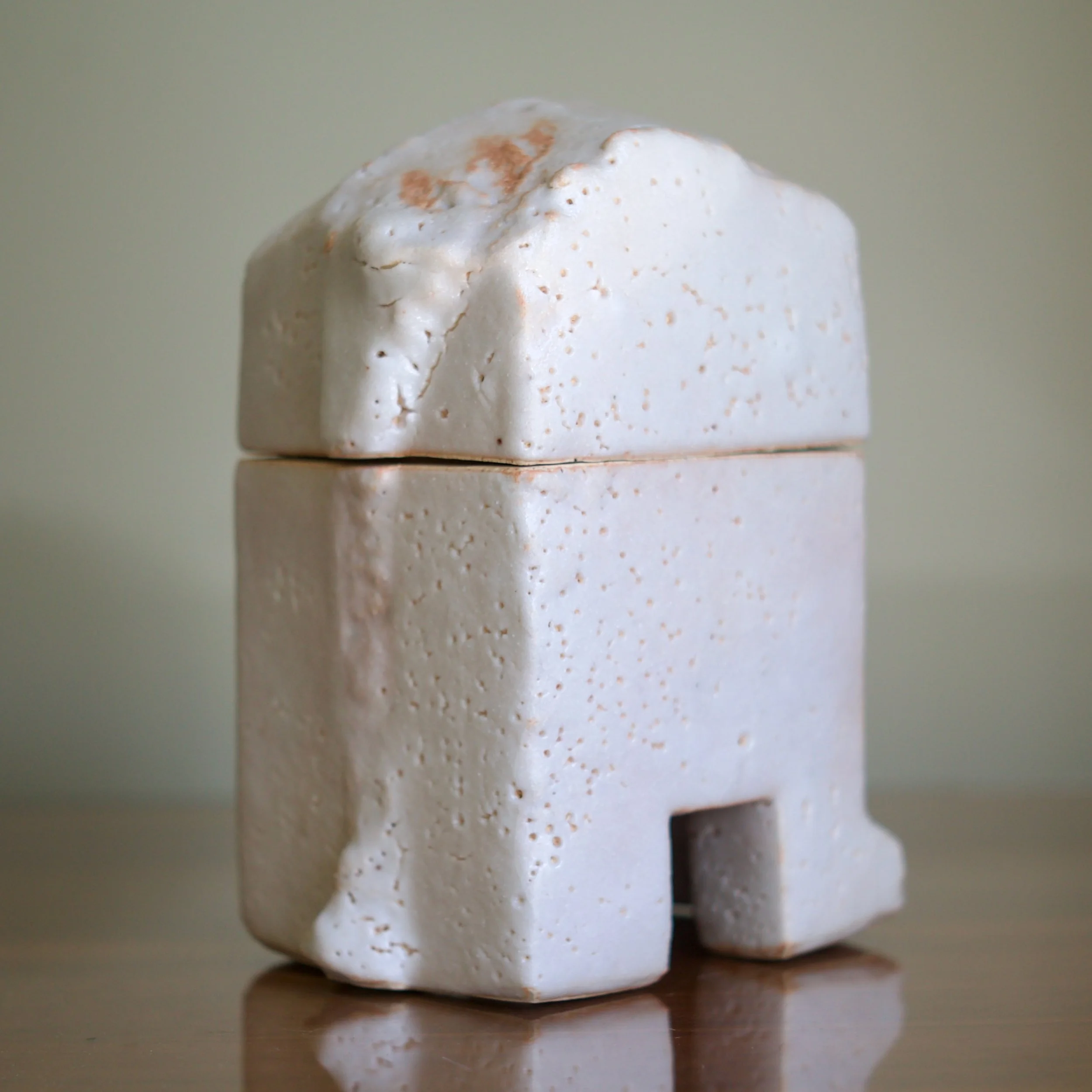 Higashida has become known for taking traditional forms and wares and reinterpreting them through his contemporary practice. This large Shino box is a nod to archaic vessels such as the bronze containers of the Zhou Dynasty which adopt the shapes of animals. This box’s rounded top and footed legs updates the form: it is abstracted into a squared - almost cubist - shape, like a creature caught in the act of transition.