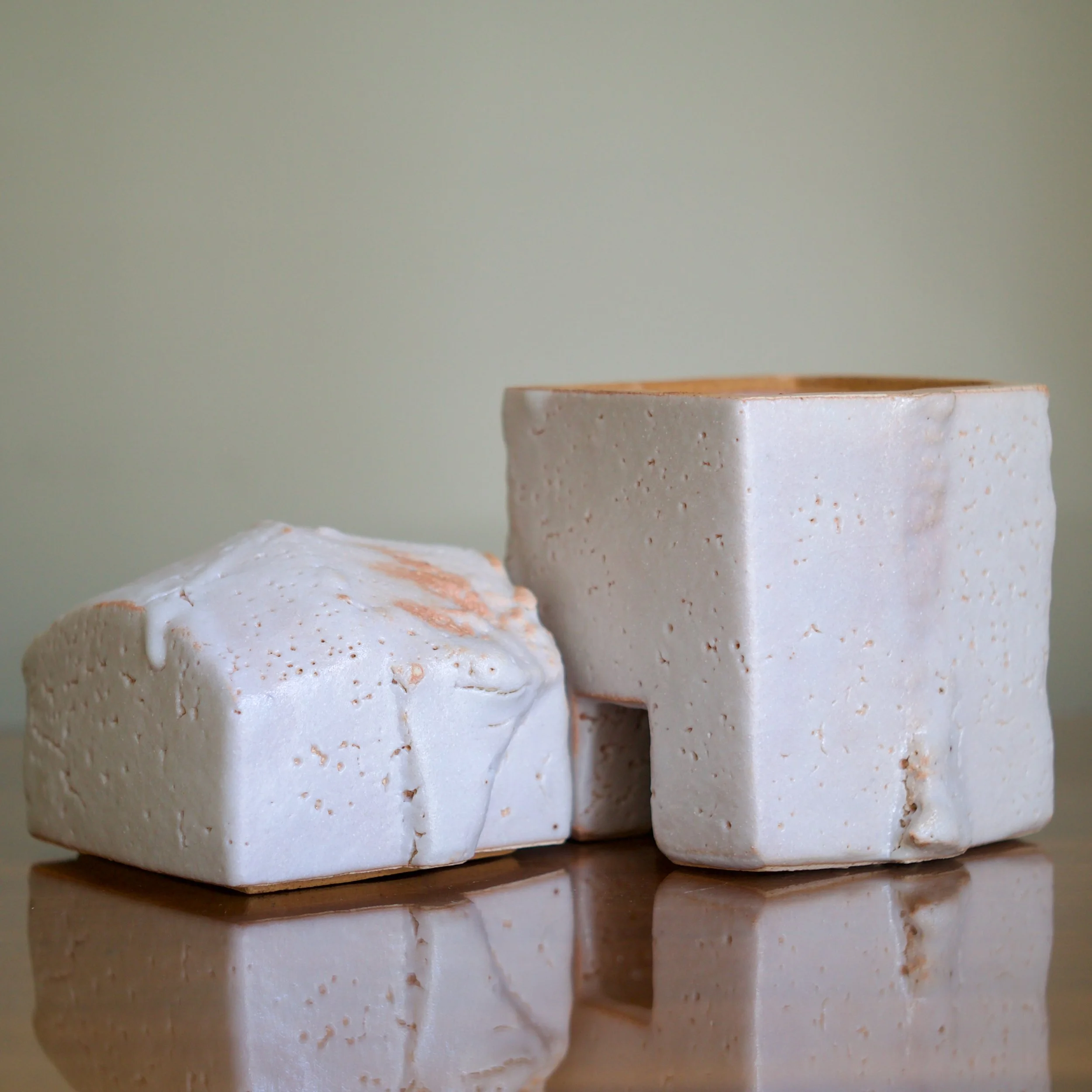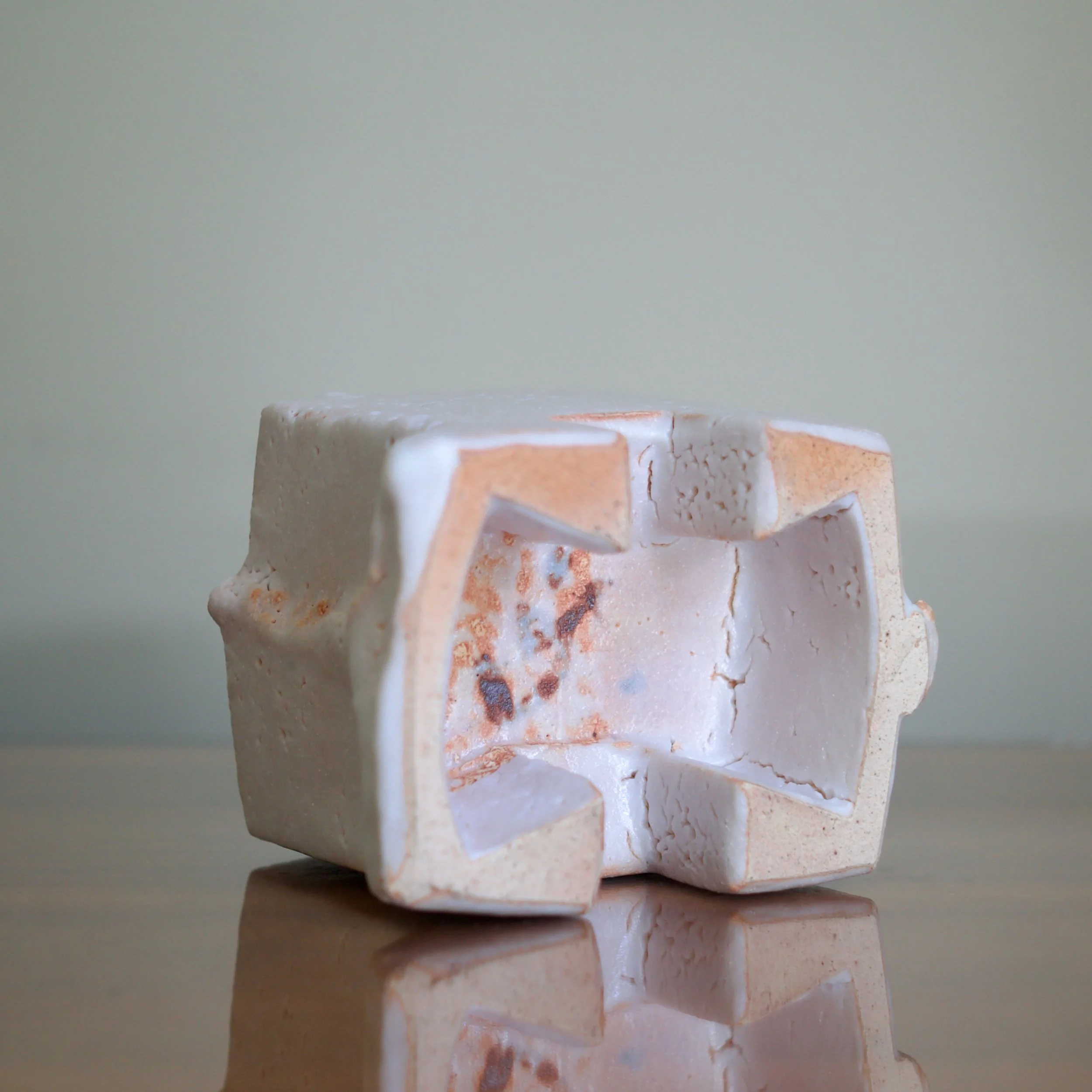 And the mystery is deepened further with a soft, creamy-pink glaze. The signature cloud-like texture of Shino softens the box’s angles resulting in a ghostly appearance. Higashida evokes historic wares, from ancient forms to 16th century Mino ware and its 20th century revival, and recombines them through his 21st century practice.