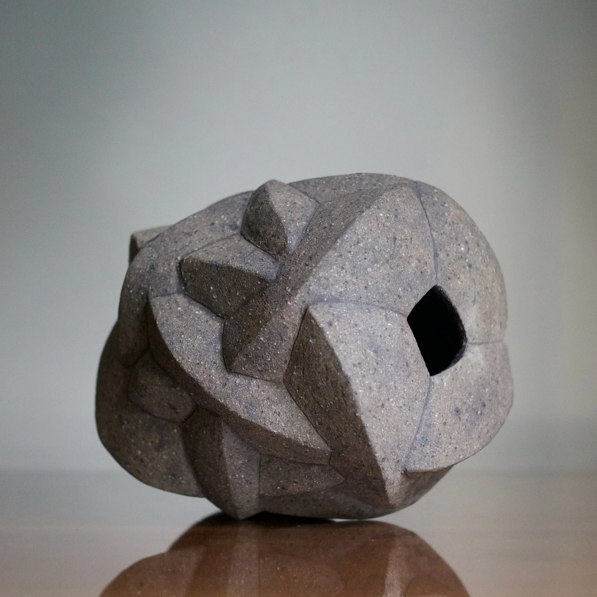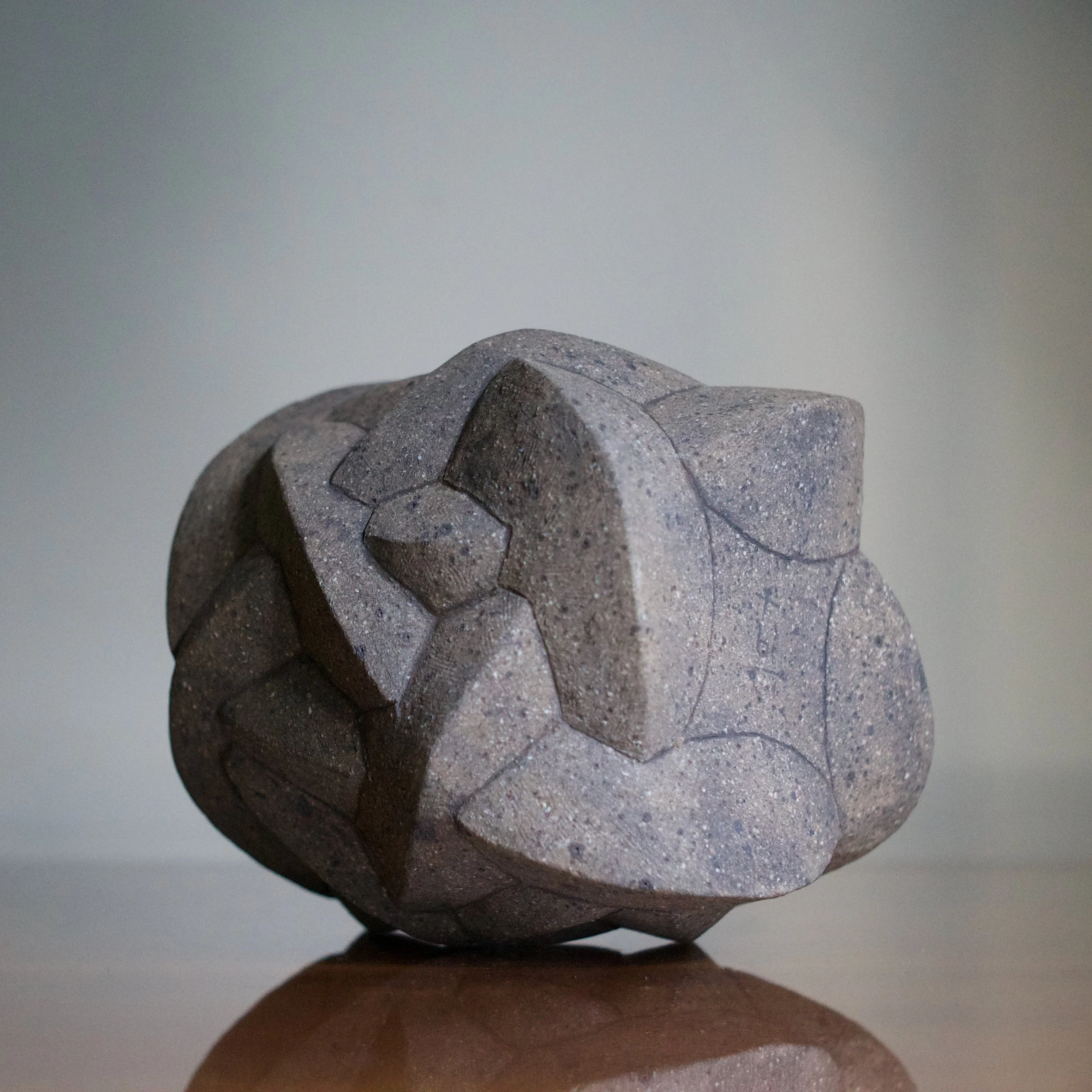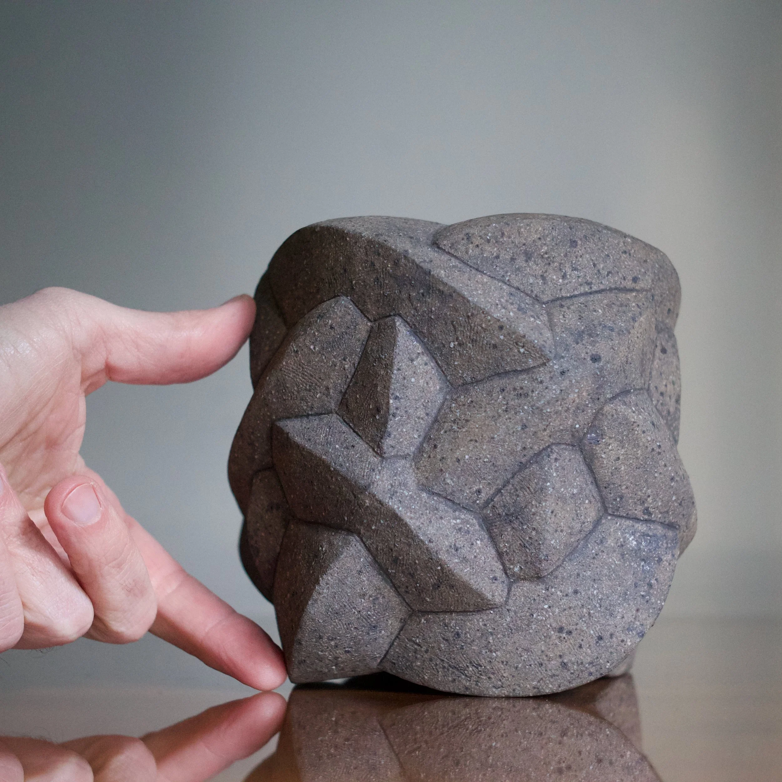 Tiny black and white inclusions - perhaps iron and feldspar - speckle the warm brown-grey clay, giving the surface a truly stone-like appearance. Takeuchi coil-forms his pots, then carves them into shape, allowing a complex geometry to weave and knot the surface.
