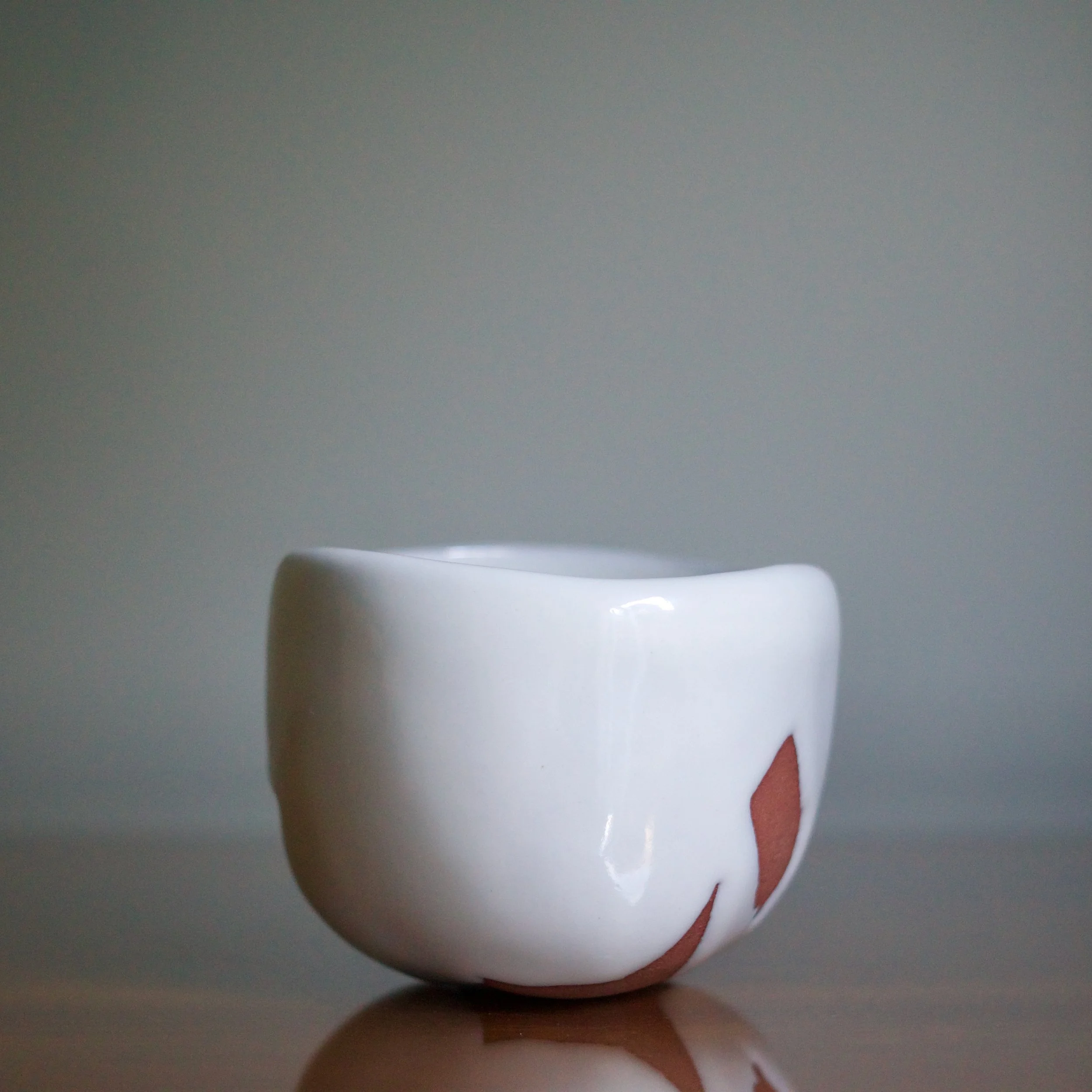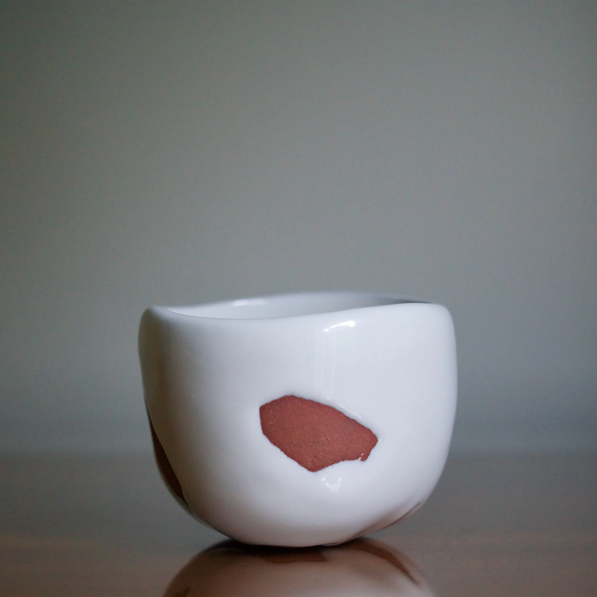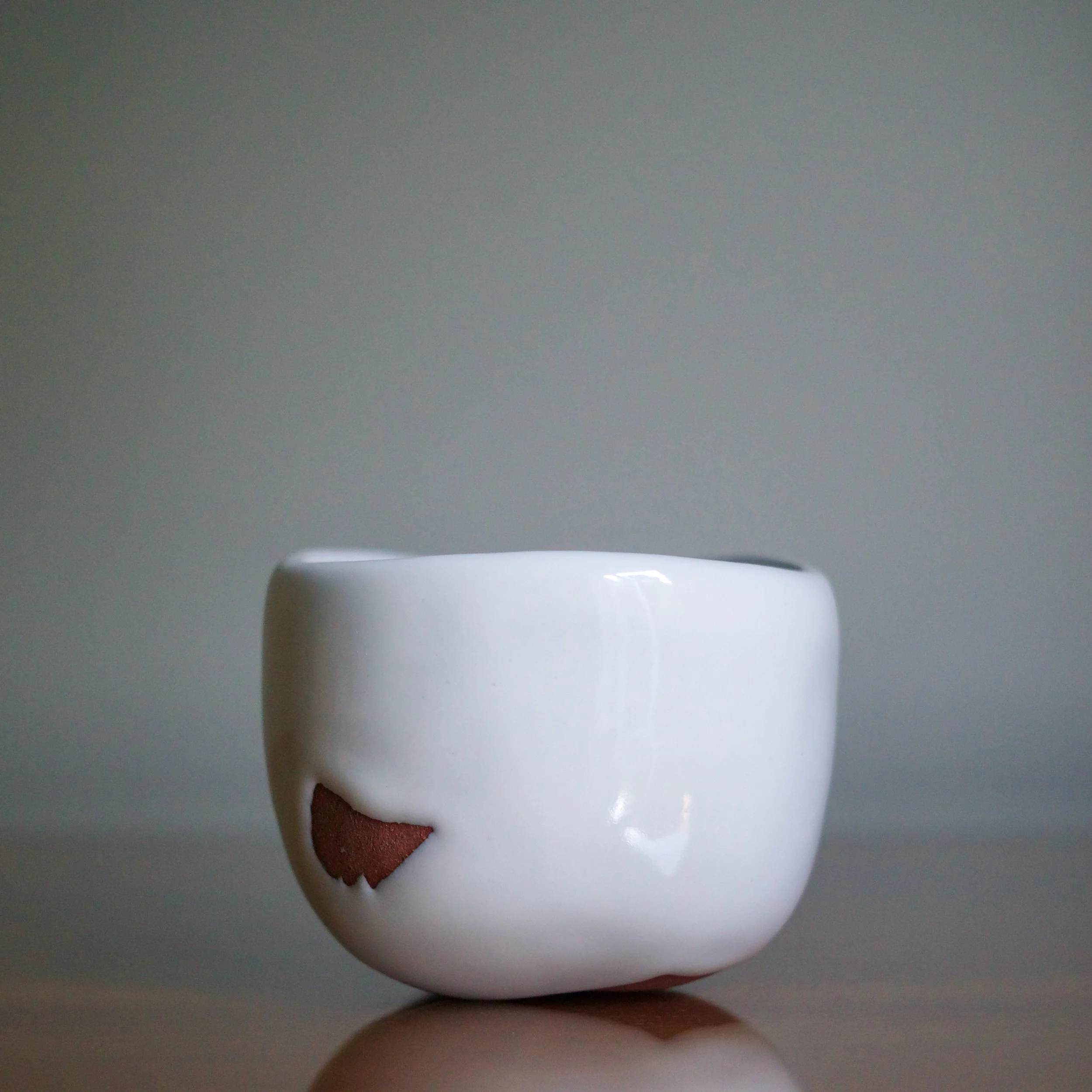 Organic and natural, this chawan fits perfectly in the hand. Without a foot, it sits on the three lobes that form its bottom. The rim undulates in gentle swells like water or rolling hills. And the warm clay body contrasts with the purest white Fukushima feldspar. It is like a seedpod or husk, fallen to the ground, covered in snow, waiting for spring.