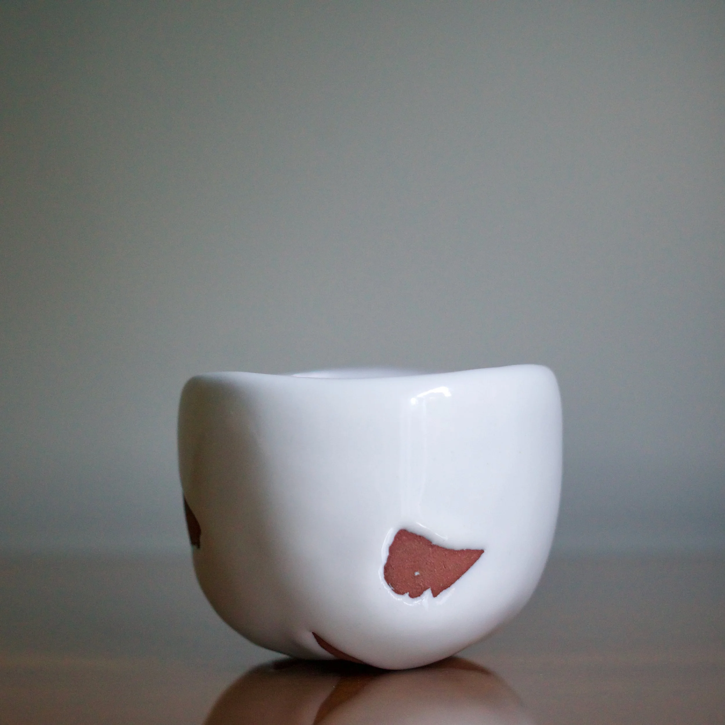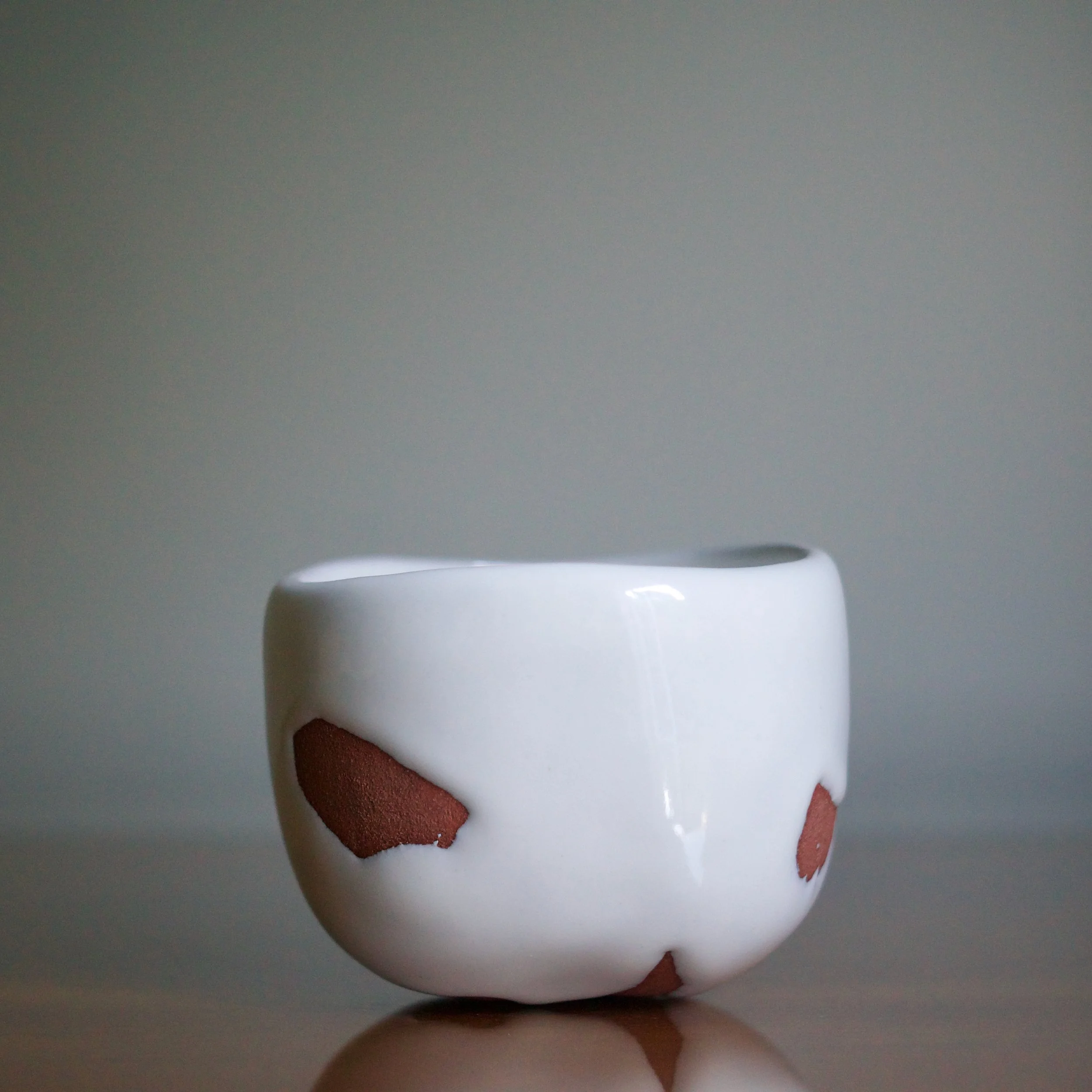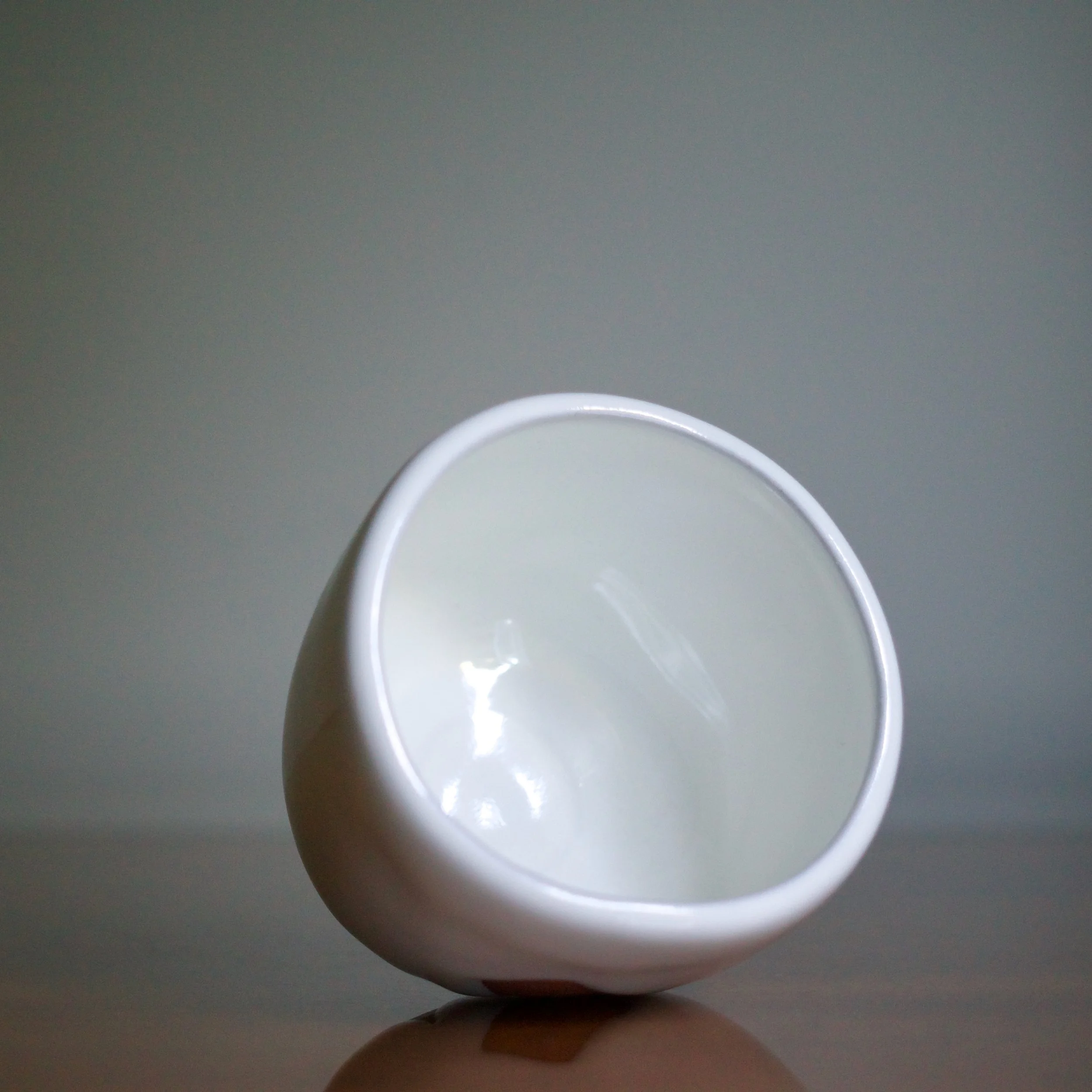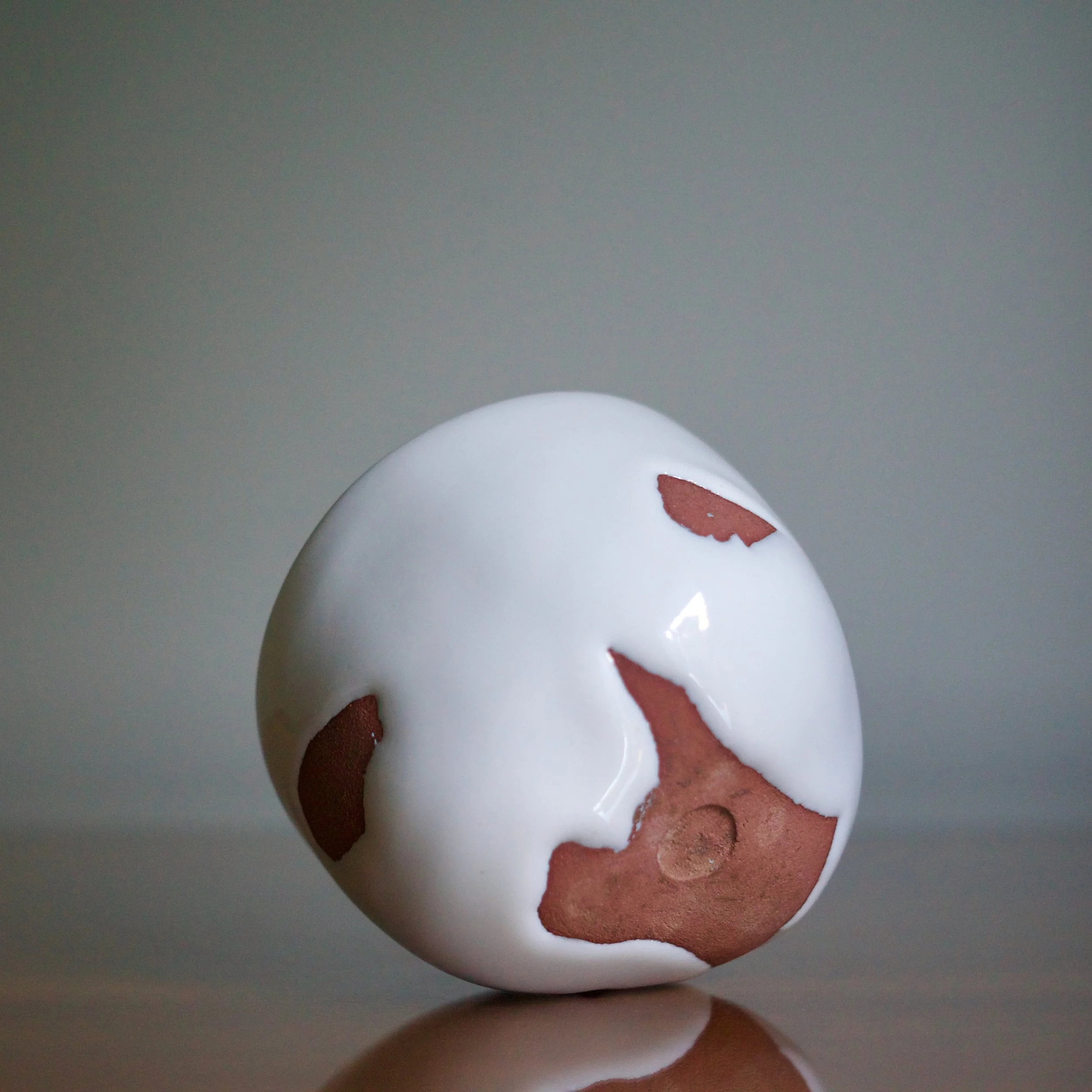 Organic and natural, this chawan fits perfectly in the hand. Without a foot, it sits on the three lobes that form its bottom. The rim undulates in gentle swells like water or rolling hills. And the warm clay body contrasts with the purest white Fukushima feldspar. It is like a seedpod or husk, fallen to the ground, covered in snow, waiting for spring.