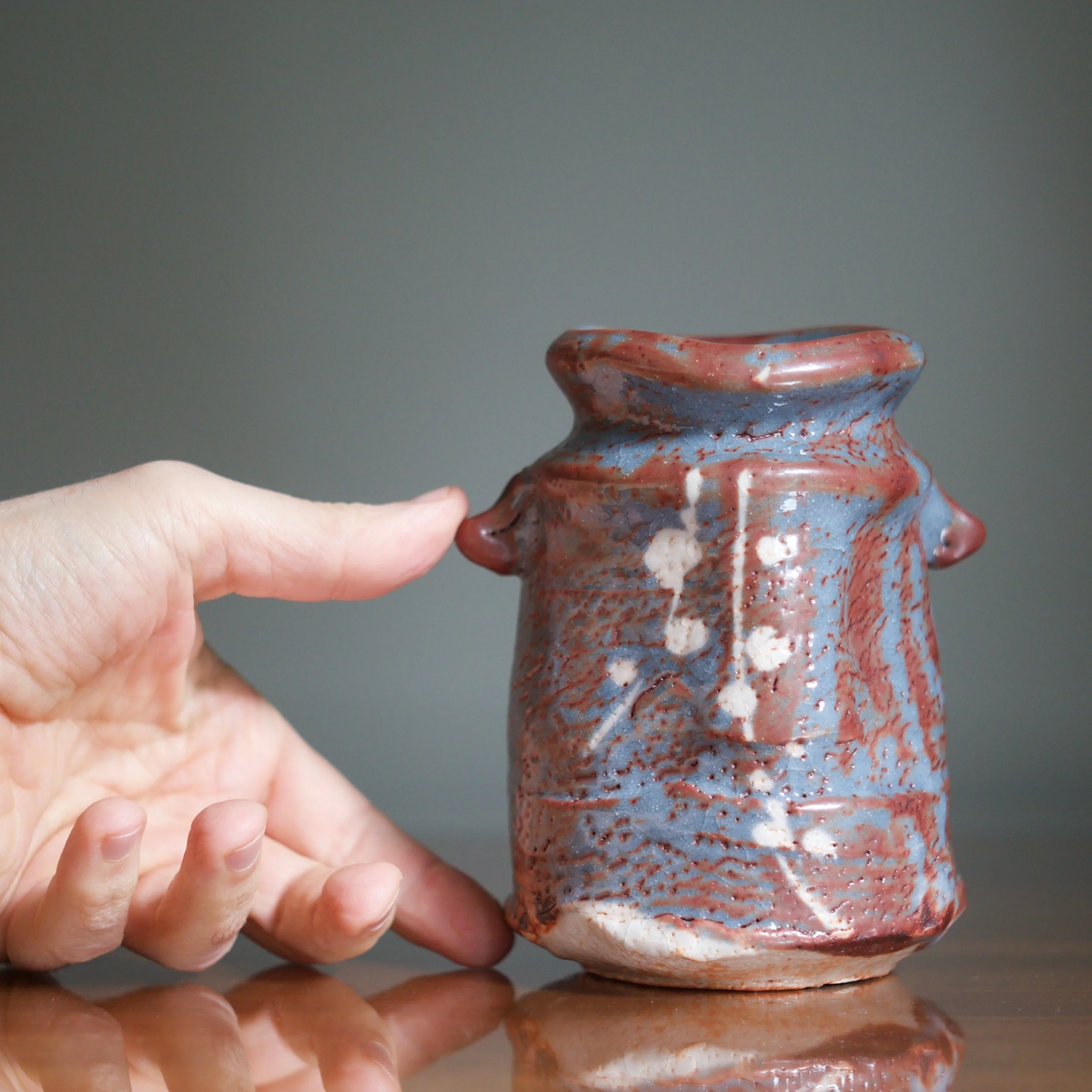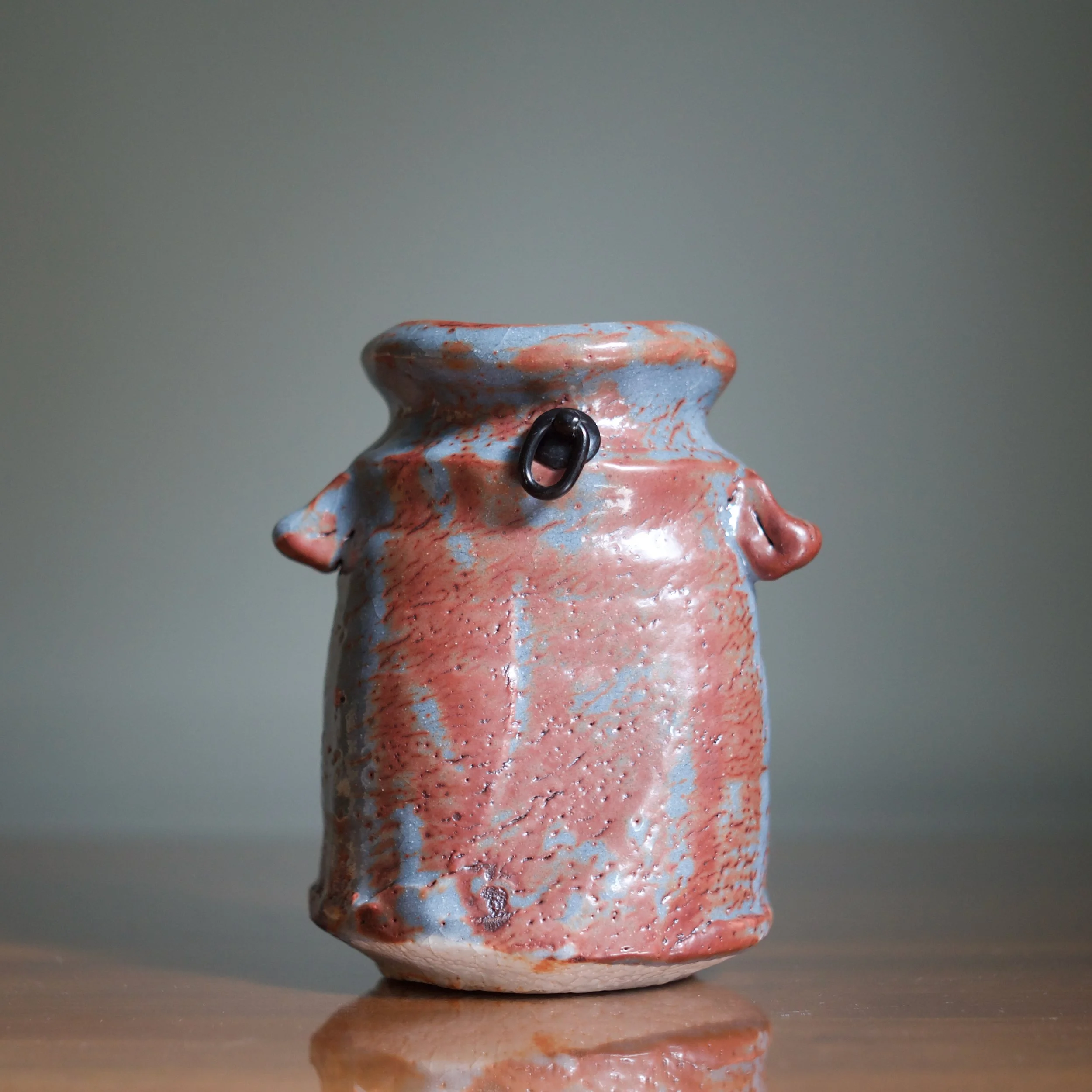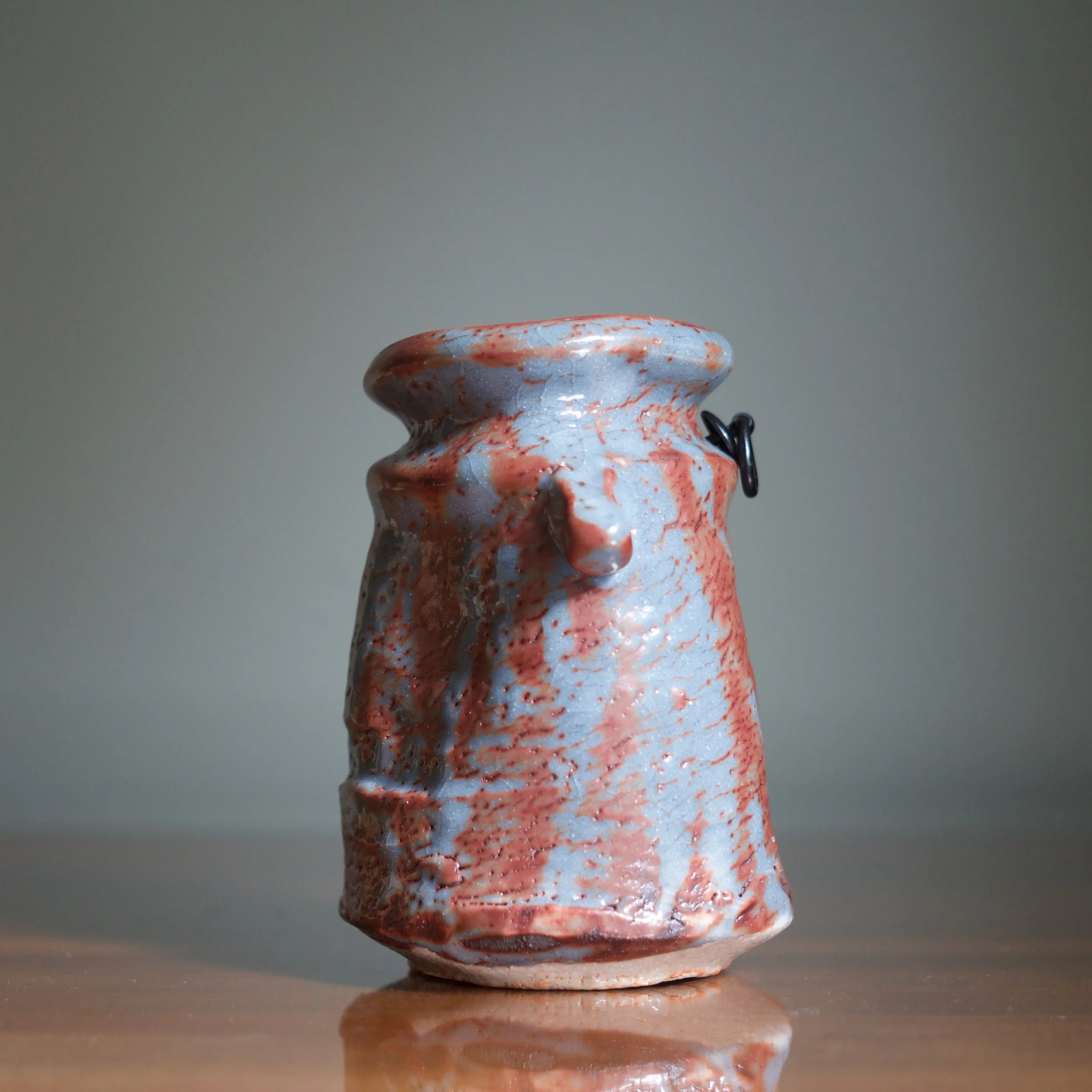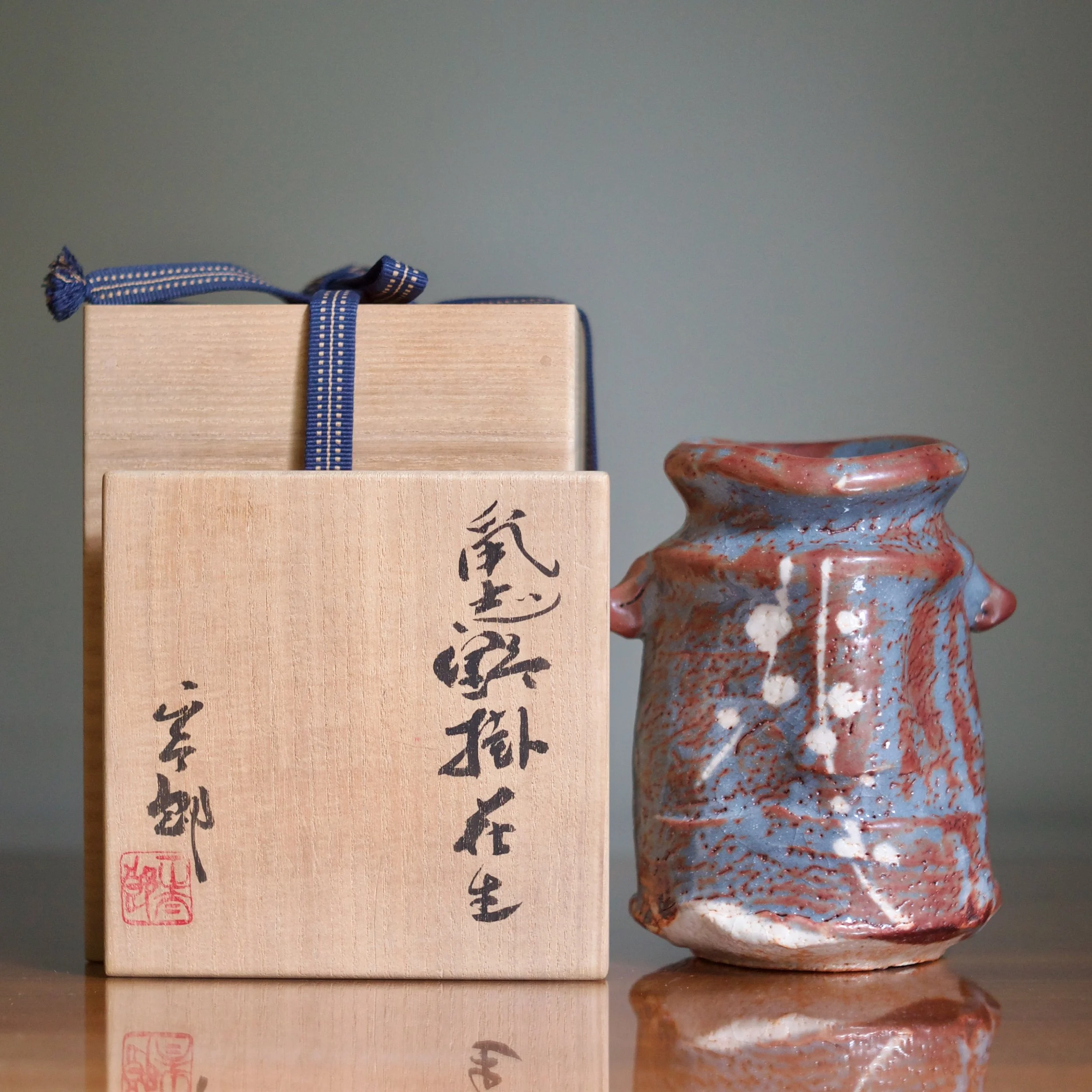 This hanging vase by Shotaro Hayashi was thrown and then altered with a squeezed body and wavering lip - distinctively rugged and organic, like so much of the best Mino ware. The addition of two triangular ears - or lugs - gives the shape an anthropomorphic touch, as though it were giving a shrug.