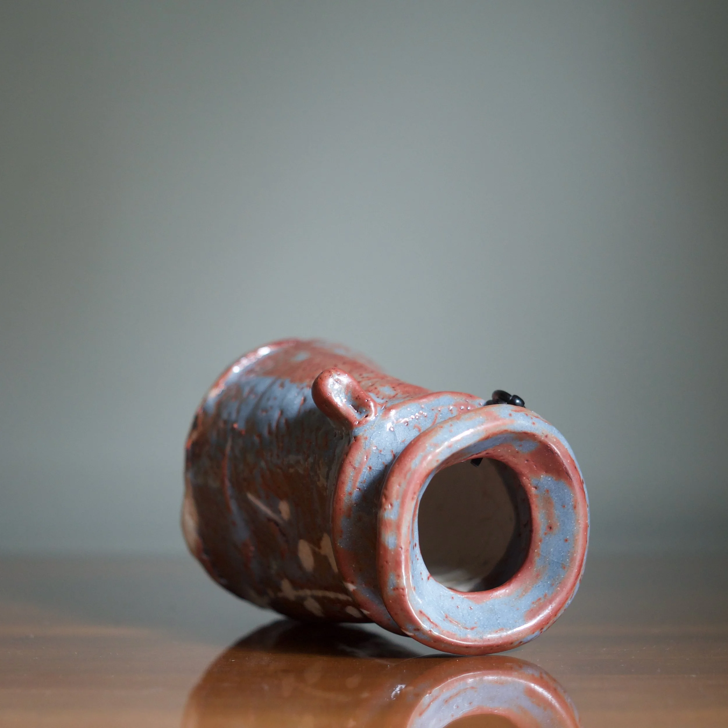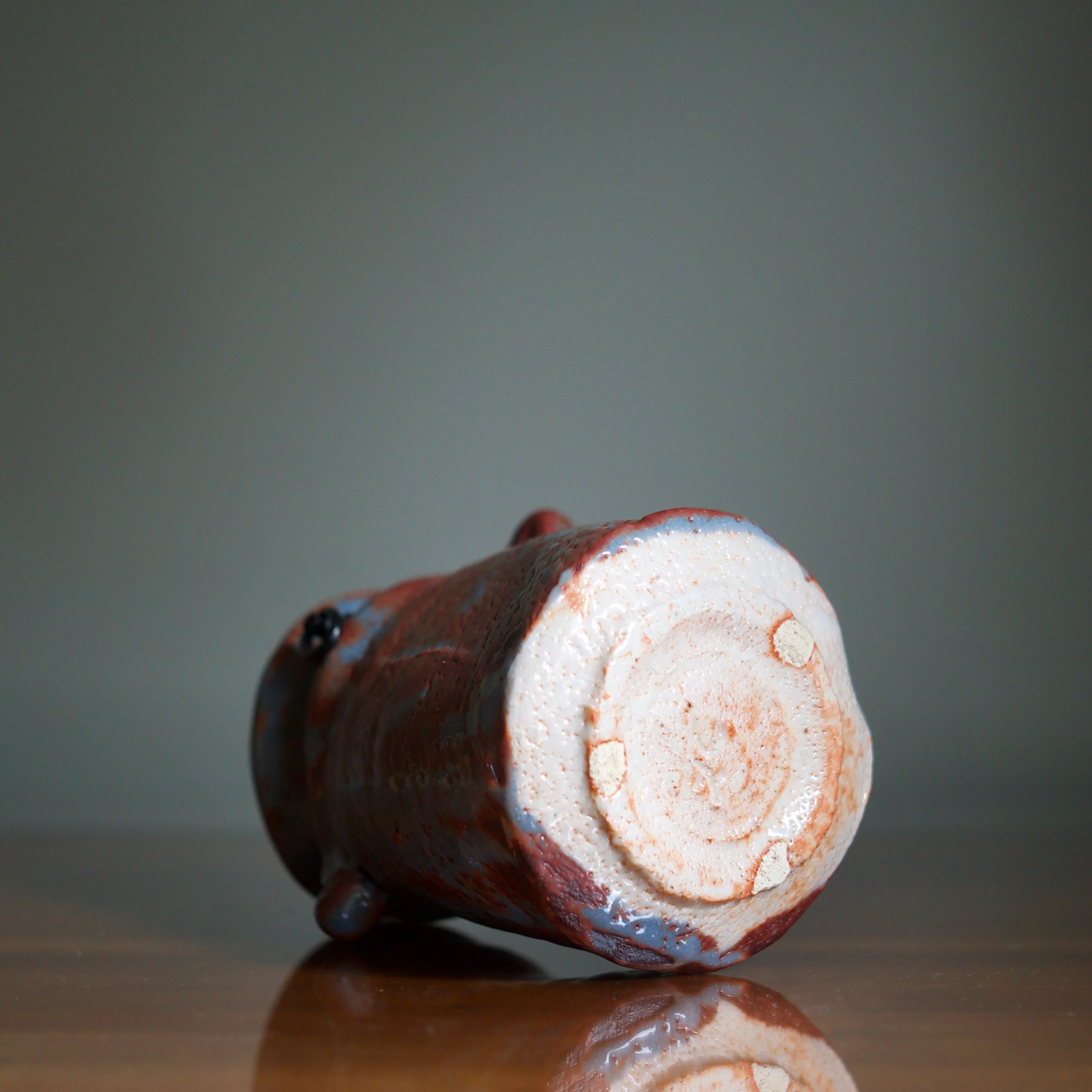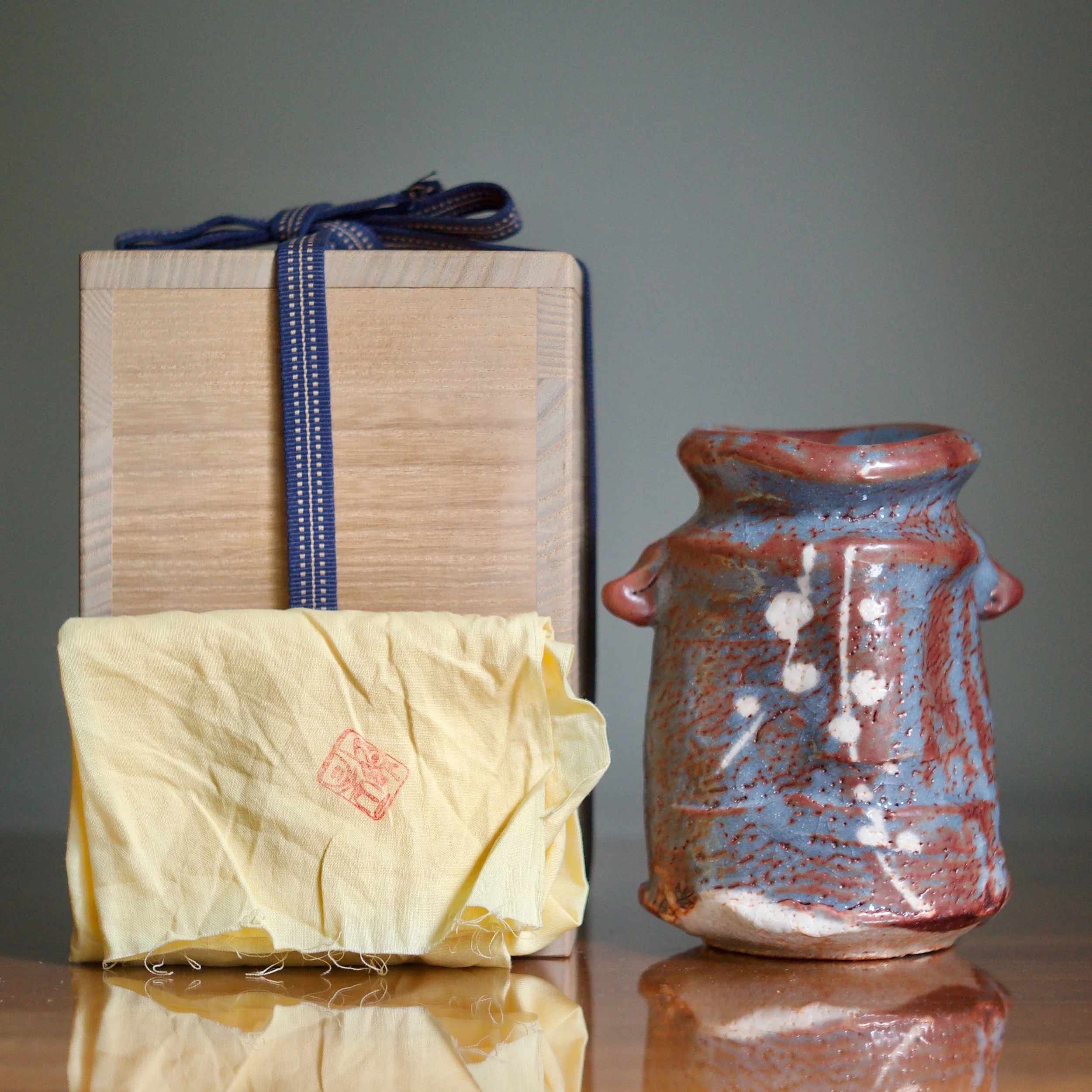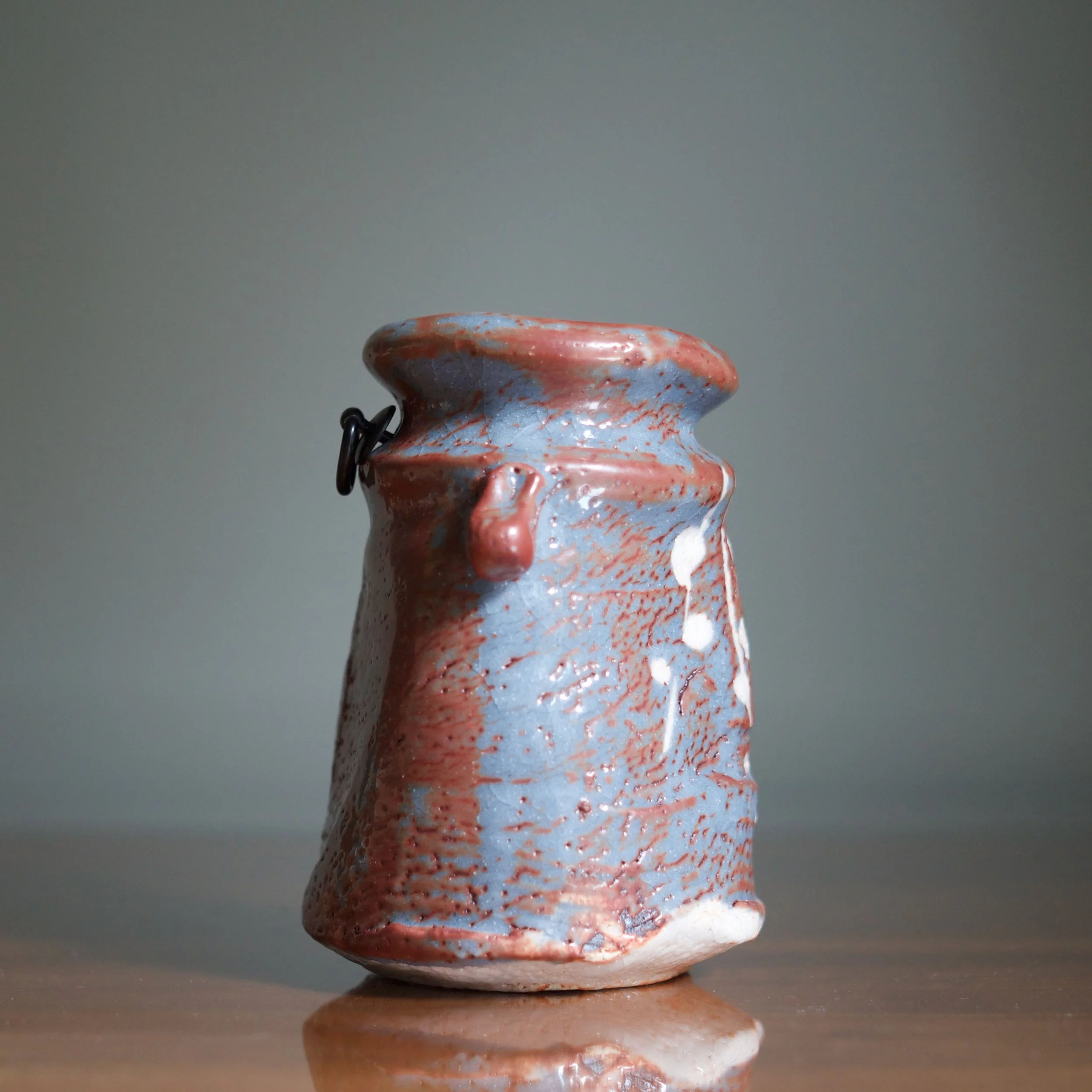 This hanging vase by Shotaro Hayashi was thrown and then altered with a squeezed body and wavering lip - distinctively rugged and organic, like so much of the best Mino ware. The addition of two triangular ears - or lugs - gives the shape an anthropomorphic touch, as though it were giving a shrug.