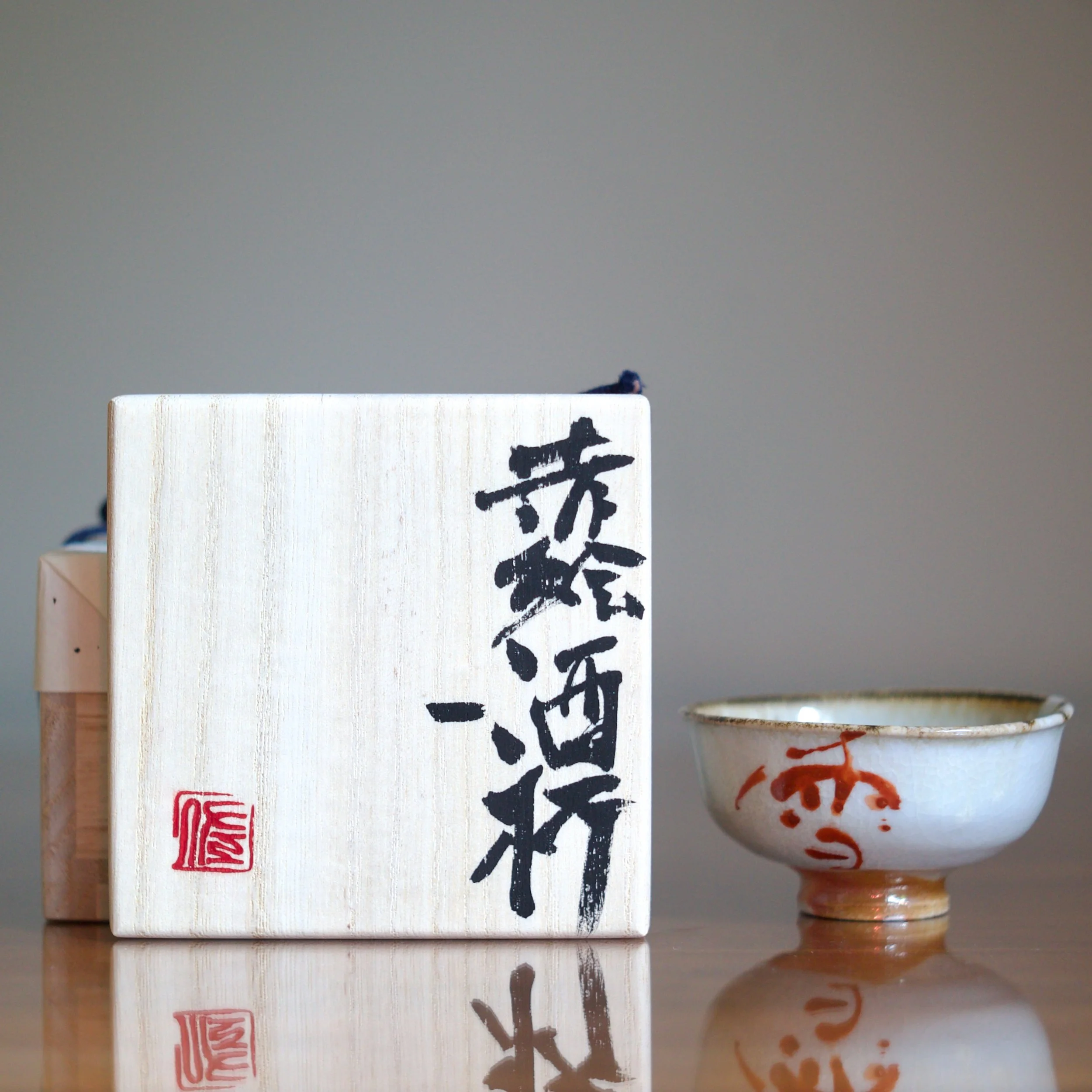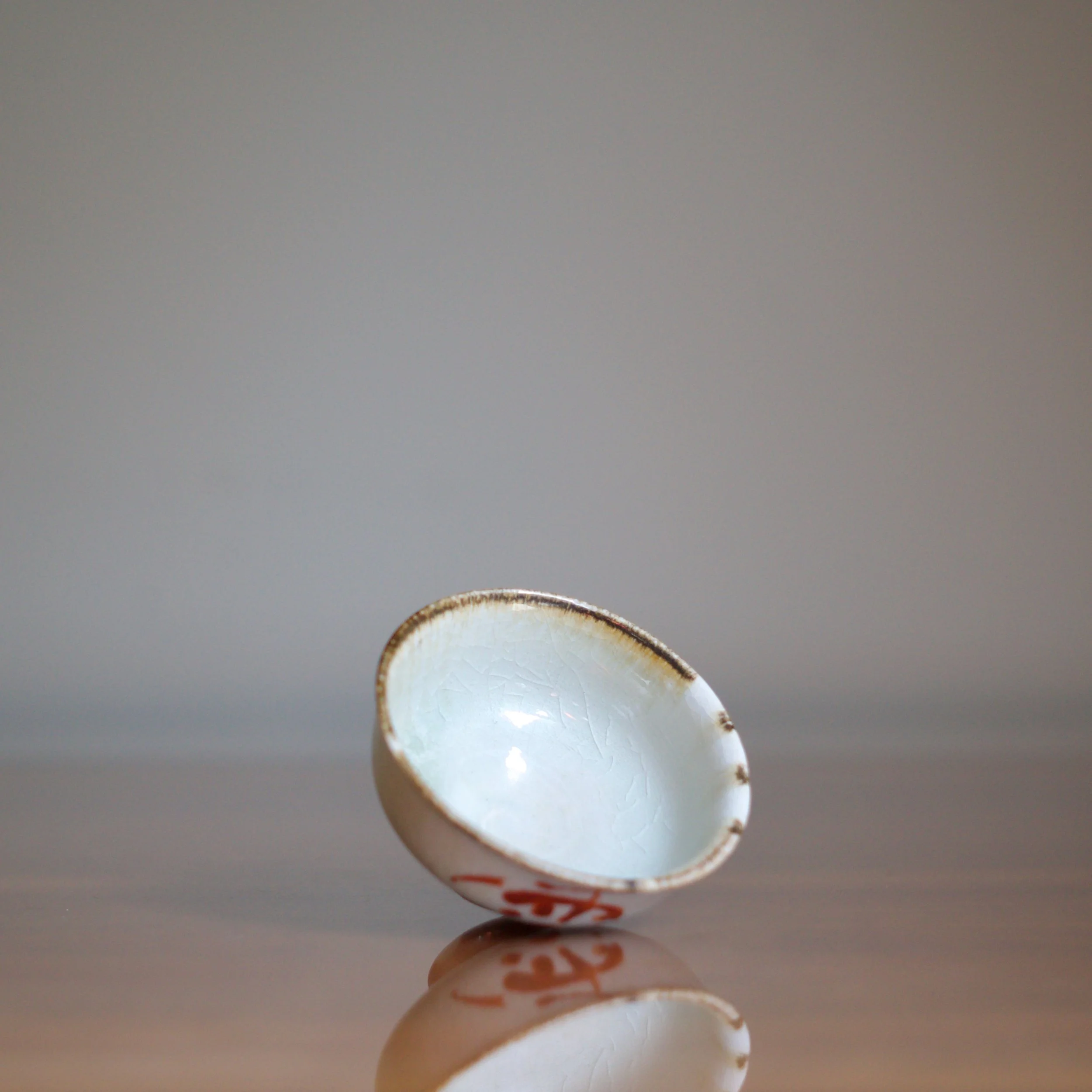 This small, delicate cup by Mitsufuji Tasuku is turned from porcelain, covered with a very light ash-glaze, and decorated with stark iron-red calligraphy characters. The rim features touches of iron-brown glaze that breaks and flows down the inside of each cup.