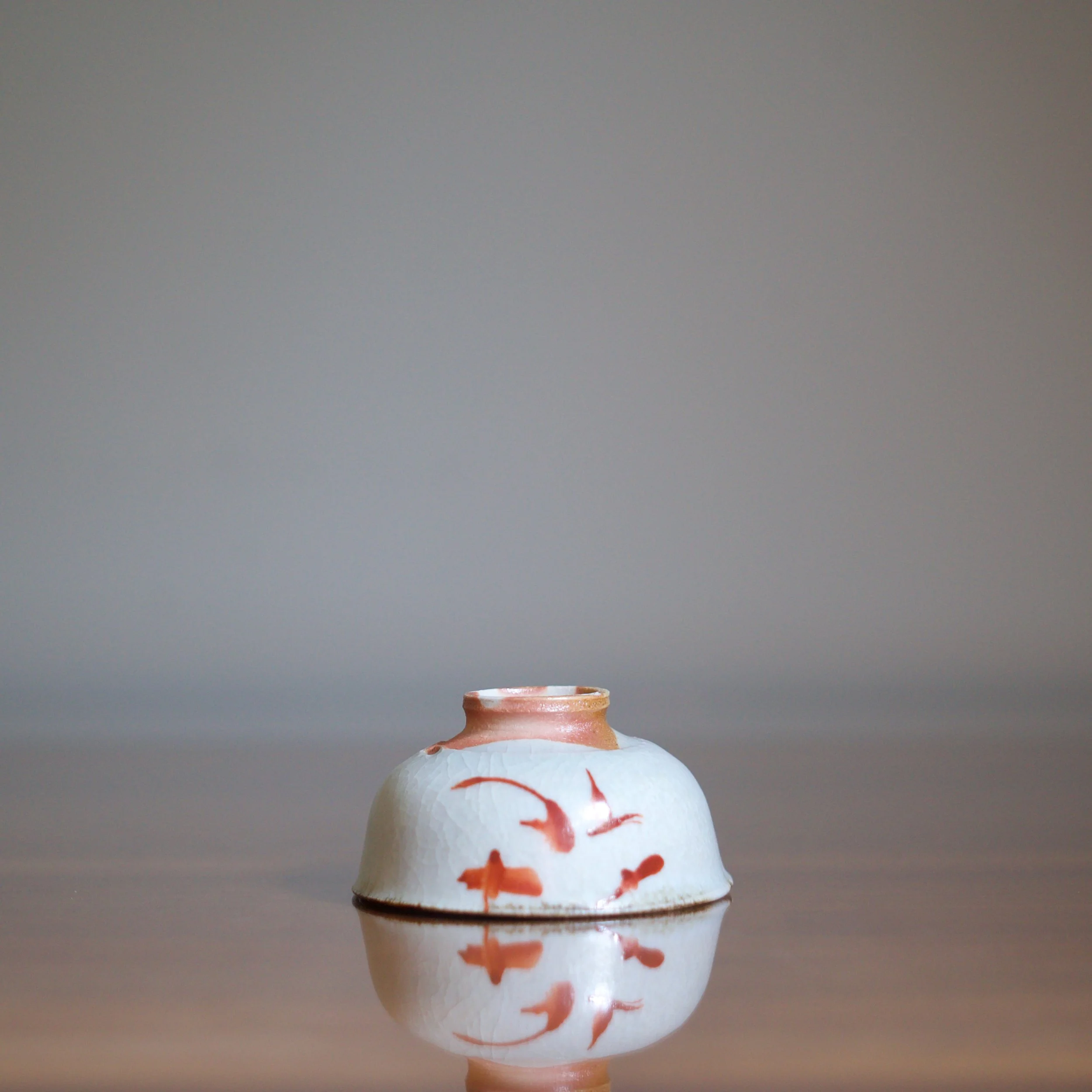 Mitsufuji wood-fired this cup in his anagama kiln. I love wood-fired porcelain: the contrast of refined porcelain with the vagaries of anagama kiln firing is both delicate and organic. This sake cup is turned quite thin and the foot is trimmed in elegant proportion to the cup.