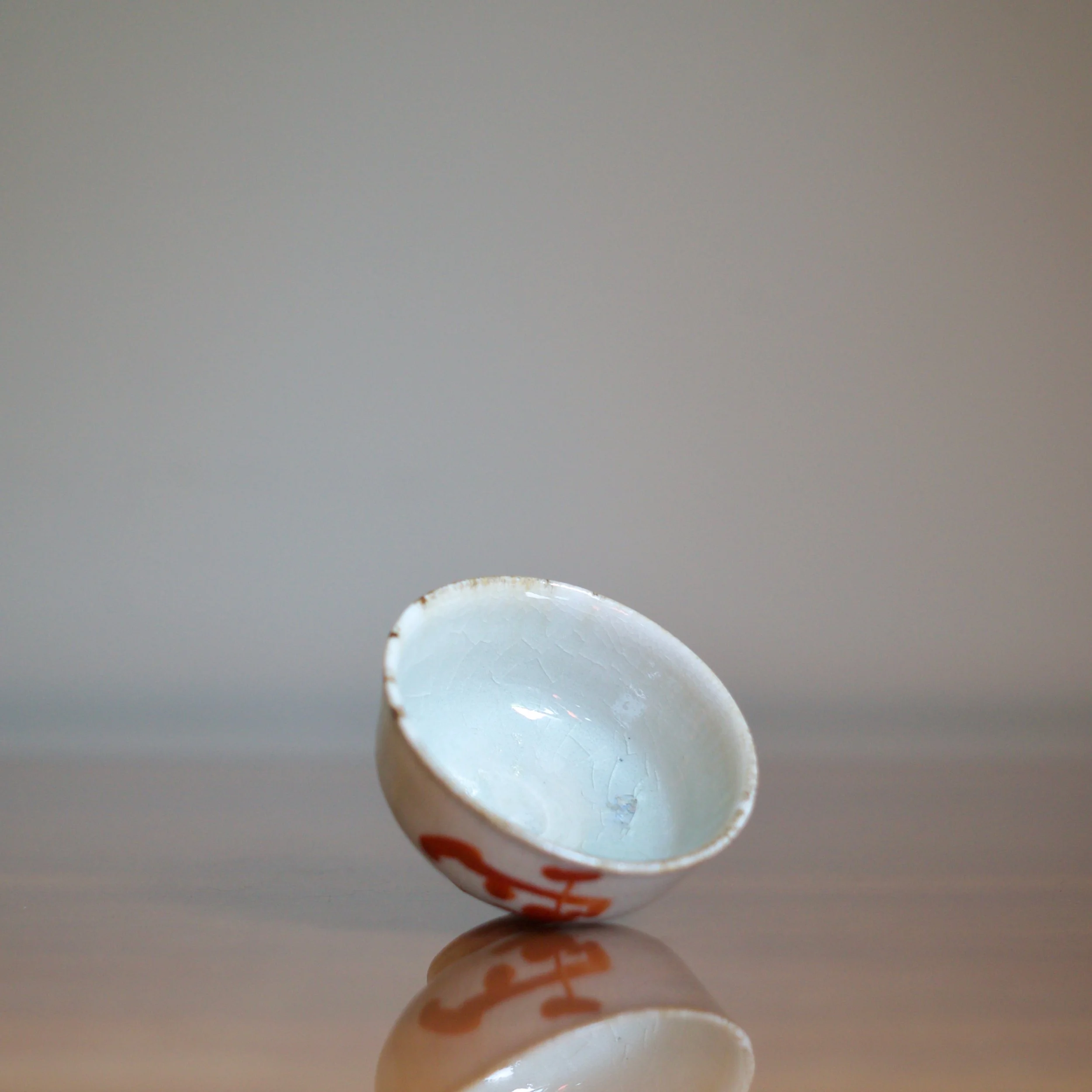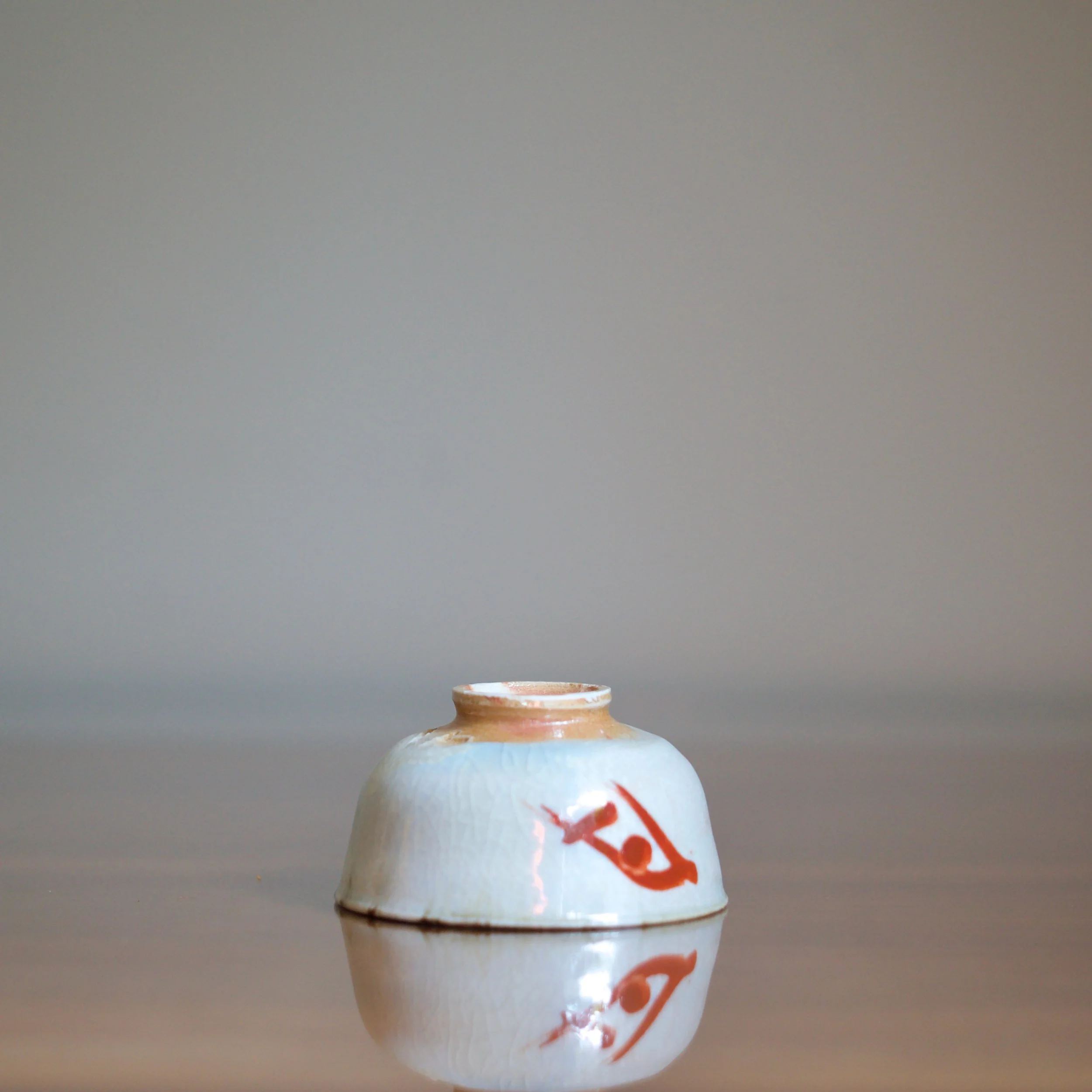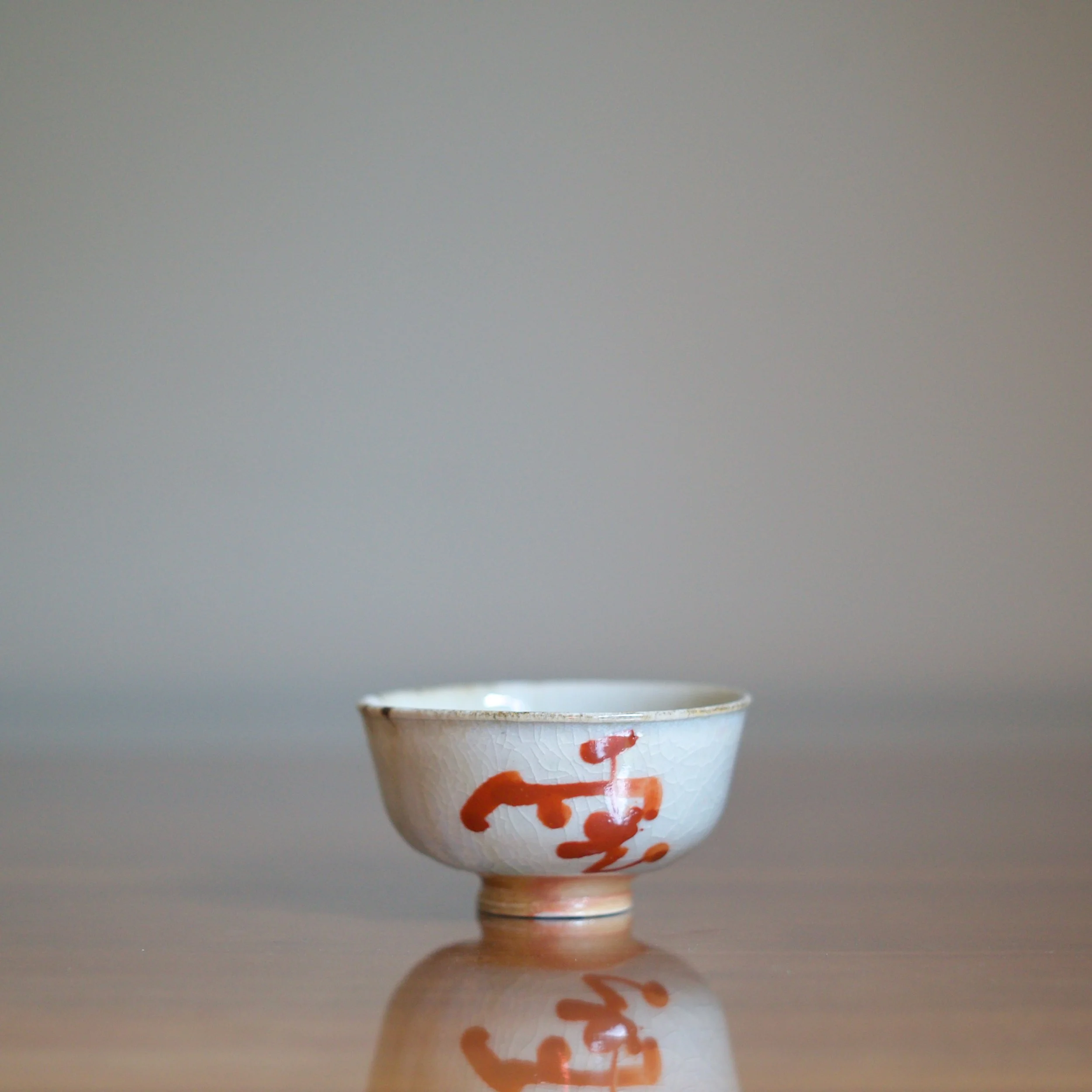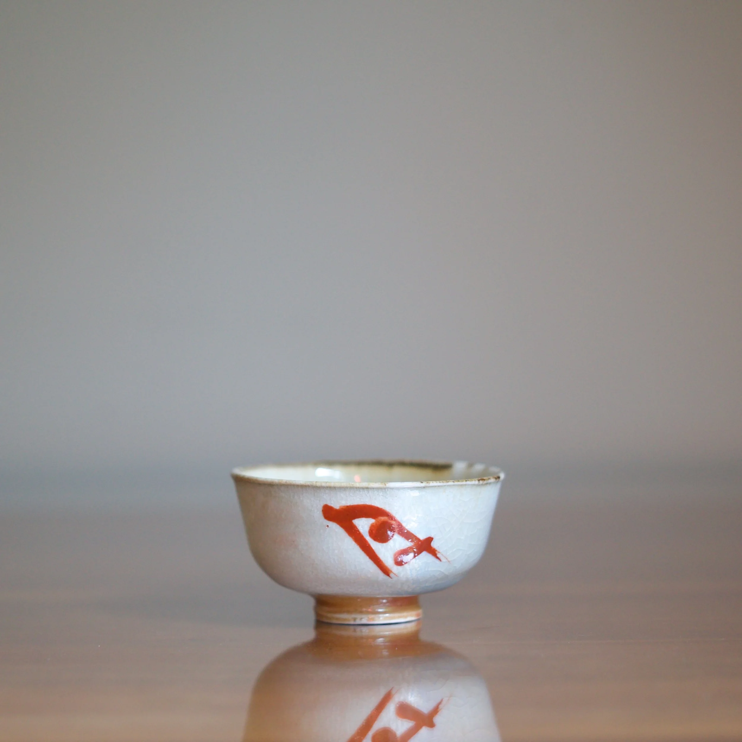 This small, delicate cup by Mitsufuji Tasuku is turned from porcelain, covered with a very light ash-glaze, and decorated with stark iron-red calligraphy characters. The rim features touches of iron-brown glaze that breaks and flows down the inside of each cup.