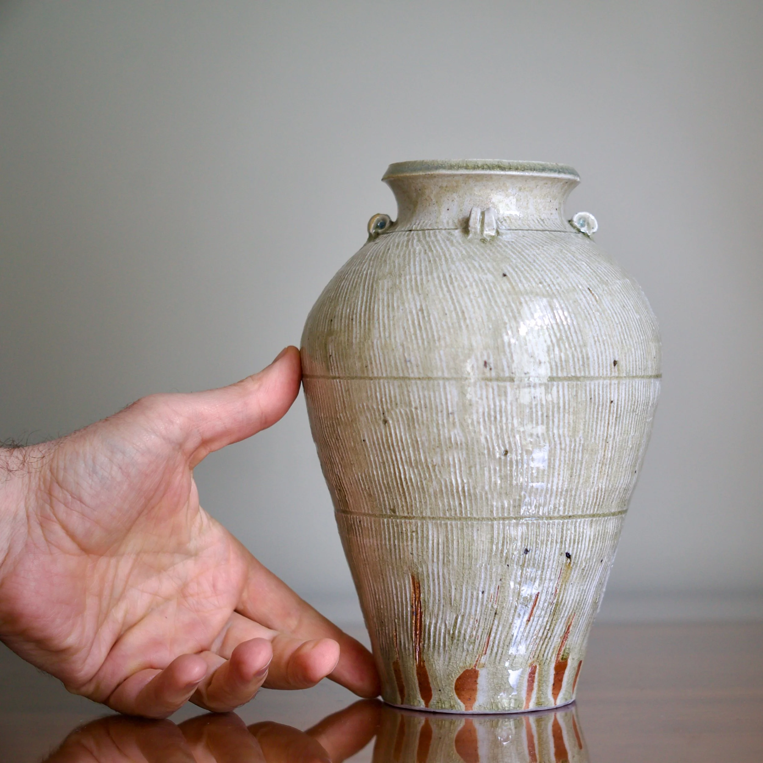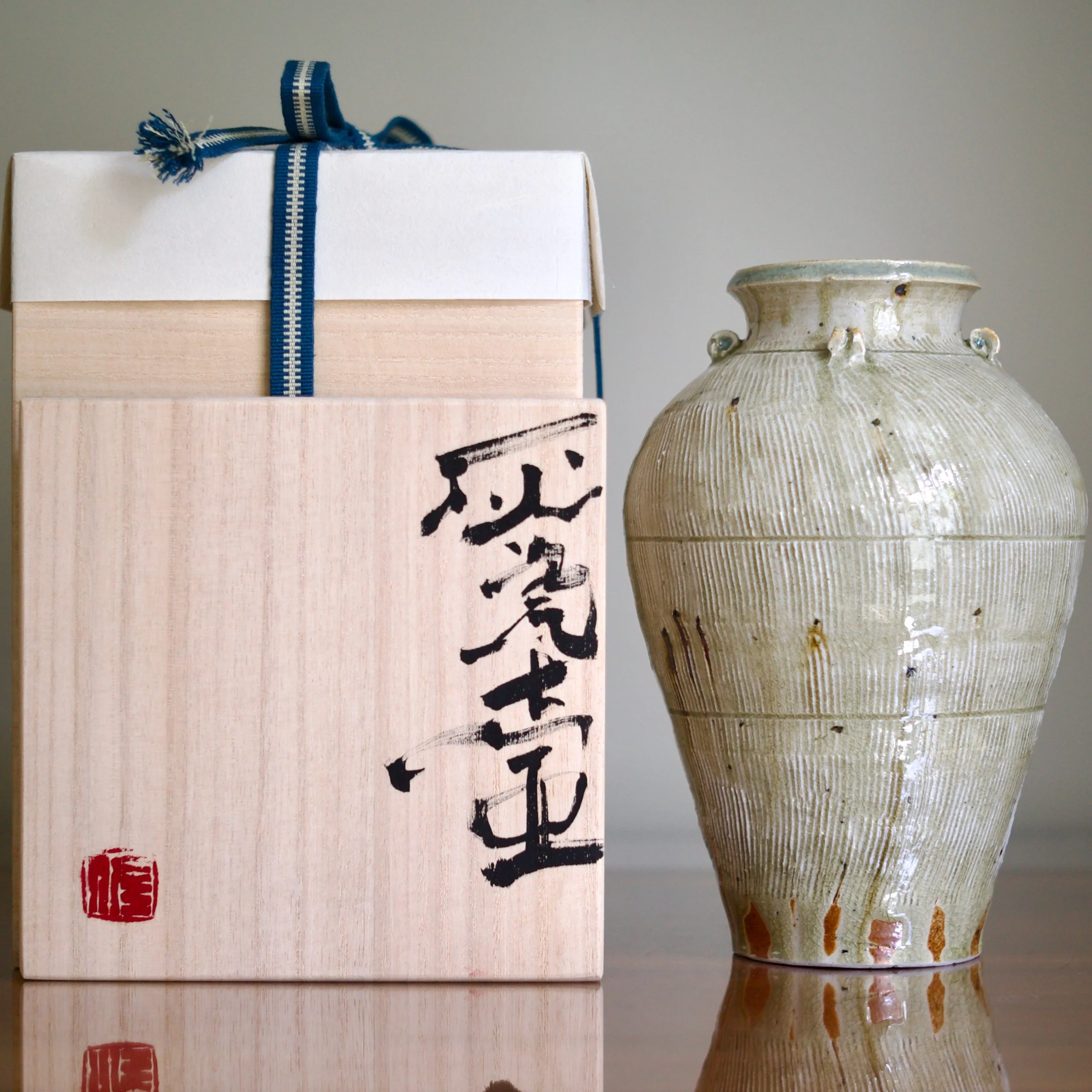 While Tasuku Mitsufuji takes inspiration from ancient and dynastic Chinese and Korean ceramics, he also looks closely to the earliest native Japanese ceramics such as those from the Jomon period. While the combed surface on this tsubo may recall eponymous Jomon “rope-pattern” pots, they just as easily bring to mind the pots of mingei Living National Treasure Tatsuzo Shimaoka.