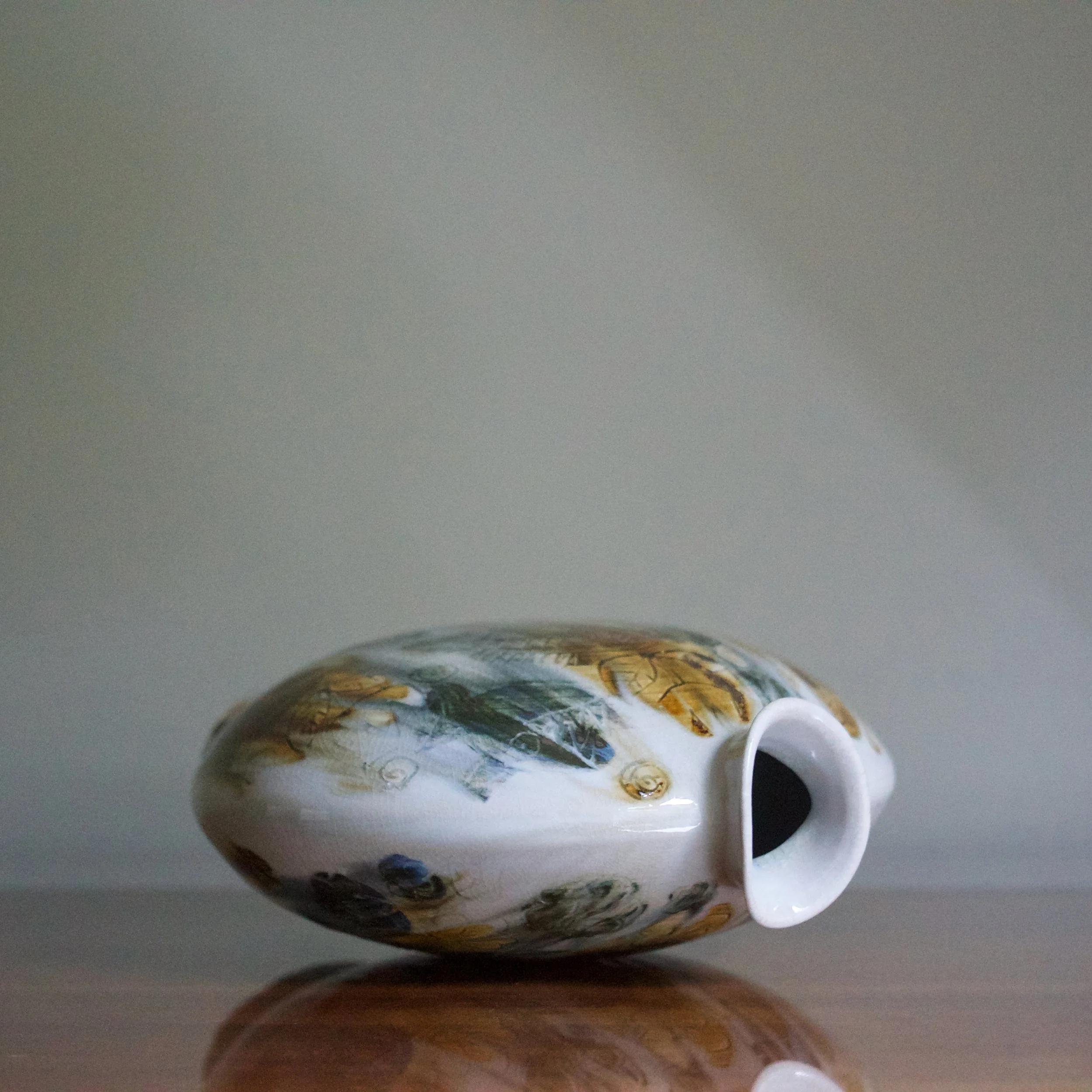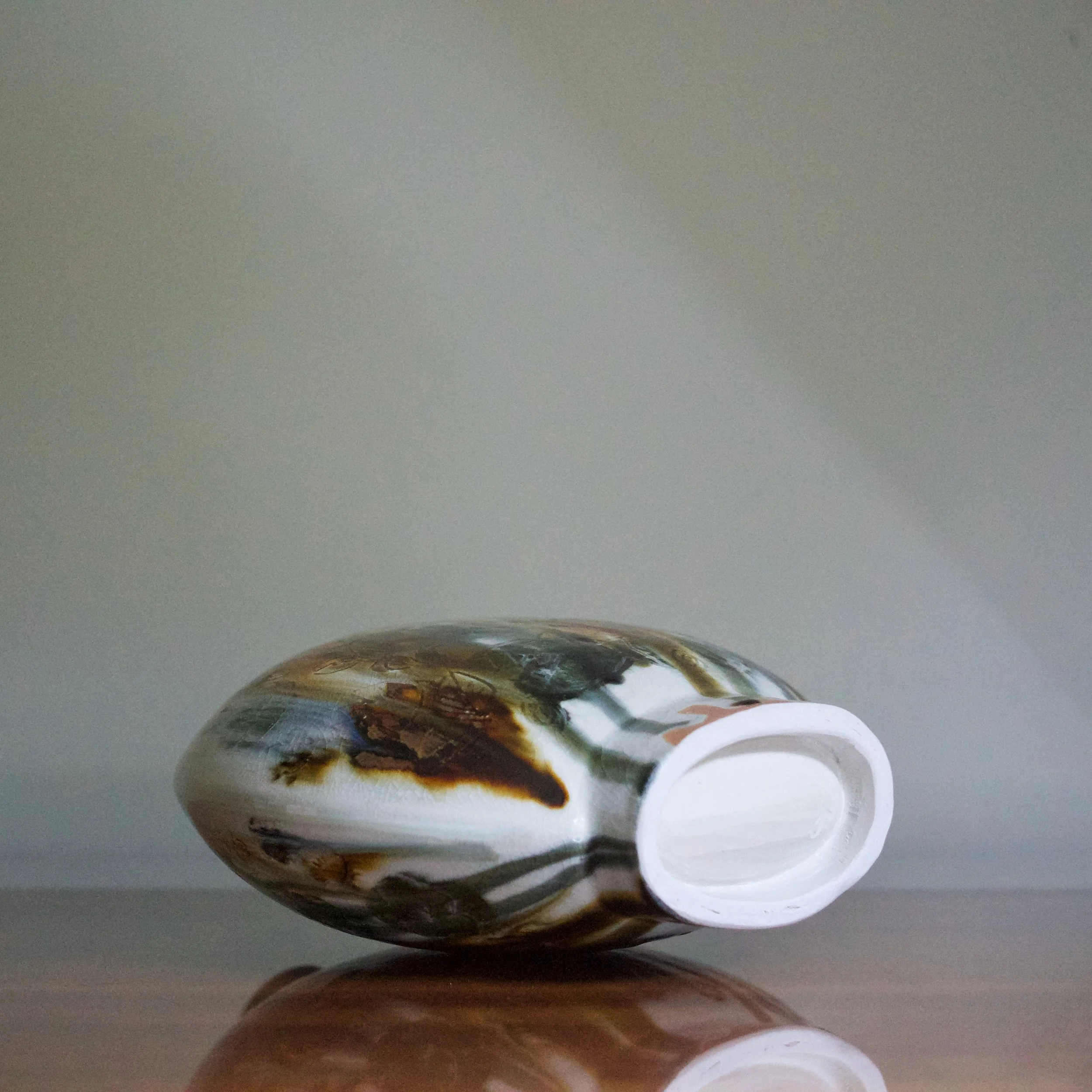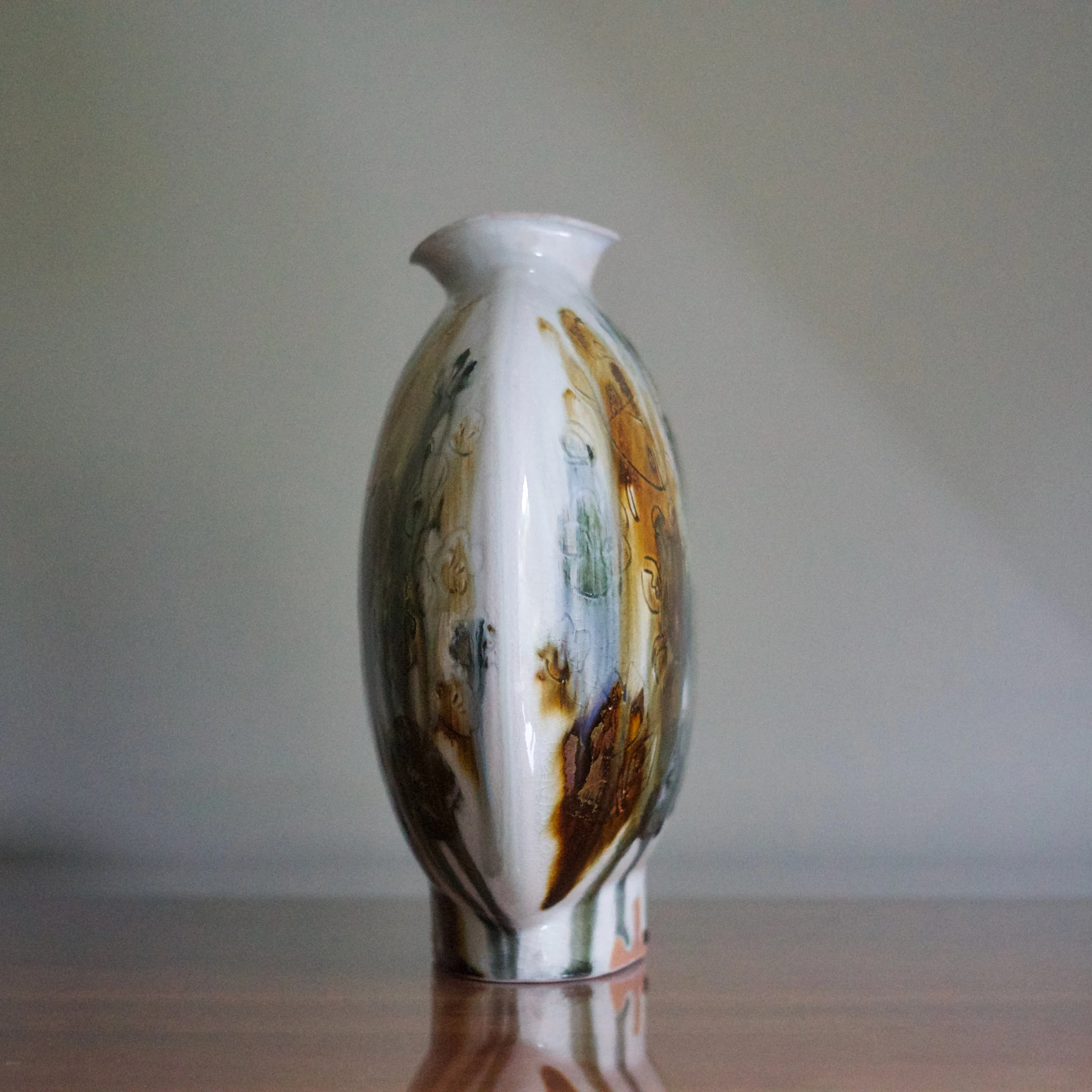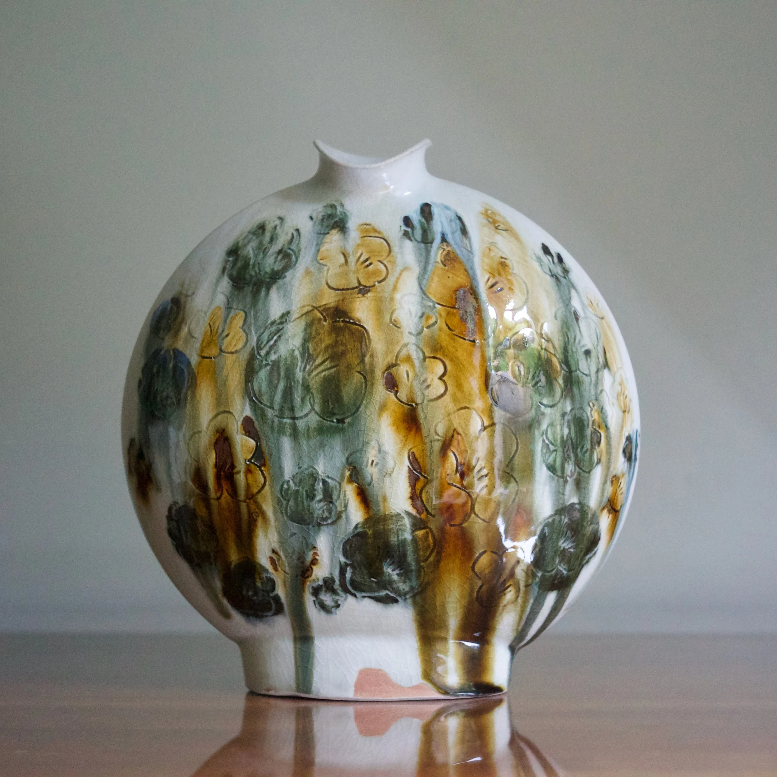 The bottle or flask form takes inspiration from Chinese vessels which themselves had precedent in the Near East. Combined with the running polychrome glazes, these pots evoke Tang Dynasty and Silk Road pots, especially sancai or tri-colour ceramics.