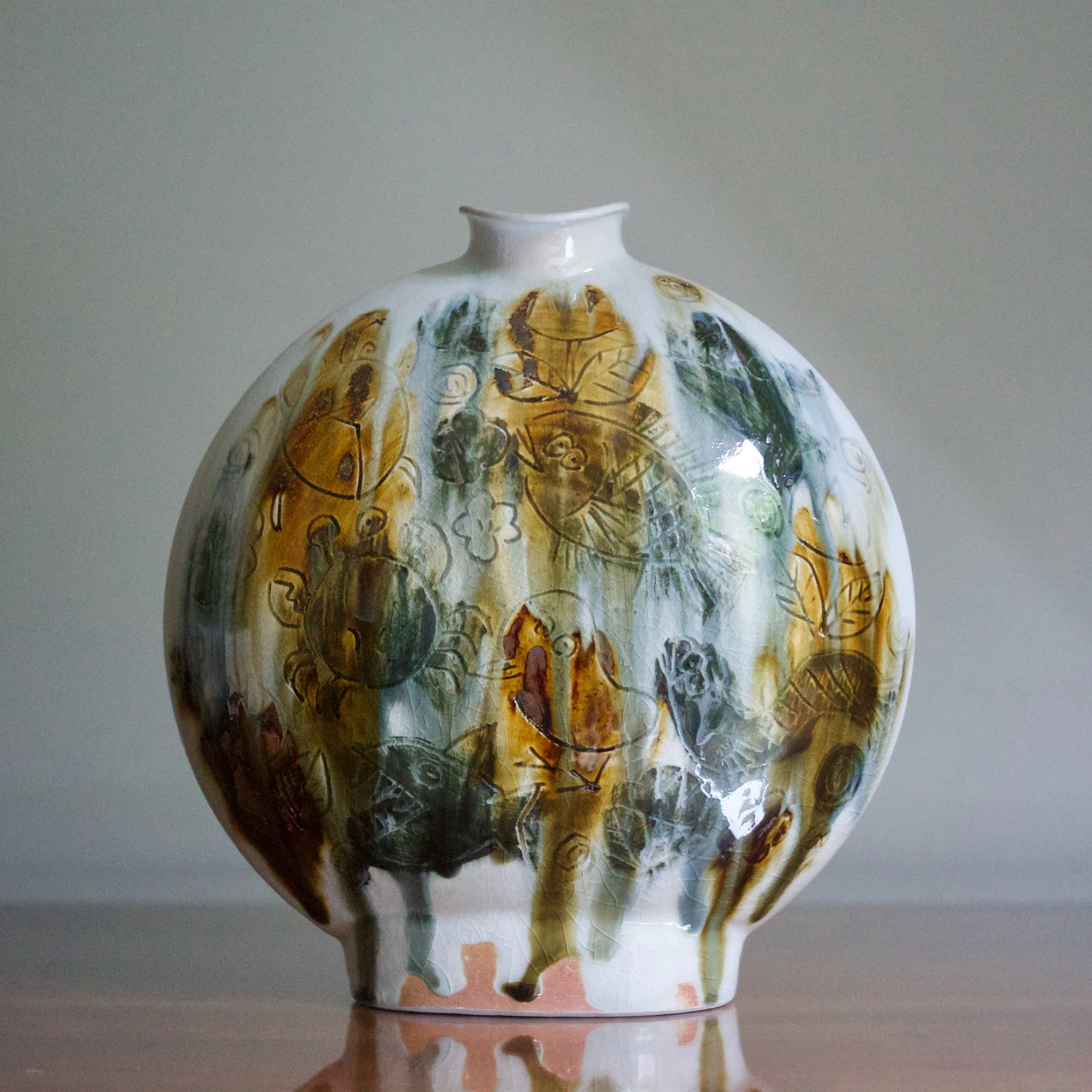 Tasuku Mitsufuji made this round and flat vase with a white stoneware and porcelain clay body. After coating the pot in a white glaze slip, he incised his creatures and flowers into both sides, and then added splashes of multi-colour iron-rich glaze.