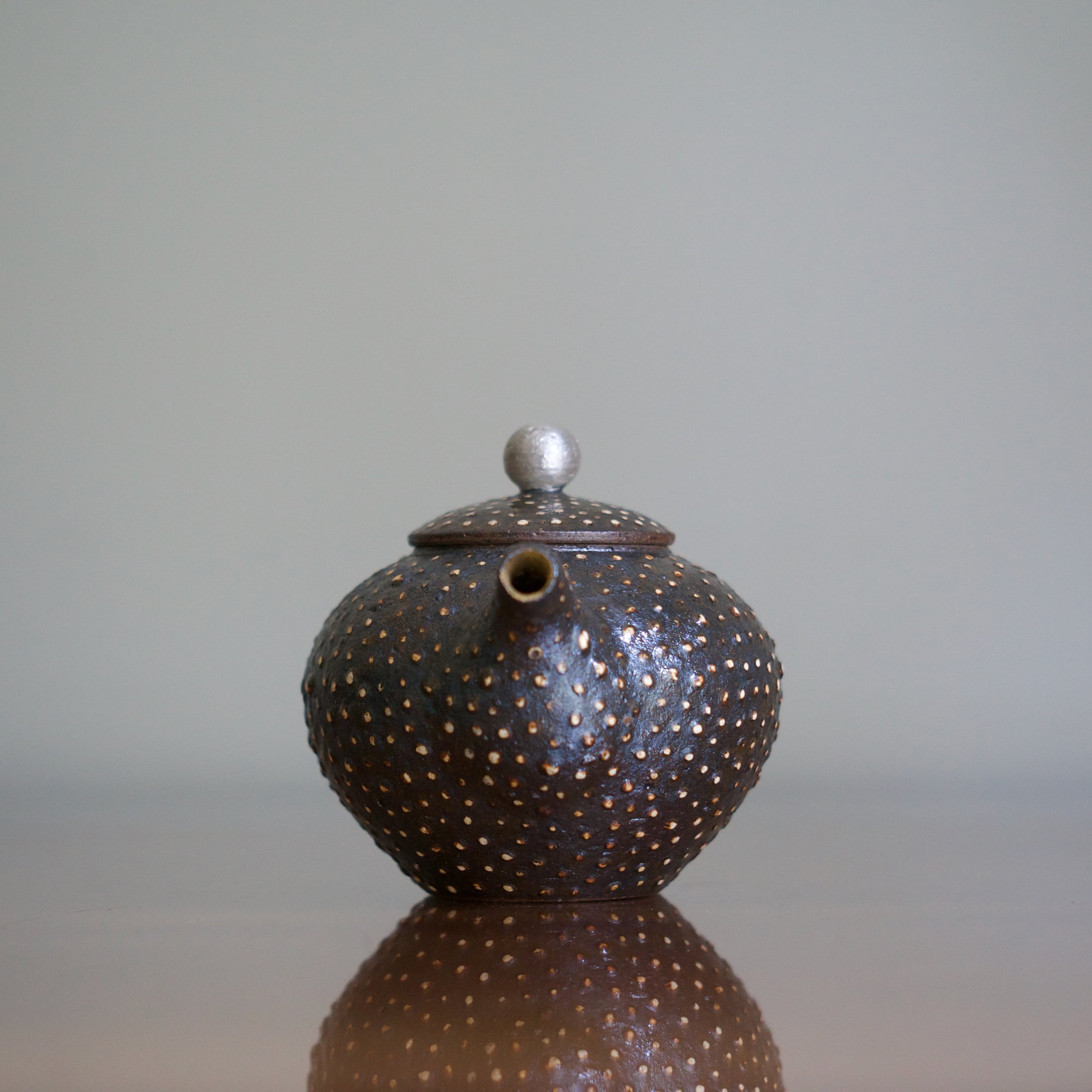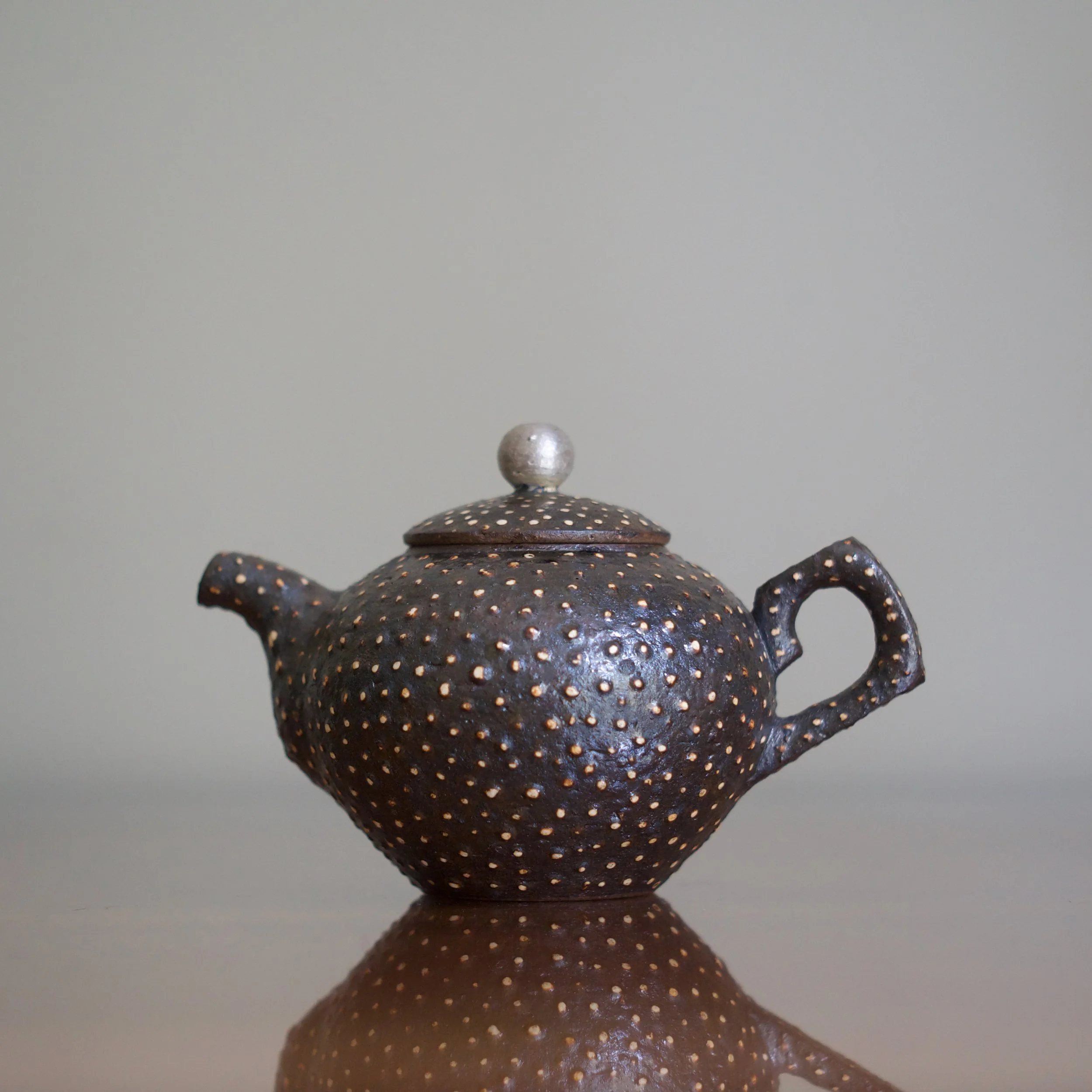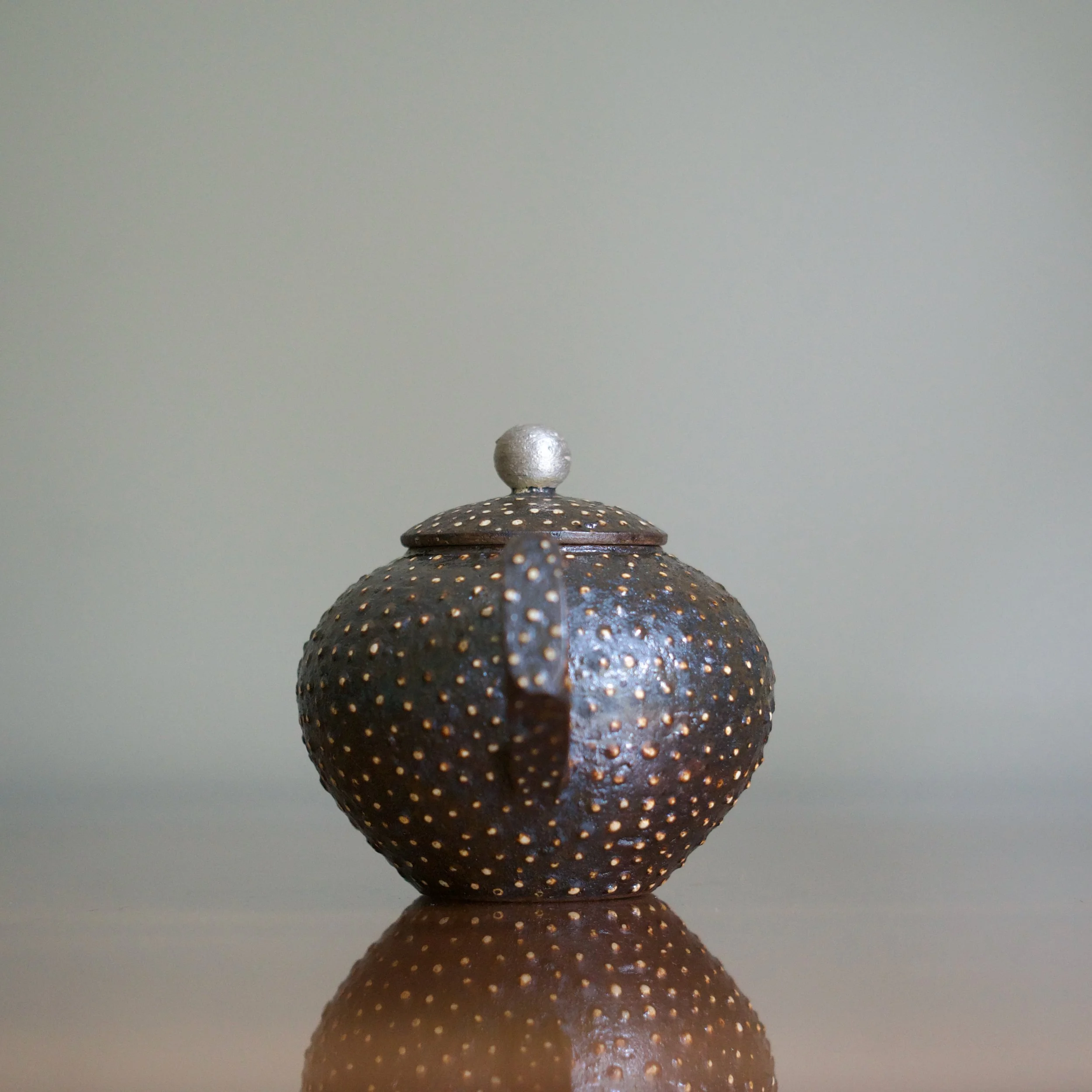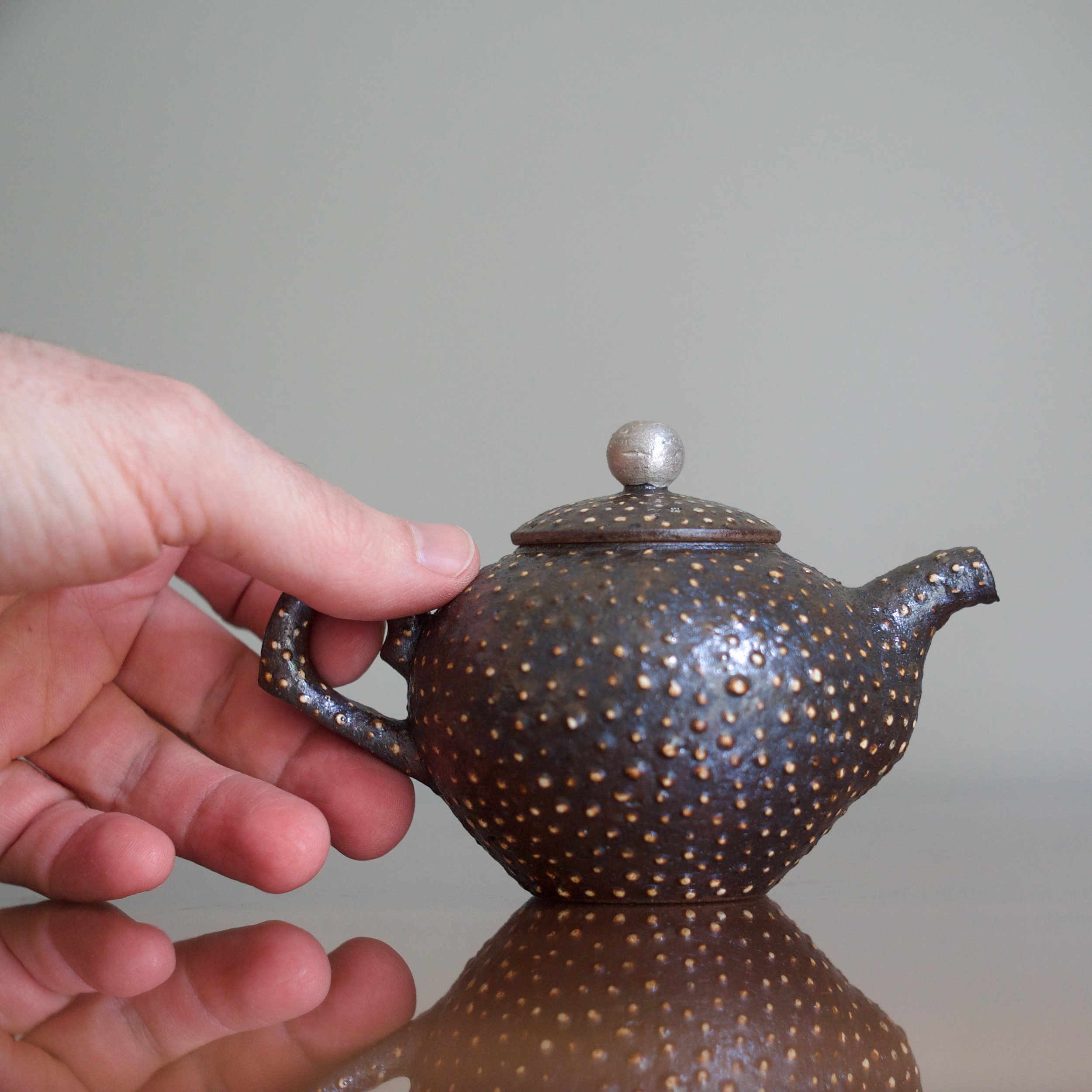 How Park managed to distribute the feldspar so evenly is a mystery: it pops against the tea pot’s dark body, not only beautifully patterned but also exciting to touch. Park adds two more accents: a silvered finial on the lid and a splash of gold just inside the spout.